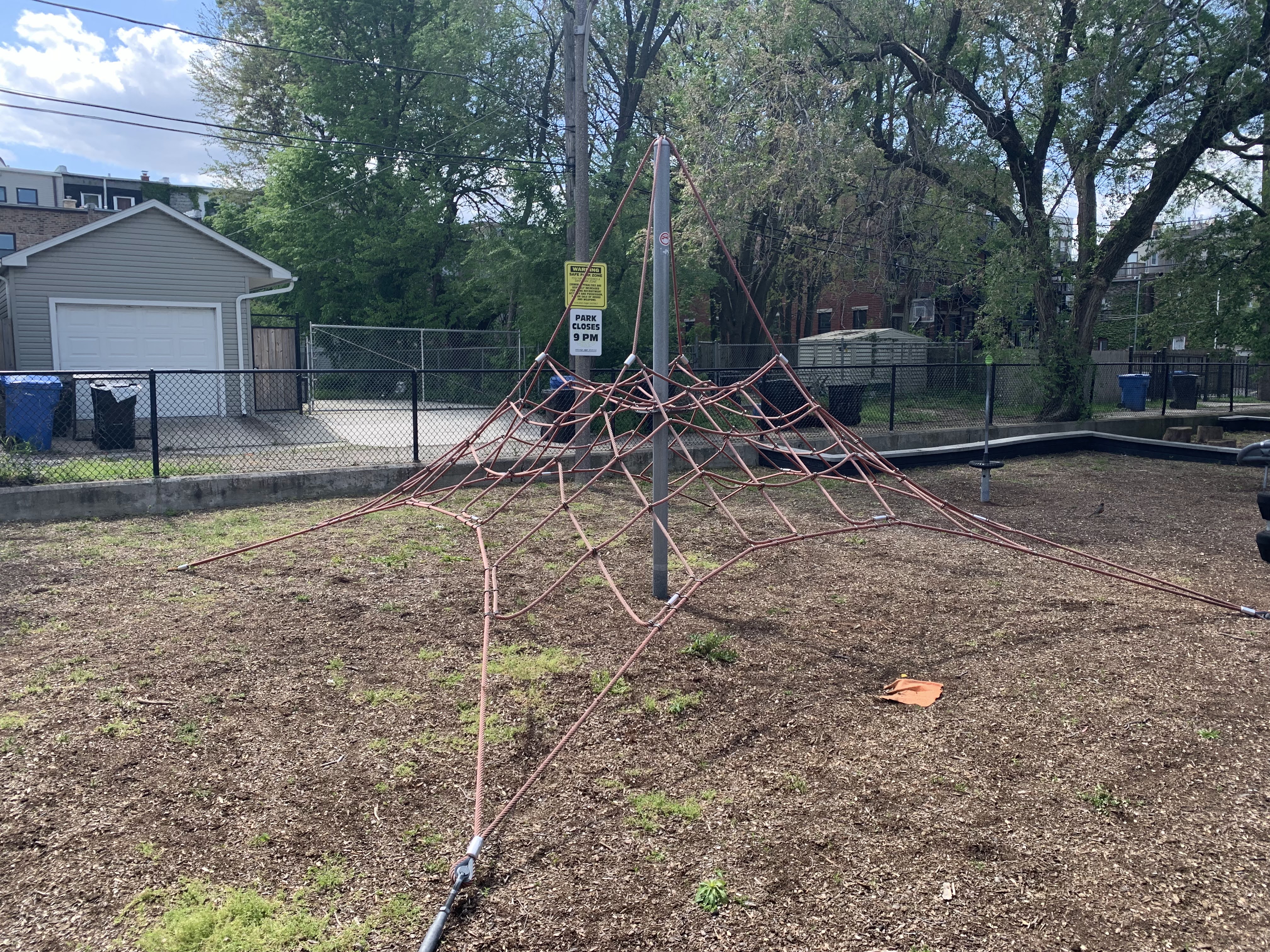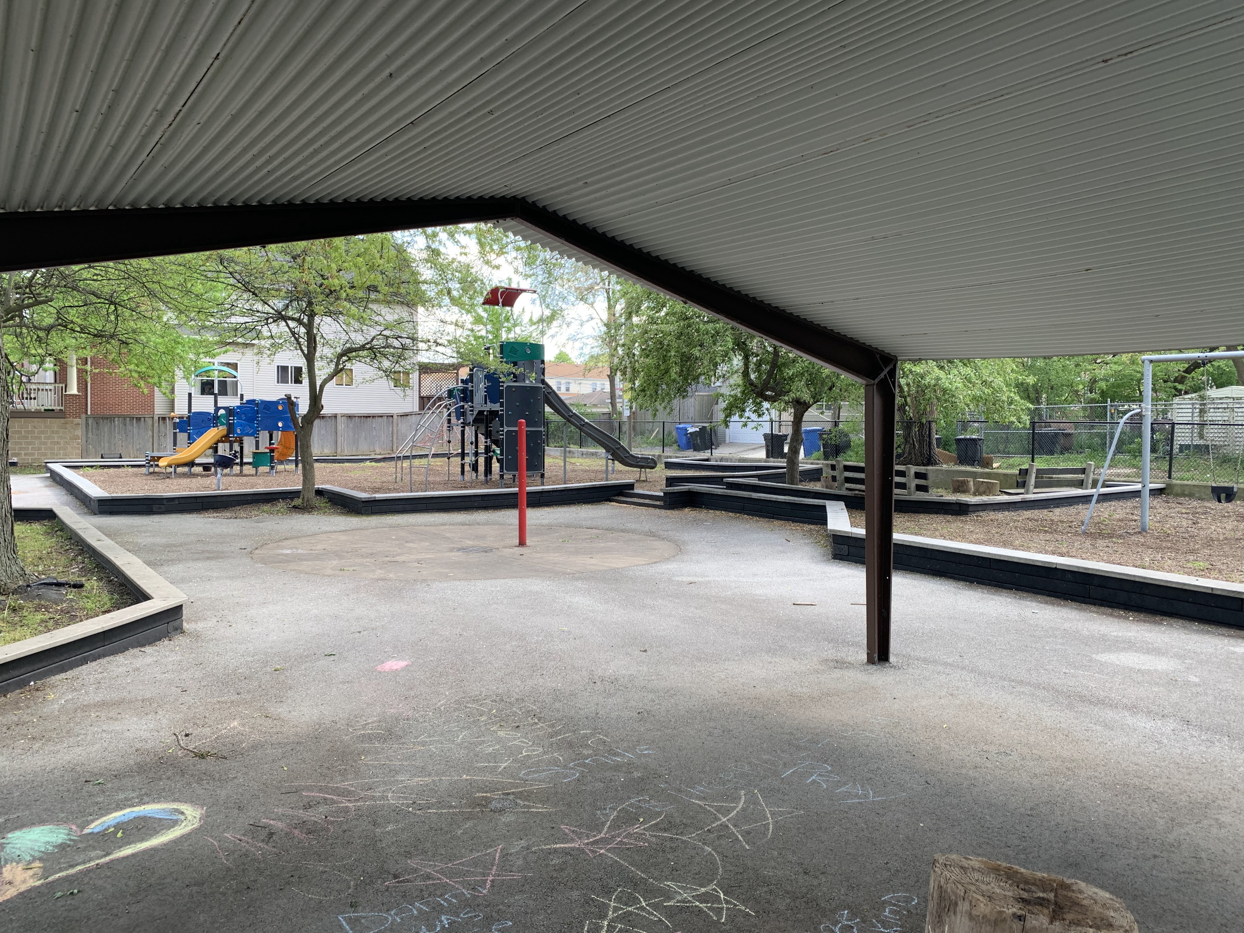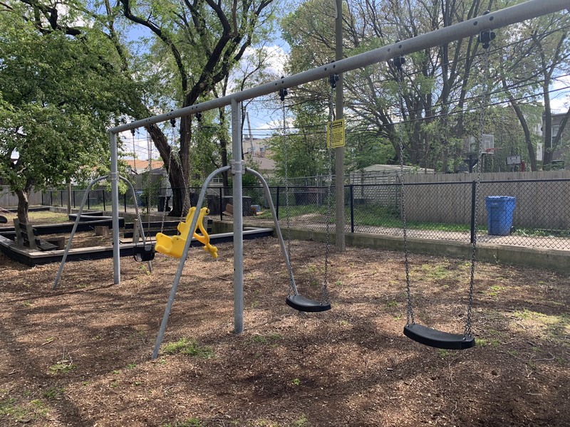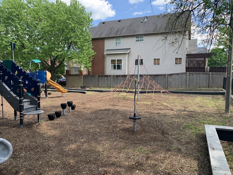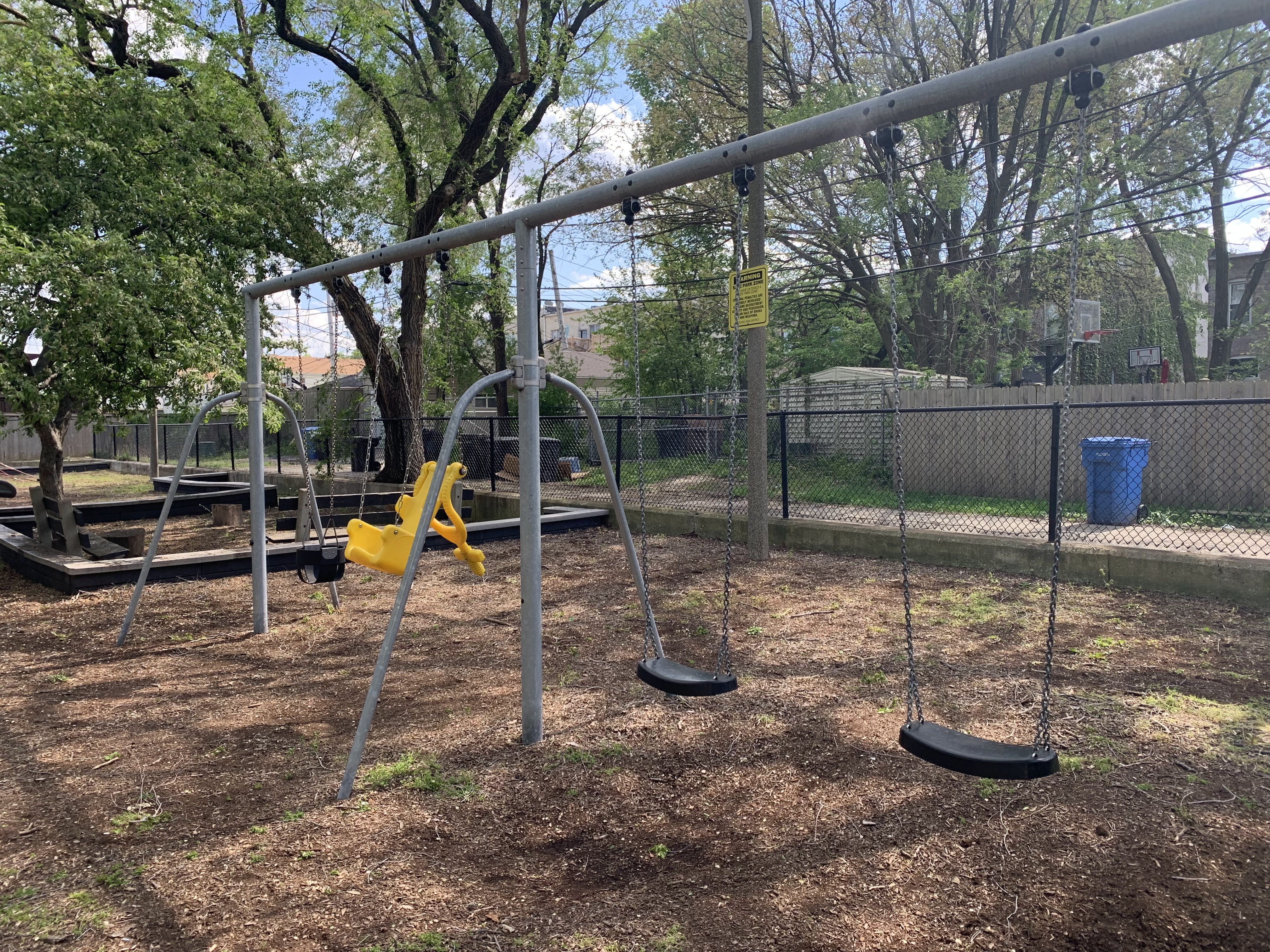 - Harsh Park sits on a quiet stretch of Oakenwald Avenue and features modern Kompan playground structures, a standard set of swings, and a small water spray element. There are two playground structures - a smaller one for younger children and a larger one for older children - that feature distinctive geometric designs and bold colors. The swings are standard (toddler, adaptive, and belt seat) and the water spray feature is a simple single pole sprayer. The park itself is heavily shaded by large trees and there is a small pavilion on the north side of the park for additional shade. The play area is fenced from the street but not fully enclosed and the surface is wood chips. There are a few benches but additional seating or even a picnic table would be welcome additions to this small neighborhood park.