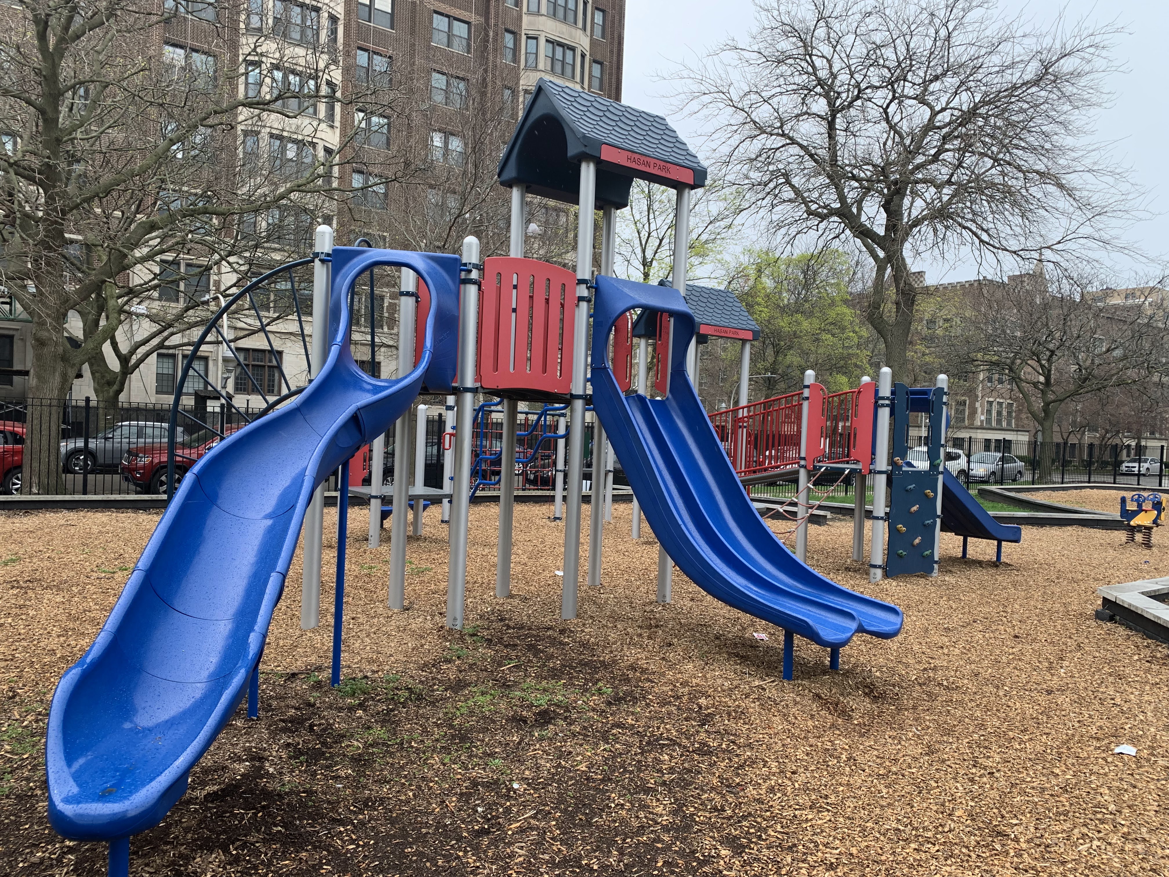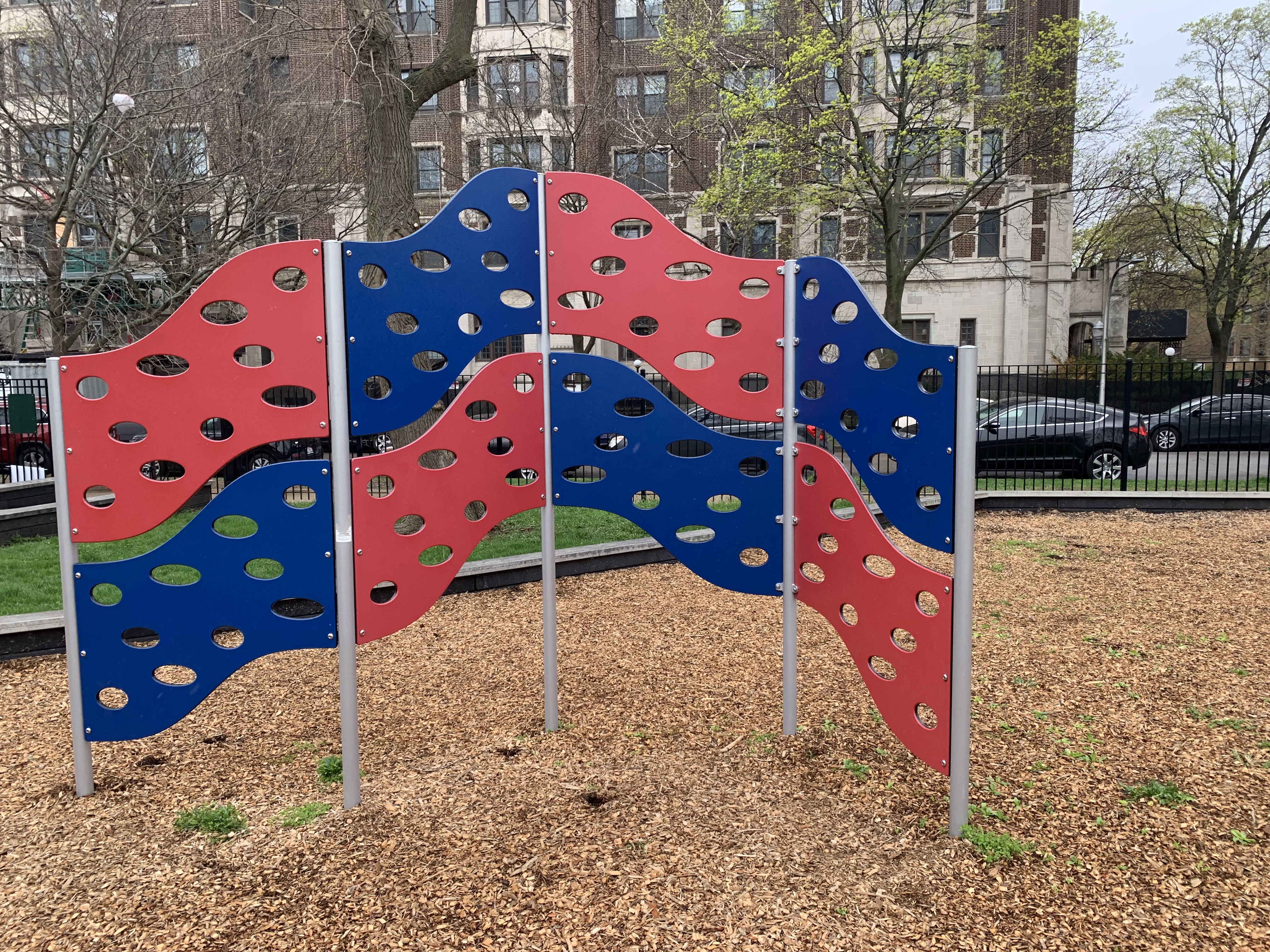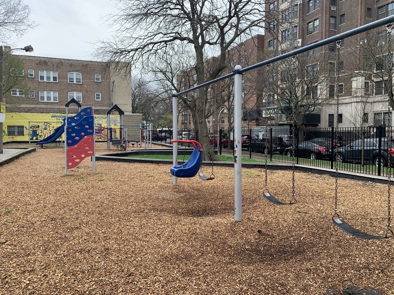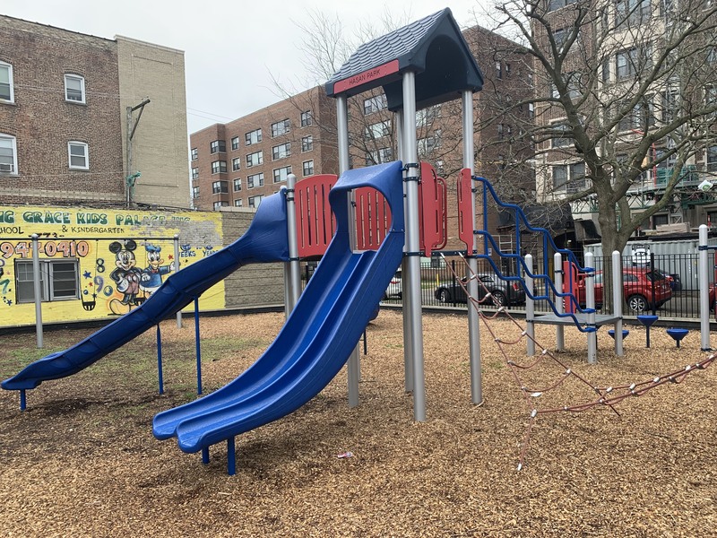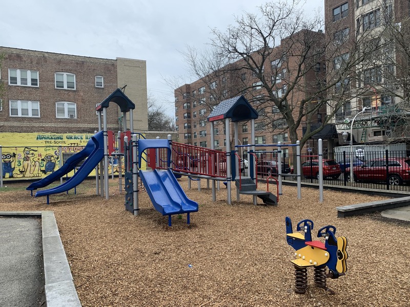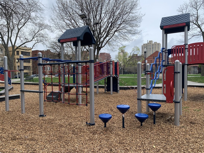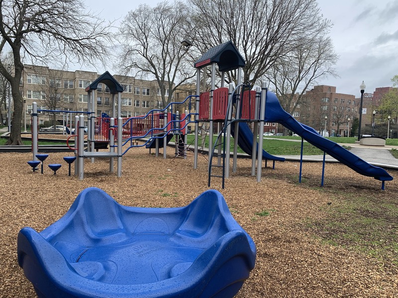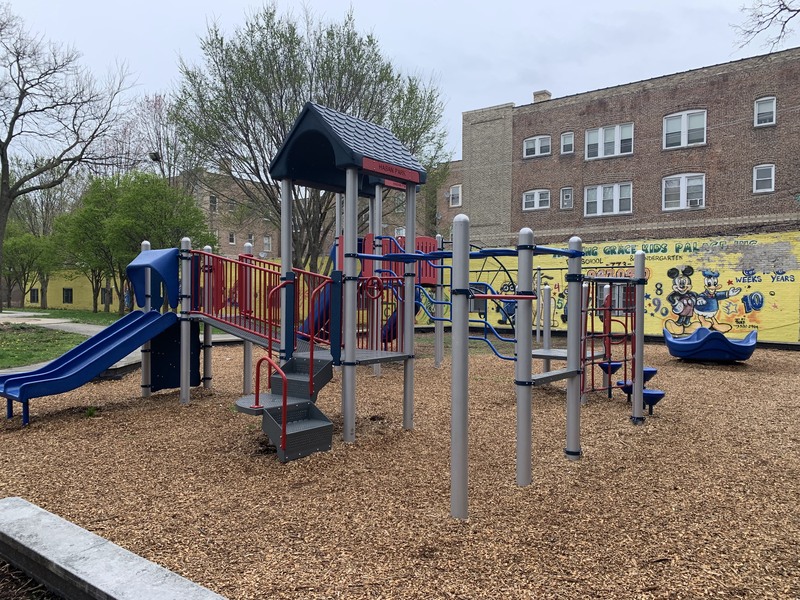 - This small park features a playground with a single large play structure and a few standalone elements. The play structure features a few slides, a climbing net, monkey bars, and other elements. The standalone elements include a large climbing wall, a large spinning saucer, and the standard set of swings. The park itself is the green space around a Chicago Water Department pumping station and the site is covered with large, mature trees. The play surface is wood chips and the play area somewhat shaded and fully enclosed.