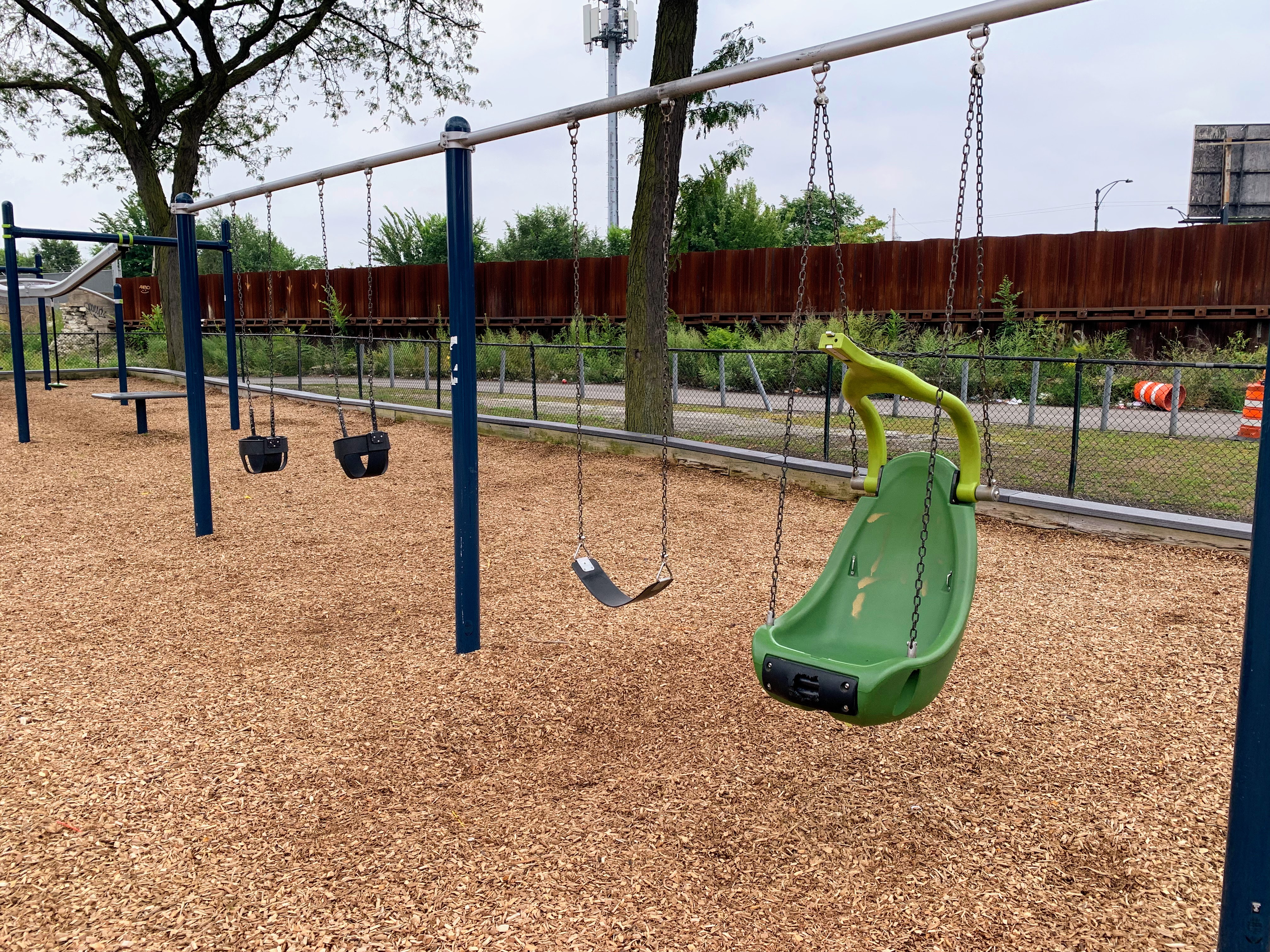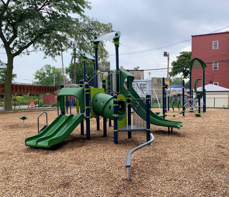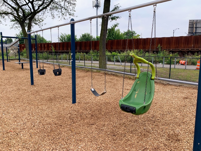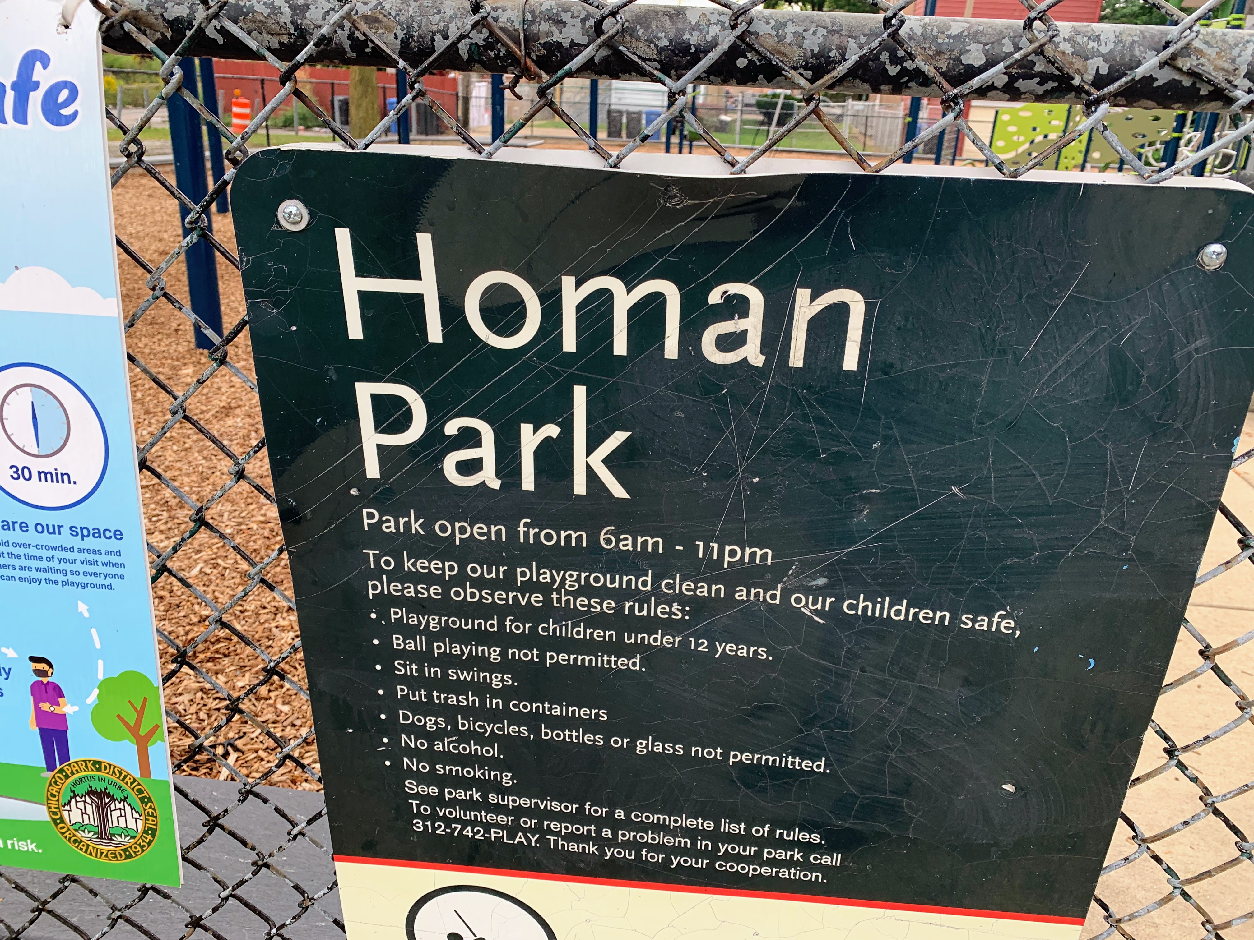 - Homan Park features a nice small playground on a quiet street with views of trains. The playground is somewhat sprawling with a variety of slides and climbing elements. There is also a set of swings and a zip line with a circle seat. The other aspects are classic Chicago playgrounds - wood chips and a few benches and a little shade from nearby trees. All in all, a solid neighborhood playground.