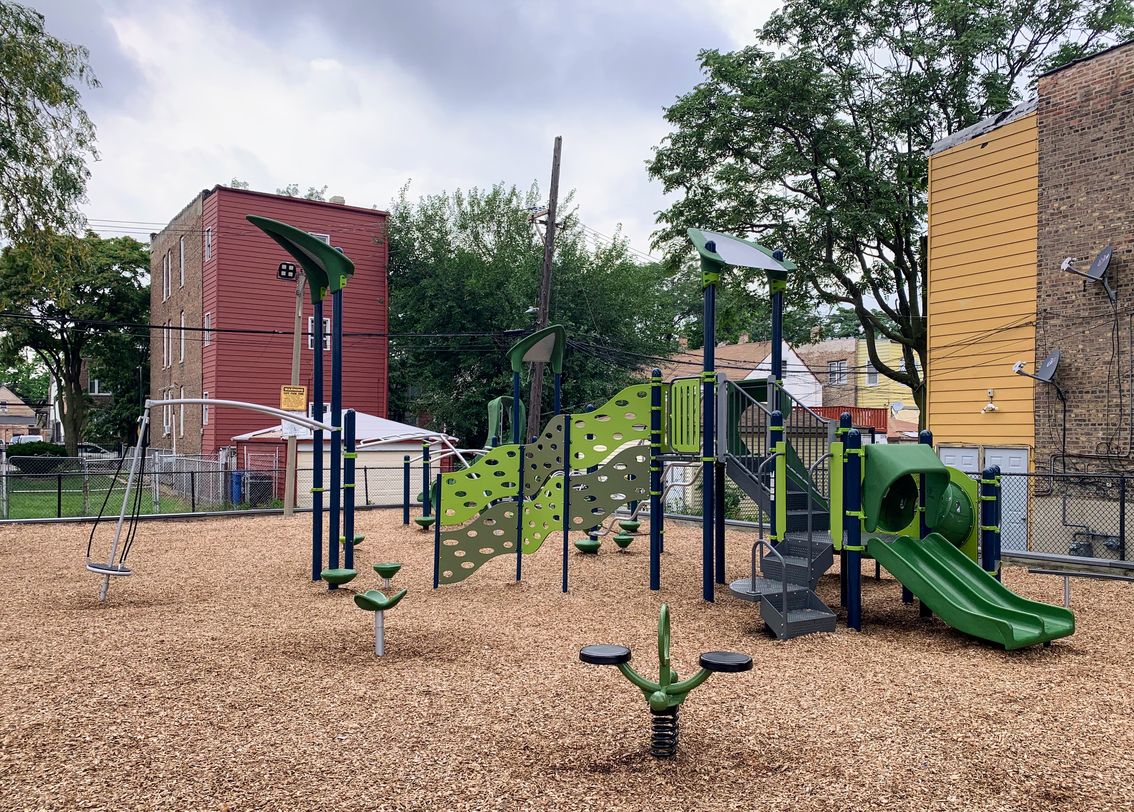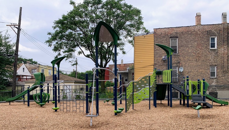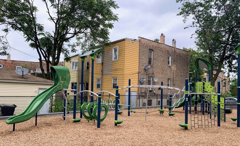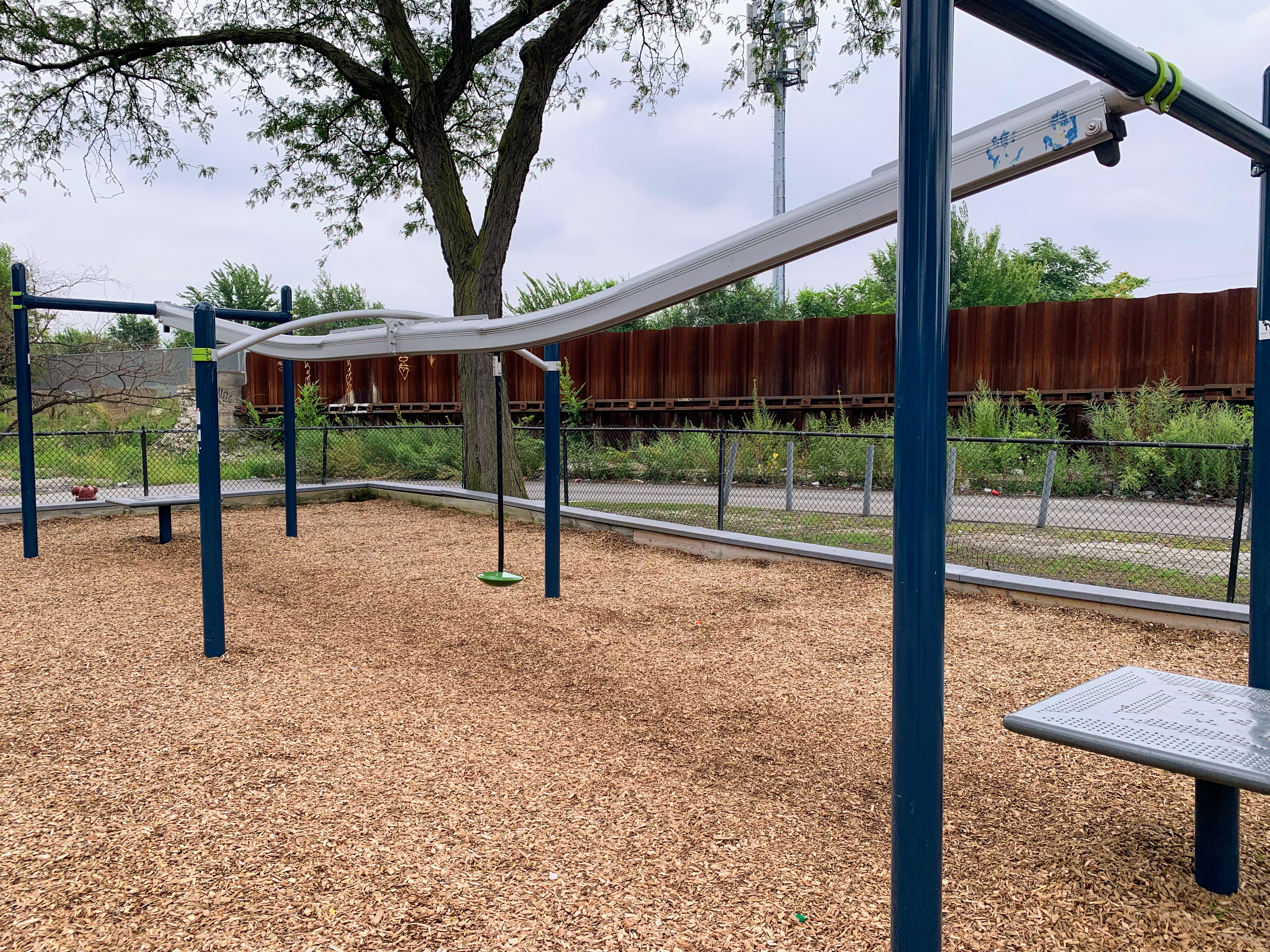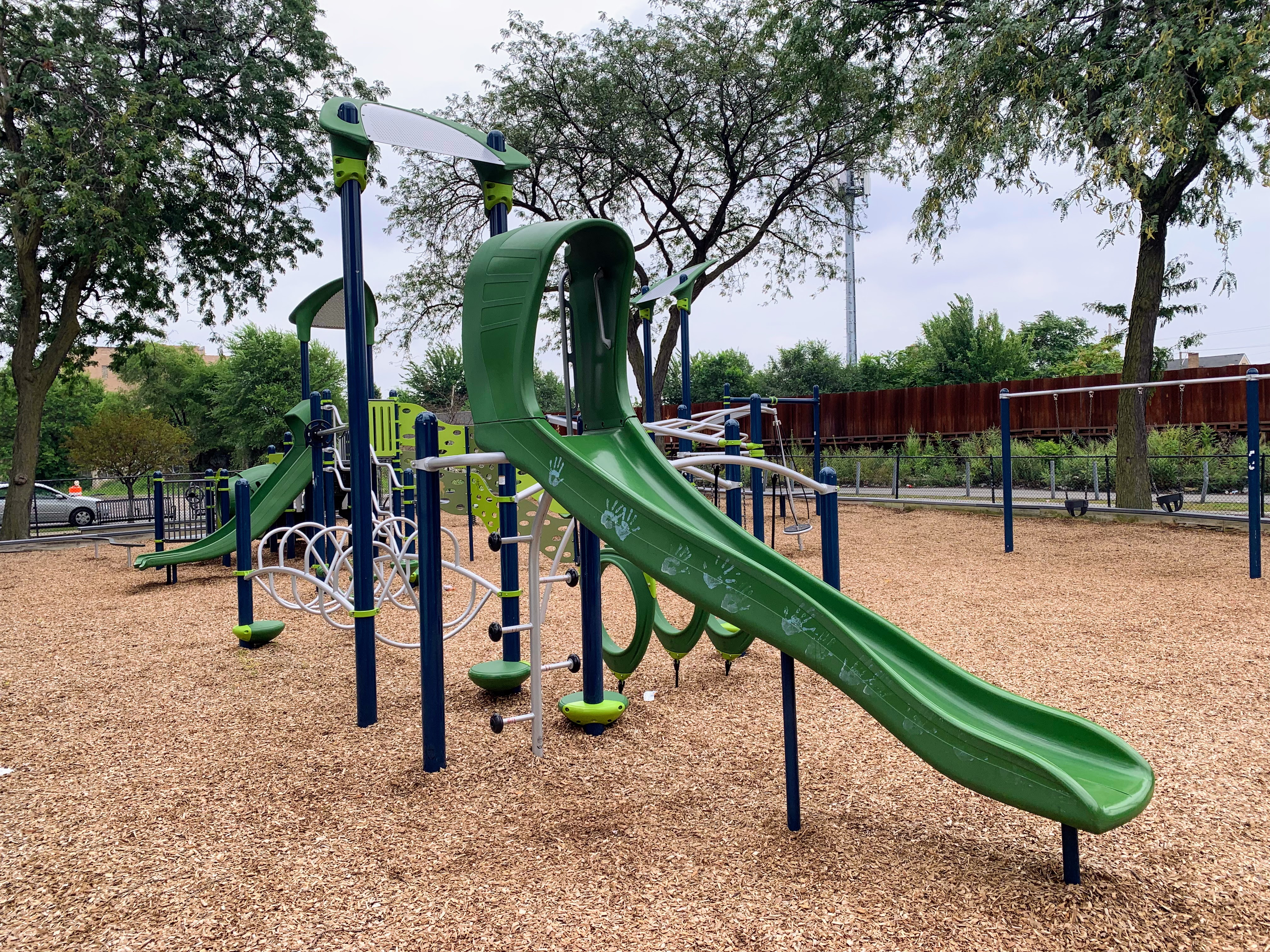 - Homan Park features a nice small playground on a quiet street with views of trains. The playground is somewhat sprawling with a variety of slides and climbing elements. There is also a set of swings and a zip line with a circle seat. The other aspects are classic Chicago playgrounds - wood chips and a few benches and a little shade from nearby trees. All in all, a solid neighborhood playground.