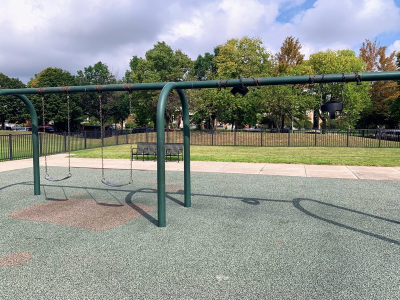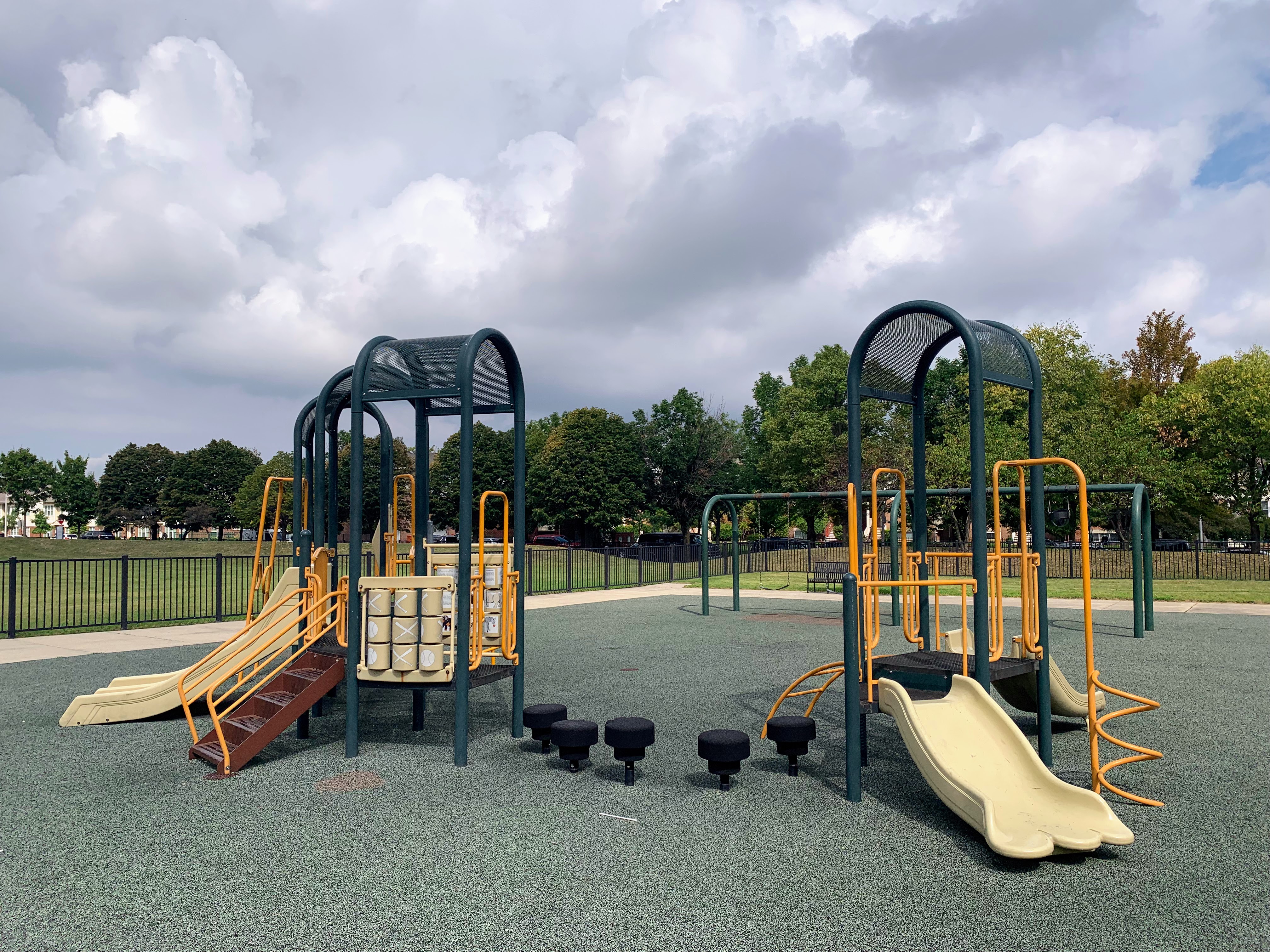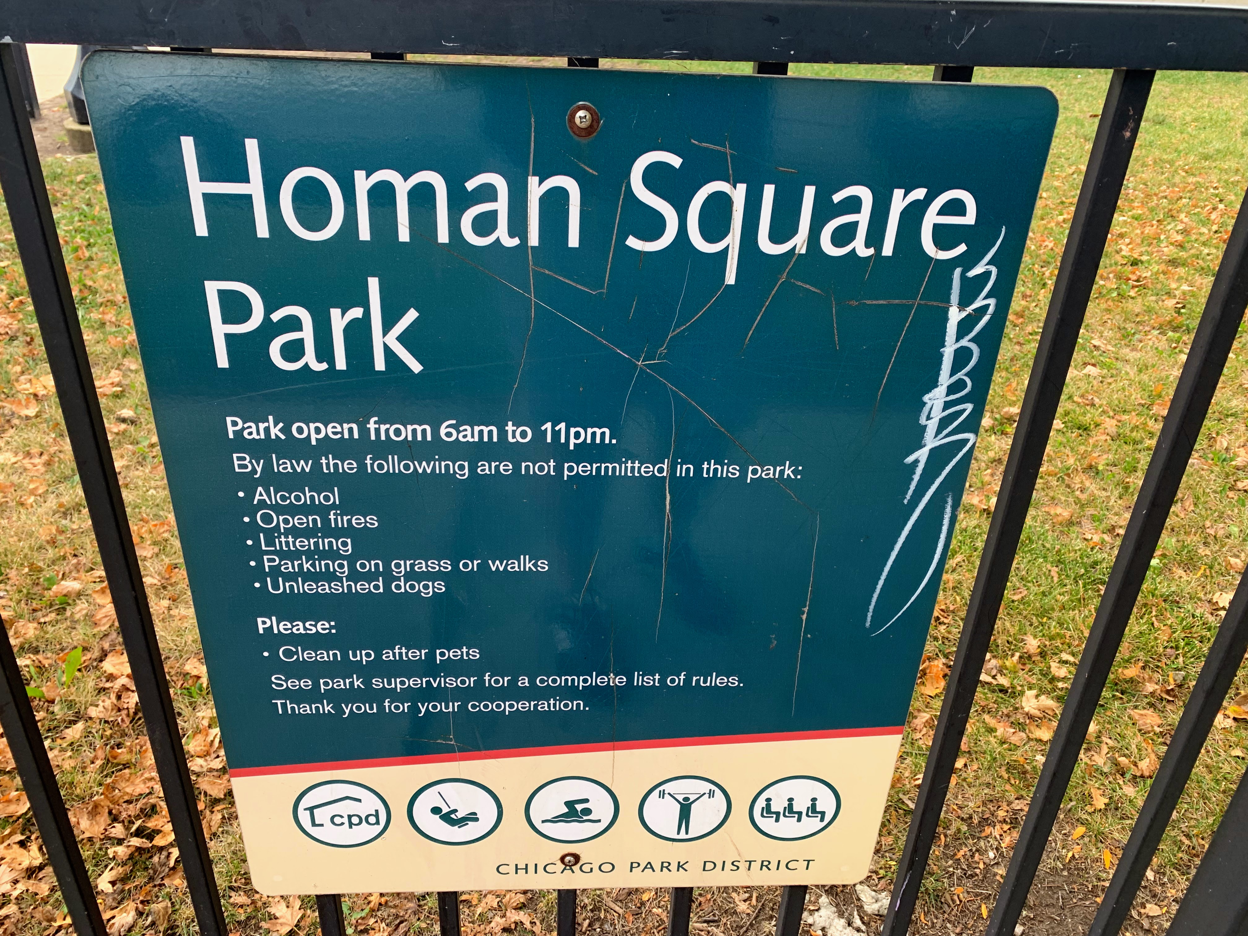 - This Homan Square Community Center Park opened in 2001 and contains a small playground designed for young children. There are two small play structures both for young children with simple climbing elements and small slides. The small play area also includes a swing set. The playground is fully enclosed from the street - with a fence surrounding the park and another surrounding the playground - and is positioned next to the community center. The play surface is soft rubber and there are benches for seating. Sadly, there is no shade for this playground.