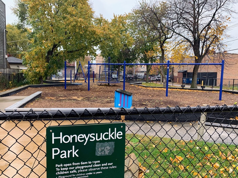 - Honeysuckle Park is a tiny neighborhood pocket park that features a very unique playground. There are just a handful of elements in the playground: toddler swings, belt seat swings, a saucer swing, a large conical climbing element, and an even larger climbing element that resembled a bridge under construction. So although the play elements aren't traditional (no slides at this playground!) the equipment was interesting and well-maintained. The setting and non-play elements are fine; there are a few benches as well as a drinking fountain. The surface is wood chips and there are a few trees providing nice shade. All in all, this is a unique little playground.