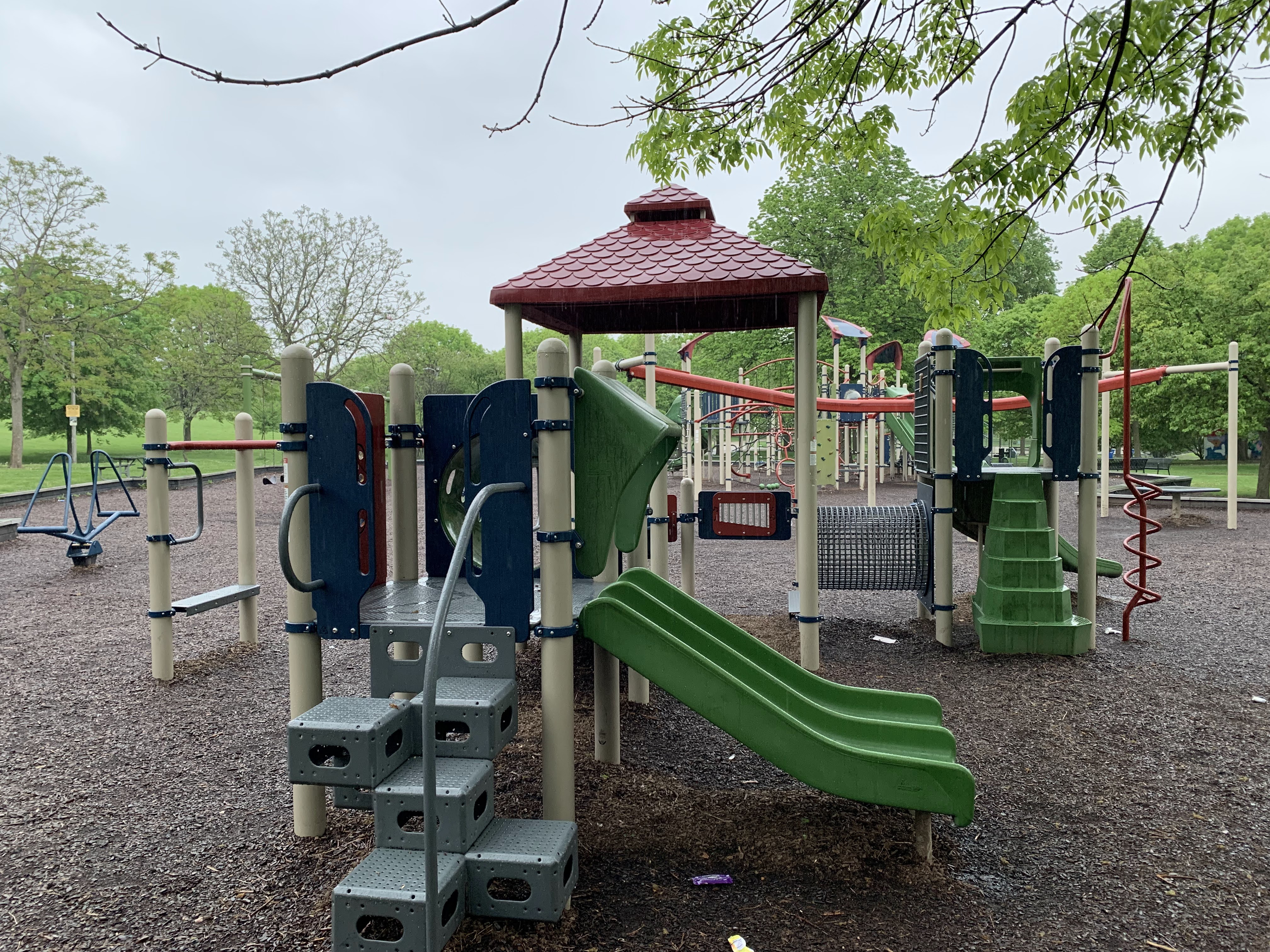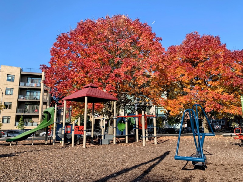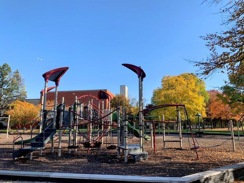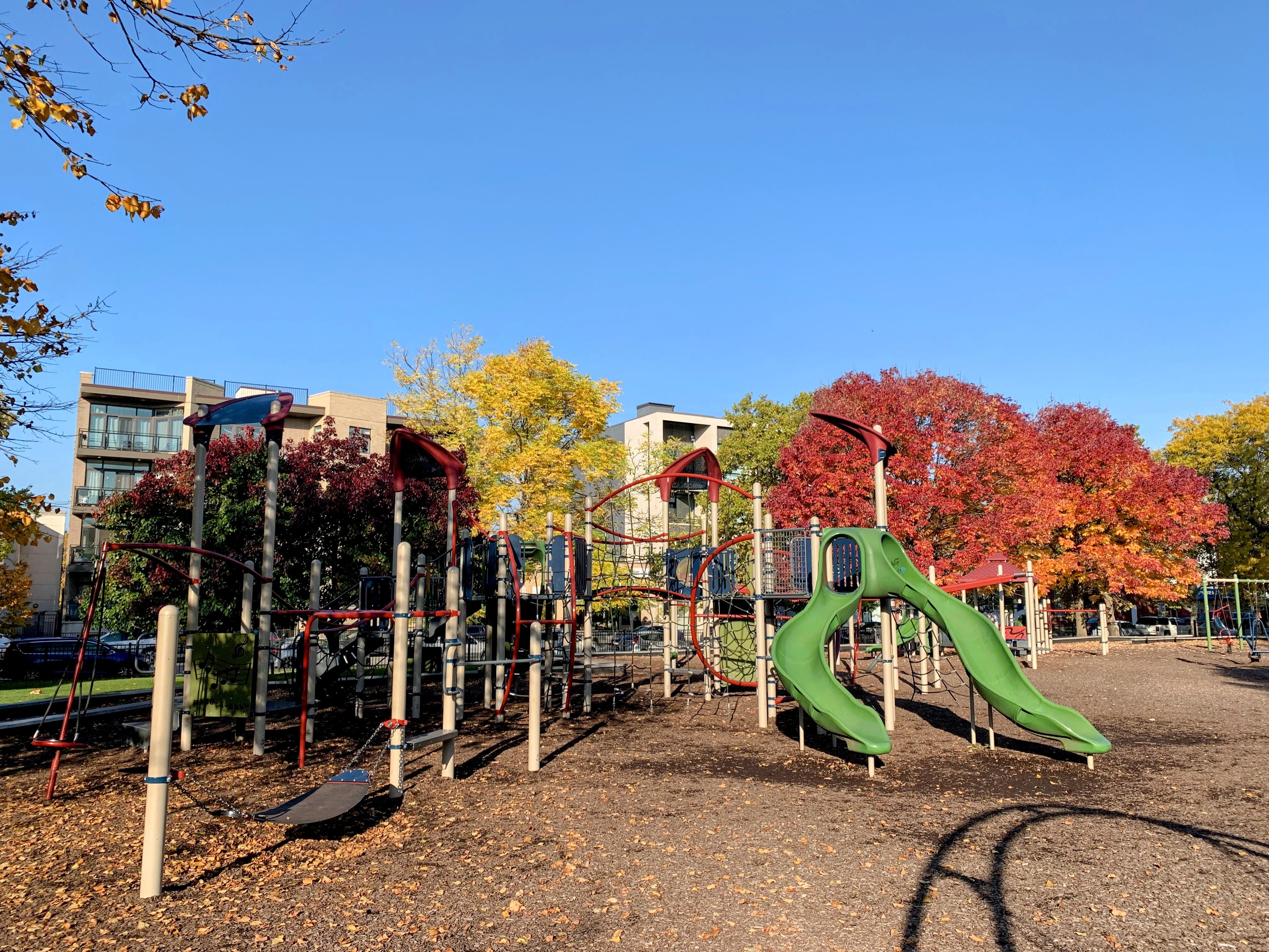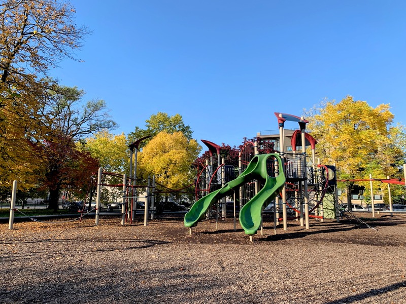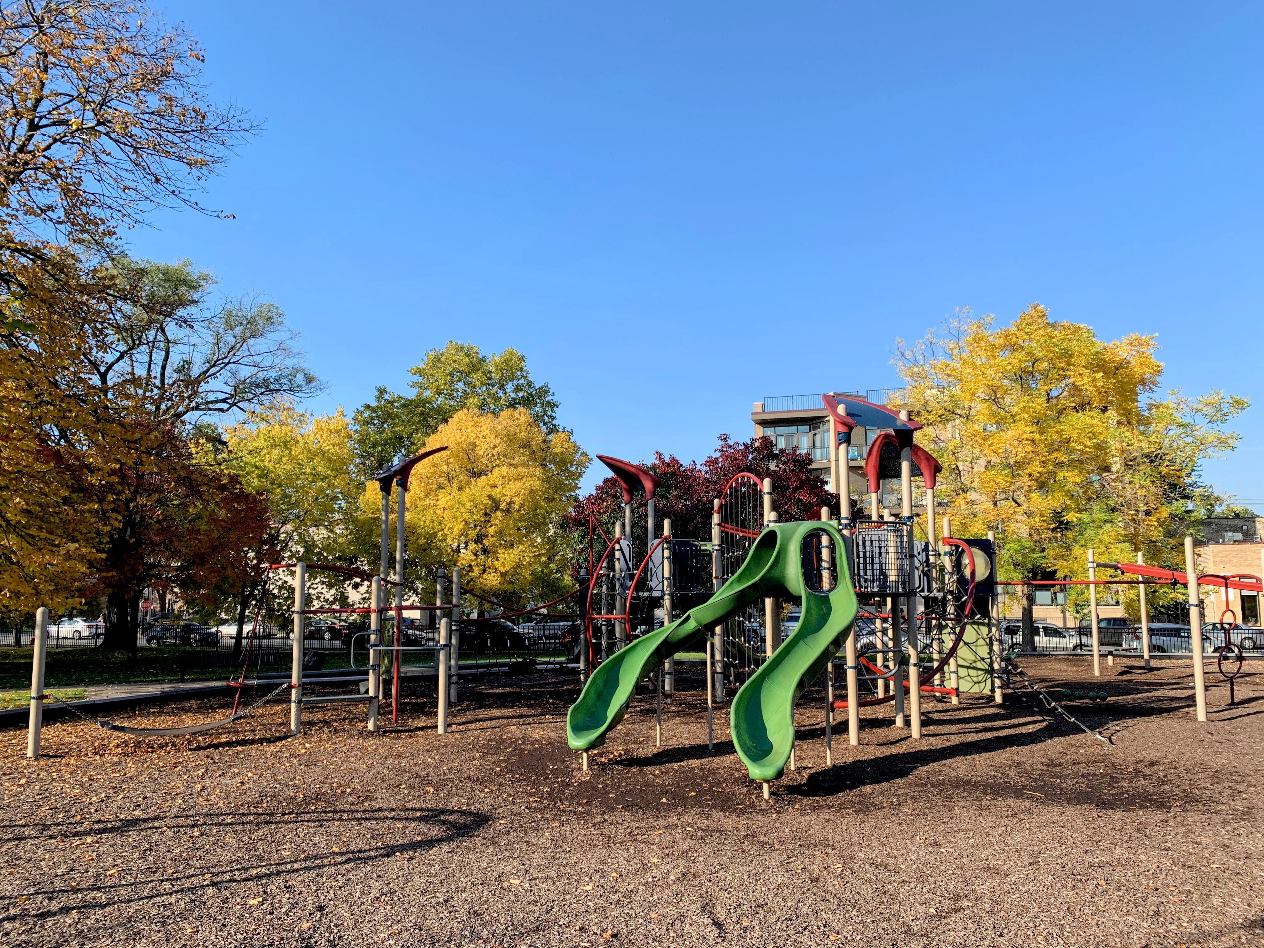 Beyond the playground, Horner Park is one of the largest parks in the area and includes a large hill that is perfect for flying kites or sledding; a free parking lot of California Avenue; and a walking path around the entire park perfect for walking, biking, or riding scooters. There is also a small (and I believe unofficial) nature play area south of the parking lot off California. - Playground Features