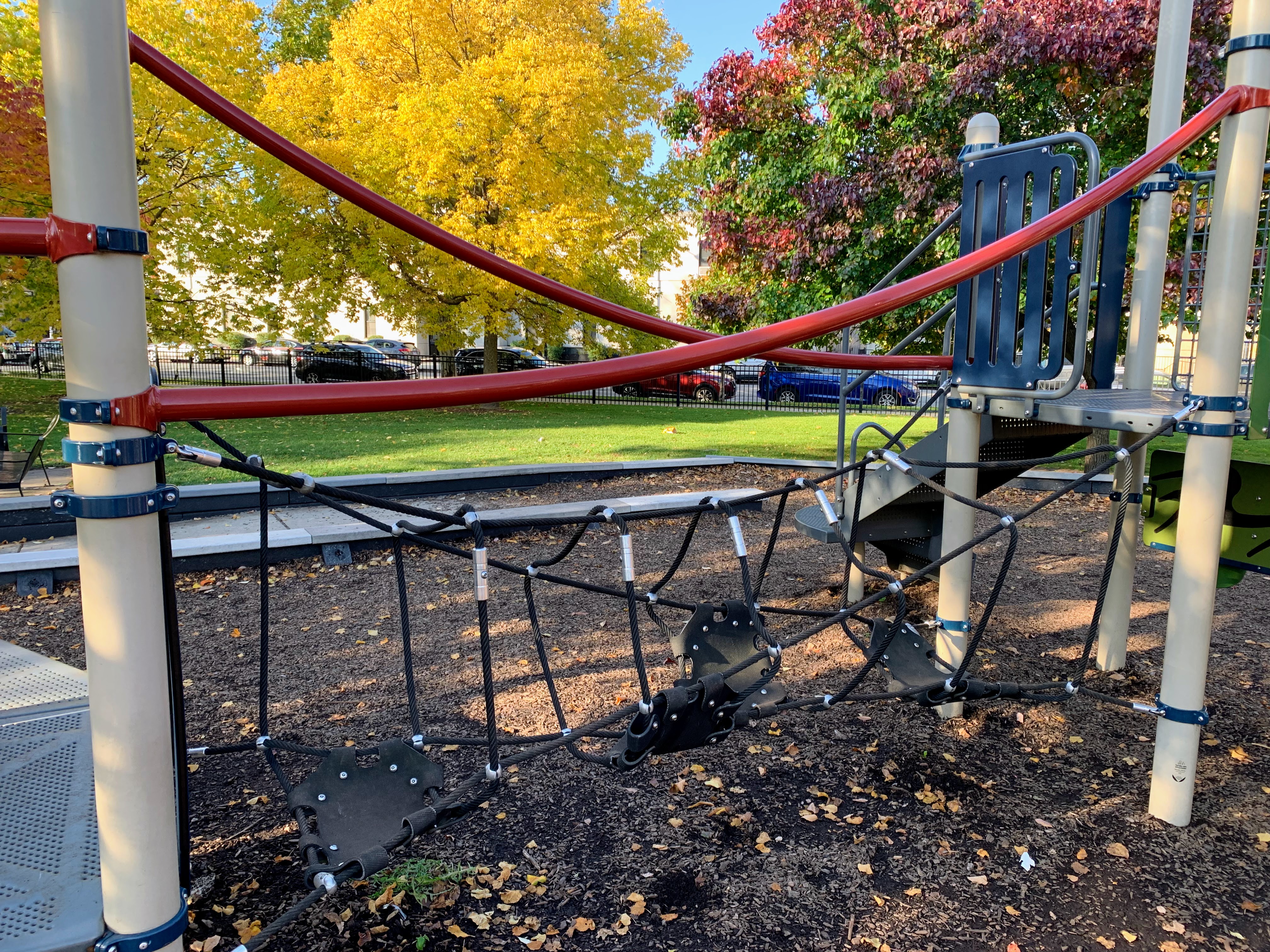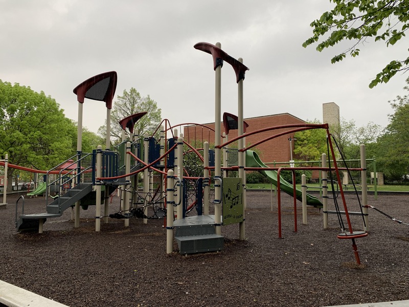 The Horner Park playground is - in a word - amazing. There are two play large play structures, a small zipline, a variety of swings, and a few other standalone elements that make this a destination playground. The smaller structure for younger children contains a few slides, tubes, and climbing features as well as a few interactive panels. The larger structure for older children is quite large; it features multiple platforms connected by various bridges and net/rope climbing elements and several slides. There is a small zipline with a hanging circle seat. There are a lot of swing options: toddler, molded bucket seat with a harness, belt seat, and a large standalone saucer swing.