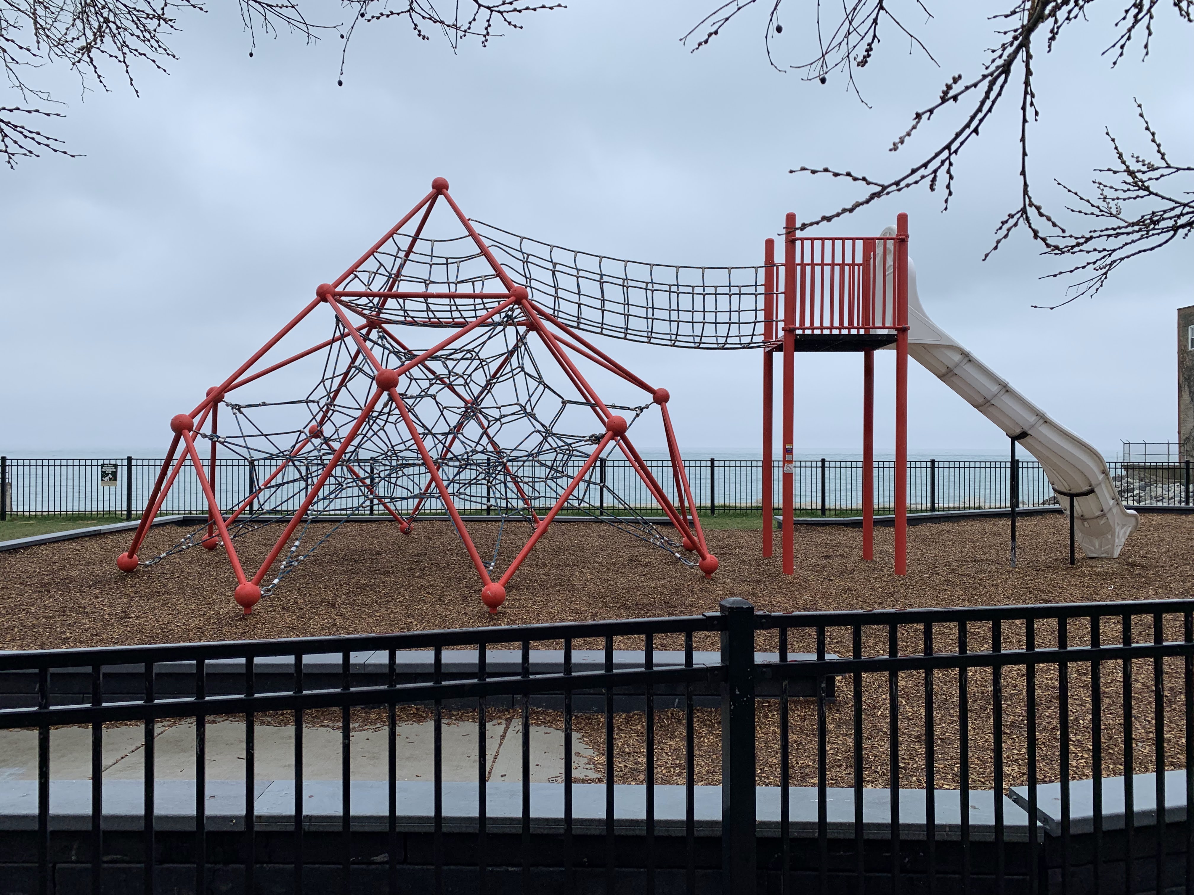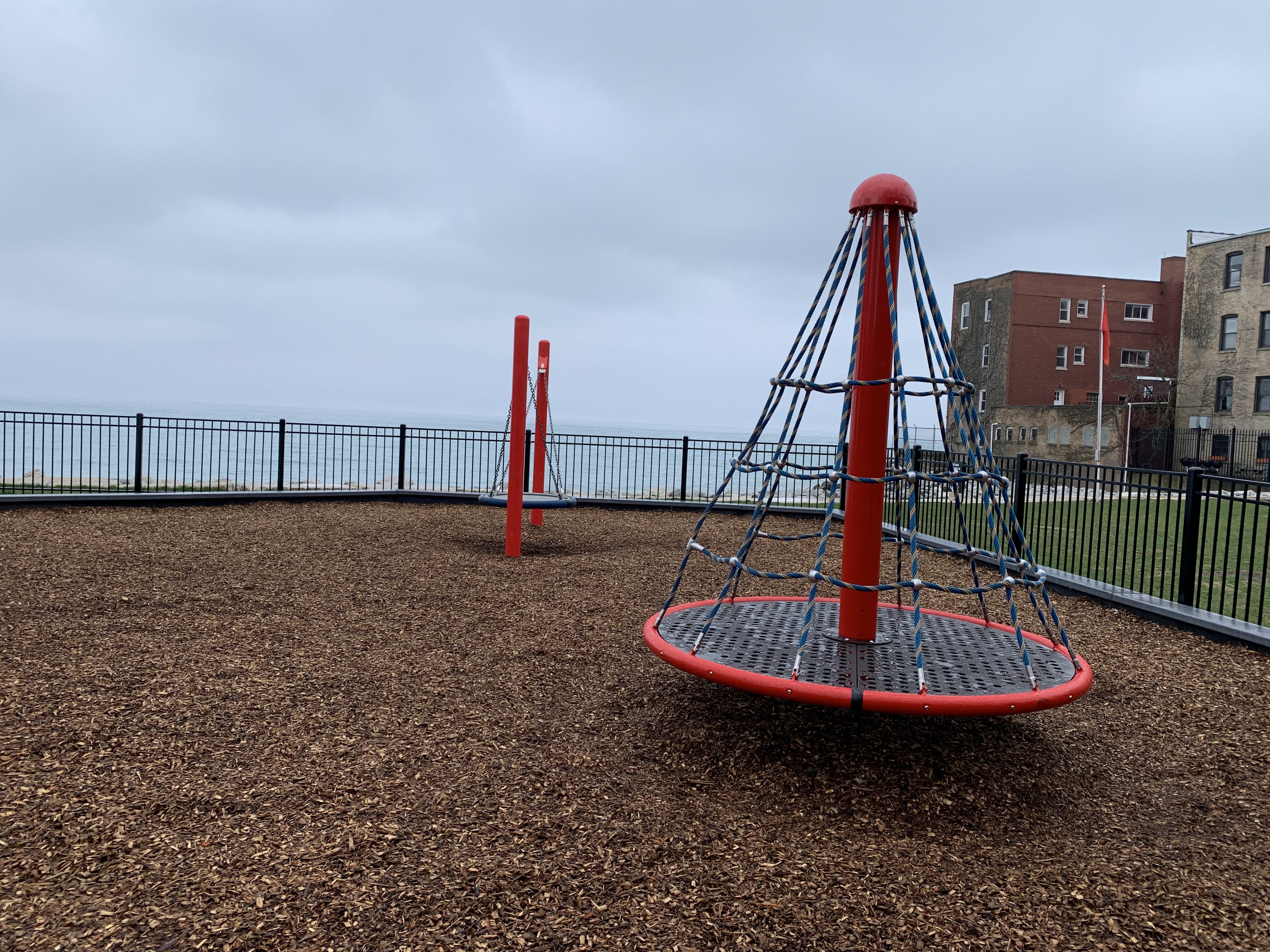 - This small playground features a large net climbing structure with a rope bridge leading to a curving slide, a hammock saucer swing, and a large spinning conical climber. The play area is somewhat enclosed and is the play surface is wood chips. There are a few benches near the playground and provides unobstructed views of Lake Michigan.
