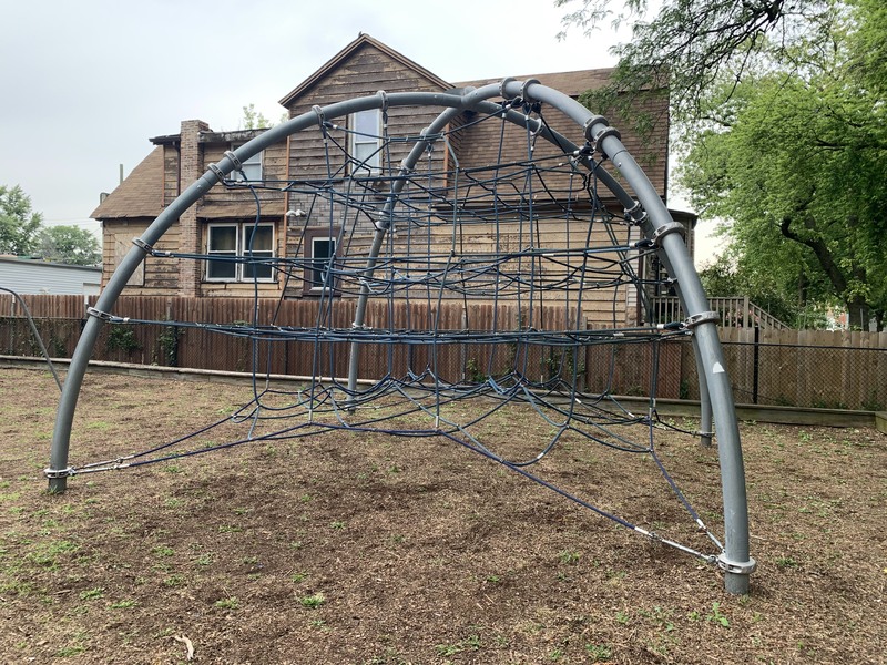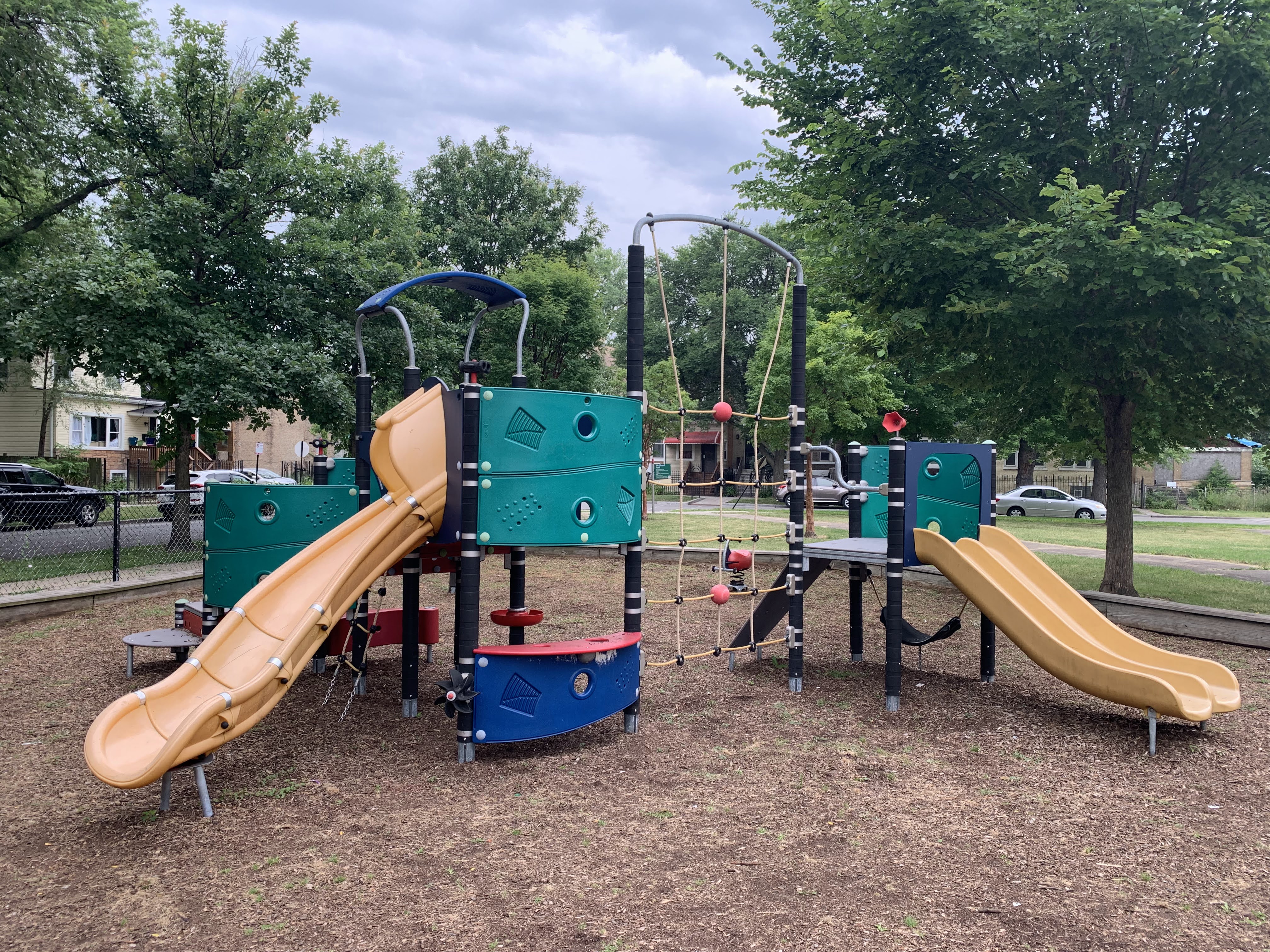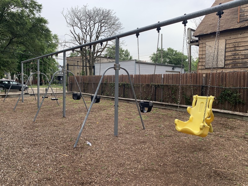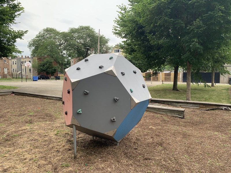 - This playground features a play structure with a few slides, a large rope/net climbing structure, and a 'bloqx' (a geometric shape with climbing holds) as well as the standard set of Park District swings. The play area opens to the rest of the park and the nearby streets and sadly lacks benches (though low perimeter walls provide some informal seating). The surface is wood chips and some nearby trees provide some shade especially in the morning.