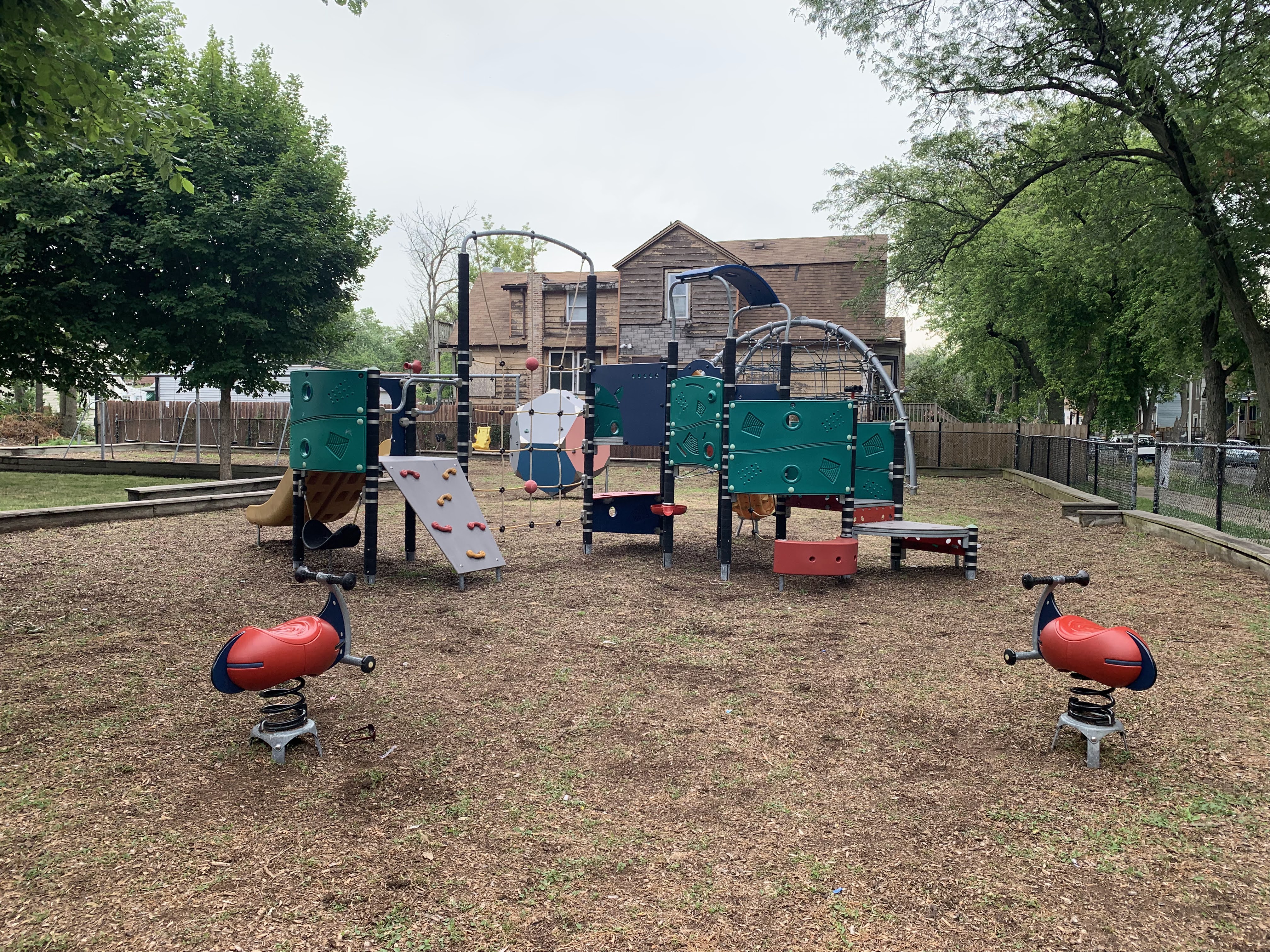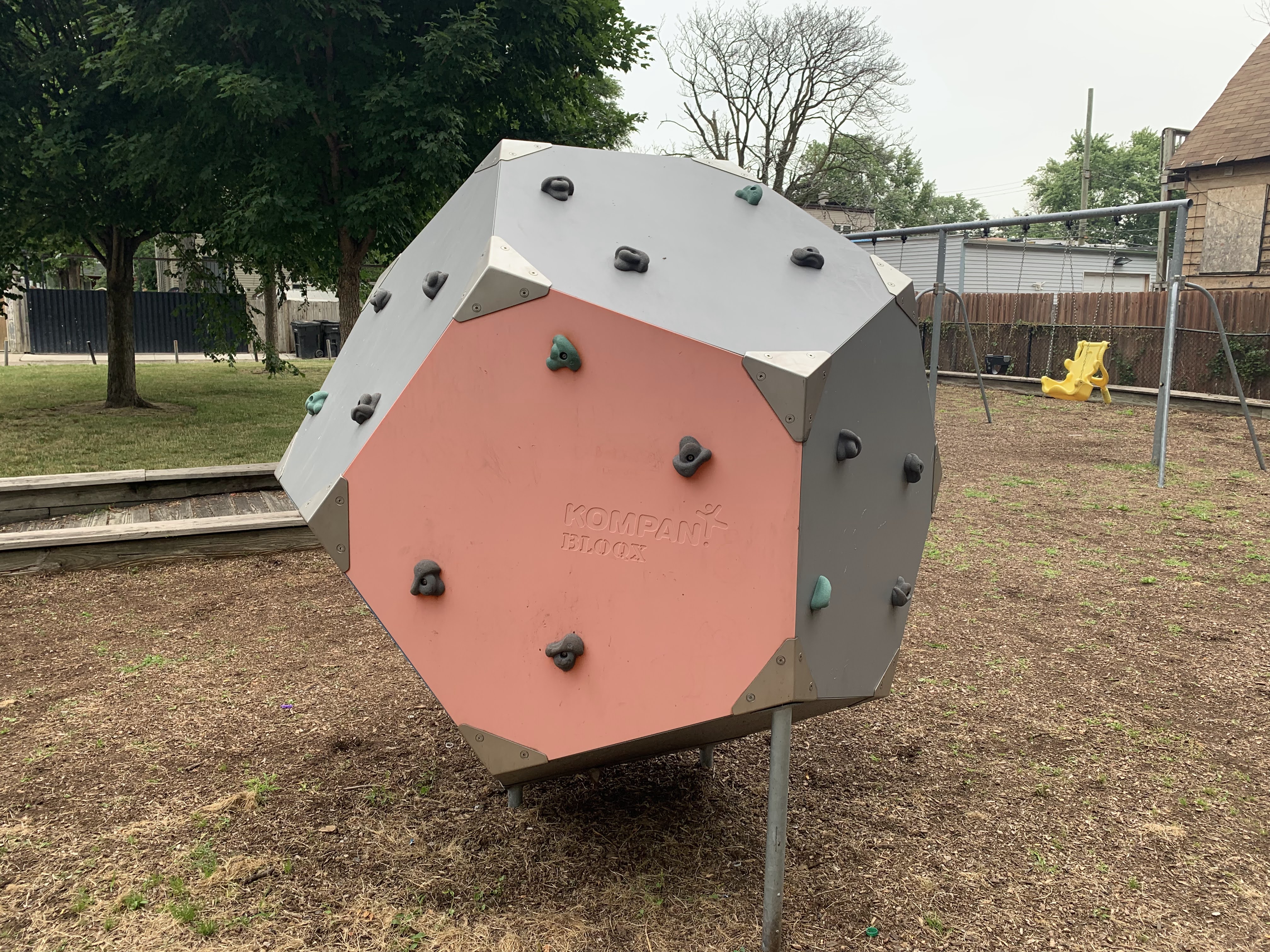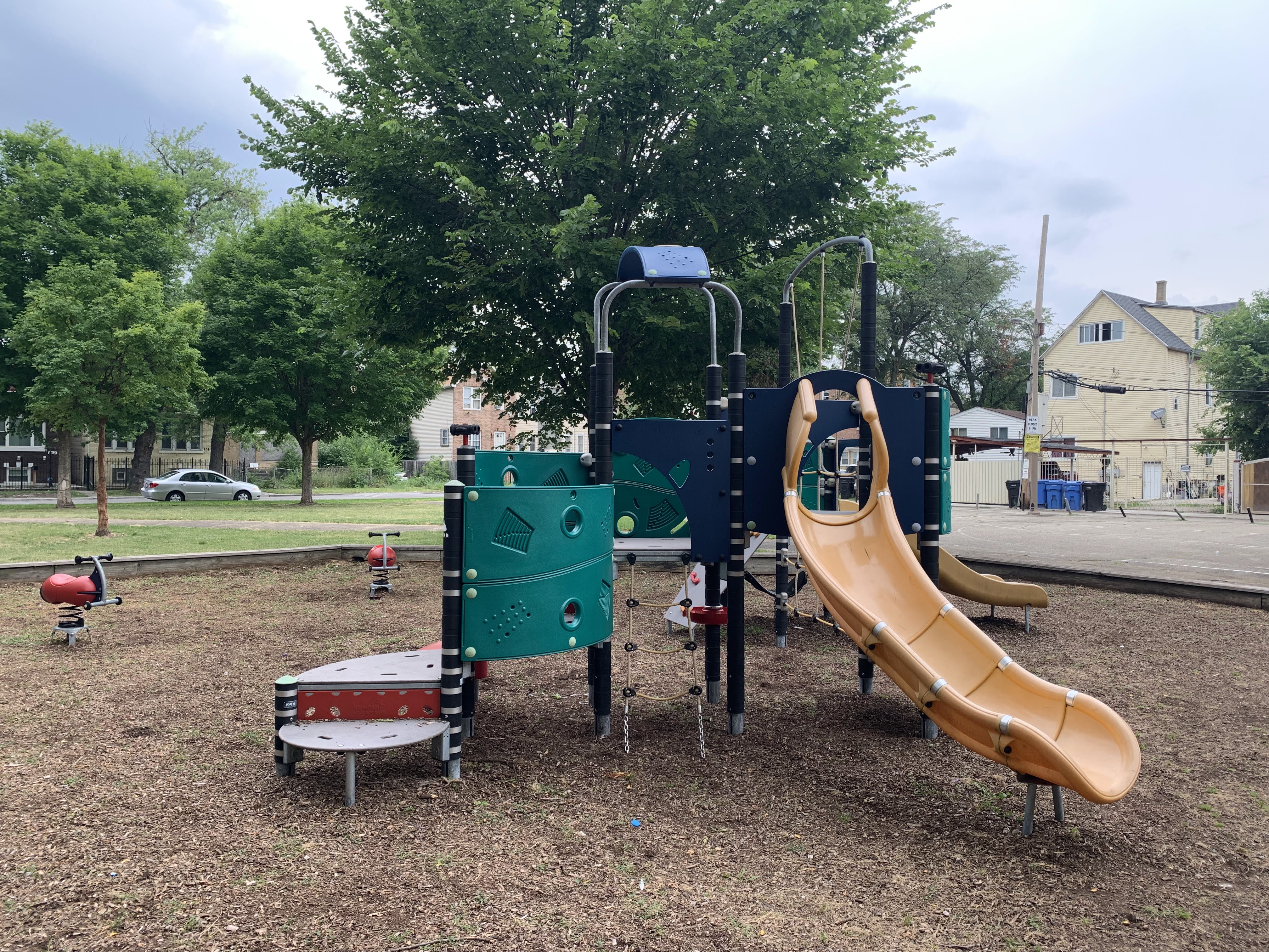 - This playground features a play structure with a few slides, a large rope/net climbing structure, and a 'bloqx' (a geometric shape with climbing holds) as well as the standard set of Park District swings. The play area opens to the rest of the park and the nearby streets and sadly lacks benches (though low perimeter walls provide some informal seating). The surface is wood chips and some nearby trees provide some shade especially in the morning.
