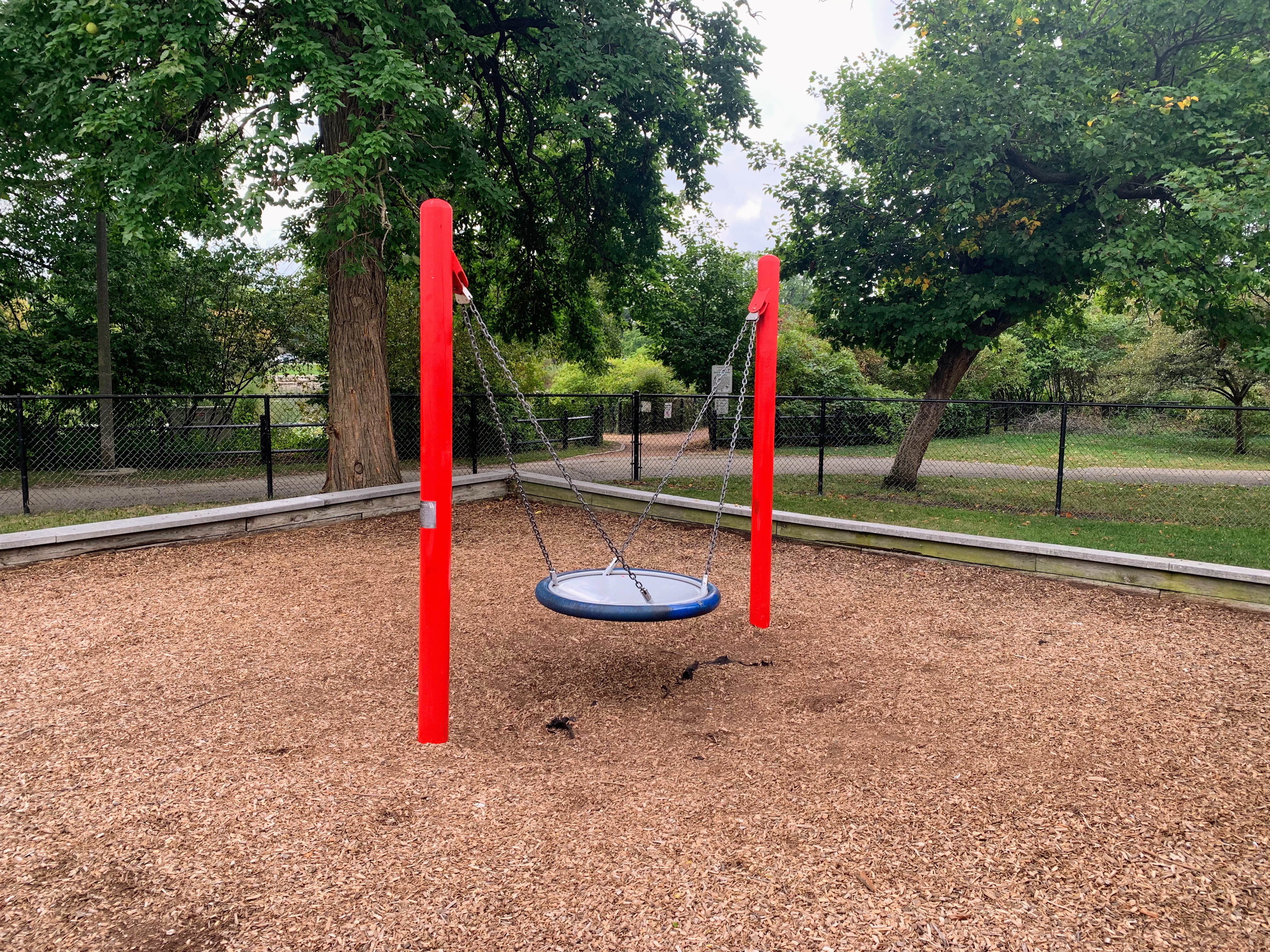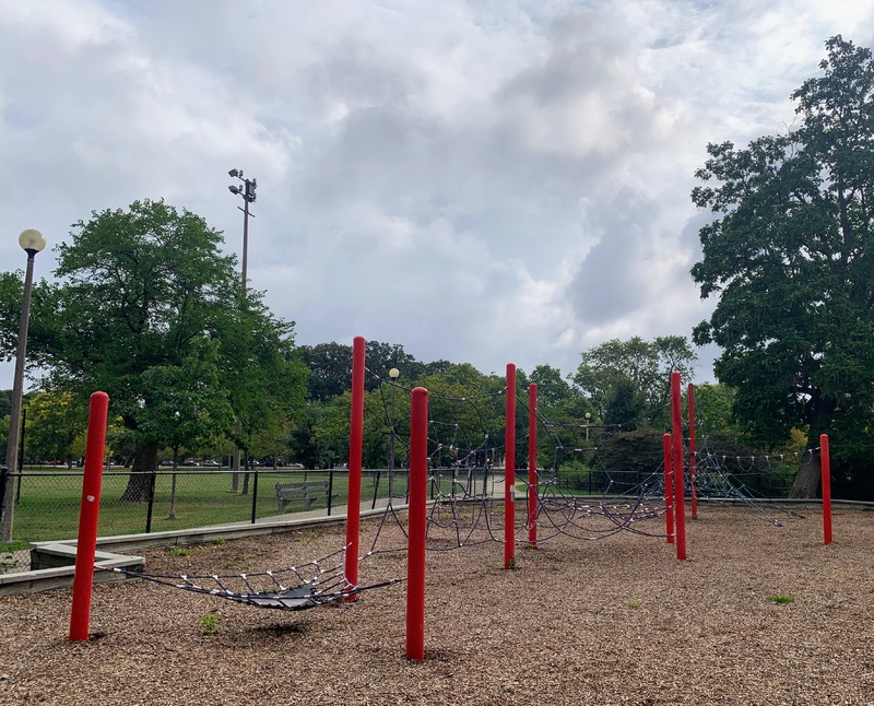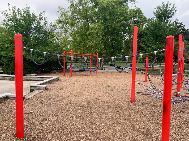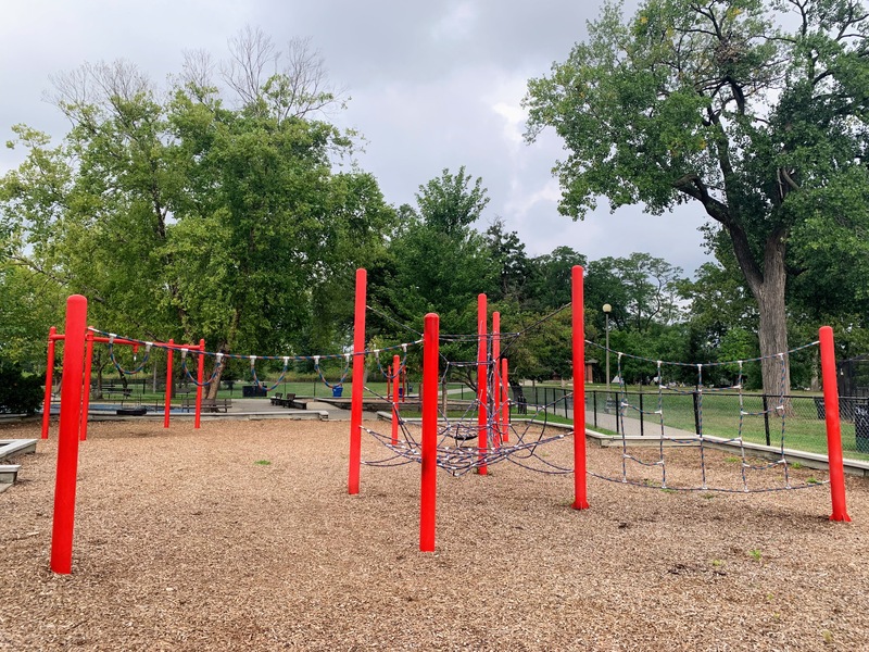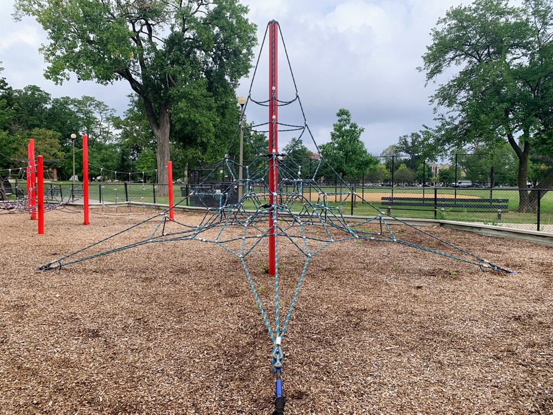 This playground - one of 5 in Humboldt Park - is located in the northeast corner of the park just north of the Humboldt Park lagoon. This playground is also somewhat not traditional - there aren't standard toddler or belt seat swings or even a slide in the entire sprawling playground! Instead, there are a few non-traditional swings (one tire swing and a few saucer swings), a rope net climbing structure, a collection of rope net traverse elements, and an area with spinning elements. The centerpiece of this playground is a large water spray feature.