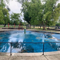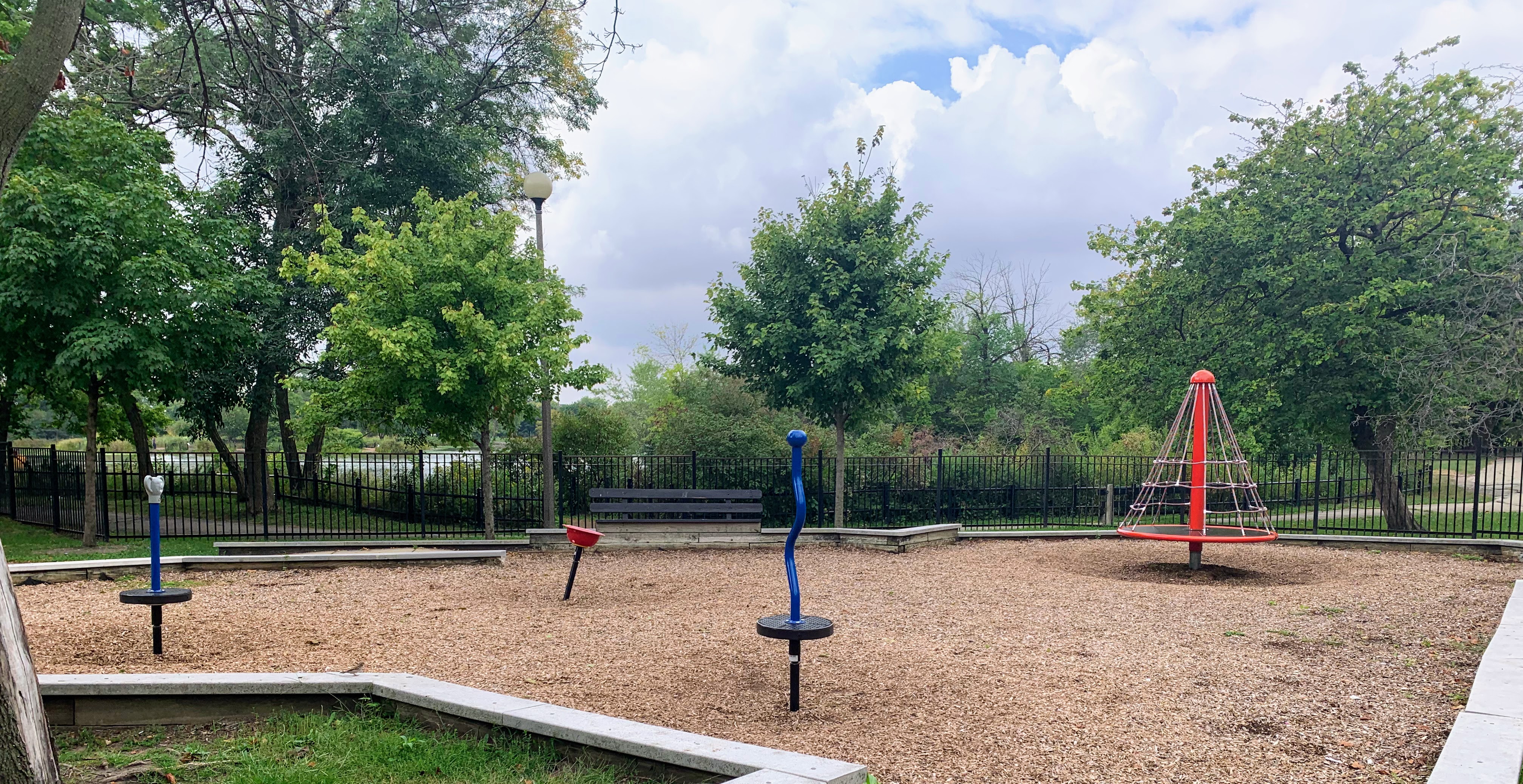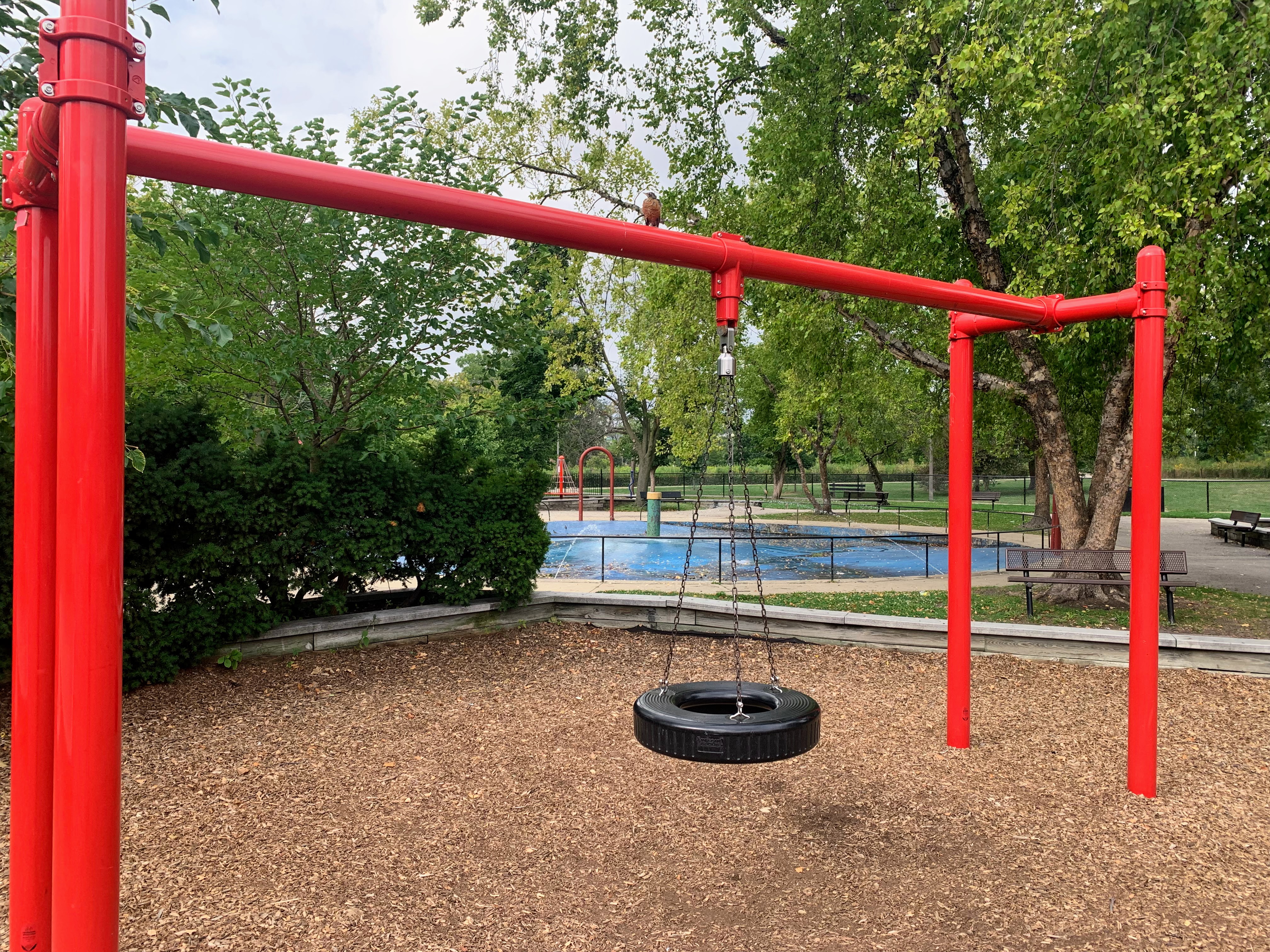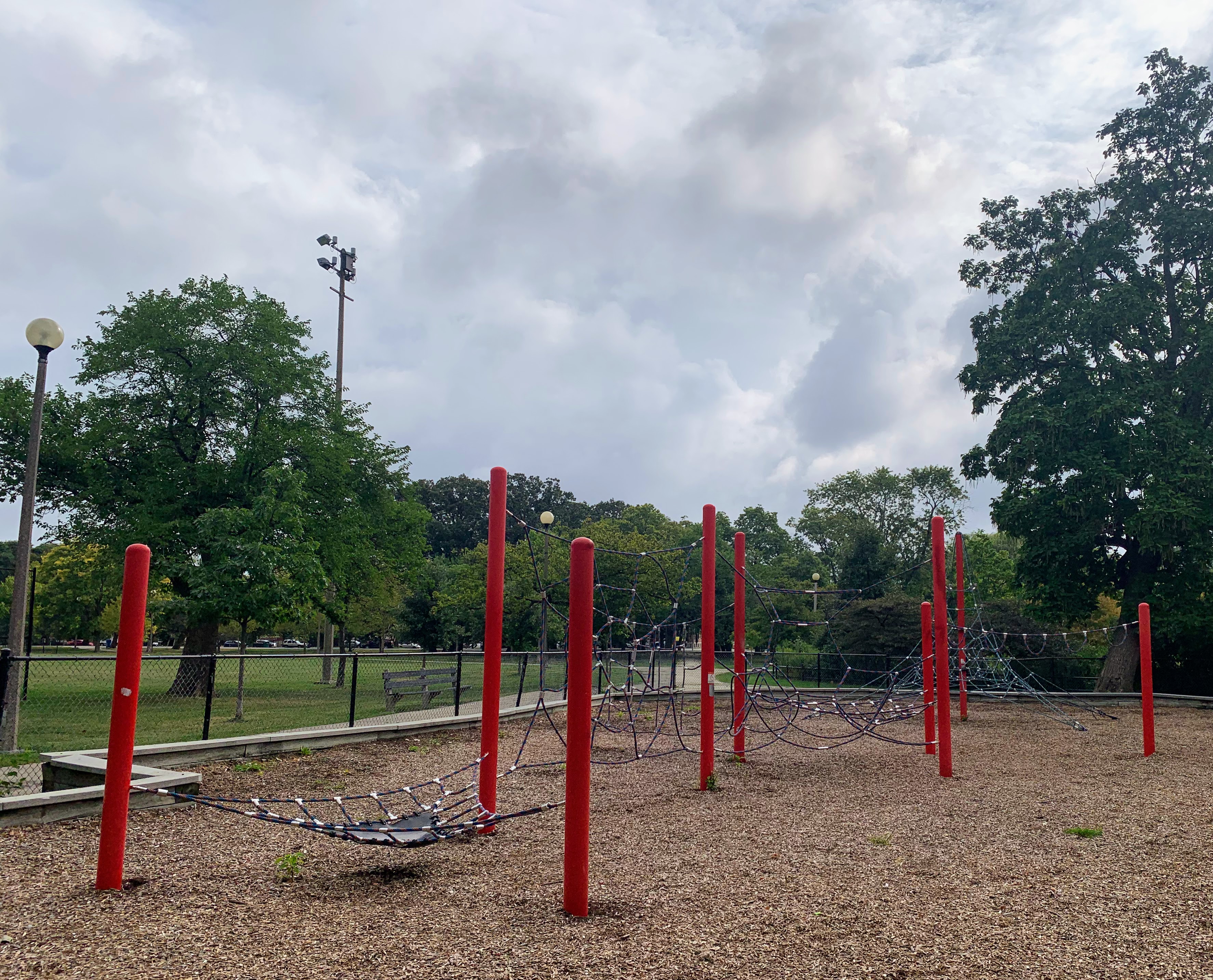 This playground - one of 5 in Humboldt Park - is located in the northeast corner of the park just north of the Humboldt Park lagoon. This playground is also somewhat not traditional - there aren't standard toddler or belt seat swings or even a slide in the entire sprawling playground! Instead, there are a few non-traditional swings (one tire swing and a few saucer swings), a rope net climbing structure, a collection of rope net traverse elements, and an area with spinning elements. The centerpiece of this playground is a large water spray feature.