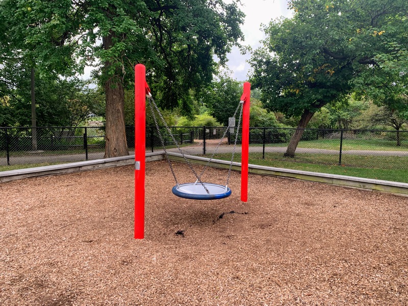 With the somewhat non-traditional elements are some solid amenities. There are a few benches and trees for seating and shade. The play area is fenced from the surrounding park and set away from cars and traffic creating a surprisingly quiet play experience in the busy city. And the play surface is the classic wood chips.