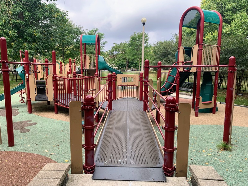 The amenities are also quite nice. The play area is fenced from the street (though not fully enclosed) and nicely surrounded by mature trees. Inside the play area are a few benches and even a picnic table for seating. The play surface is soft rubber and the larger play structure is somewhat accessible by a ramp.