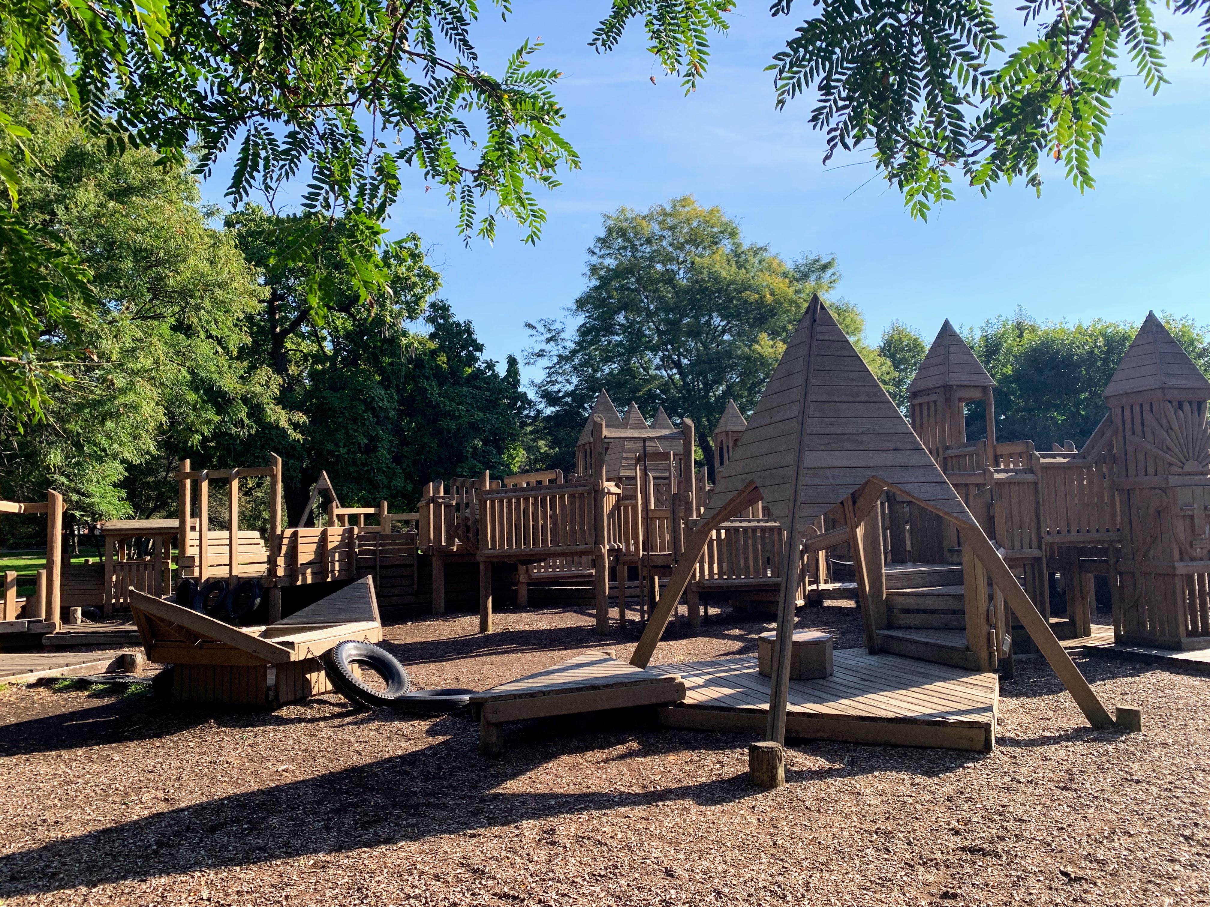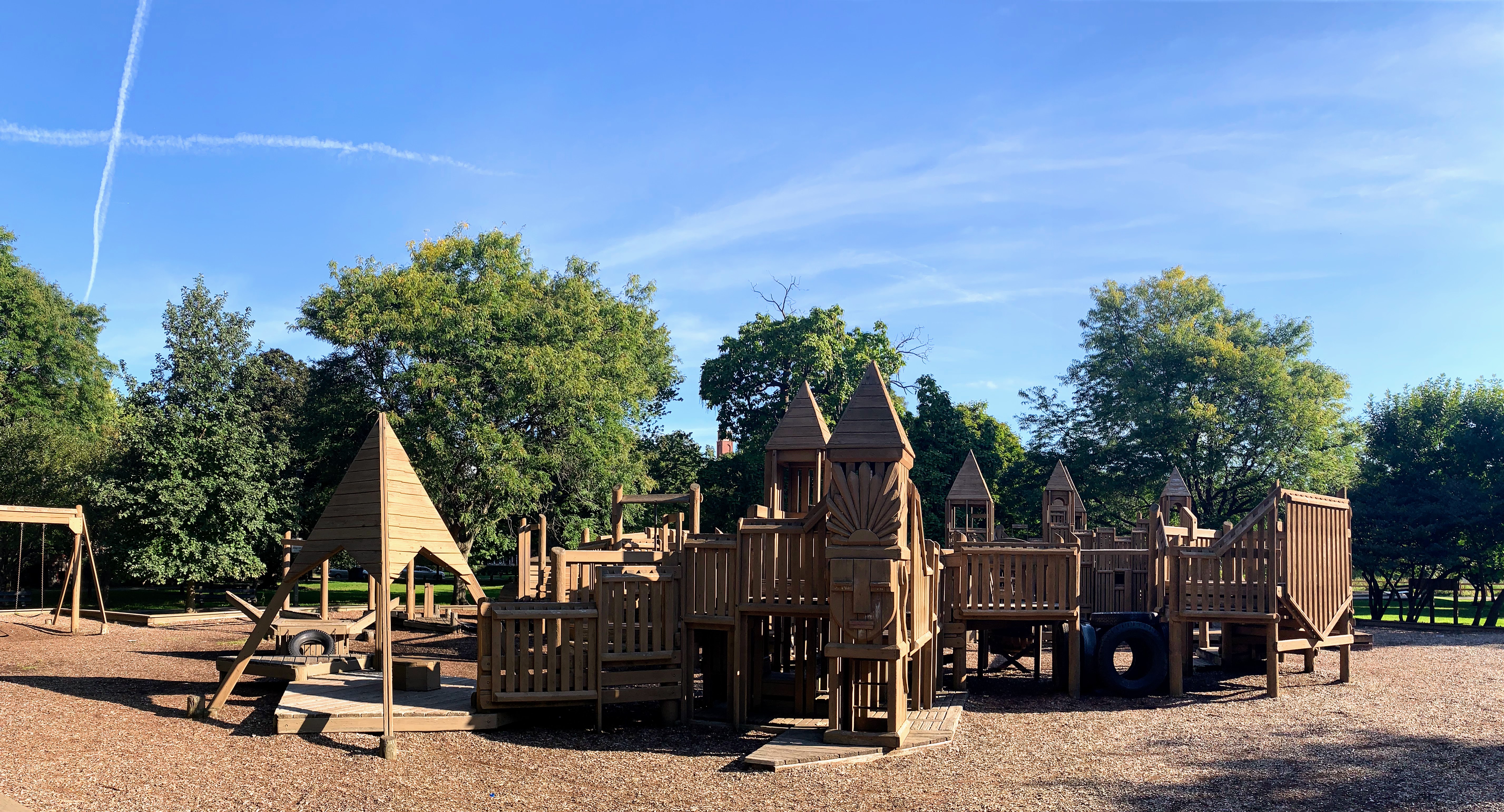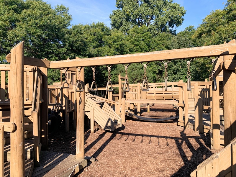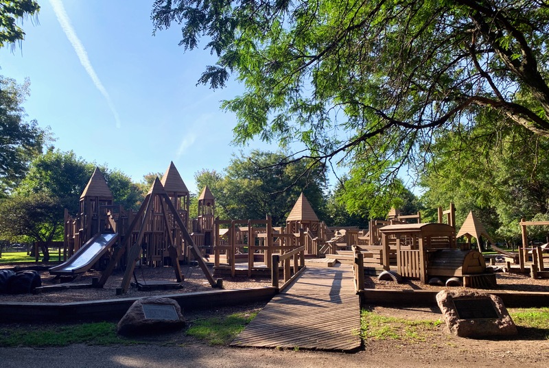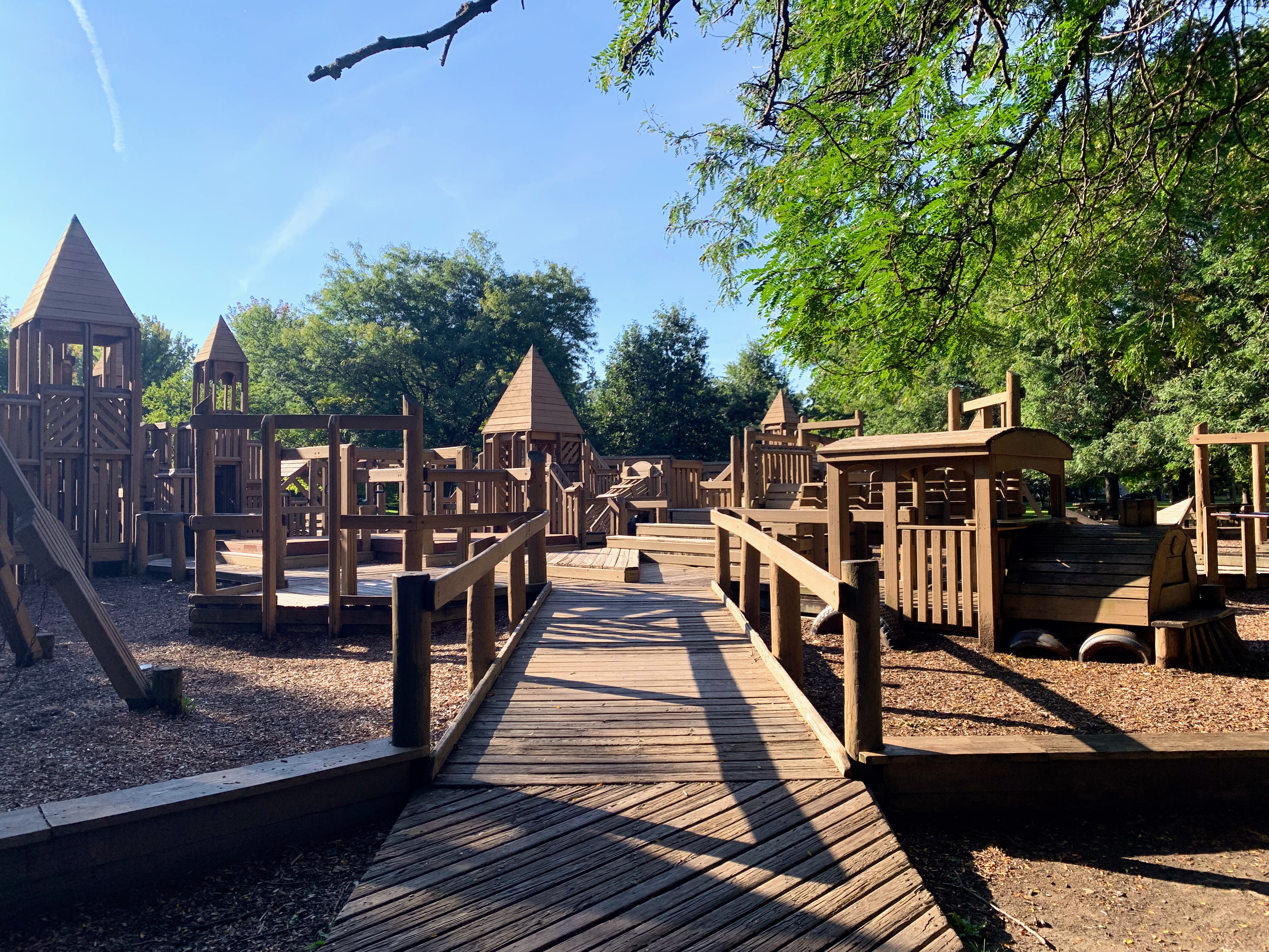 The playground at Indian Boundary Park is unlike most other playgrounds in Chicago and is an amazing place space. The structure is one of the few wooden playgrounds in Chicago (the other being Dorothy's Playground in Oz Park) and presents a sprawling and labyrinthine structure for kids to explore. This site can be crowded and it might be difficult to keep track of your child, but this is still a great playground to explore. The water spray area isn't as interesting or picturesque but is still an welcome amenity to the park.