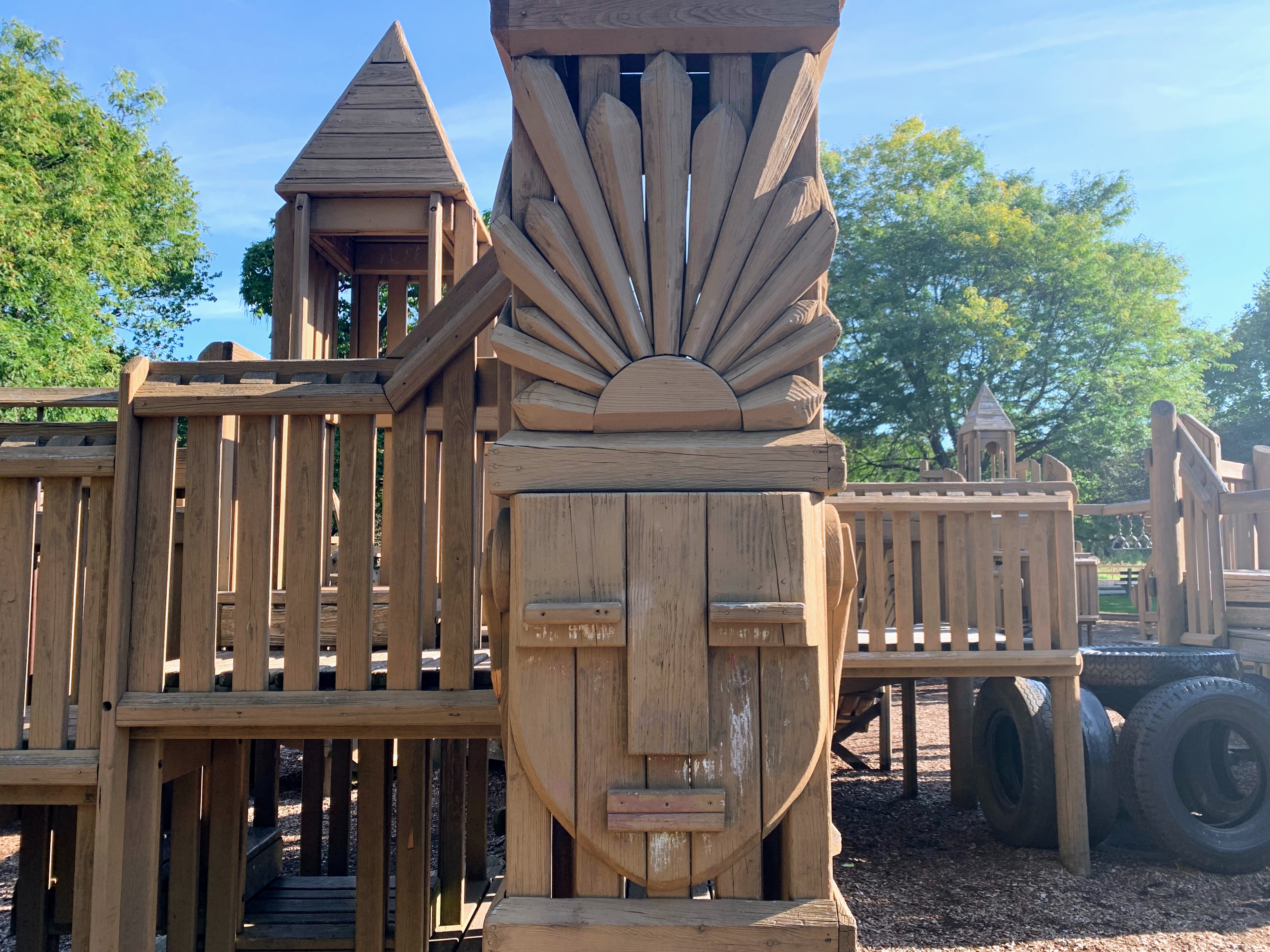 So in many ways, this is a wonderful park. It is, of course, also problematic. The park is called "Indian Boundary" because of the line created by an 1816 treaty between the United States and Native American tribes and both the playground and the park building feature Native American themes and images that are problematic.