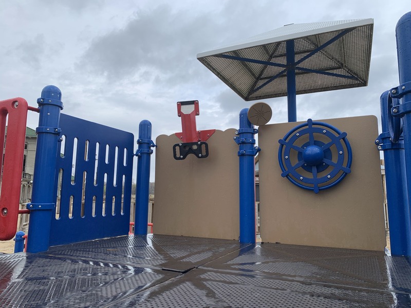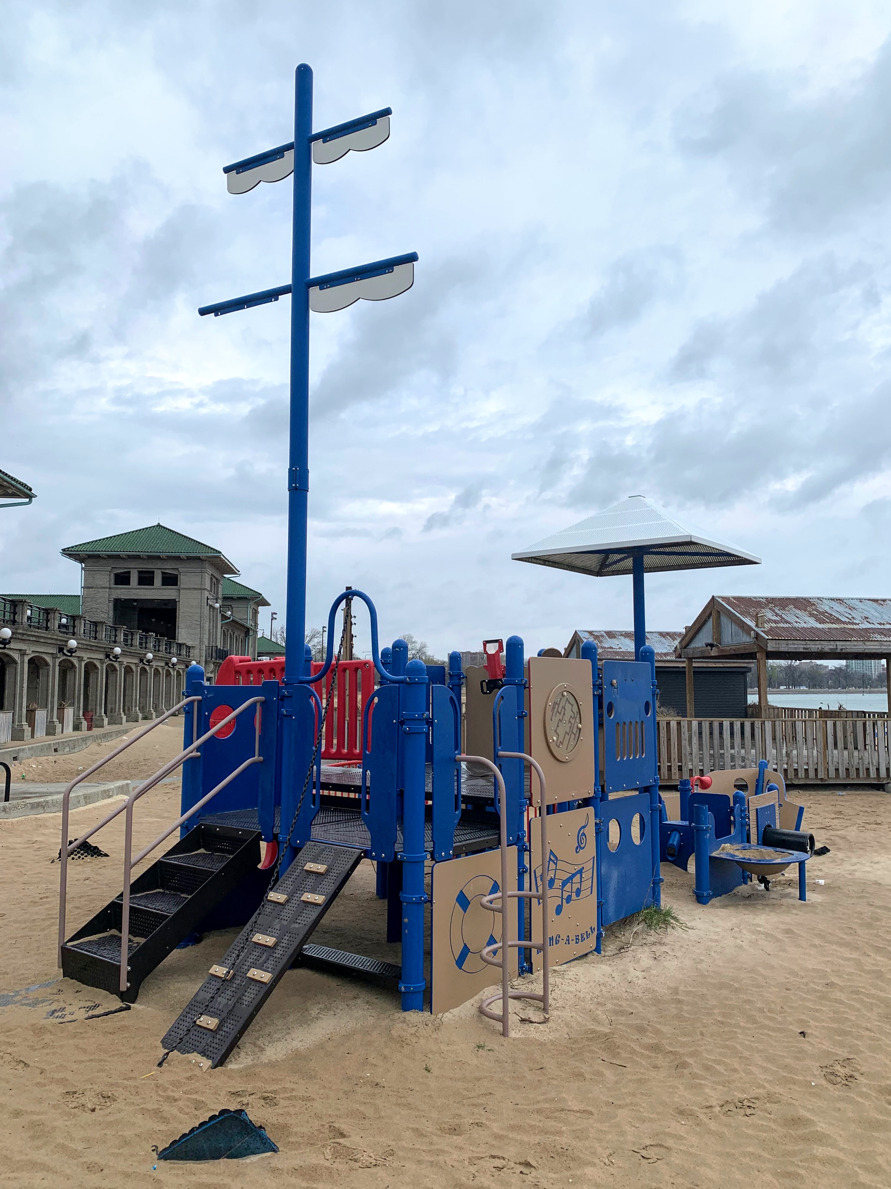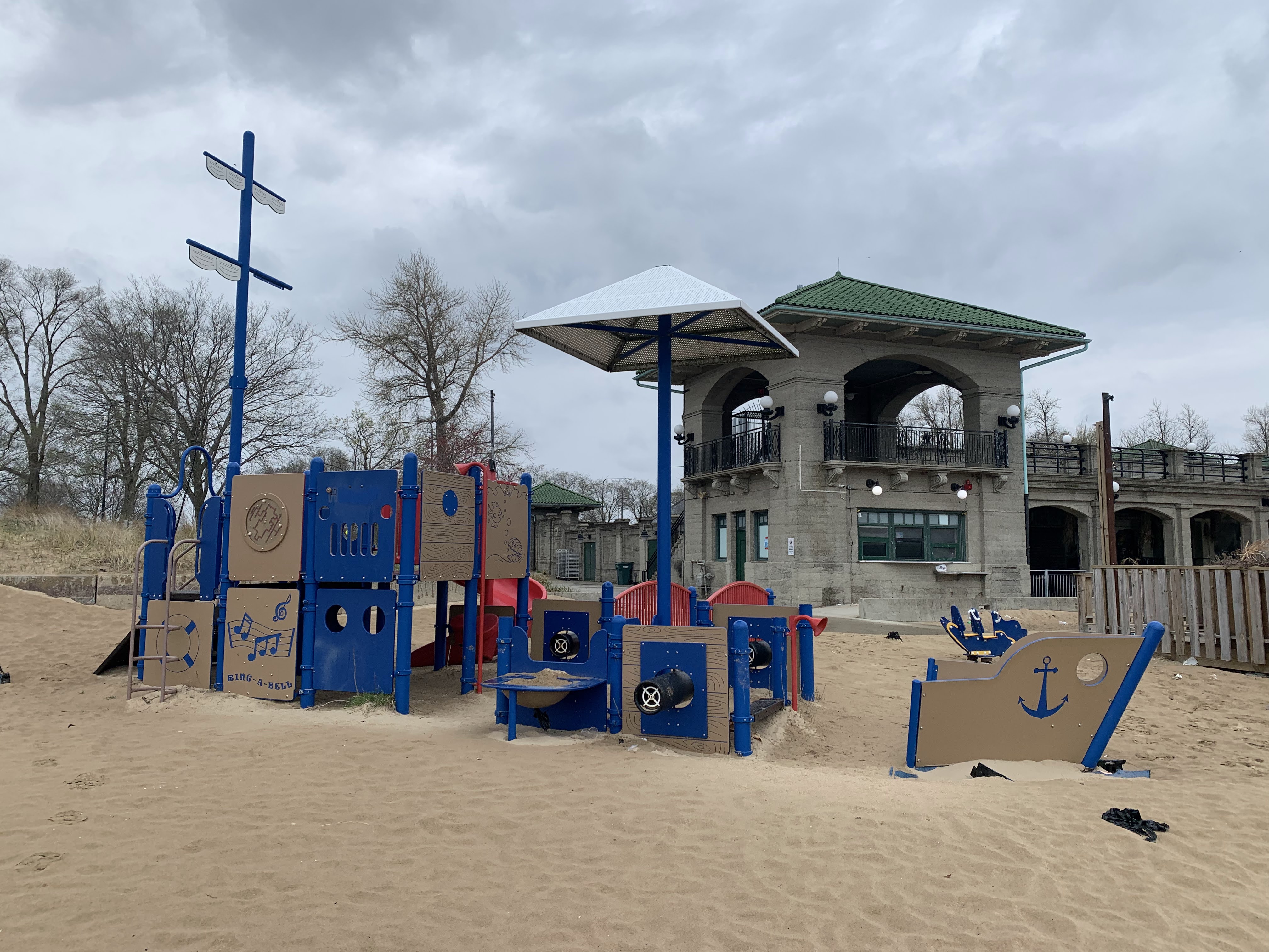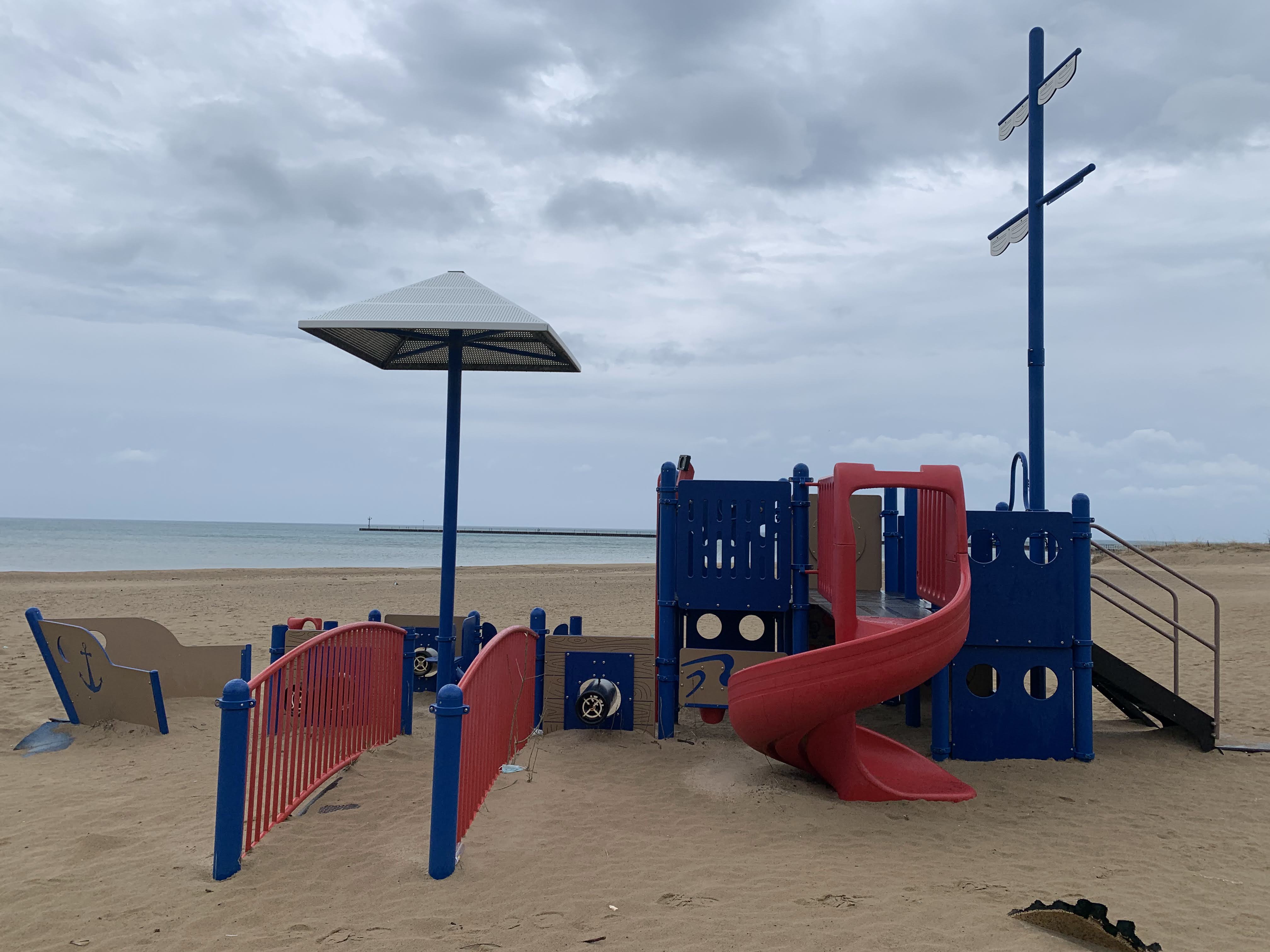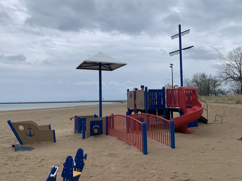 - This playground, situated on the 63rd Street Beach, reflects it's location with a strong nautical theme. The entire play structure is shaped like a ship and is equipped with a steering wheel, tall mast, and even canons! This playground is fully integrated with the beach and is therefore not enclosed, in full sun, and the play surface is - of course - sand. This creates a unique play experience and offers some great views of Lake Michigan.