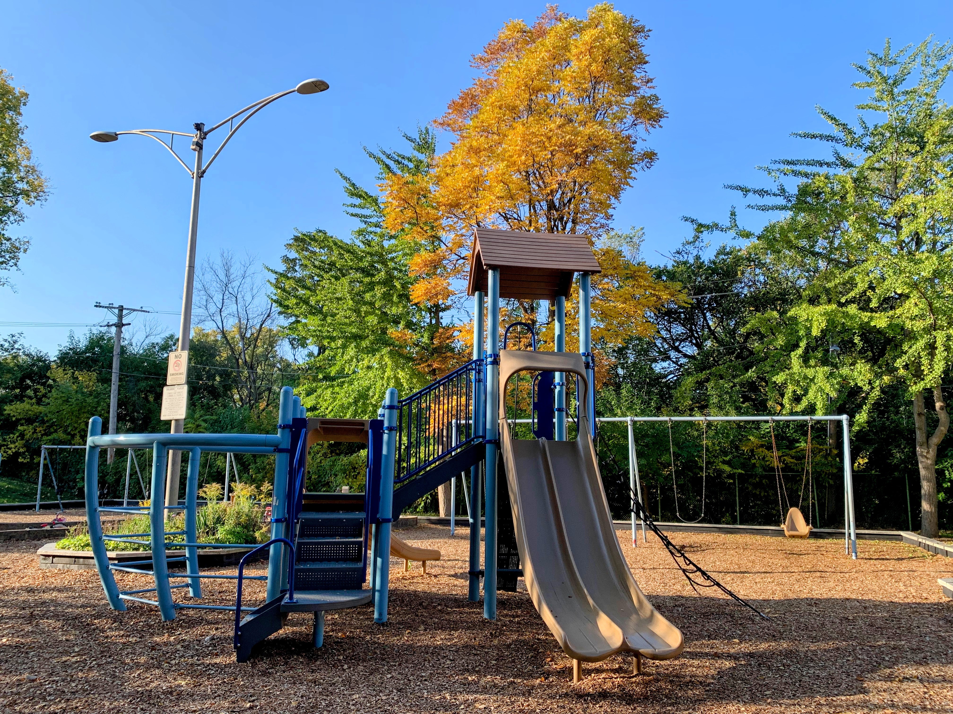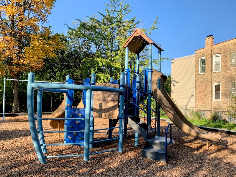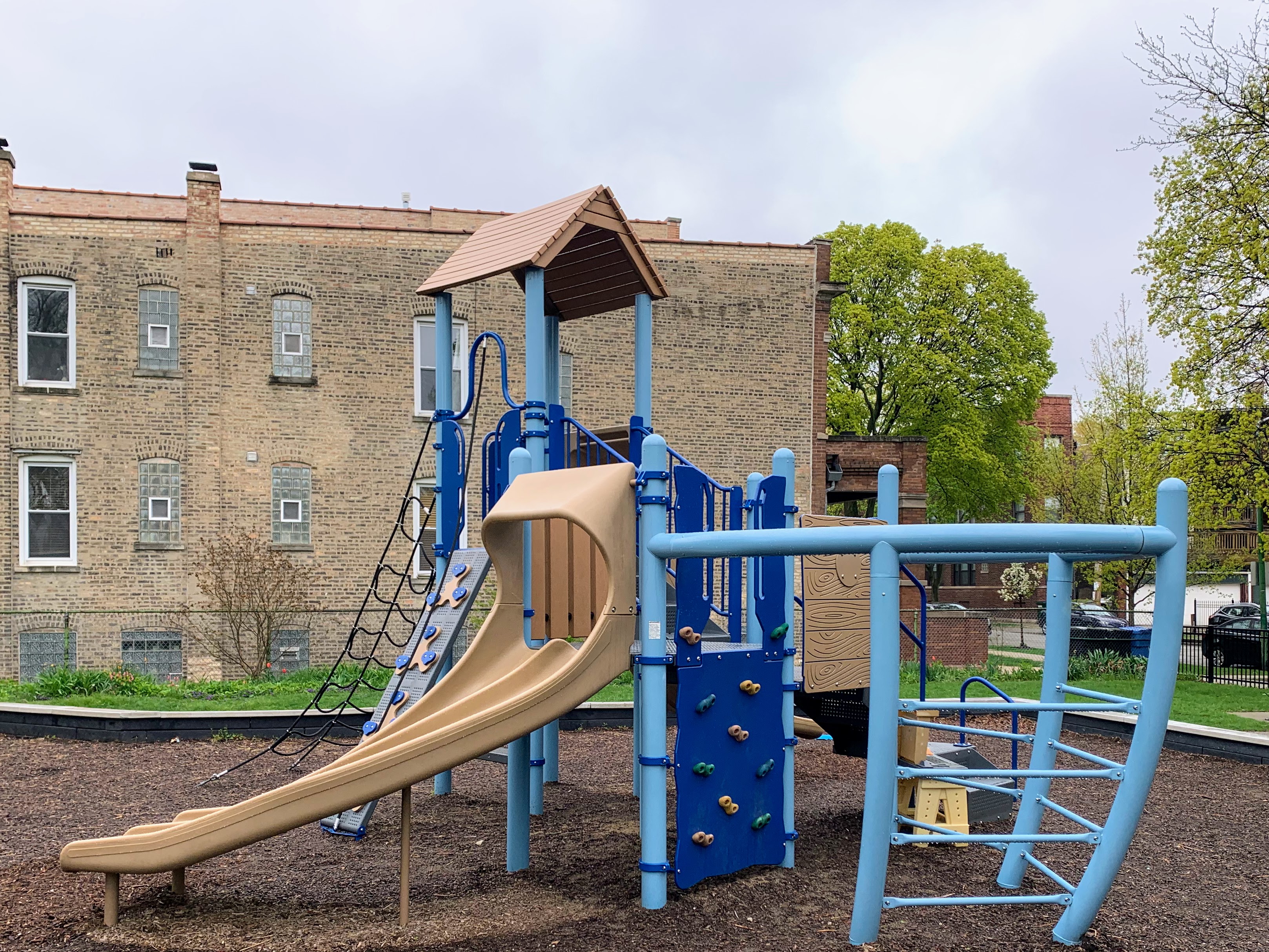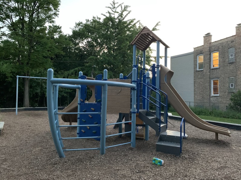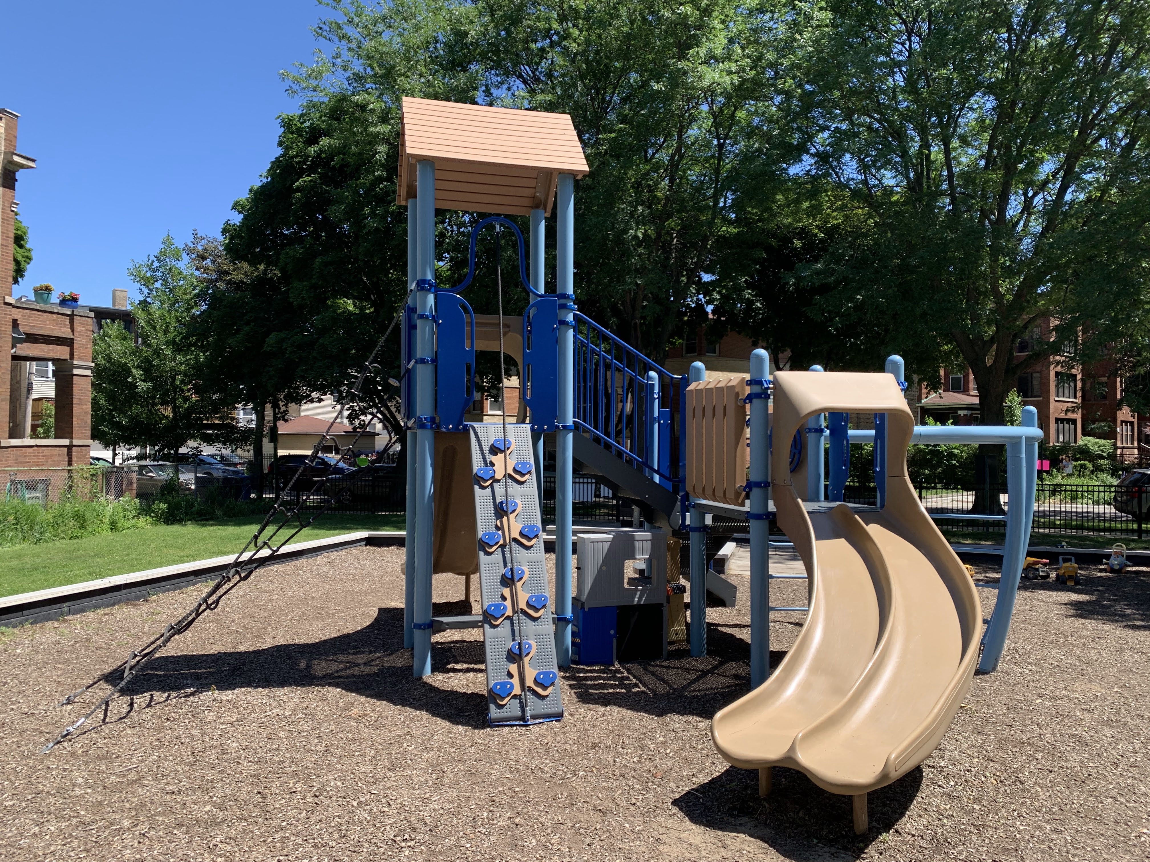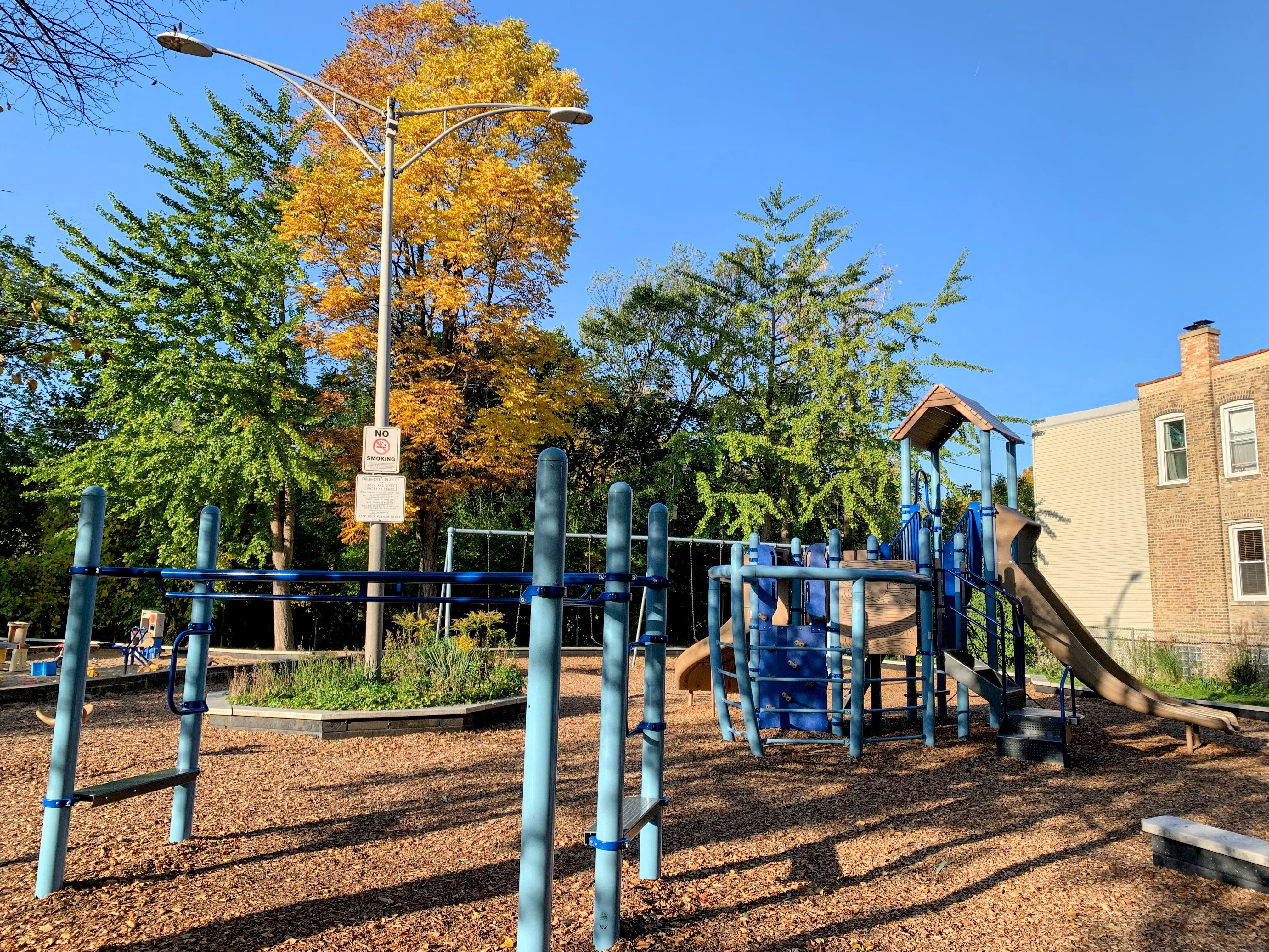 - A small neighborhood park that borders the Chicago River and the CTA Brown Line, this park contains a grassy hill and a large sand play area with a small bridge. The playground features a smaller area designed for younger children and another area with monkey bars and climbing elements designed for older children. There is plenty of morning shade and several benches and picnic tables at this park making this a comfortable spot to watch trains while you play.