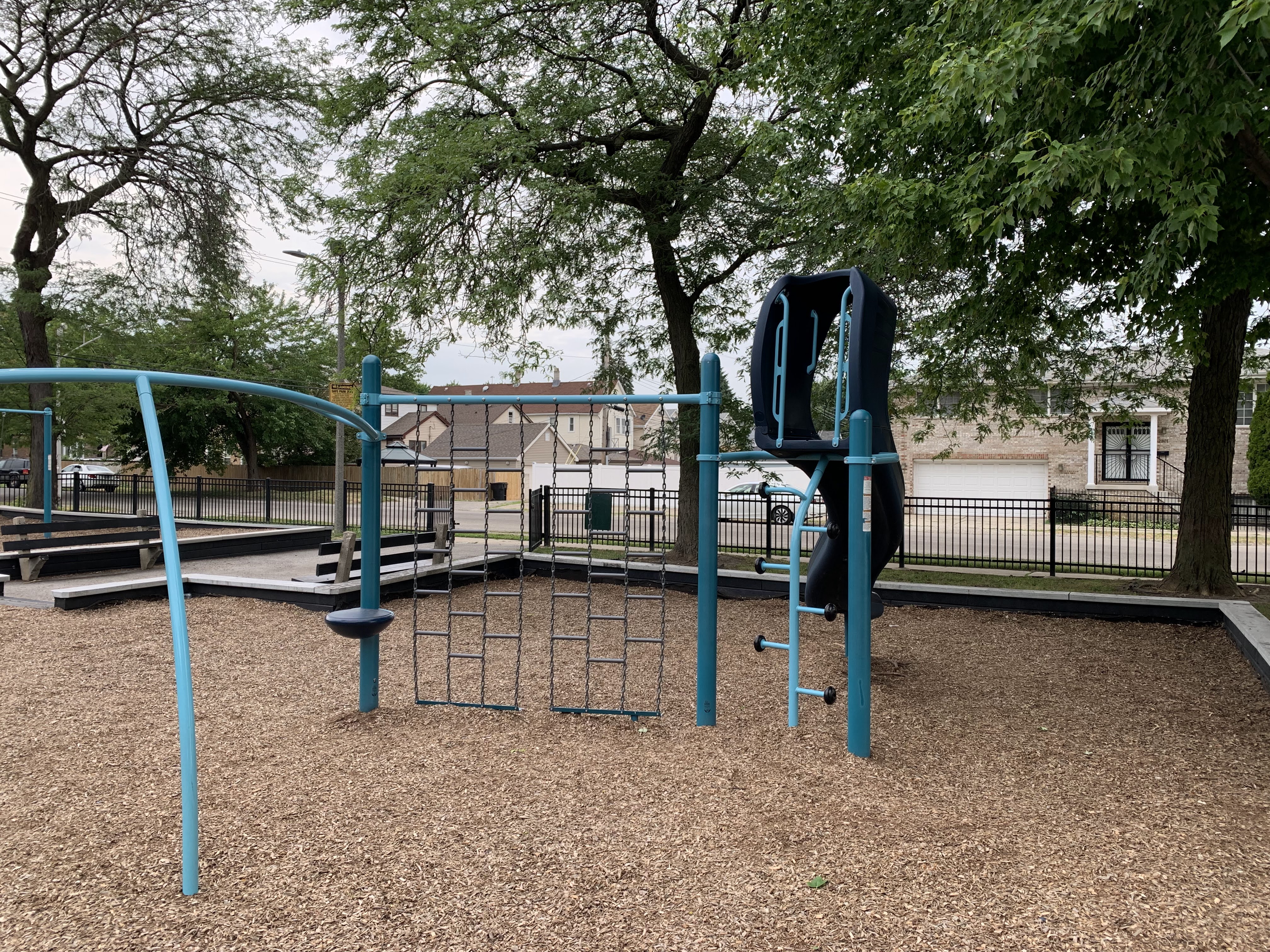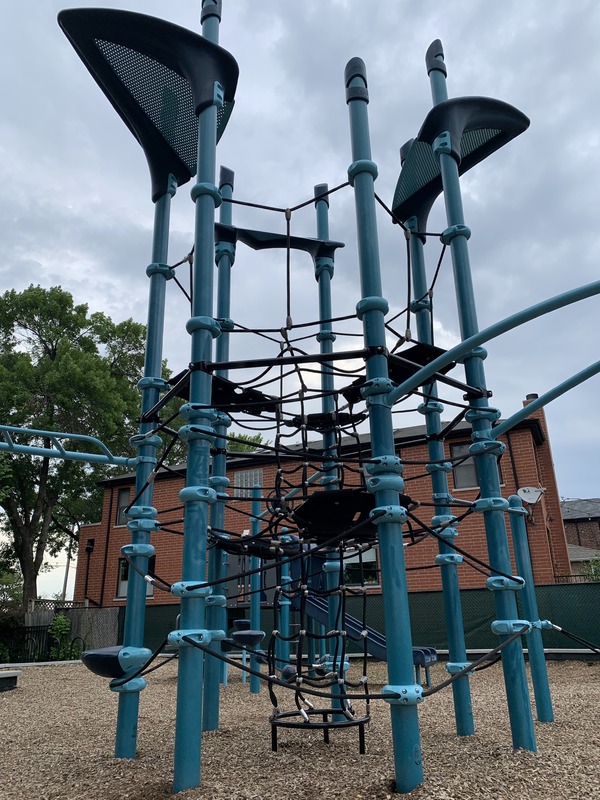 In terms of amenities, this is pretty standard. The play area is fenced from the street but not fully enclosed and the play surface is wood chips. There are benches and a drinking fountain as well as a few trees (though the play area itself is bright and sunny most of the day). All in all, this is a standard neighborhood playground. - Playground Equipment