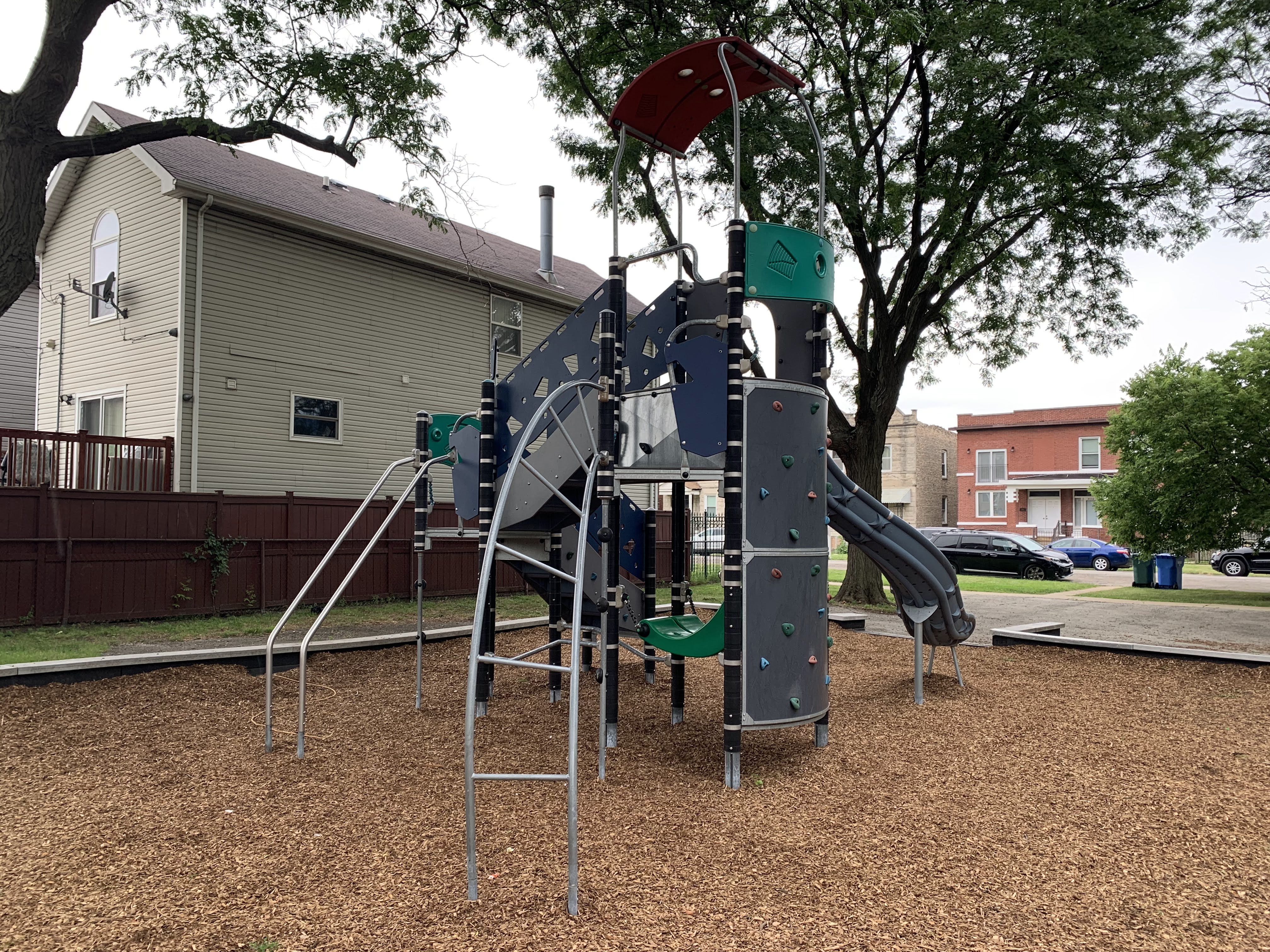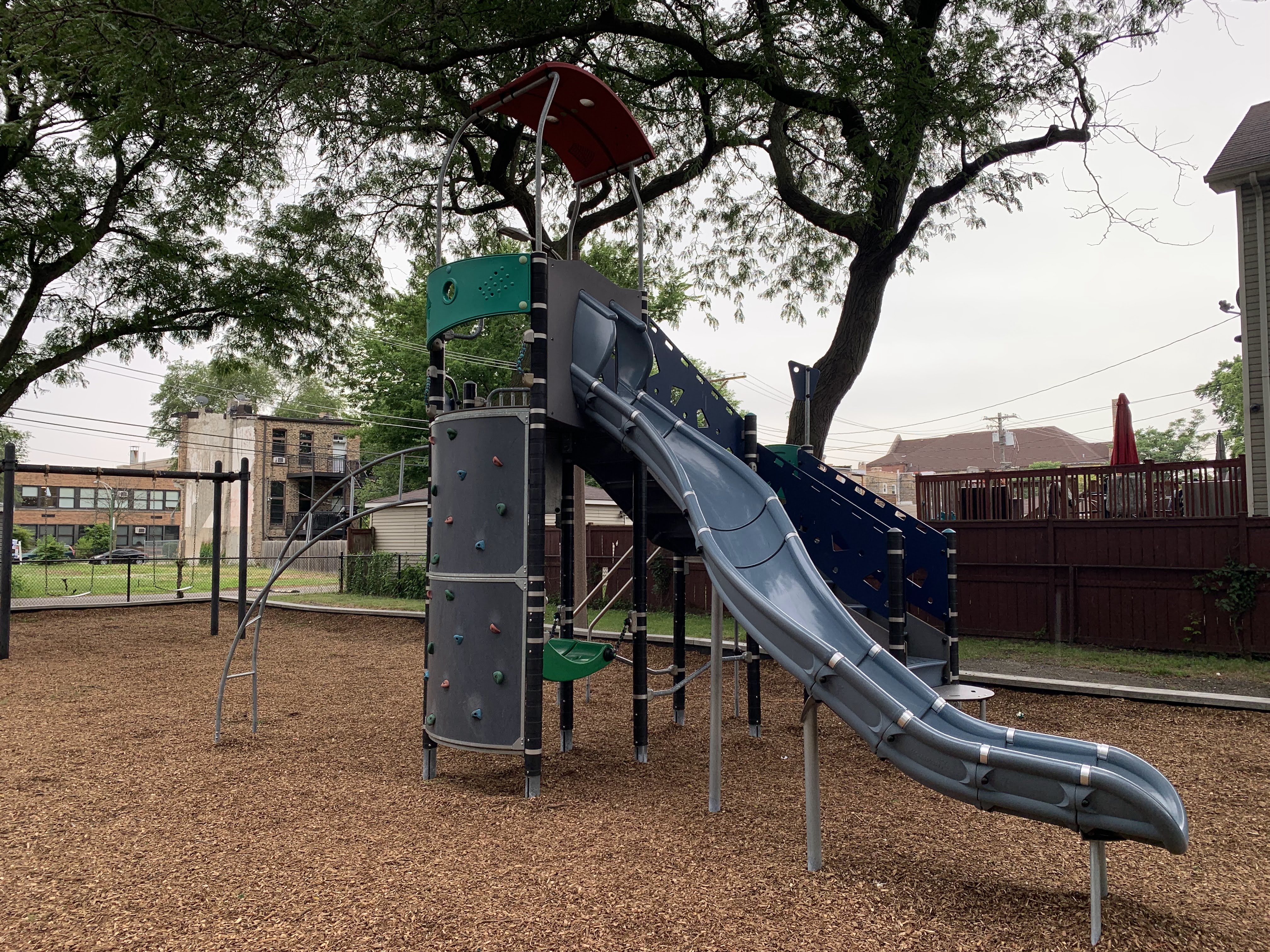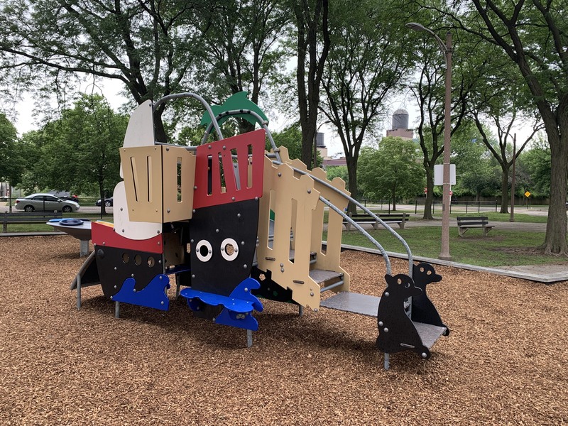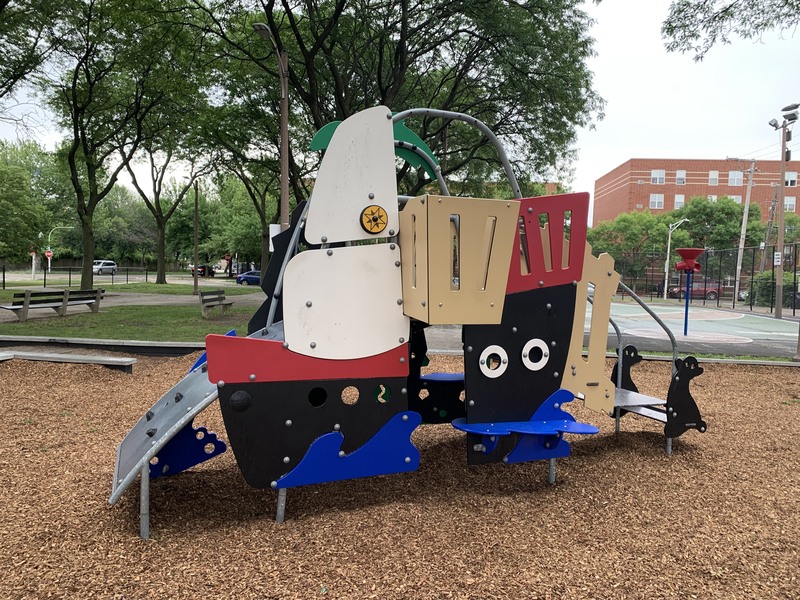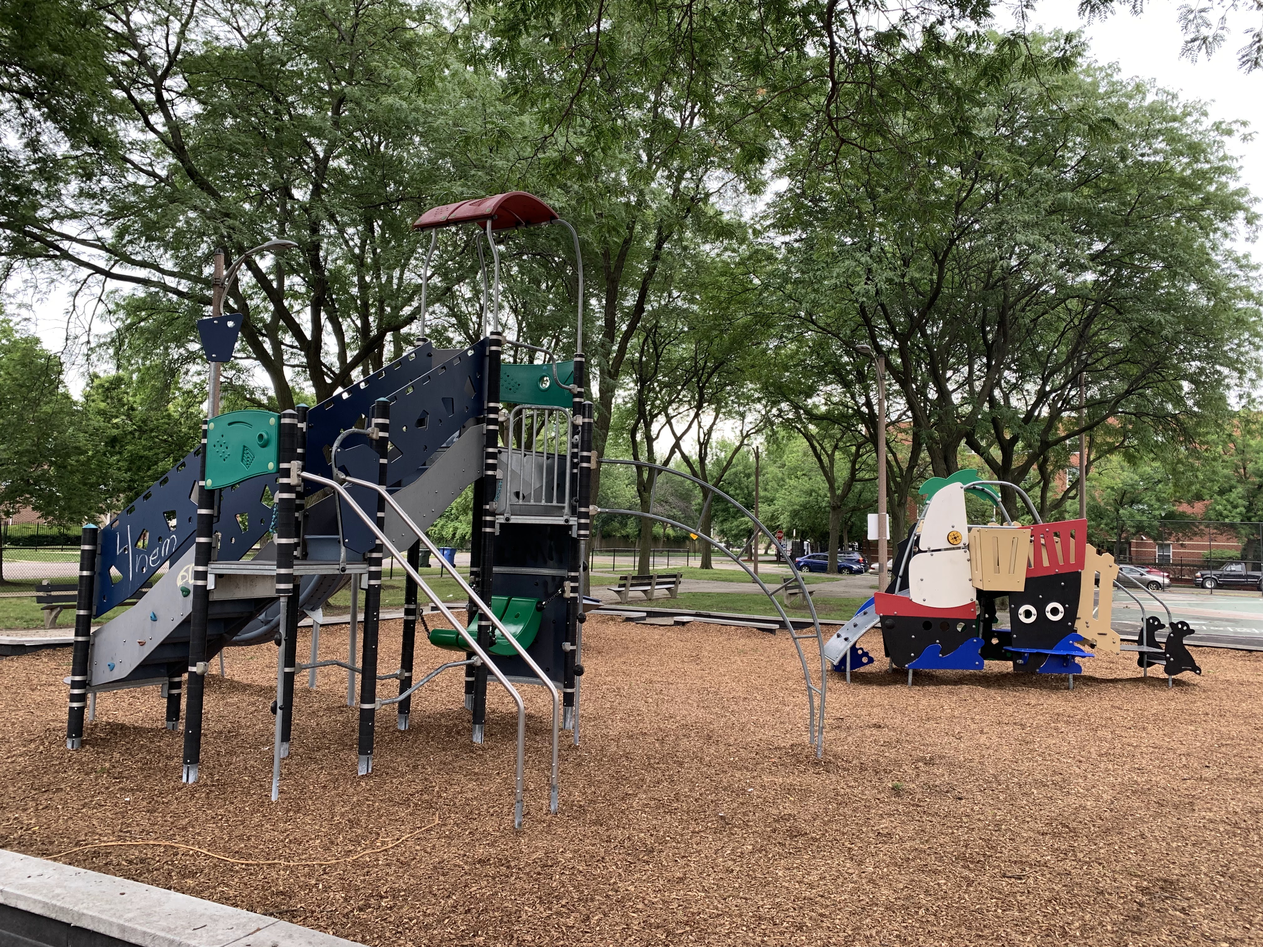 - This Jefferson Park is named for Nancy Jefferson (nurse, educator, and civic leader) and not Thomas Jefferson (president, author of the Declaration of Independence, slaver owner) as Chicago's other Jefferson Parks are named. This playground at this park was last renovated in 2013 and features brightly colored and modern play structures as well as an interesting 'spinning button.' An above average selection of swings (toddler, adaptive, belt seat, and a tire swing) round out the playground elements. The play area is fenced from the street but not fully enclosed and features a few benches for seating. The play area is covered in wood chips and shaded by large, mature trees. This is a solid neighborhood playground.
