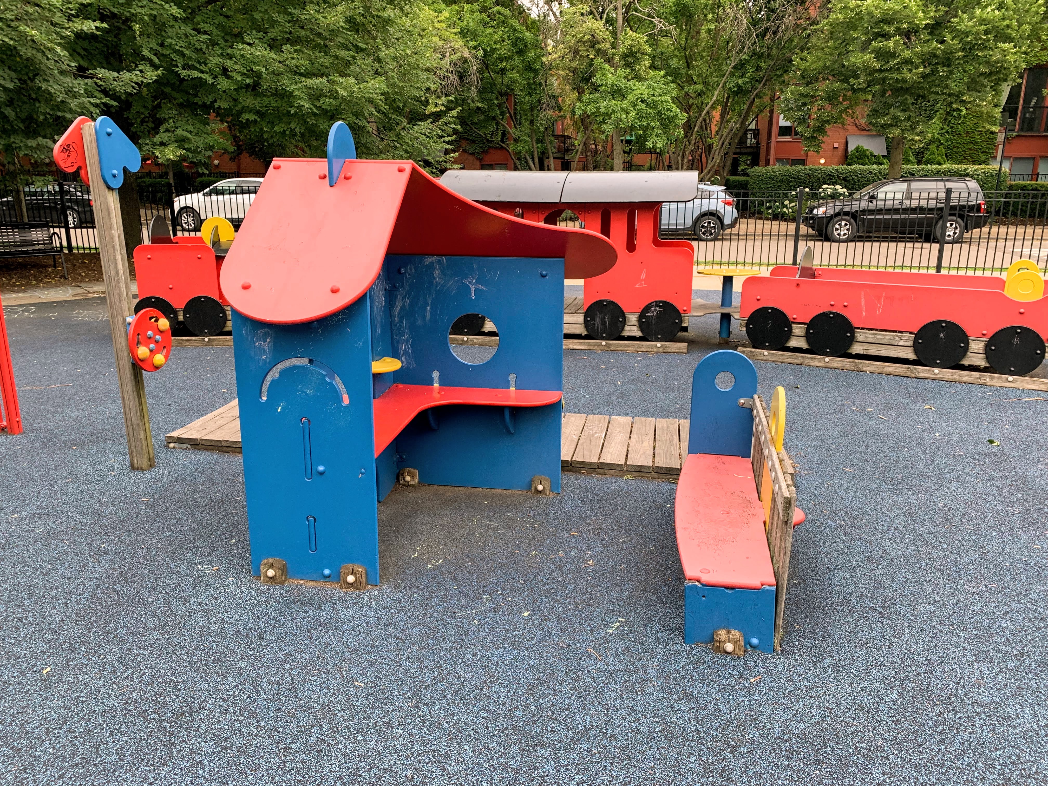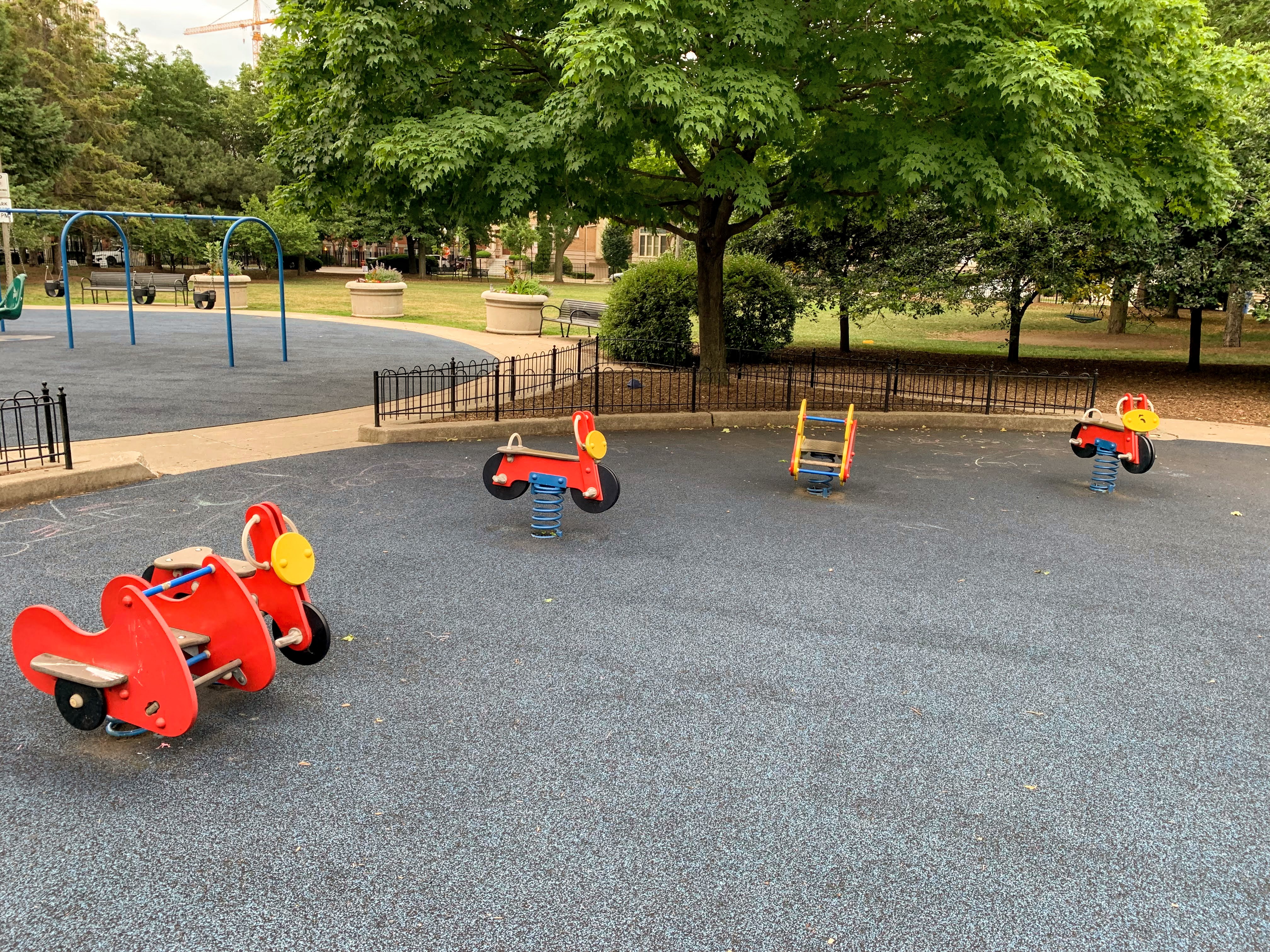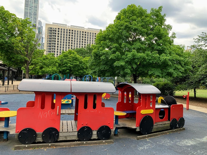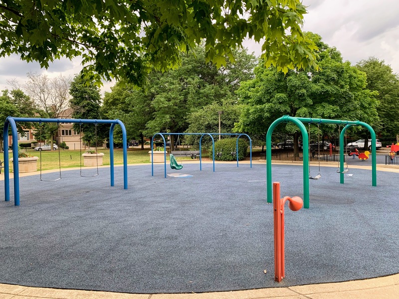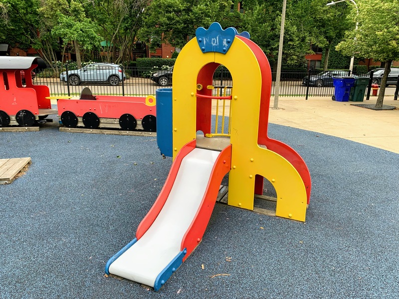 - The playground in Jones Park is great. There are three 'rooms': one contains a large play structure for older children, another contains a variety of swings, and the final area contains small equipment for younger children. The large play structure includes a lot of slides and climbing elements as well as a circular monkey bar. The swing area includes just the standards: toddler, adaptive, and belt seat. And the area for younger children features a tiny standalone slide and a large, multi-car play train. The play area is fully enclosed from the street and opens into the rest of the park. The play surface is soft rubber and there are benches for seating as well as several shady areas throughout the park. All in all, this is a great playground tucked into a quiet part of the Near South Side; highly recommend.
