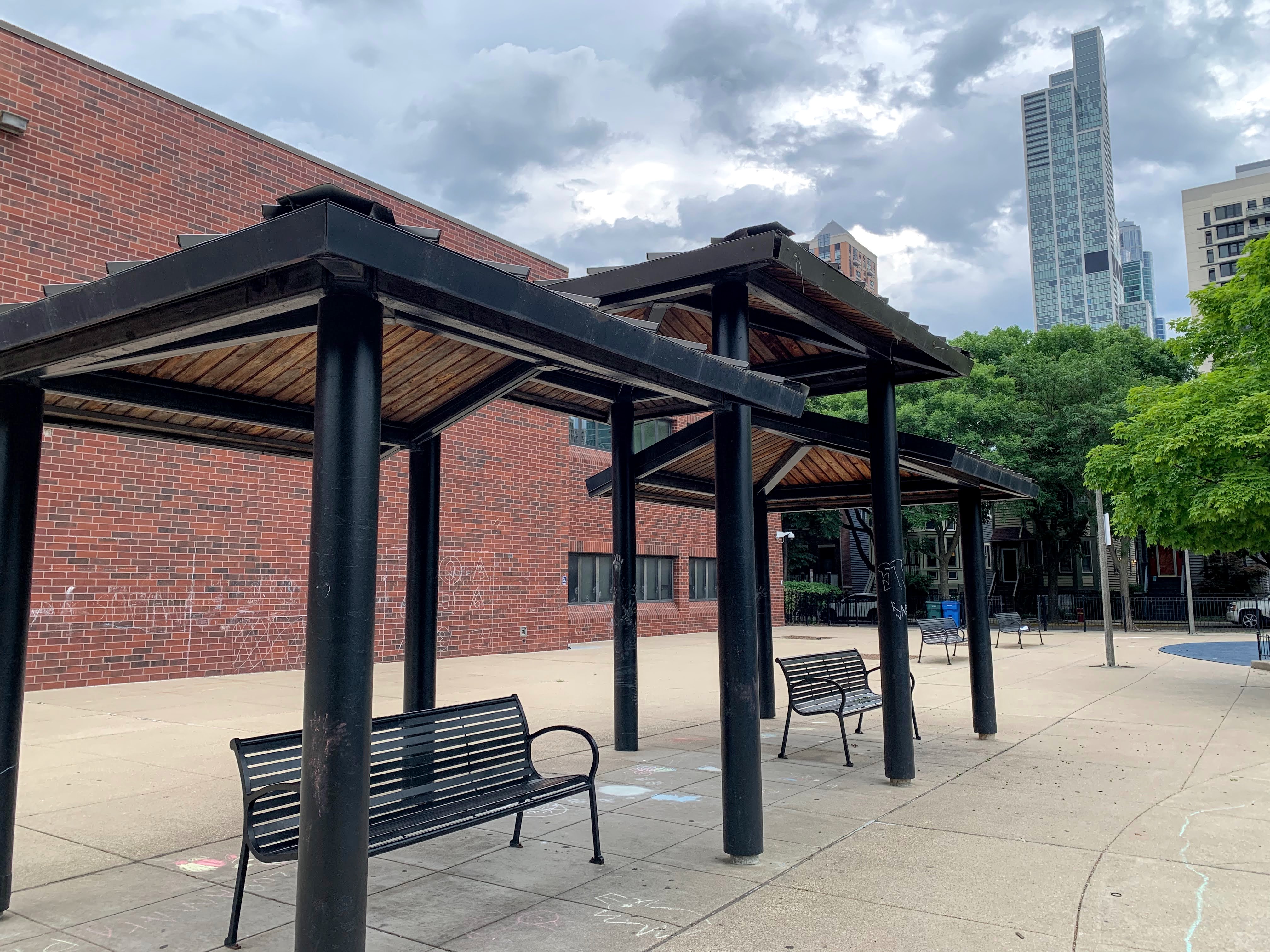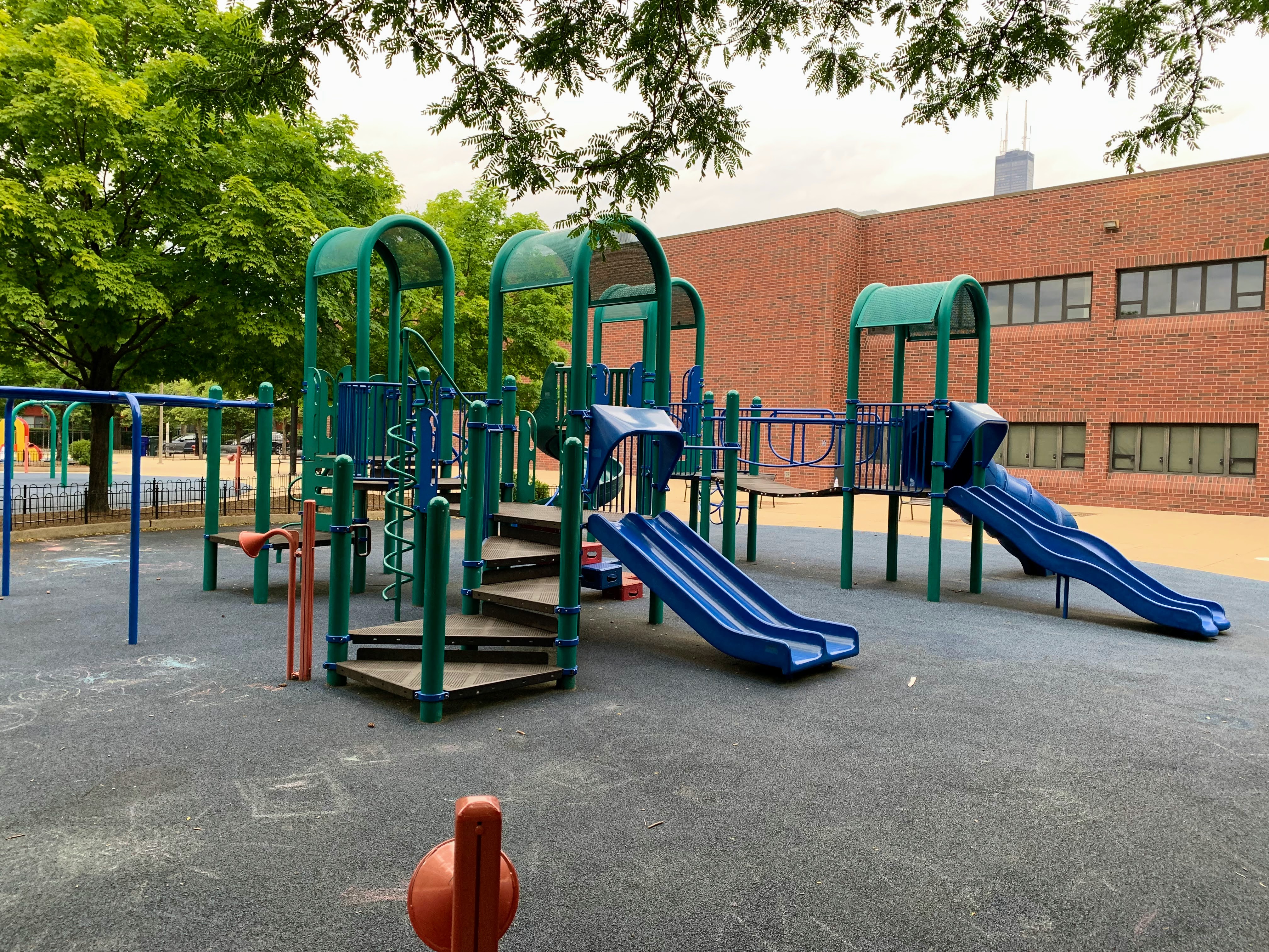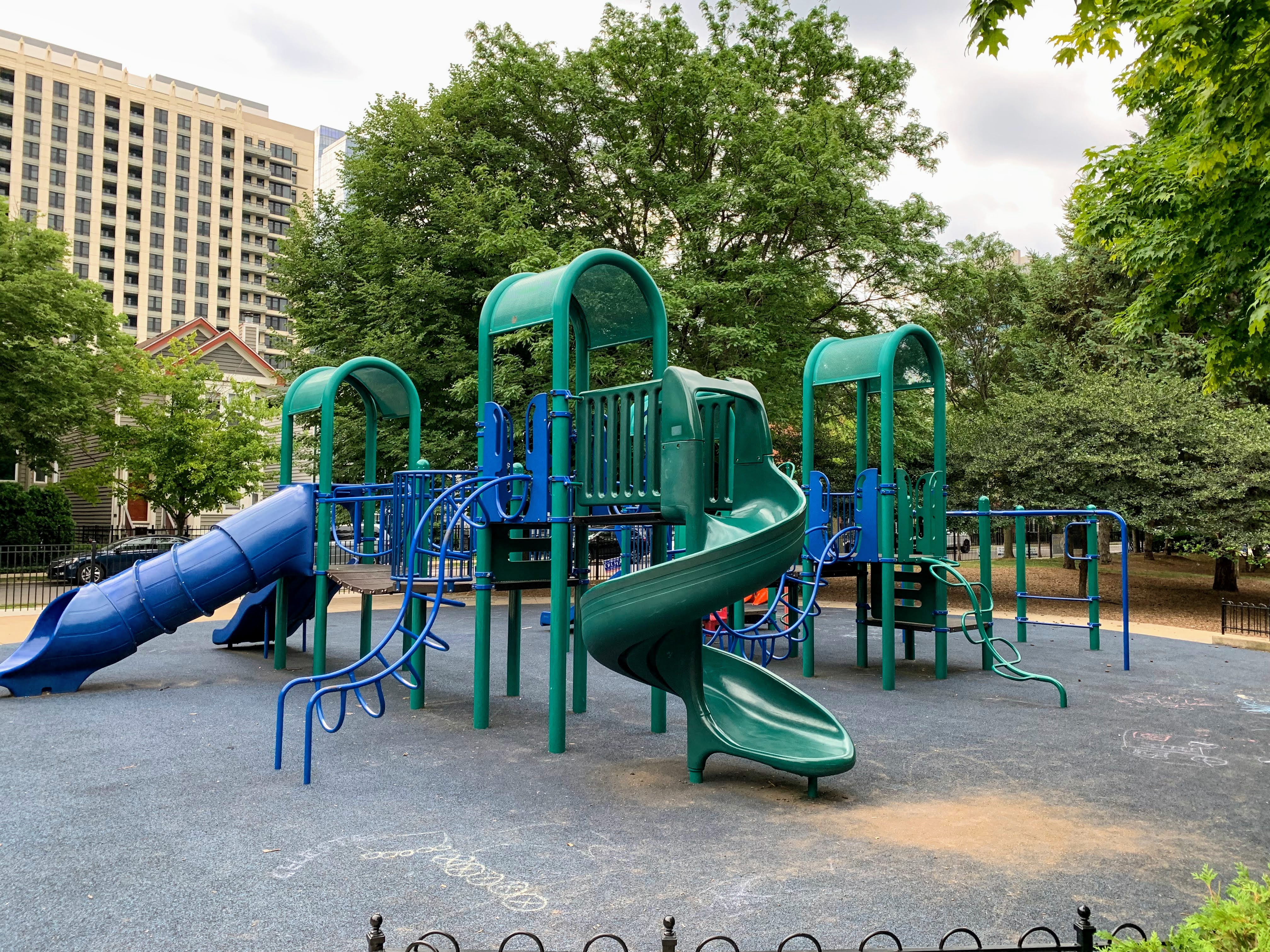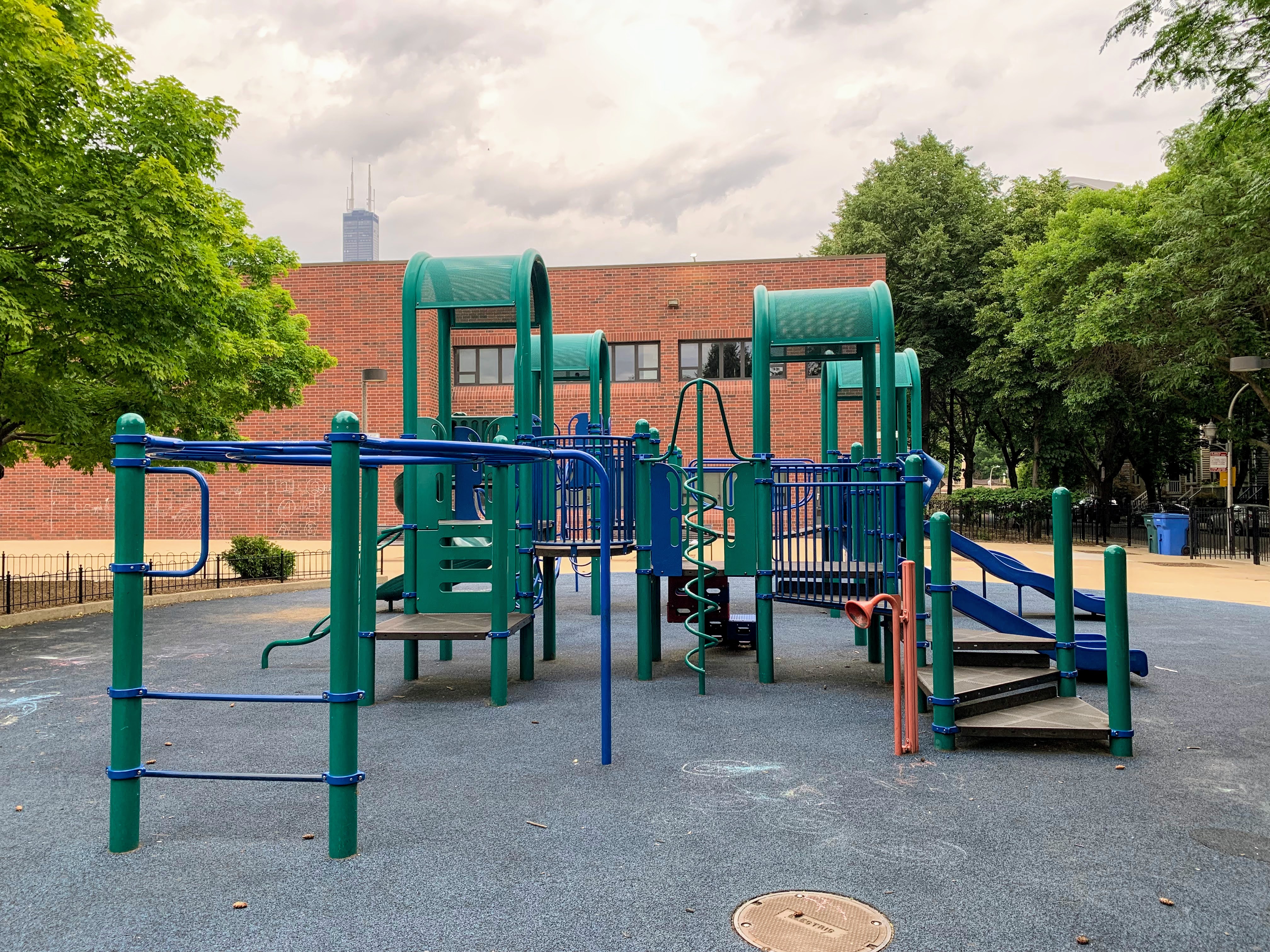 - The playground in Jones Park is great. There are three 'rooms': one contains a large play structure for older children, another contains a variety of swings, and the final area contains small equipment for younger children. The large play structure includes a lot of slides and climbing elements as well as a circular monkey bar. The swing area includes just the standards: toddler, adaptive, and belt seat. And the area for younger children features a tiny standalone slide and a large, multi-car play train. The play area is fully enclosed from the street and opens into the rest of the park. The play surface is soft rubber and there are benches for seating as well as several shady areas throughout the park. All in all, this is a great playground tucked into a quiet part of the Near South Side; highly recommend.