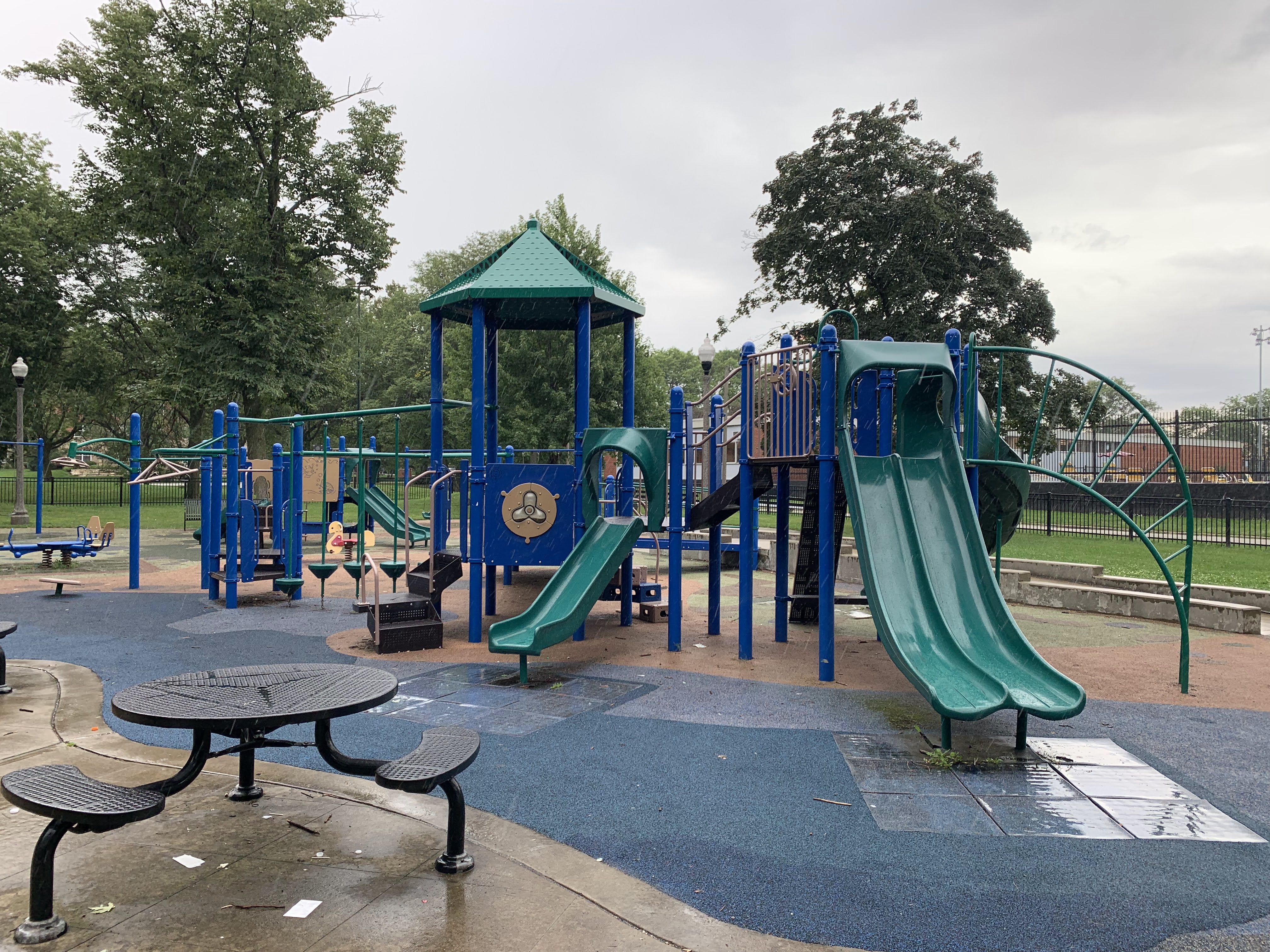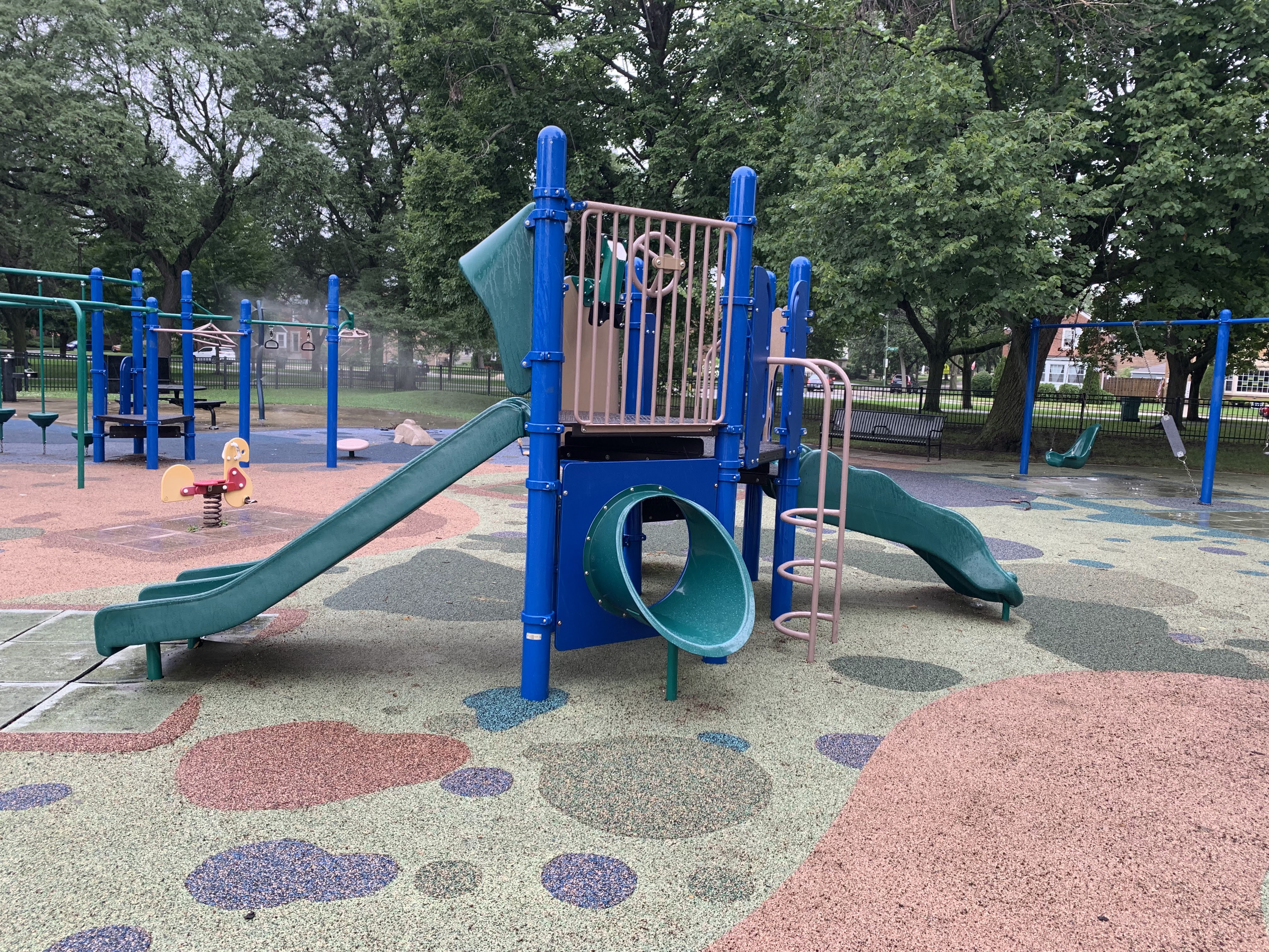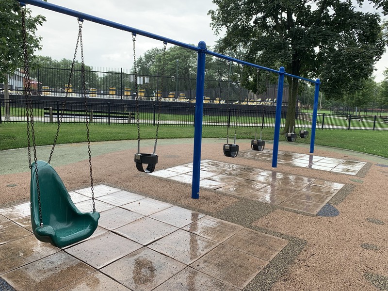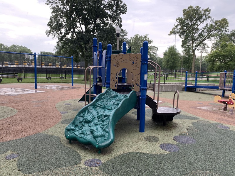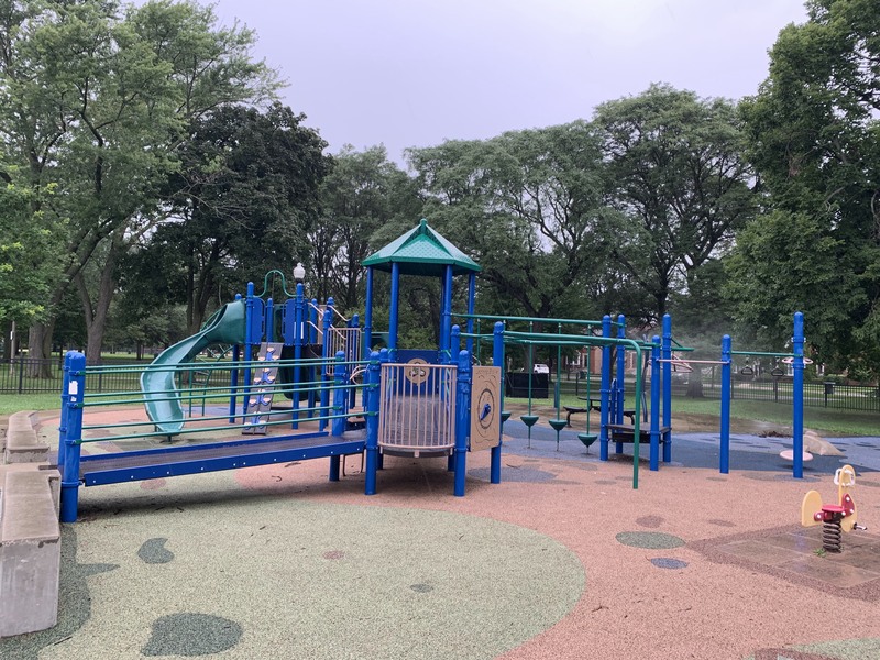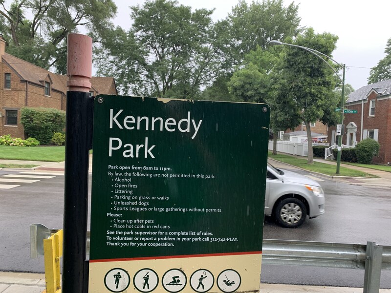 - The playground at Kennedy Park is located near the northeast corner of the park and features some large play structures, the standard set of Chicago Park swings, and a small water spray feature. There is a small play structure for young children and a much larger and sprawling structure for older children. A few standalone elements and two sets of swings round out the play area. There is also a small water spray feature with a gentle misting pole. The play area is set away from the street and is fully enclosed. There are benches, picnic tables, and a drinking fountain and the main play surface is soft rubber. All in all, this is a very solid neighborhood playground.
