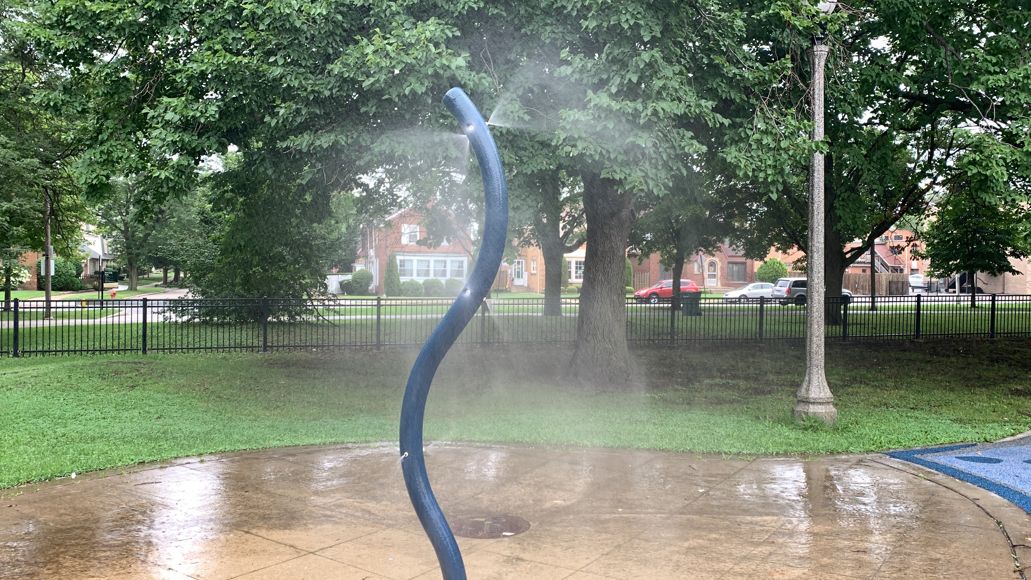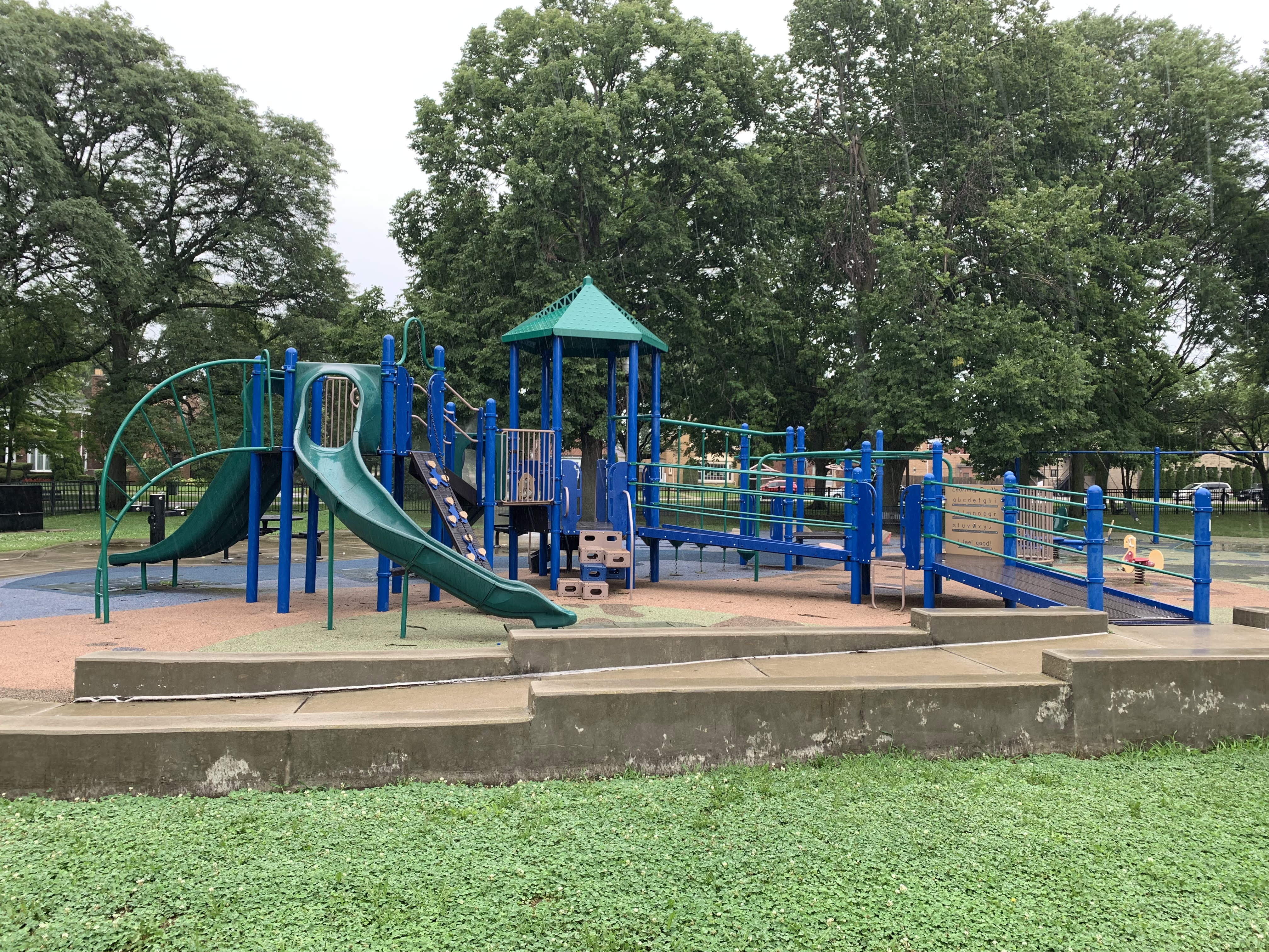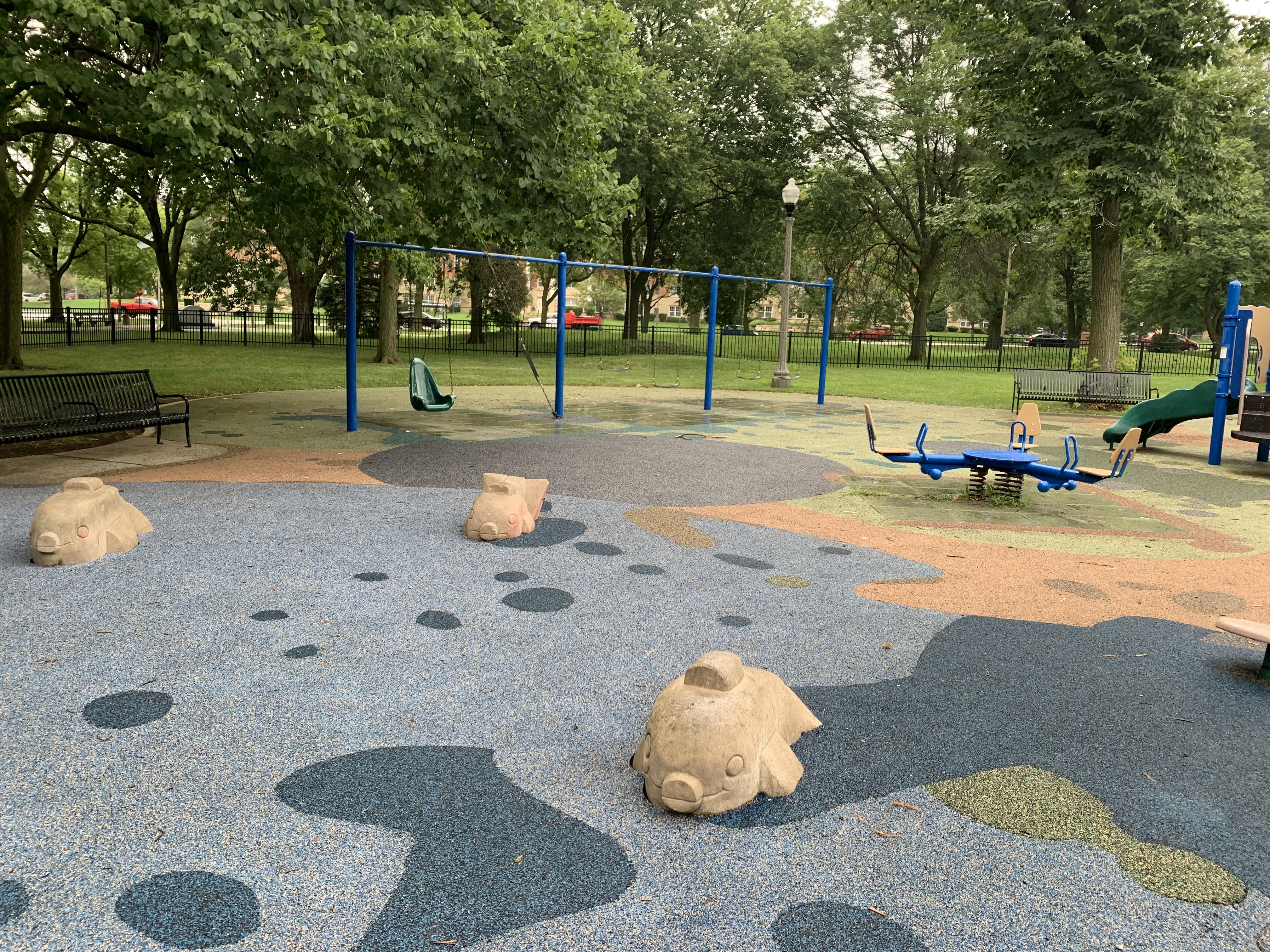 - The playground at Kennedy Park is located near the northeast corner of the park and features some large play structures, the standard set of Chicago Park swings, and a small water spray feature. There is a small play structure for young children and a much larger and sprawling structure for older children. A few standalone elements and two sets of swings round out the play area. There is also a small water spray feature with a gentle misting pole. The play area is set away from the street and is fully enclosed. There are benches, picnic tables, and a drinking fountain and the main play surface is soft rubber. All in all, this is a very solid neighborhood playground.