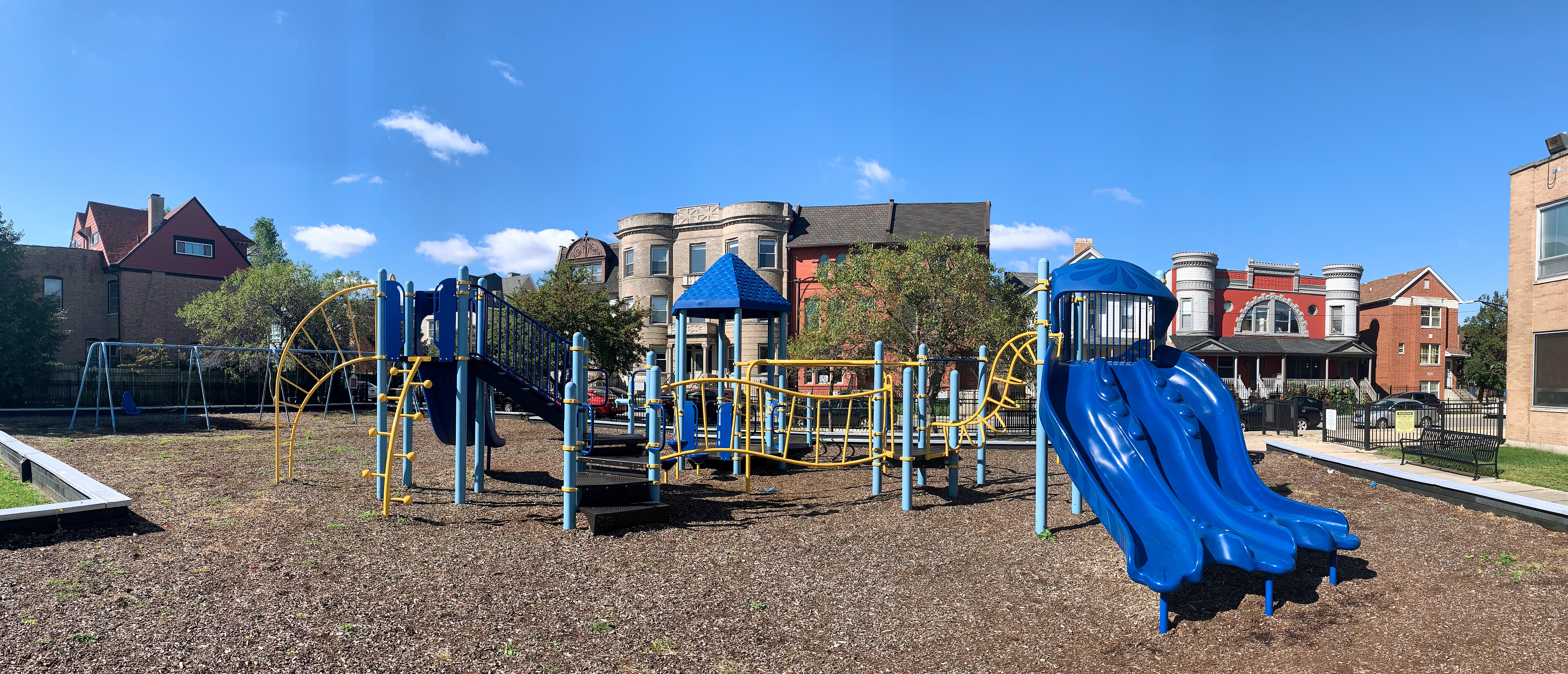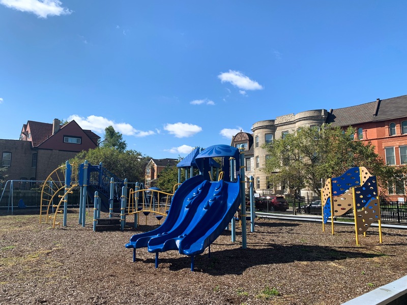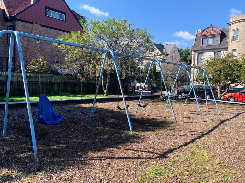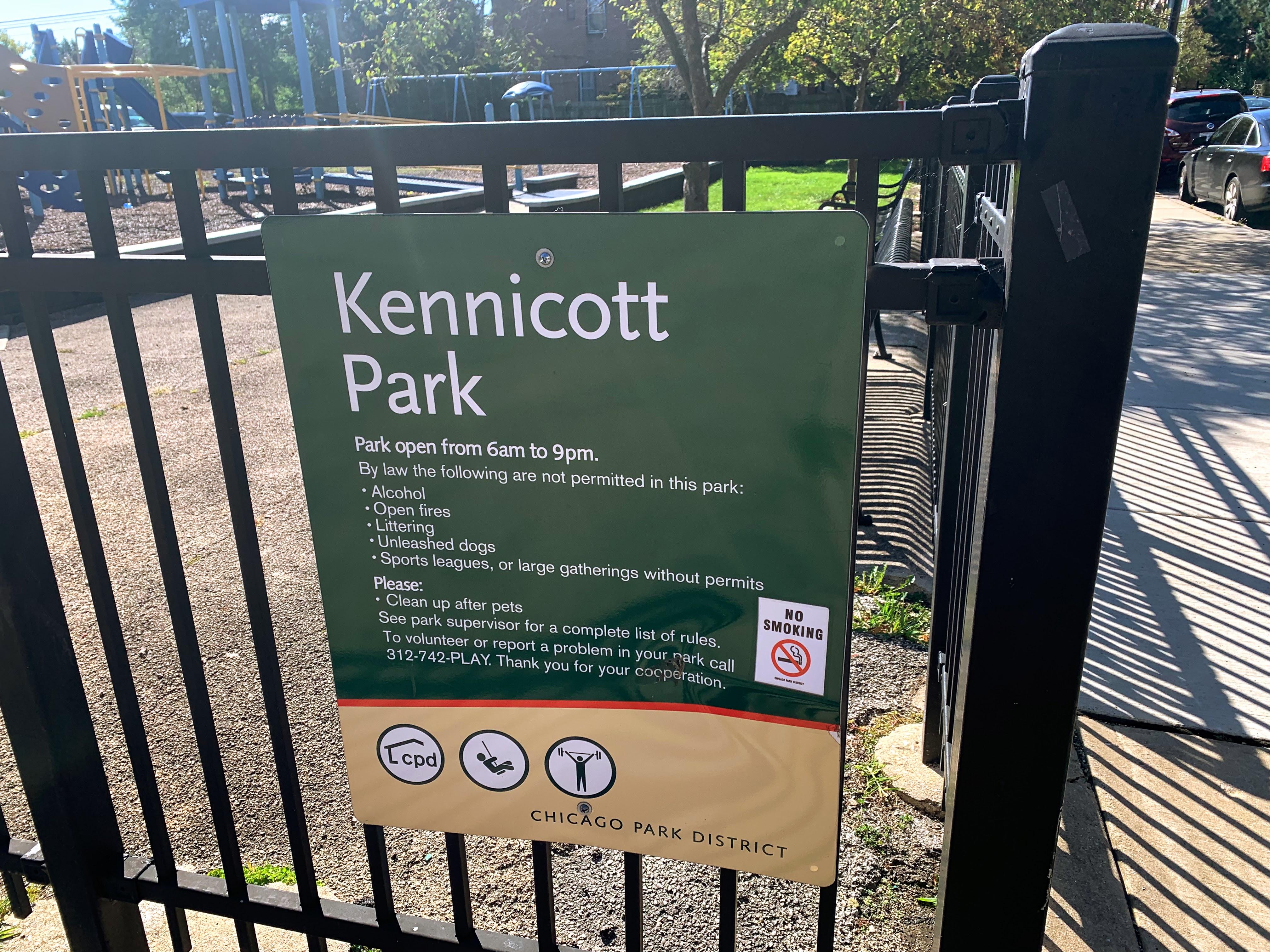 - Kennicott Park is a moderate sized neighborhood park in the Kenwood Neighborhood with a great little playground. The playground features a somewhat sprawling play structure with a variety of slides, climbing elements, and overhead features. There are two standalone elements and a set of swings with the Chicago Park standards: toddler, adaptive, and belt seat. The play area is fenced from the street but not fully enclosed and the play surface is wood chips. There are a few benches and the nearby fieldhouse provides access to bathrooms and drinking fountains (when open). All in all, this is a great neighborhood playground; highly recommend.