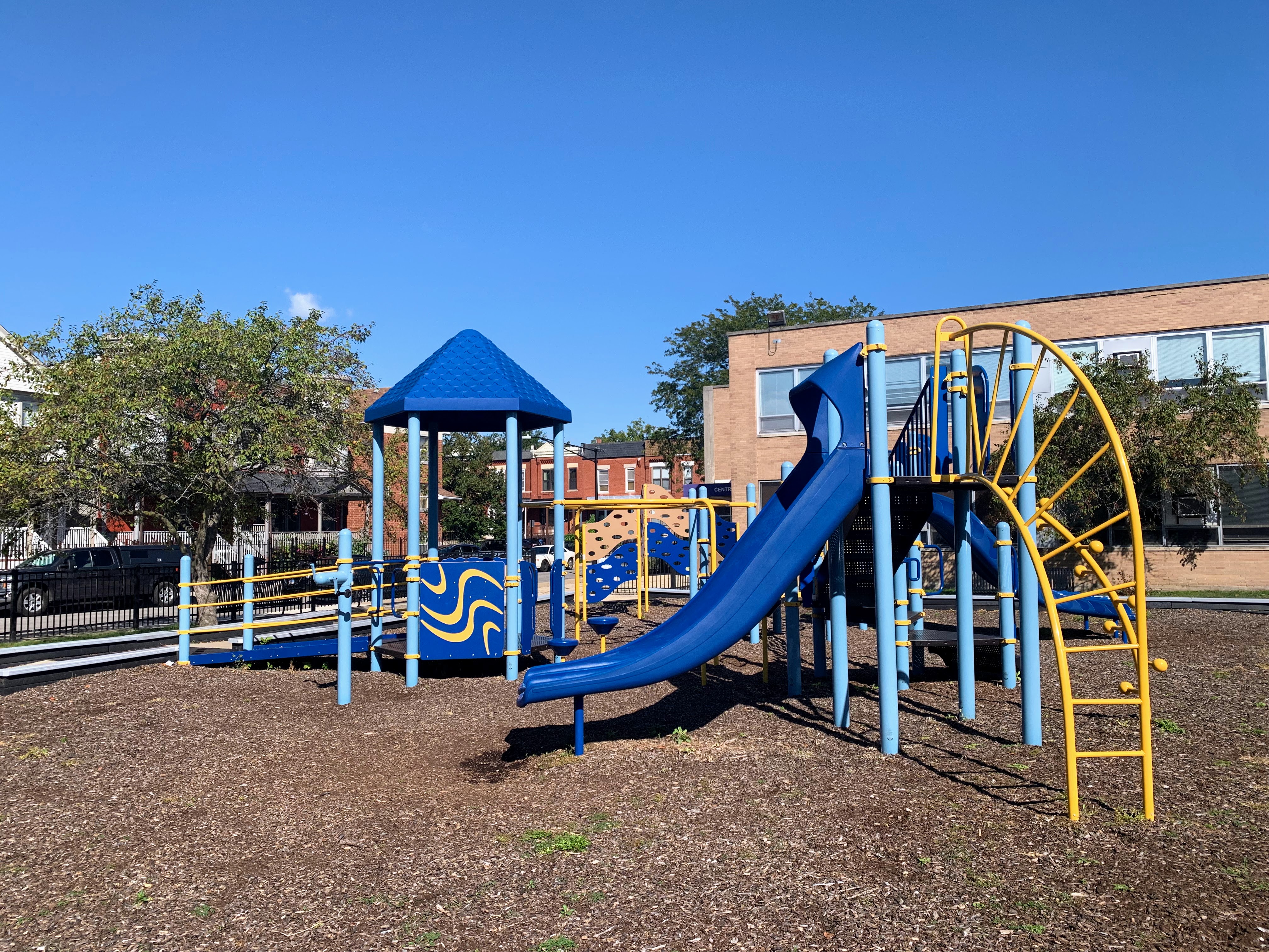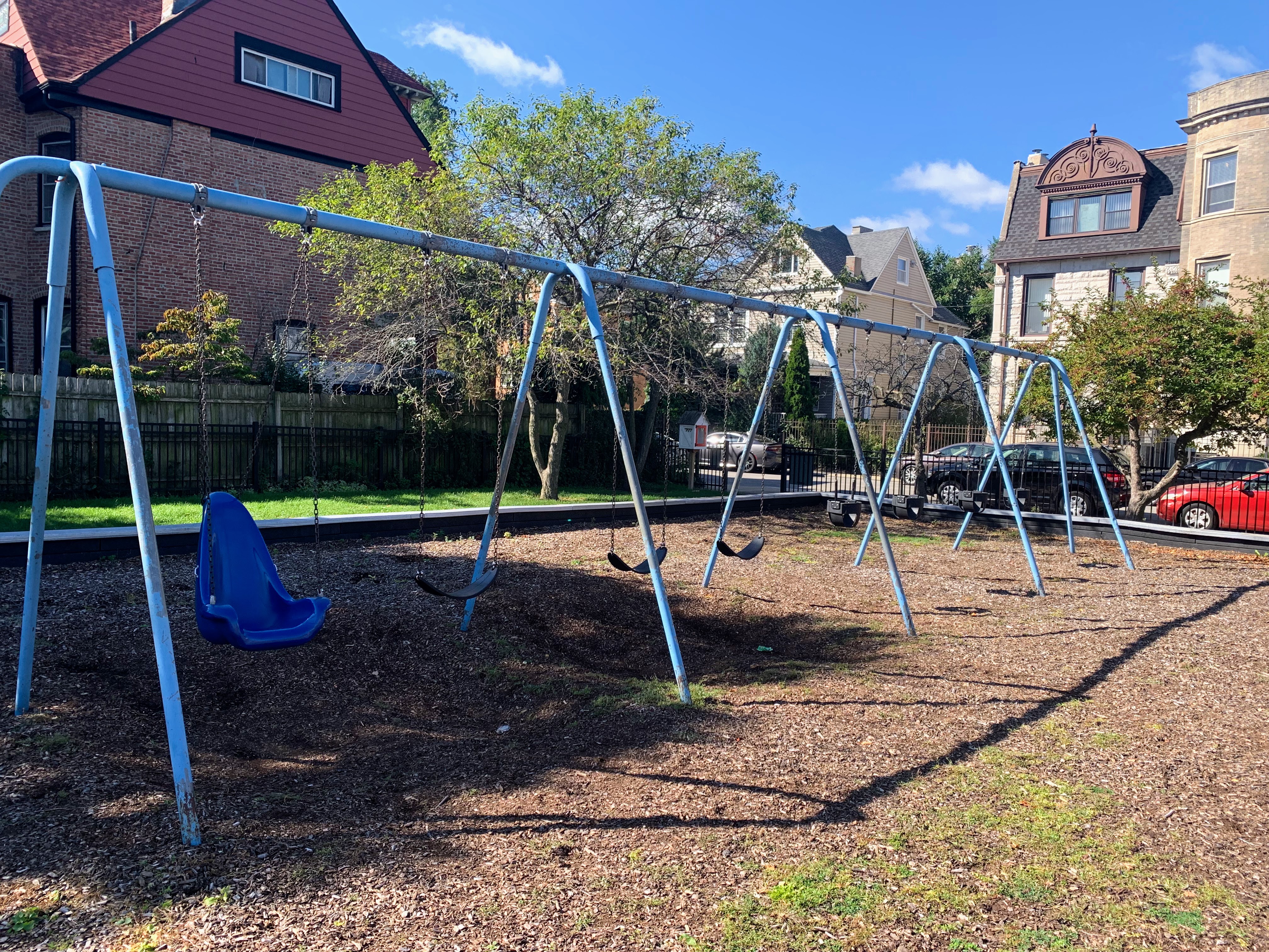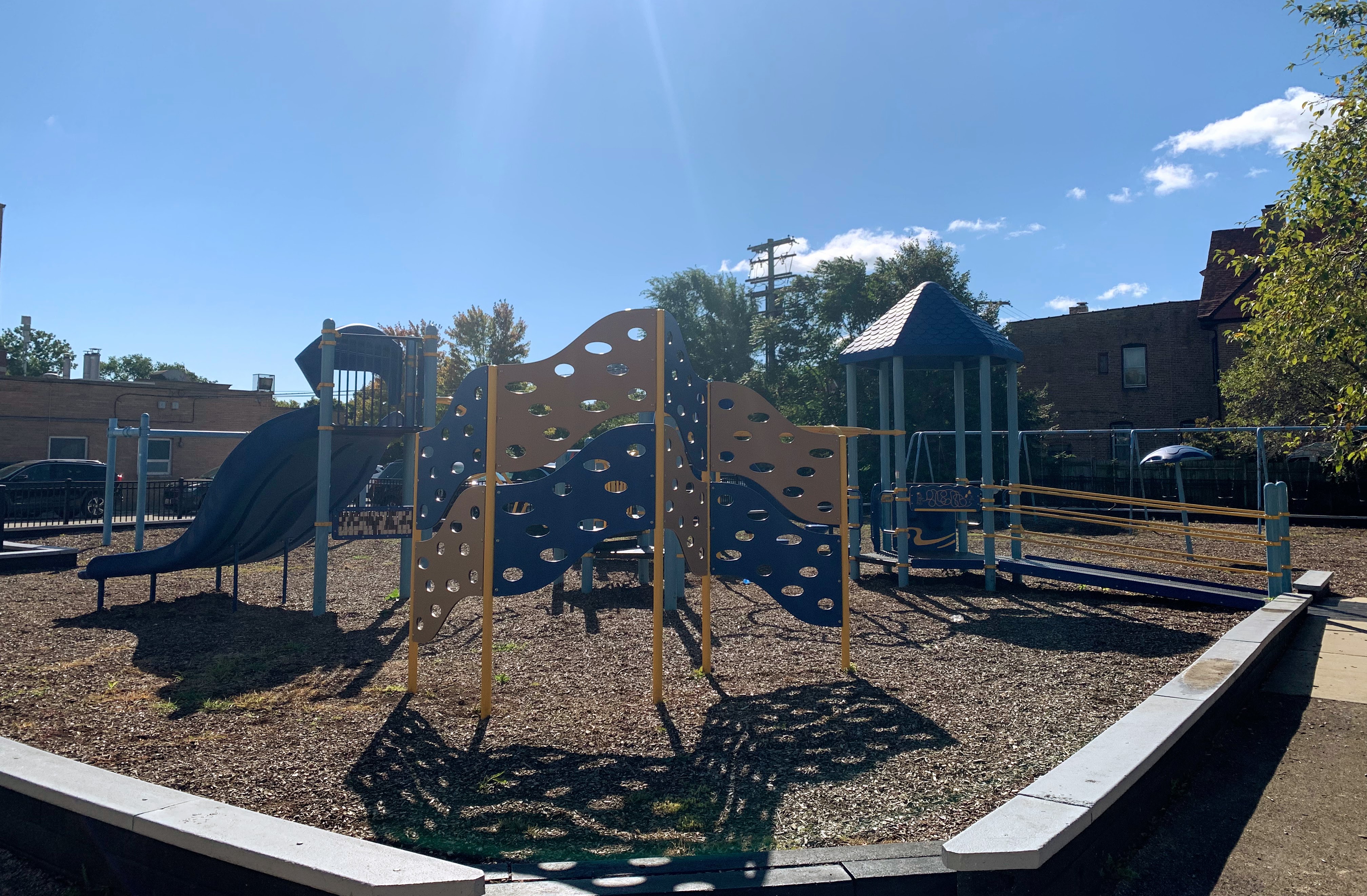 - Kennicott Park is a moderate sized neighborhood park in the Kenwood Neighborhood with a great little playground. The playground features a somewhat sprawling play structure with a variety of slides, climbing elements, and overhead features. There are two standalone elements and a set of swings with the Chicago Park standards: toddler, adaptive, and belt seat. The play area is fenced from the street but not fully enclosed and the play surface is wood chips. There are a few benches and the nearby fieldhouse provides access to bathrooms and drinking fountains (when open). All in all, this is a great neighborhood playground; highly recommend.