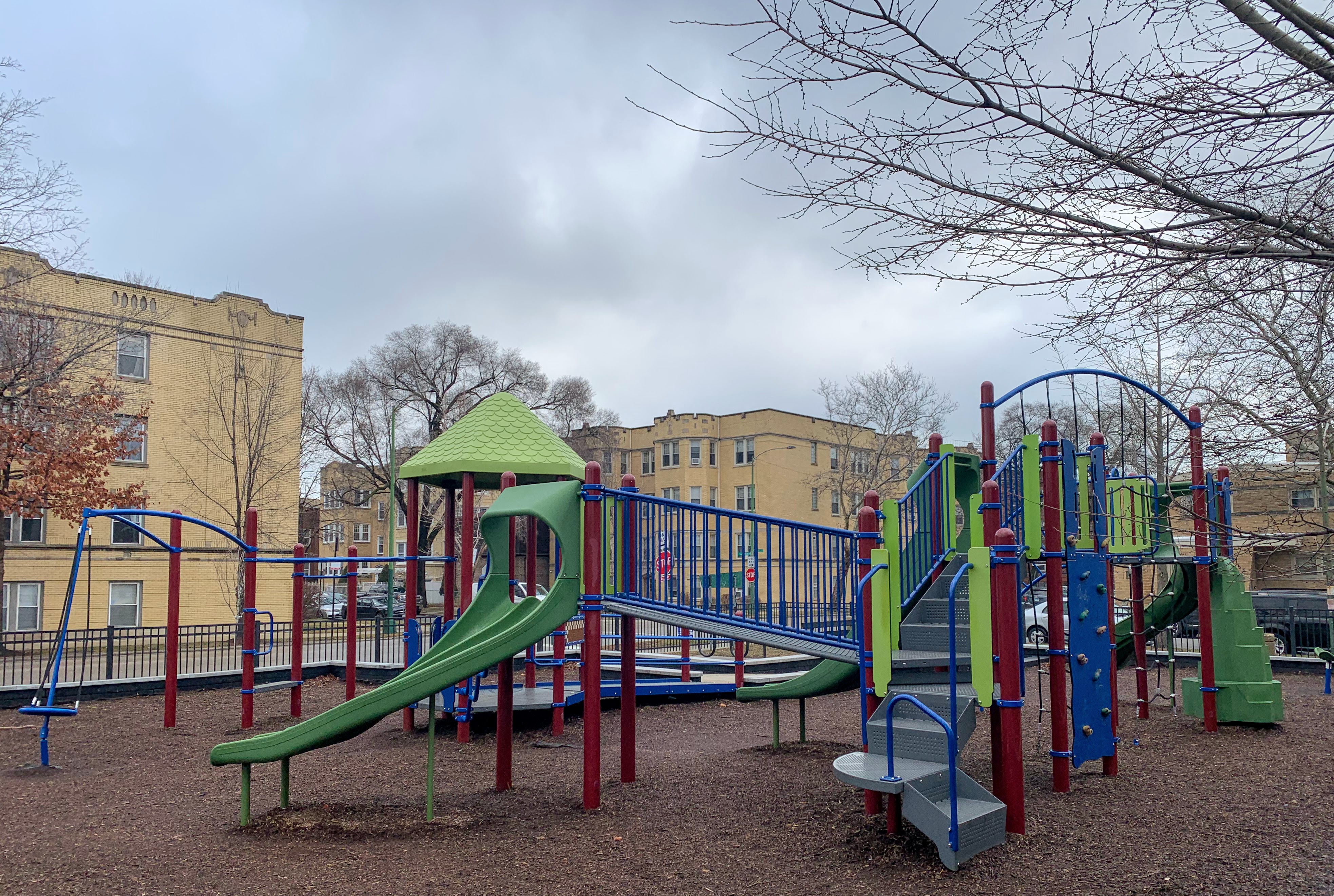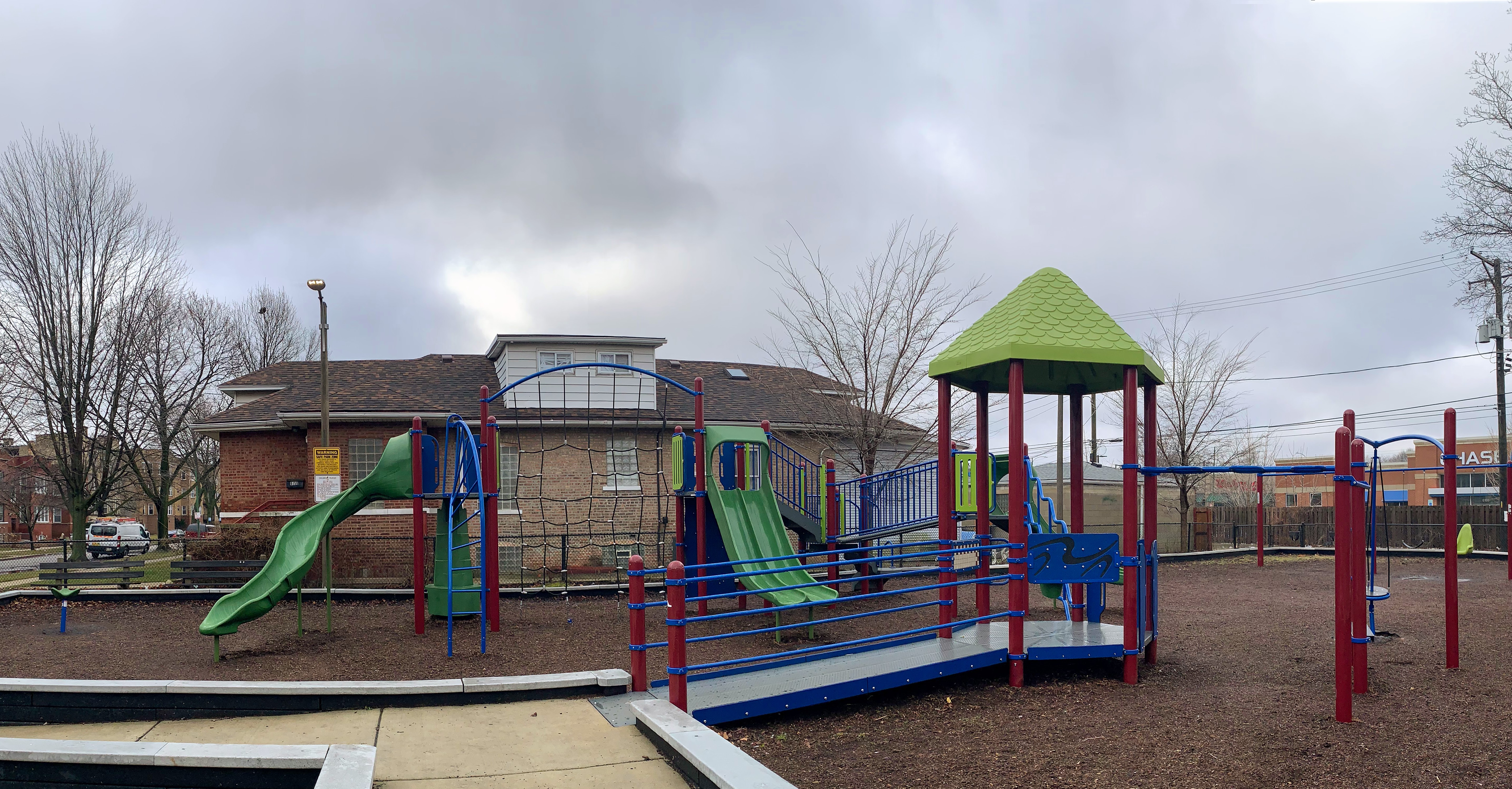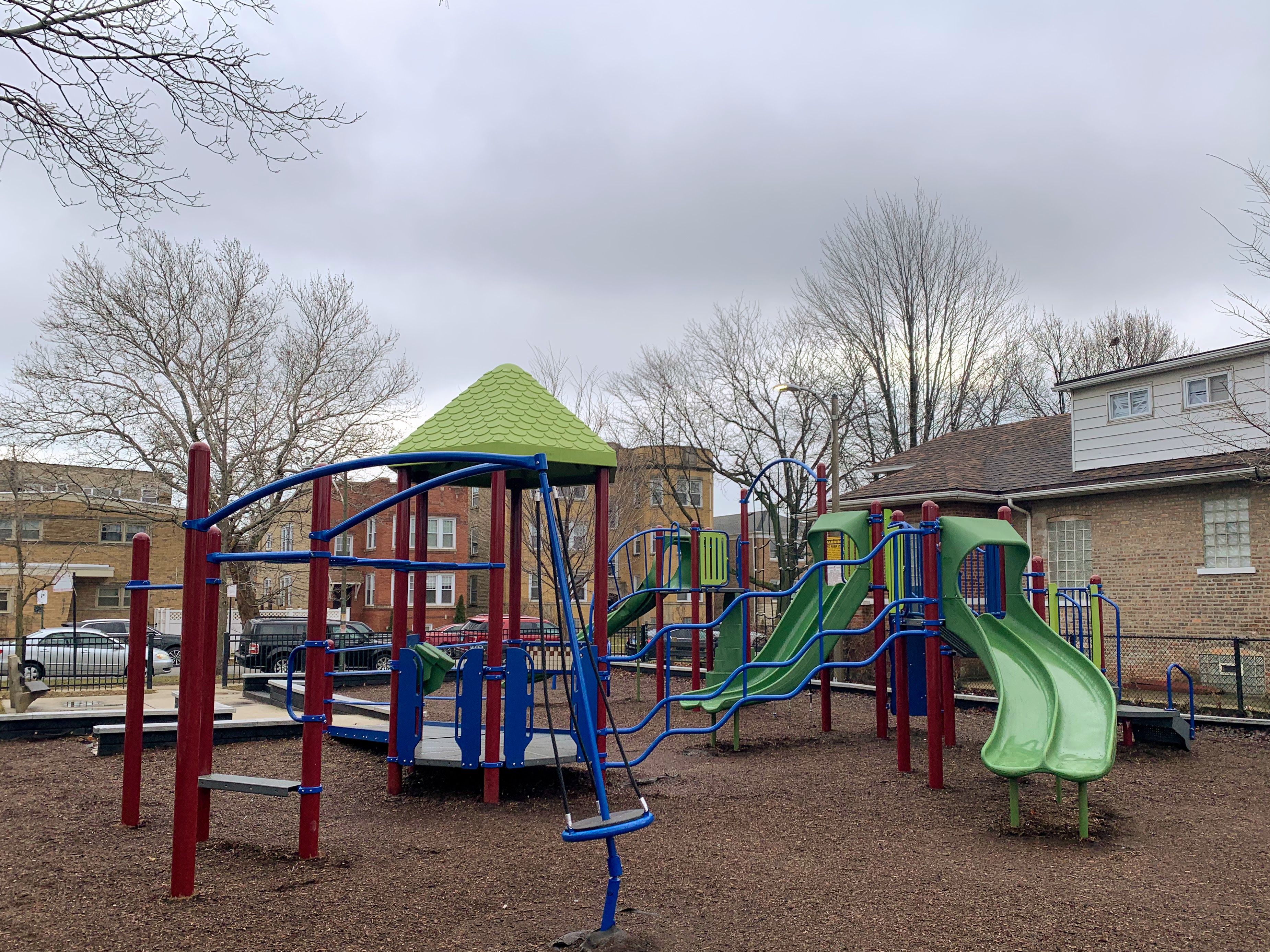 - Korczak Park is a tiny neighborhood park with a standard Chicago Park playground. There is a single large, sprawling structure that is partially accessible via a ramp and including climbing nets, monkey bars, and slides. There is also a standard set of Chicago Park swings (toddler, adaptive, and belt seat). The essential amenities like a few benches and a drinking fountain are present and the play surface is wood chips. All in all, this is a pretty standard Chicago Park playground.