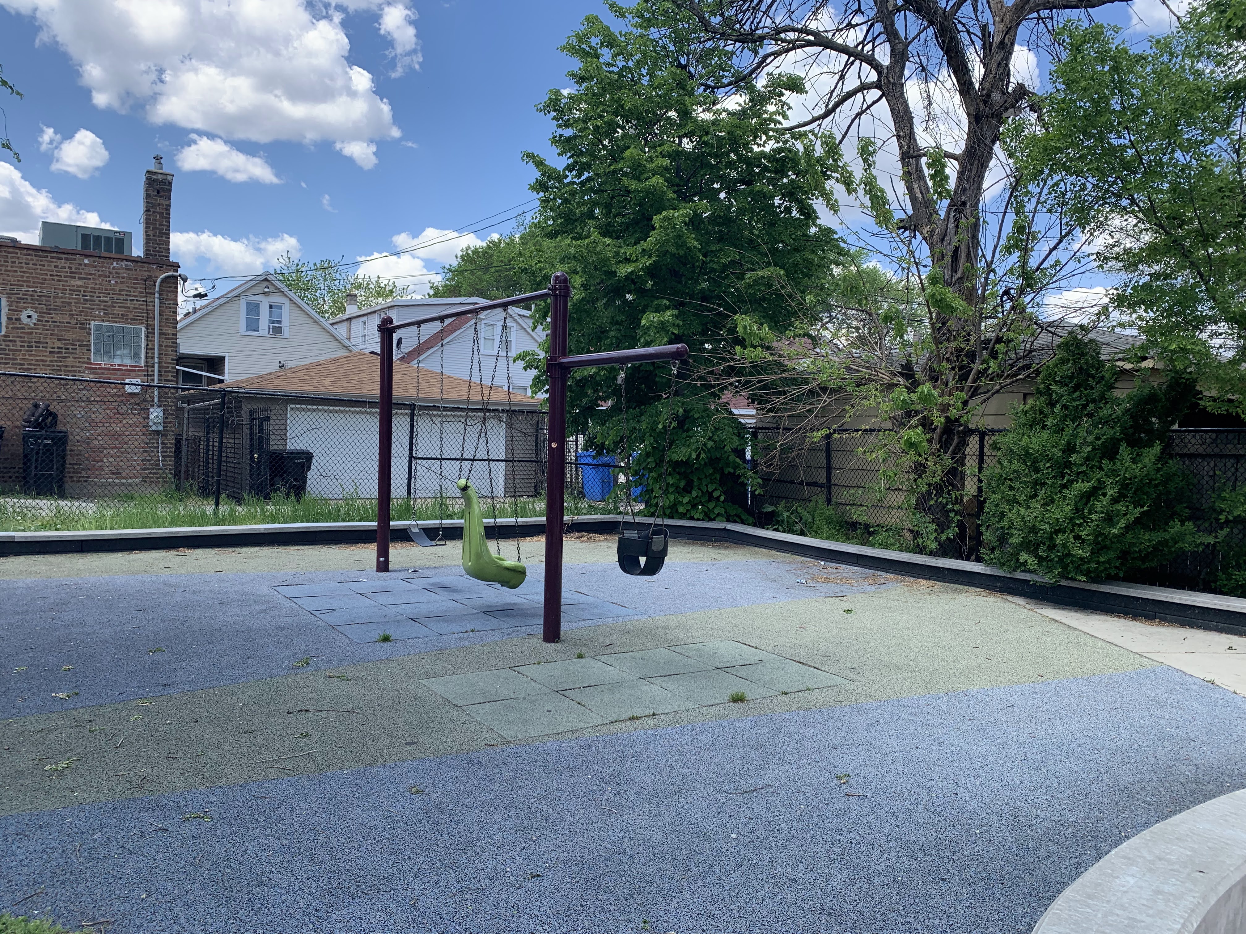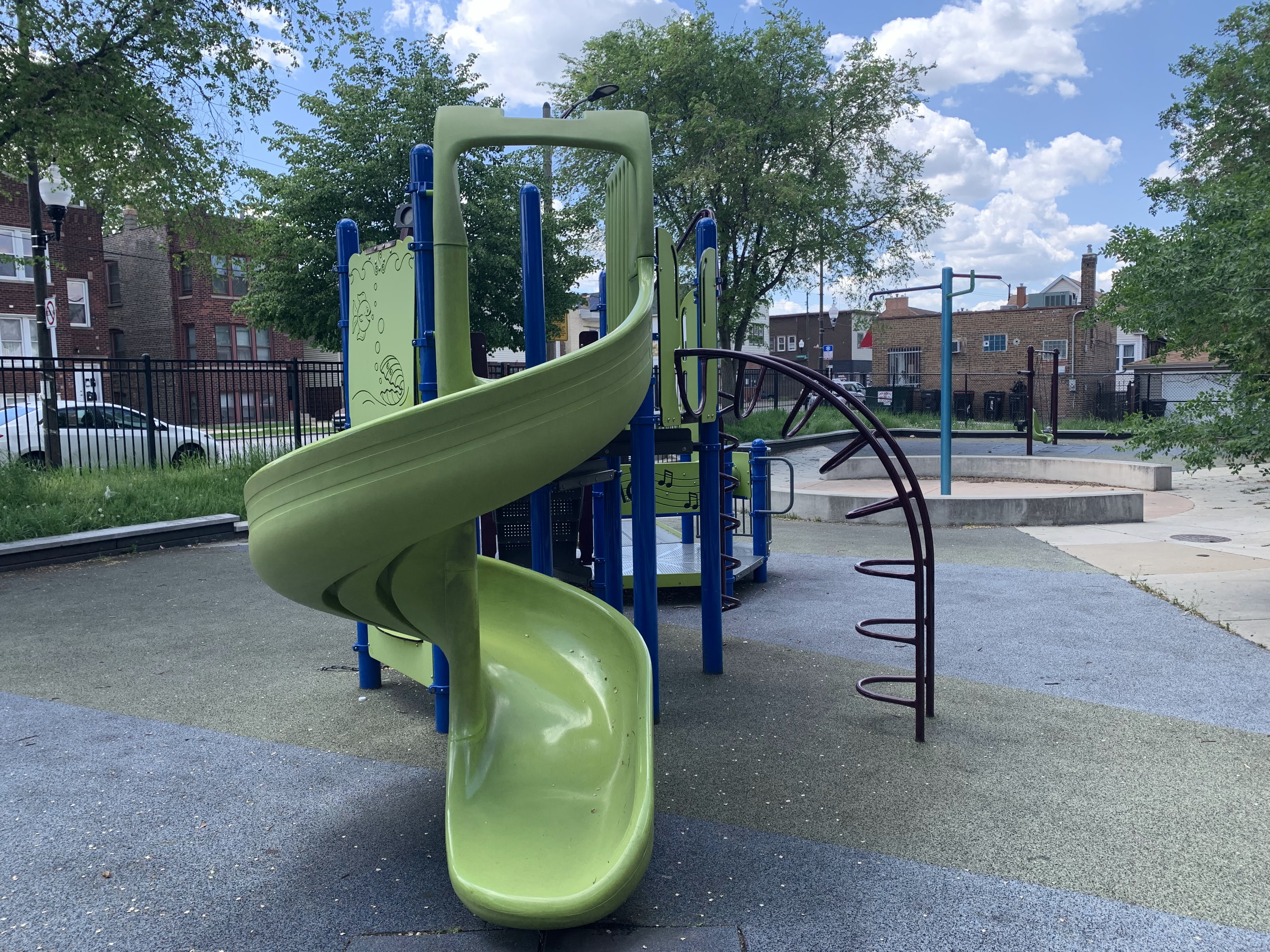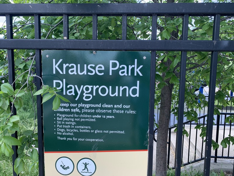 - Krause Park is a neighborhood playlot with a small playground and water feature. There is one small play structure with a few climbing elements and one corkscrew slide. There is also a small swing set with three swings: one toddler, one adaptive, and one standard belt seat swing. The water feature is a simple 'triple shower sprayer.' The playground is fenced from the street (and somewhat below grade) but is not fully enclosed. There aren't benches or a picnic table for the low perimeter wall provides some seating. There is a drinking fountain and some small trees provide some shade.