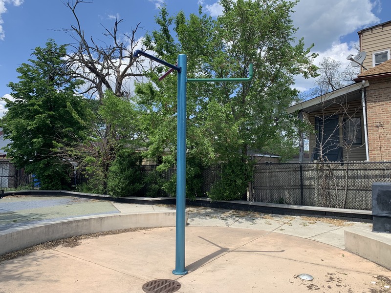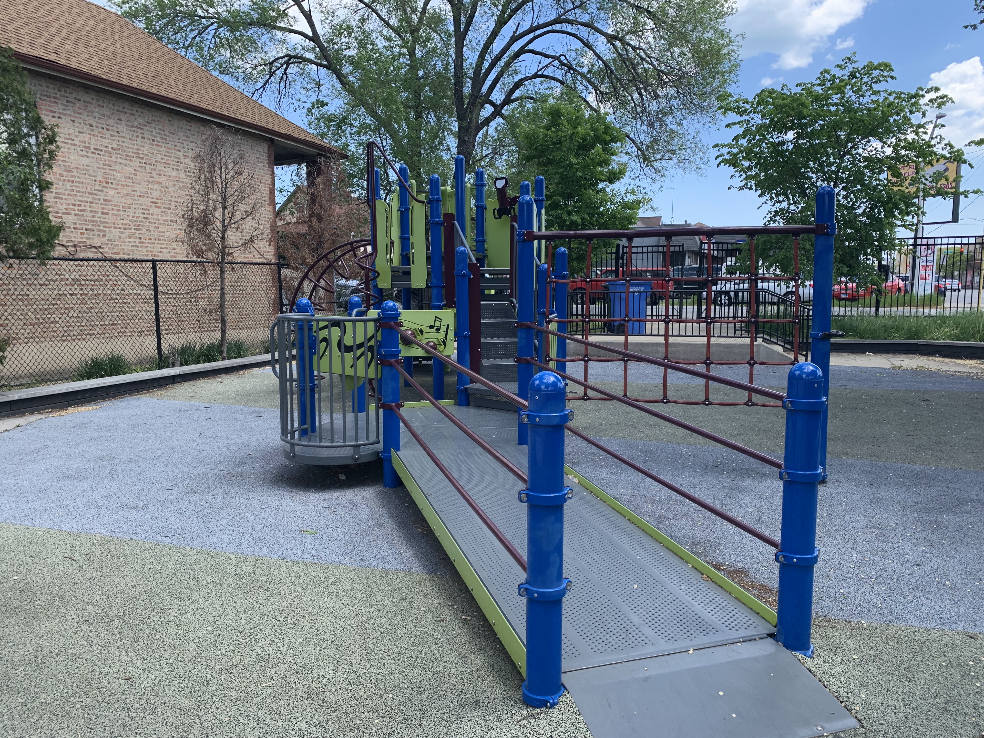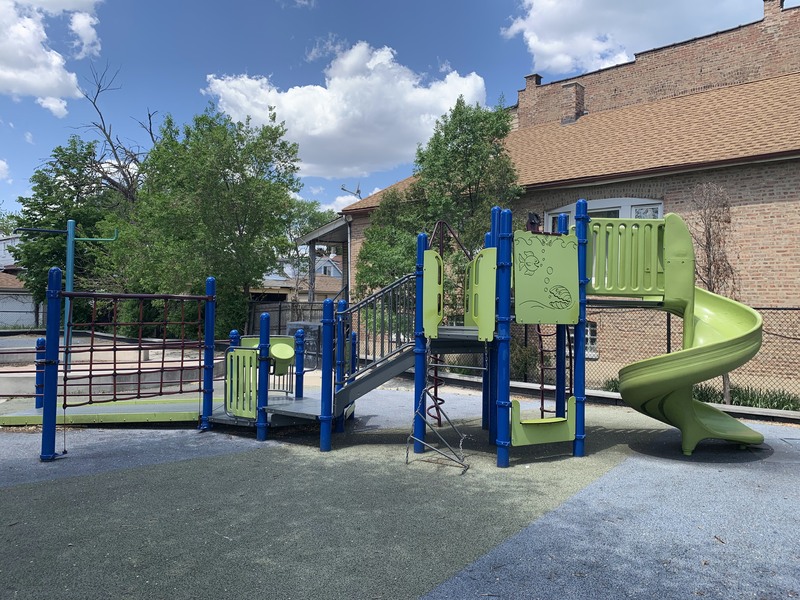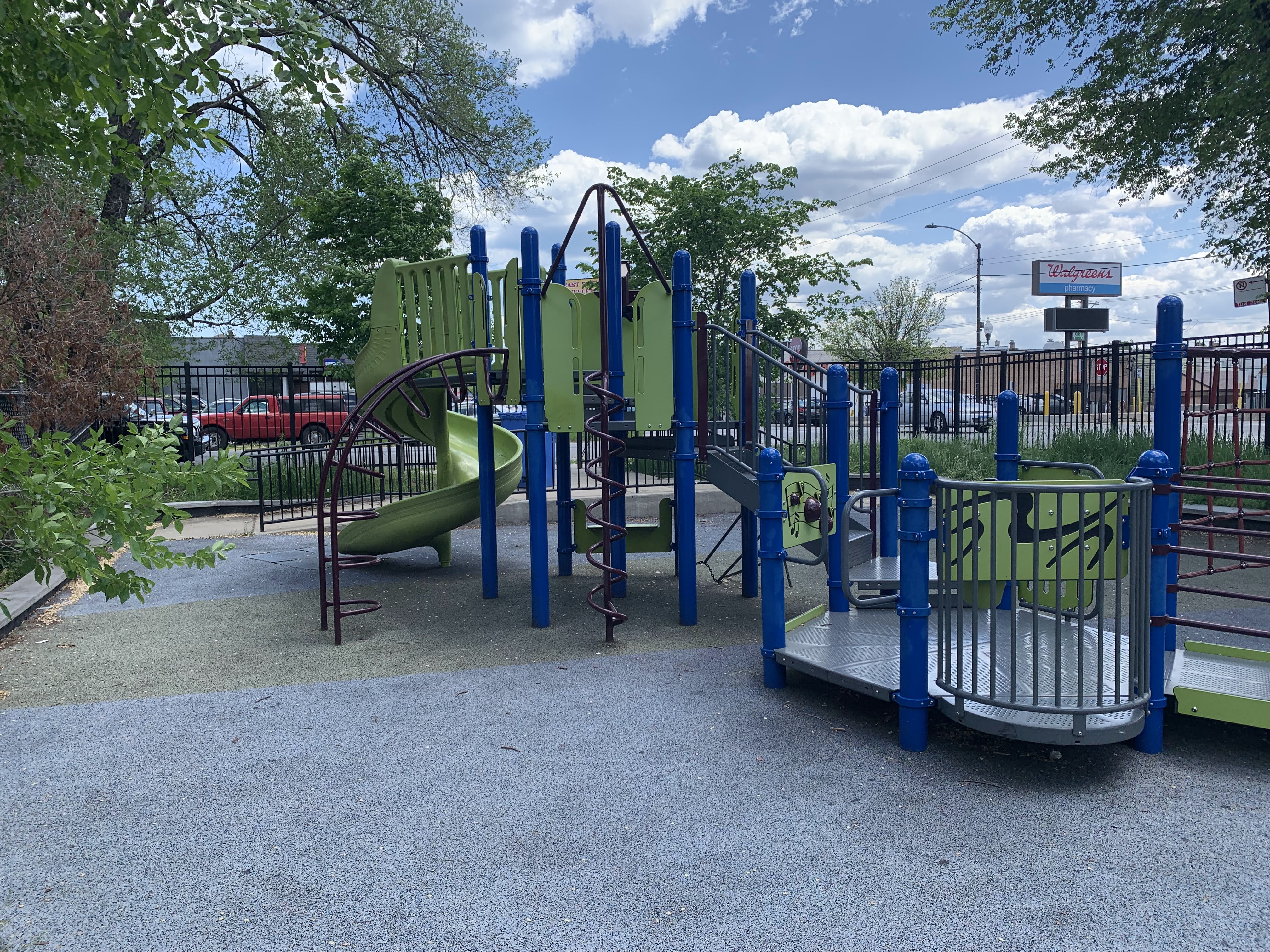 - Krause Park is a neighborhood playlot with a small playground and water feature. There is one small play structure with a few climbing elements and one corkscrew slide. There is also a small swing set with three swings: one toddler, one adaptive, and one standard belt seat swing. The water feature is a simple 'triple shower sprayer.' The playground is fenced from the street (and somewhat below grade) but is not fully enclosed. There aren't benches or a picnic table for the low perimeter wall provides some seating. There is a drinking fountain and some small trees provide some shade.