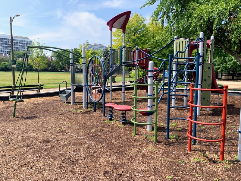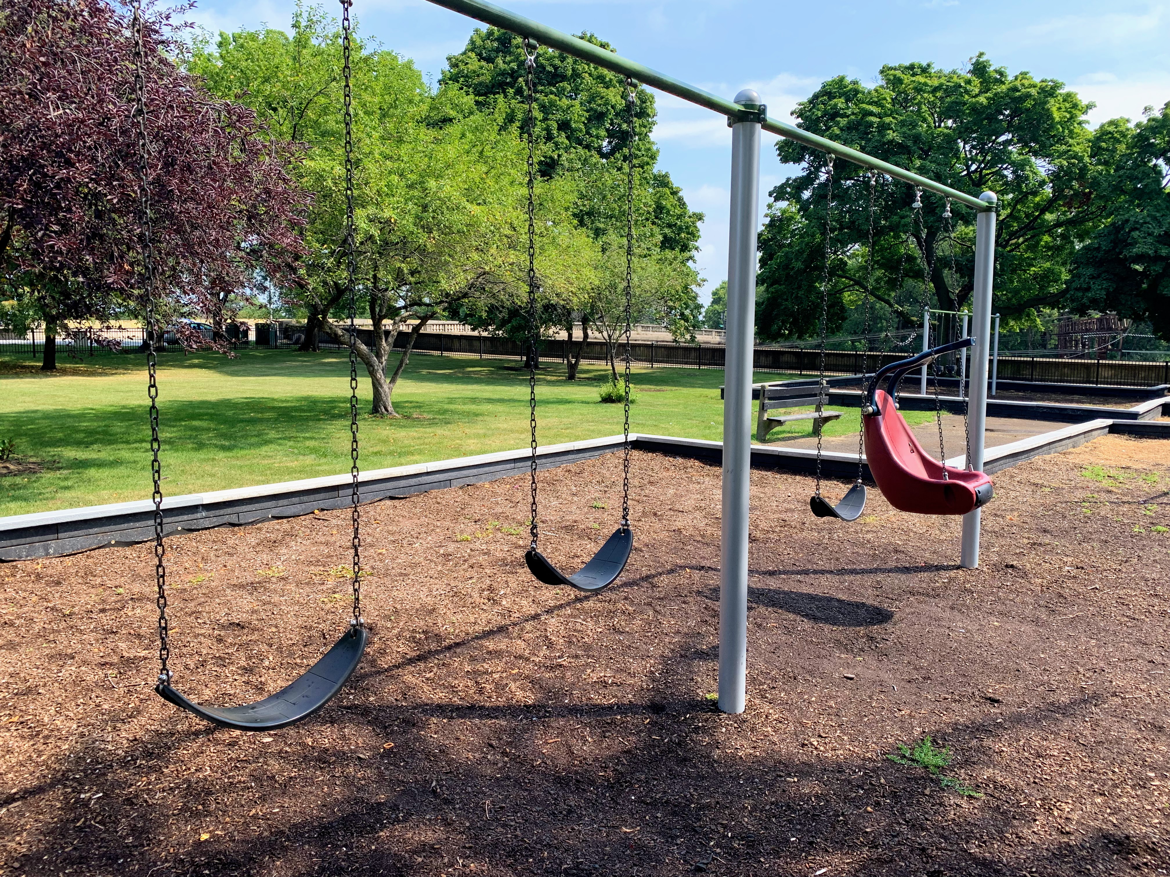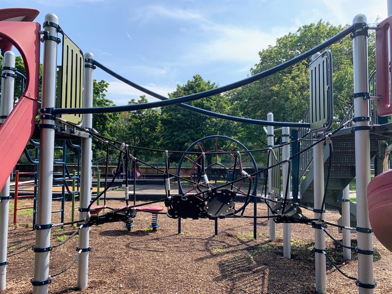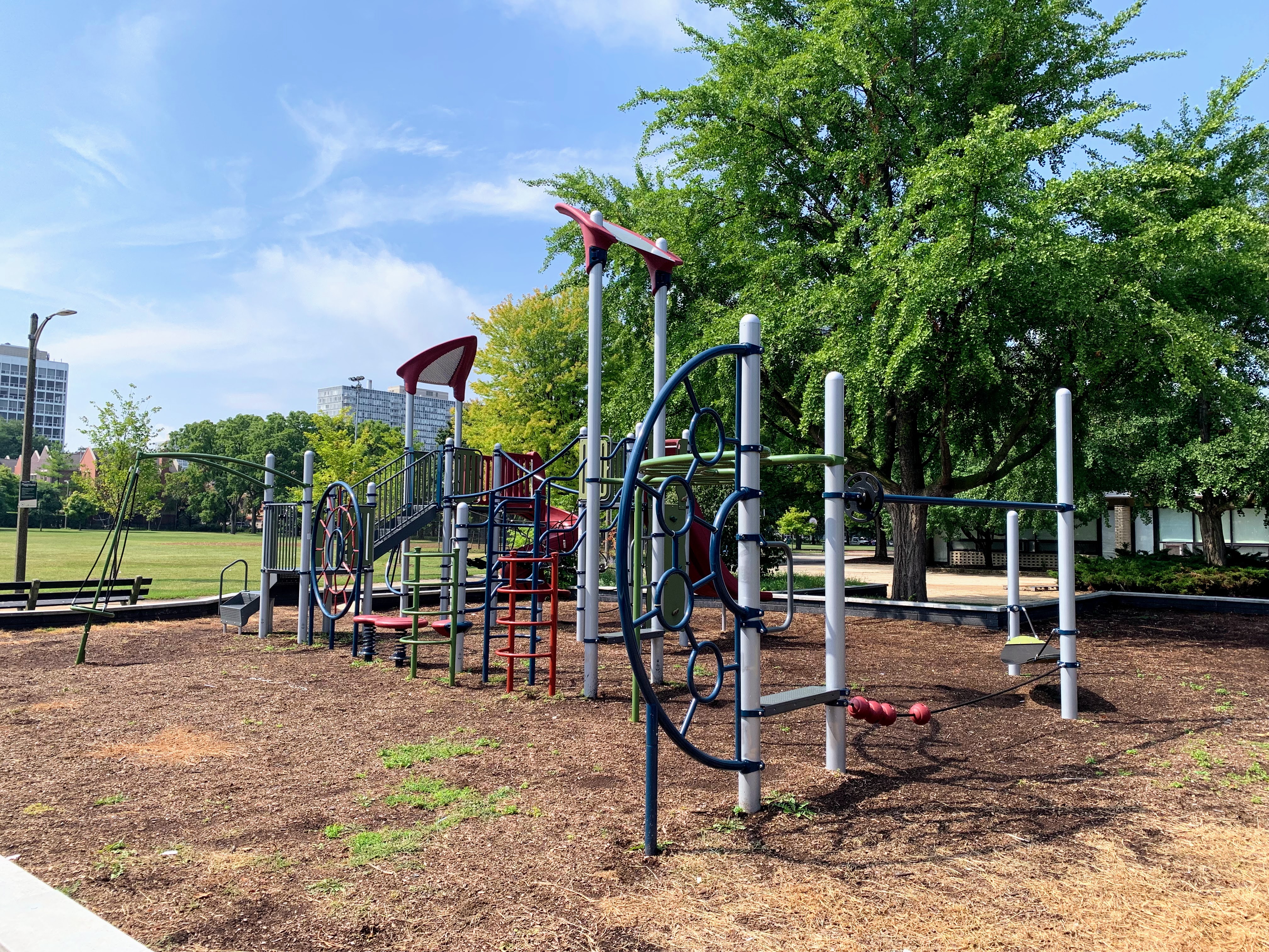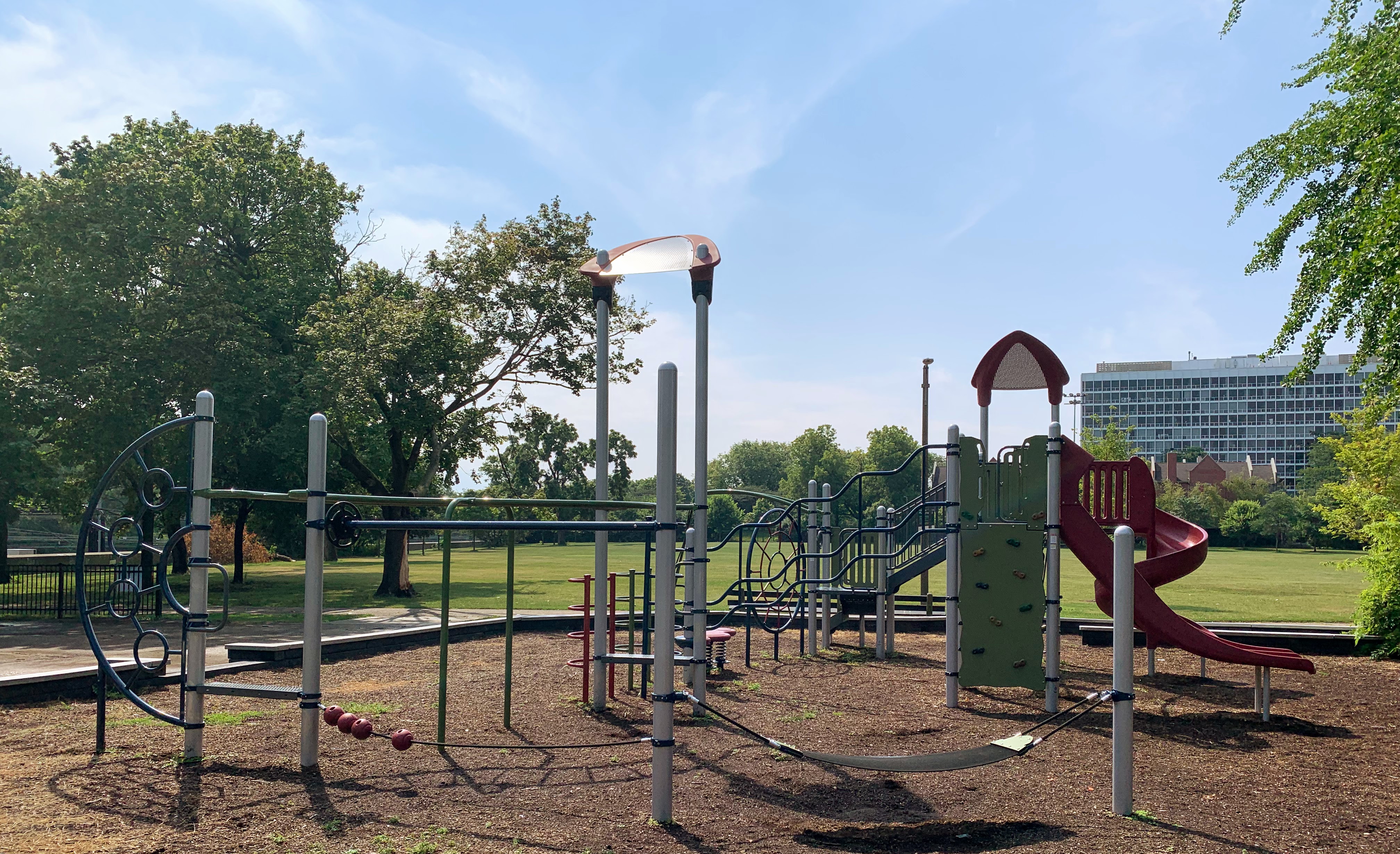 - Set in the northeast corner of Lake Meadows Park is a solid playground designed for a variety of ages. There is a very small play structure for younger children and a then a large, sprawling structure for older children. The larger structure includes a few slides, climbing elements, traversing elements, and a variation on monkey bars. There are also two swing sets with the standard Chicago Park varieties: toddler, adaptive with harness, and belt seat swing. The other elements of this park aren't novel but are classic playground features. The play area is fenced from the street but not fully enclosed and opens to the rest of the grassy park. The play surface is wood chips and there are a few benches for seating. Trees provide some shade but the playground is bright and sunny. The site does offer great views of the trains passing on the train tracks to the east. All in all, this is a solid neighborhood playground.