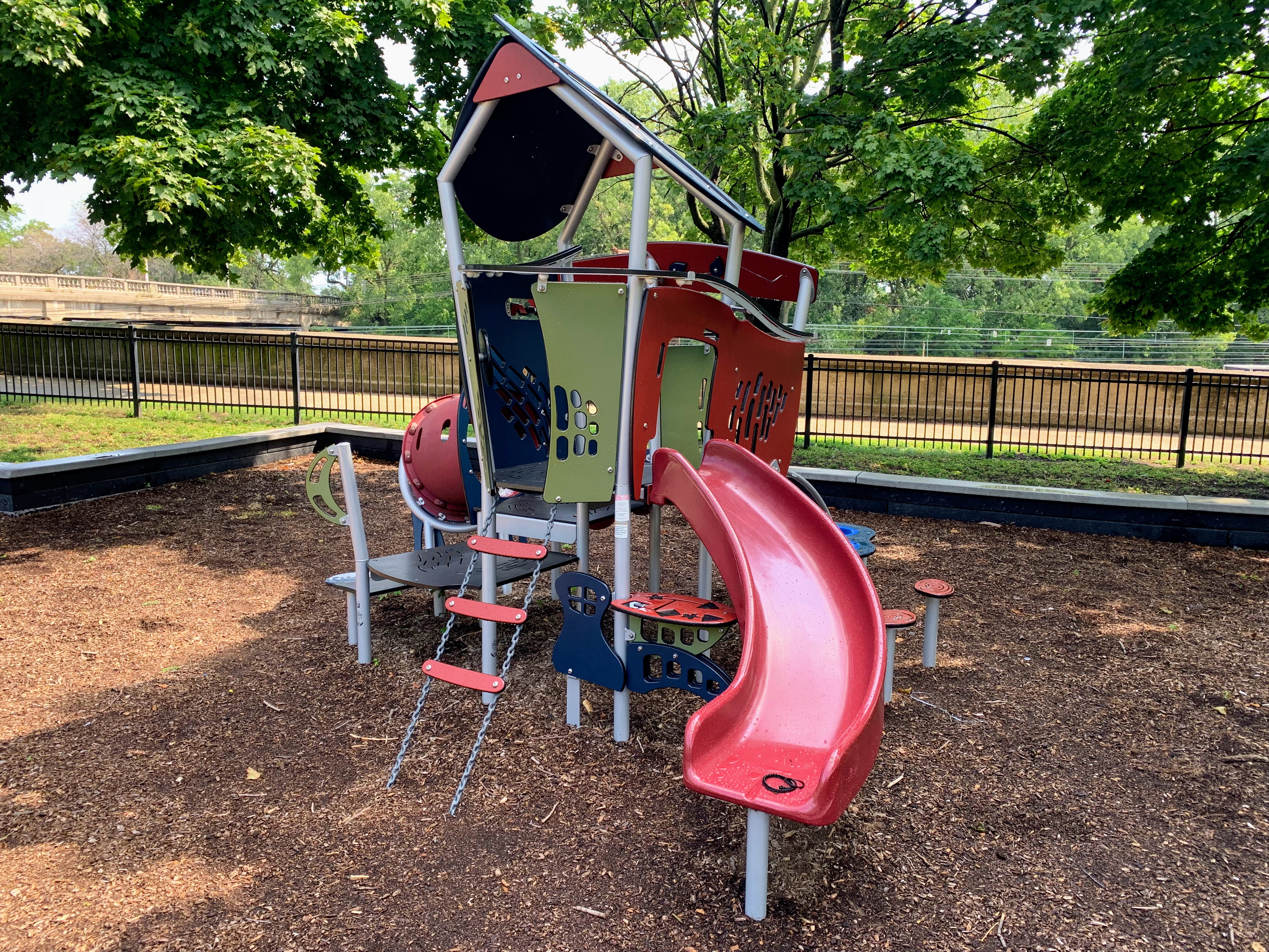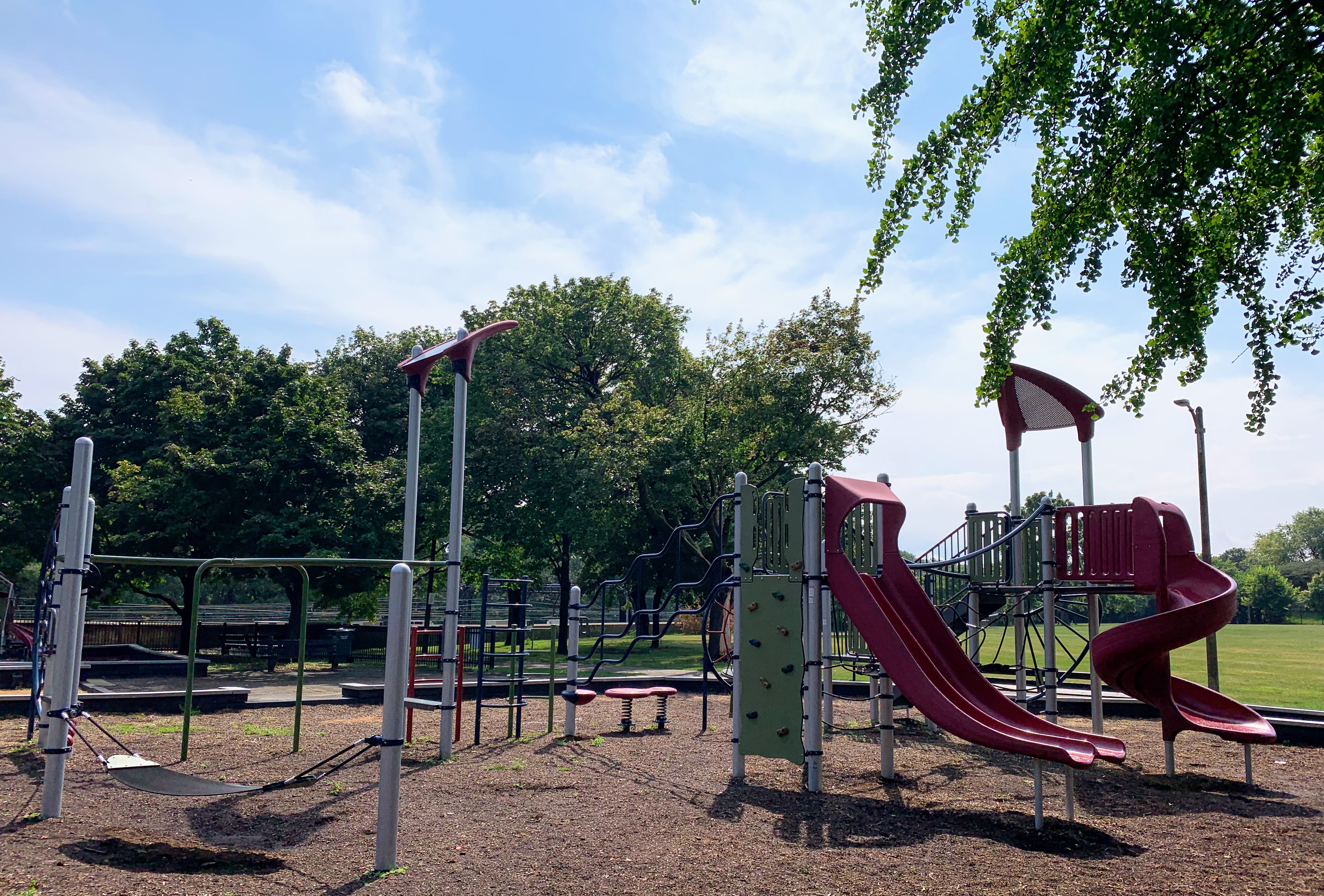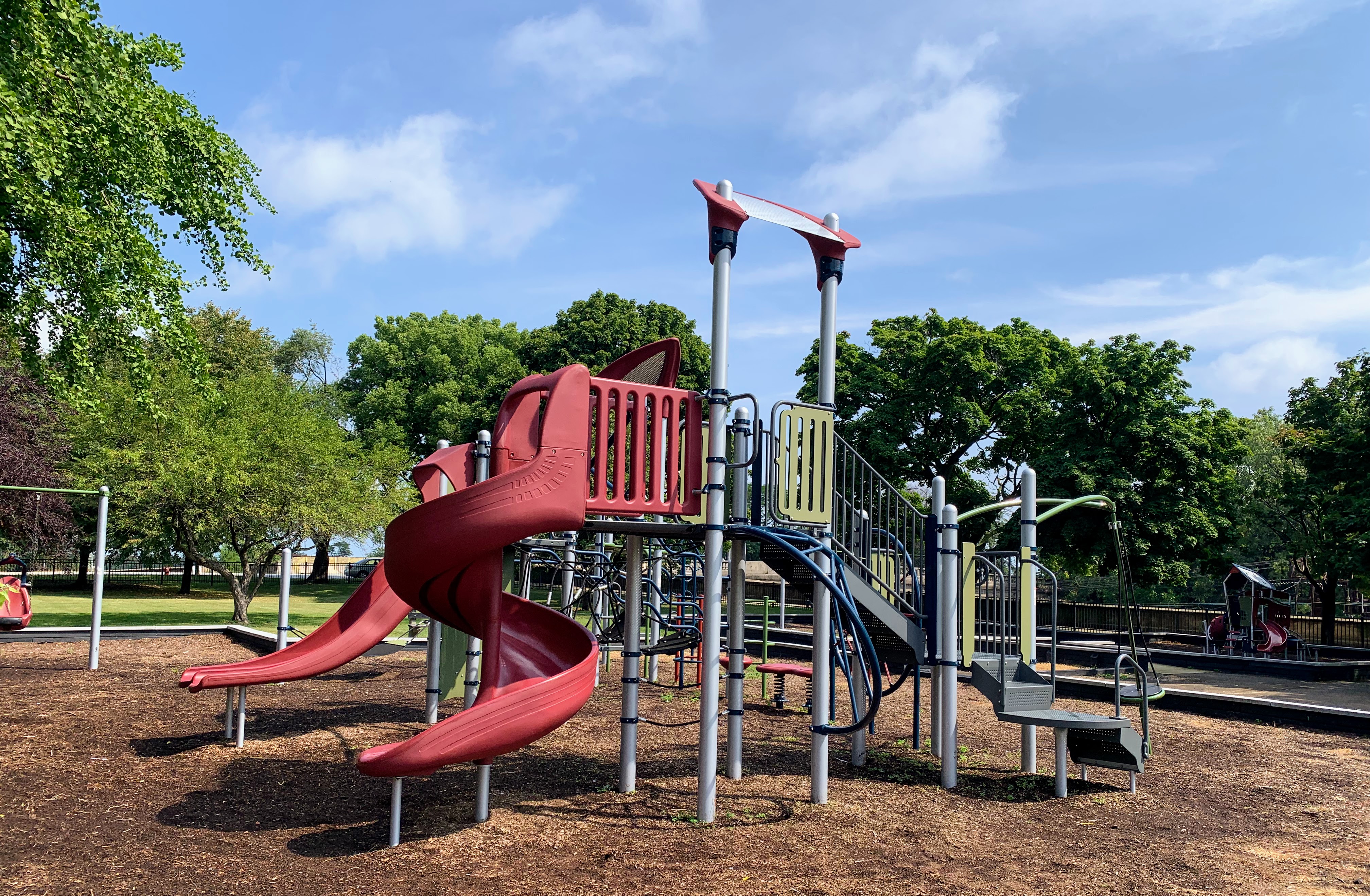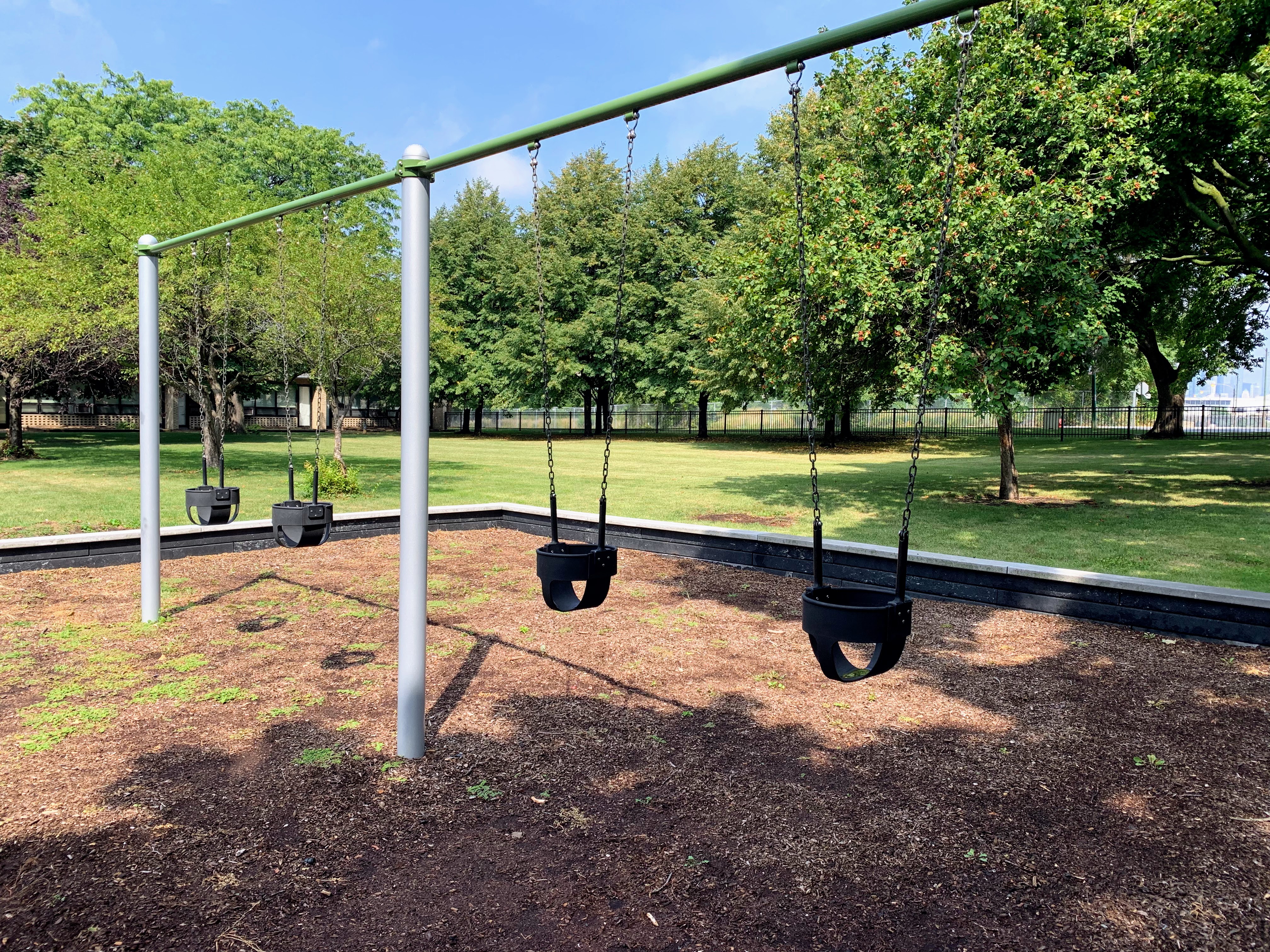 - Set in the northeast corner of Lake Meadows Park is a solid playground designed for a variety of ages. There is a very small play structure for younger children and a then a large, sprawling structure for older children. The larger structure includes a few slides, climbing elements, traversing elements, and a variation on monkey bars. There are also two swing sets with the standard Chicago Park varieties: toddler, adaptive with harness, and belt seat swing. The other elements of this park aren't novel but are classic playground features. The play area is fenced from the street but not fully enclosed and opens to the rest of the grassy park. The play surface is wood chips and there are a few benches for seating. Trees provide some shade but the playground is bright and sunny. The site does offer great views of the trains passing on the train tracks to the east. All in all, this is a solid neighborhood playground.