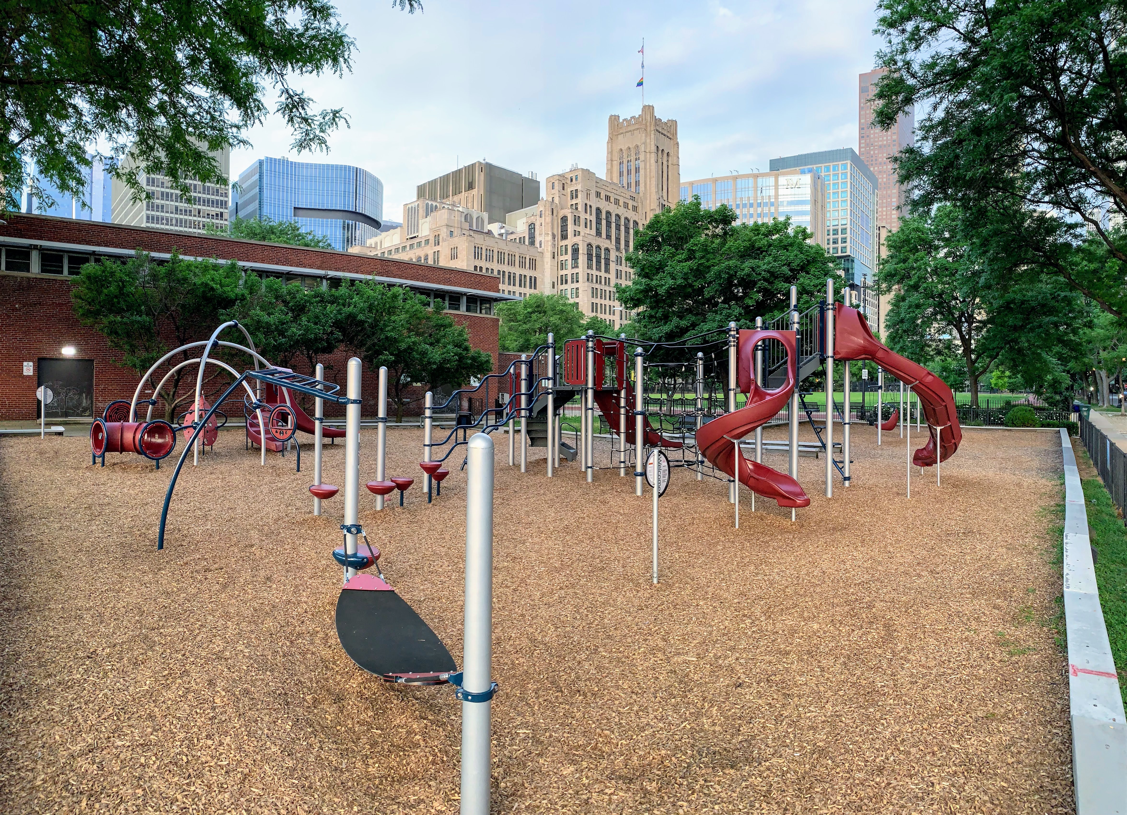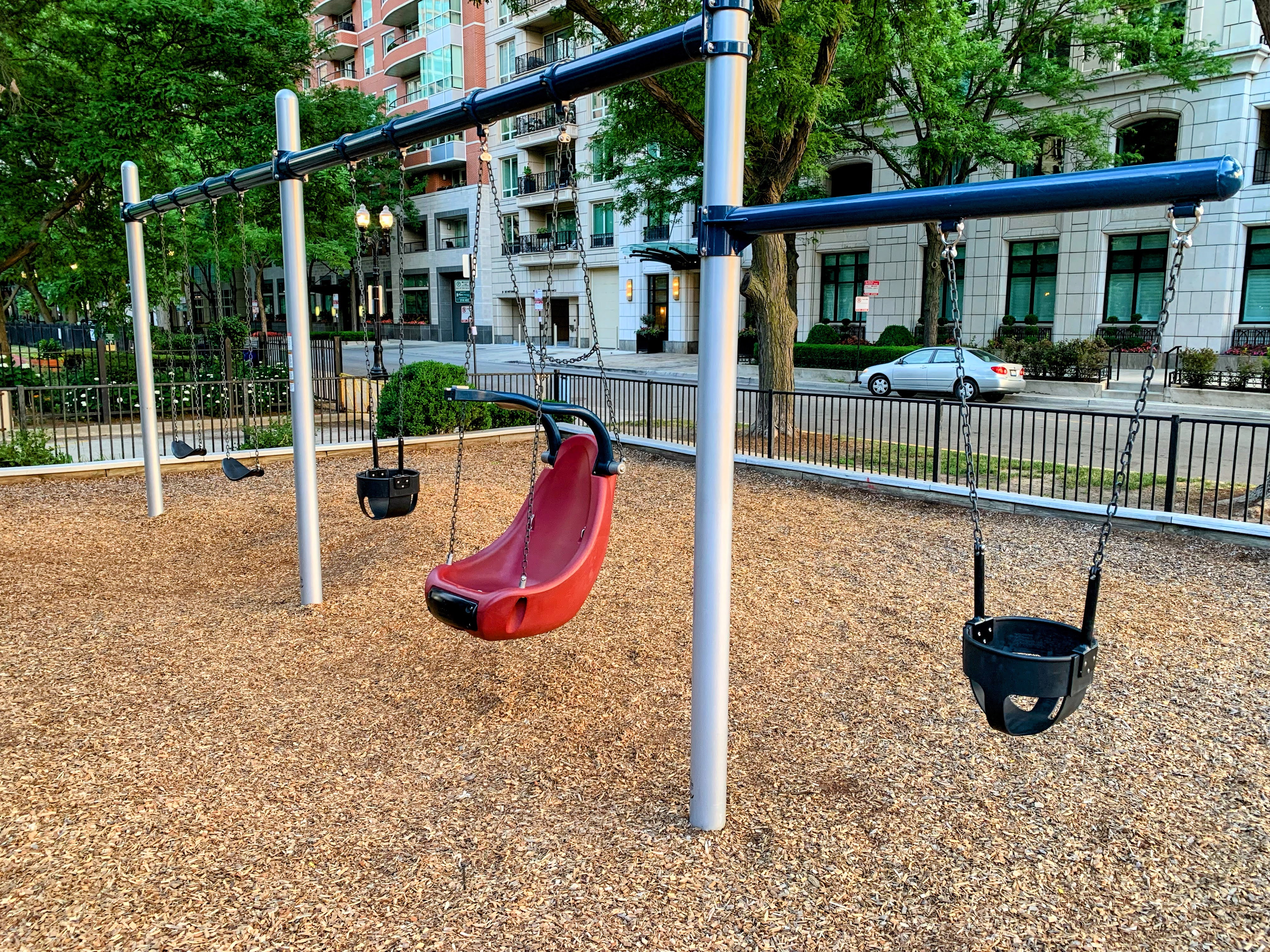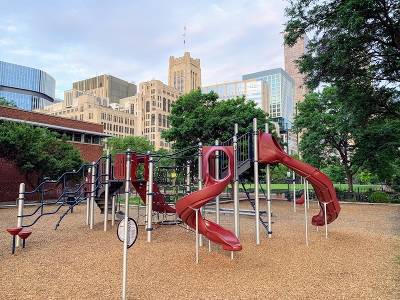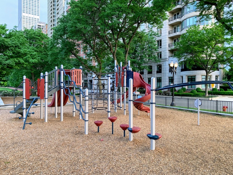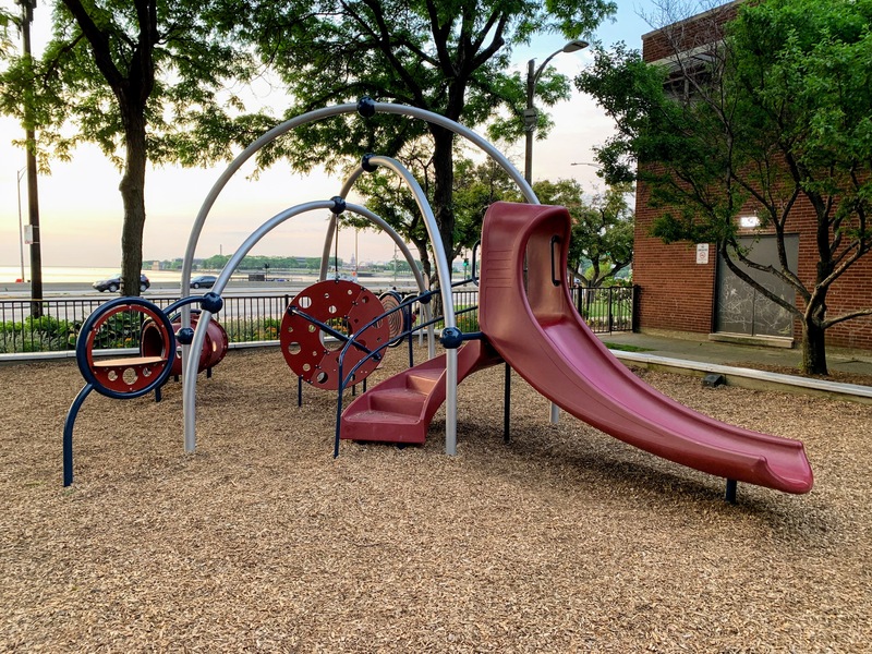 The playground at Lake Shore Park is a great playground in Streeterville. There is a small and simple play structure for younger children and a much larger structure for older children with a few slides, climbing elements, and more. There is also the standard set of Chicago Park swings (toddler, adaptive, and belt seat).