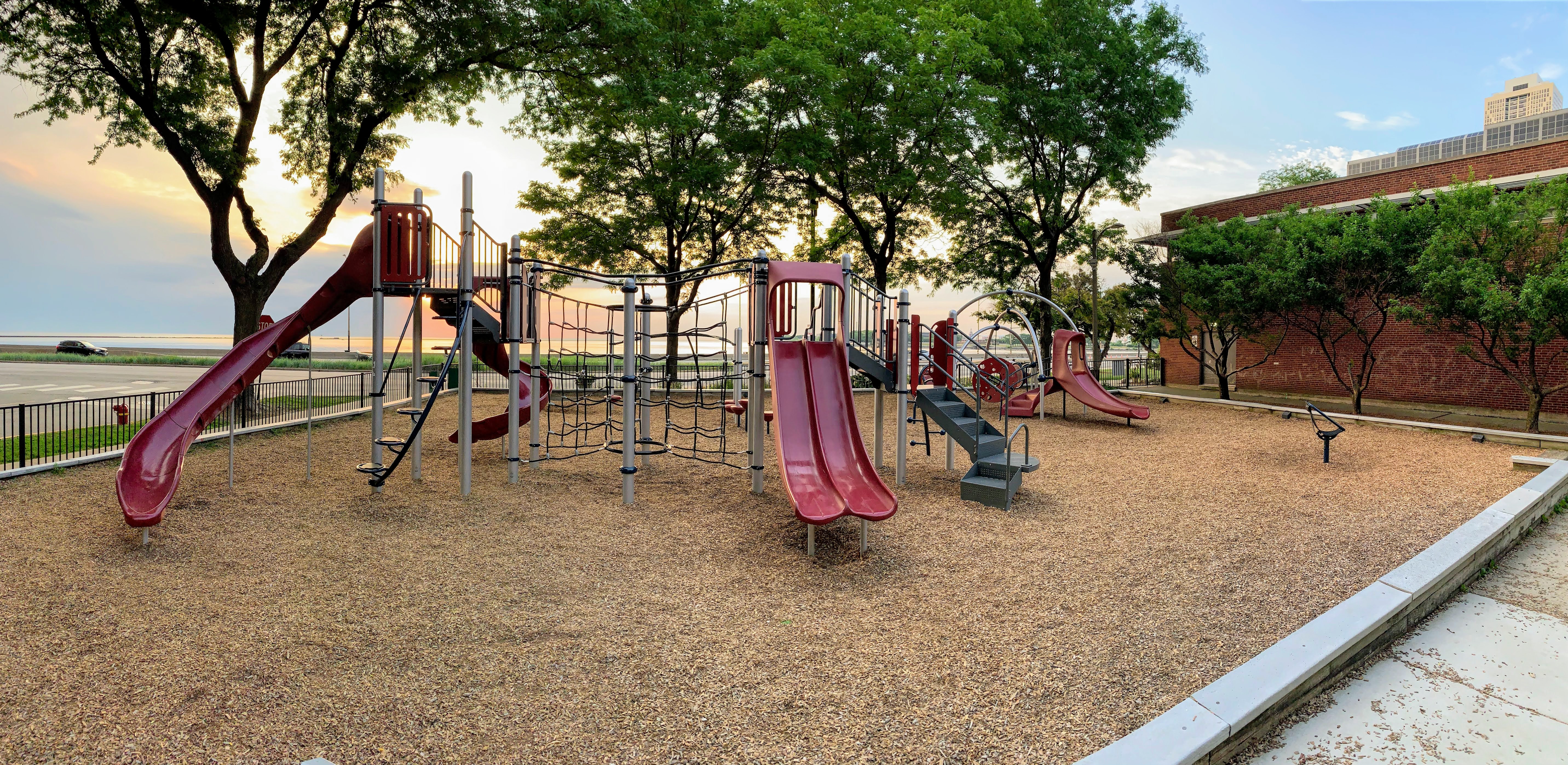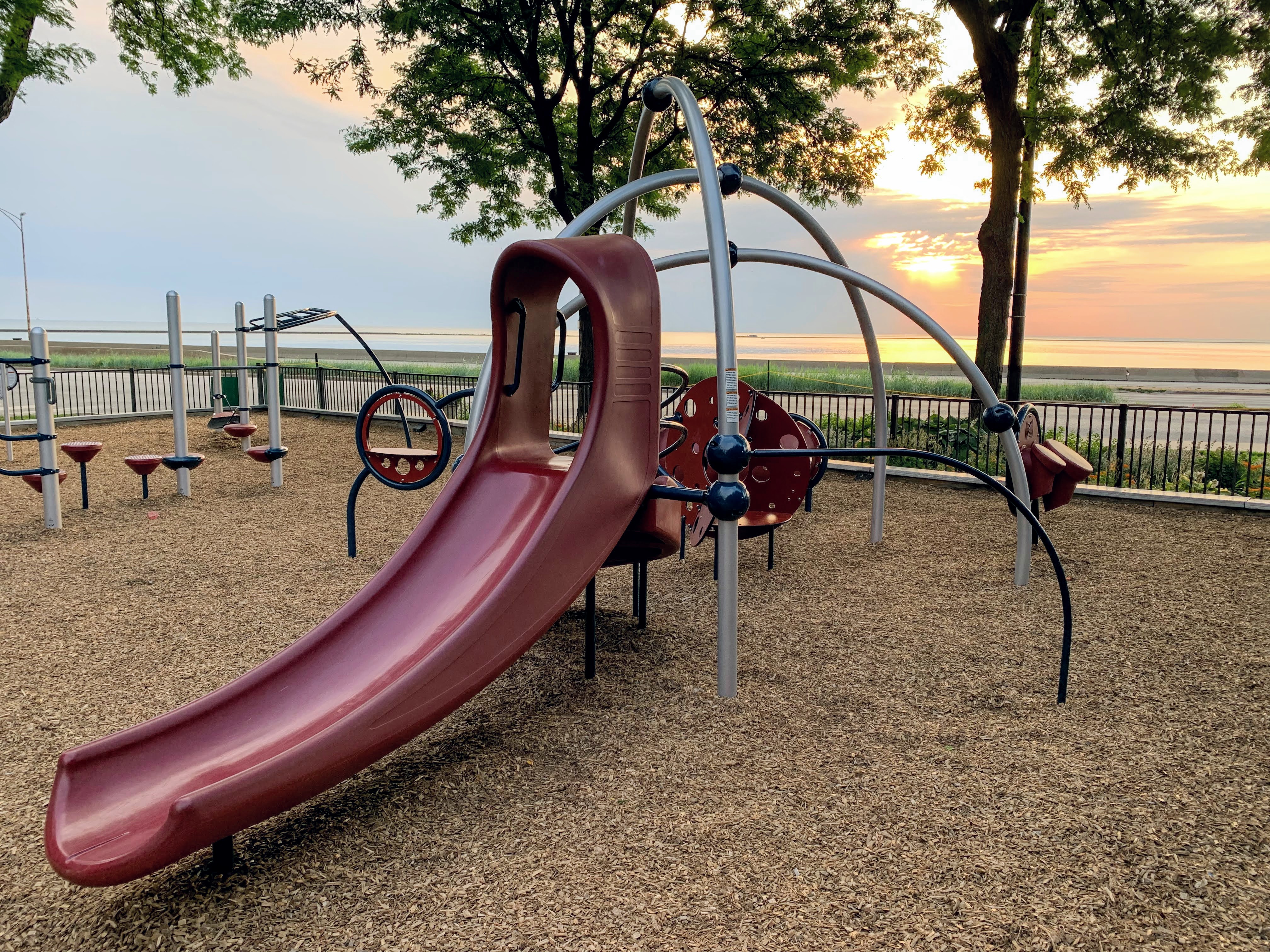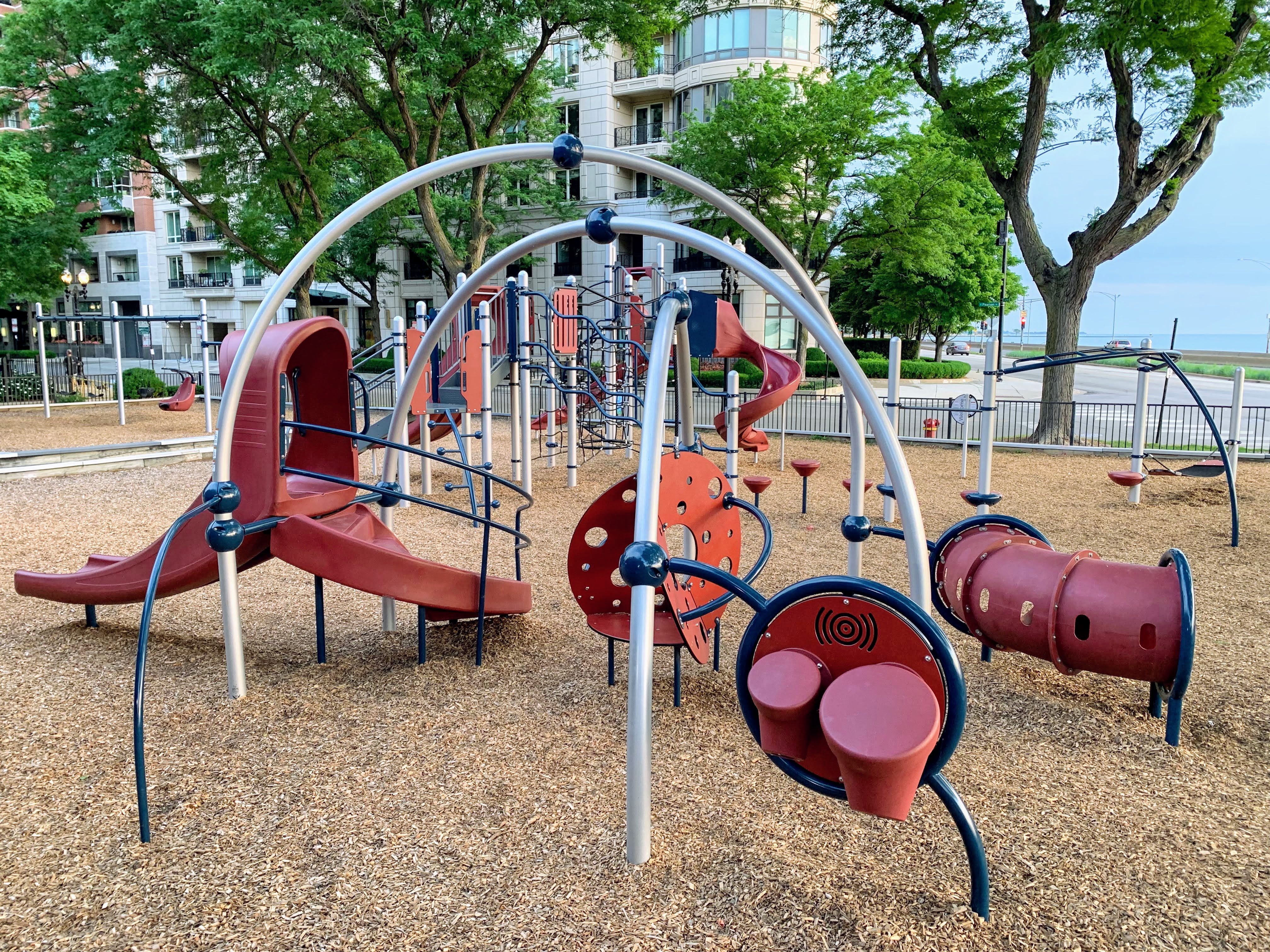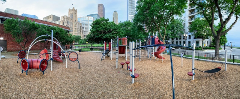 The play area is fully enclosed and features great views of Lake Michigan (although the views are over the often jammed DuSable Lake Shore Drive...). The play surface is wood chips and there are a few benches for seating. There are some trees that provide some shade and this playground is next to the fieldhouse for bathroom access. All in all, this is a great playground with great views. - Playground Features