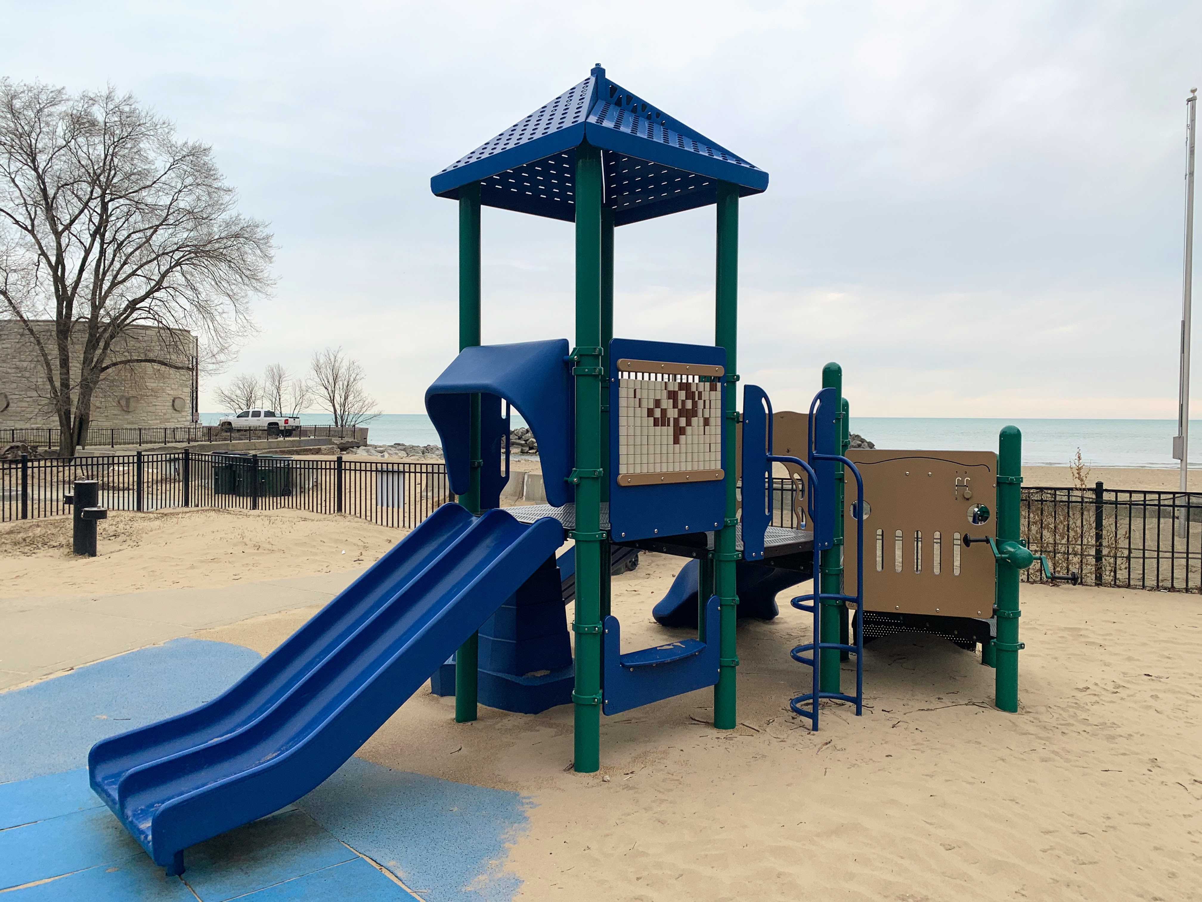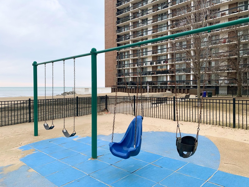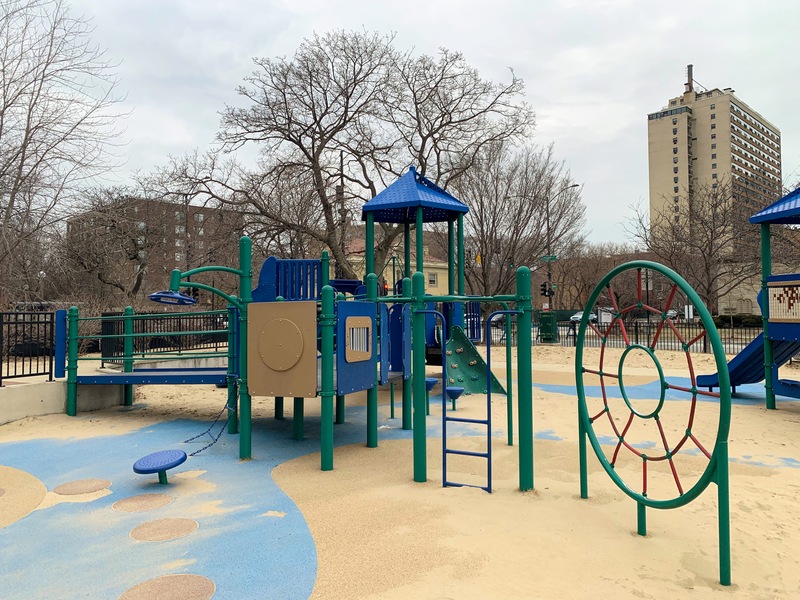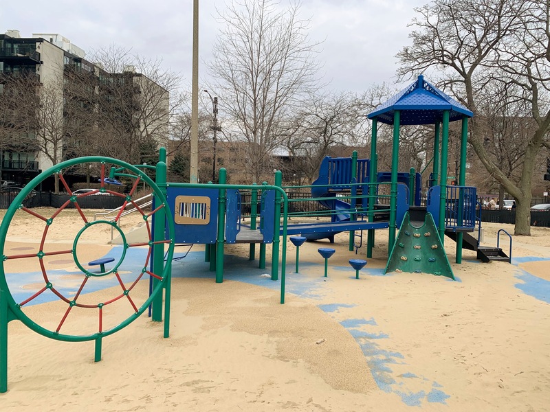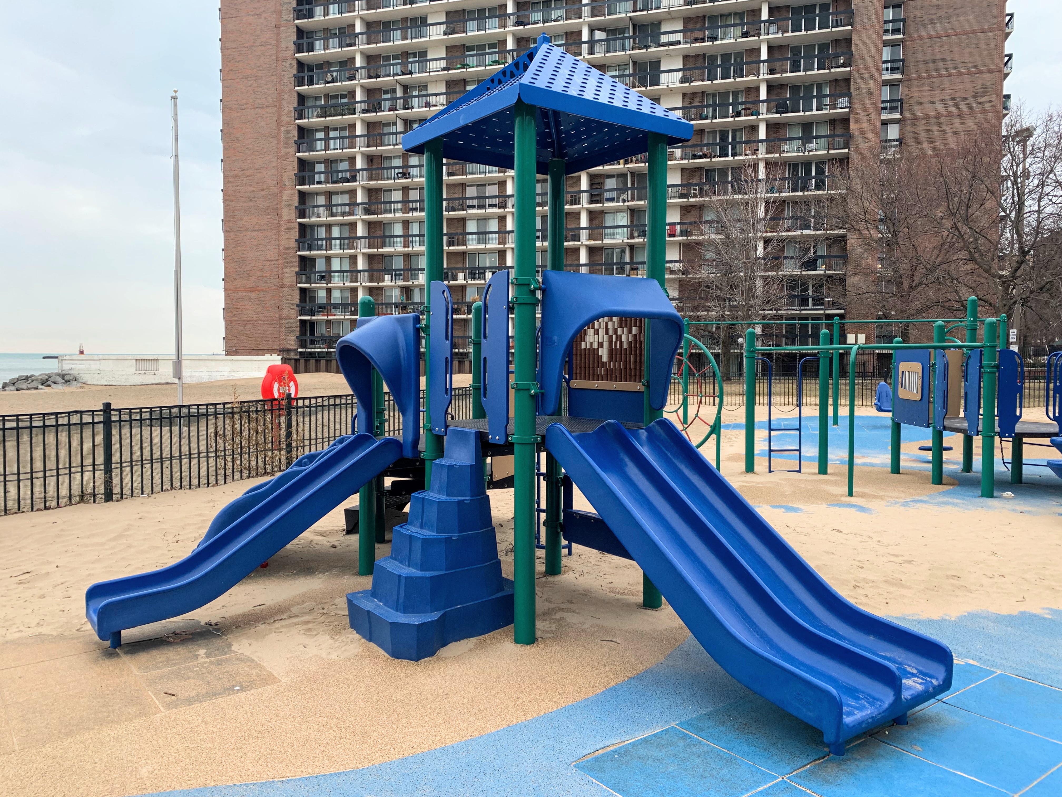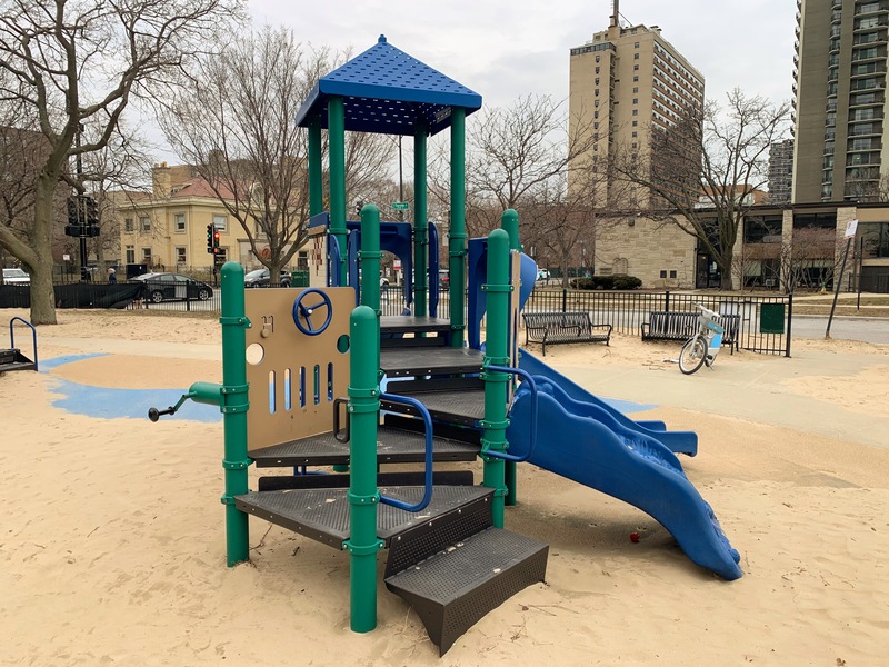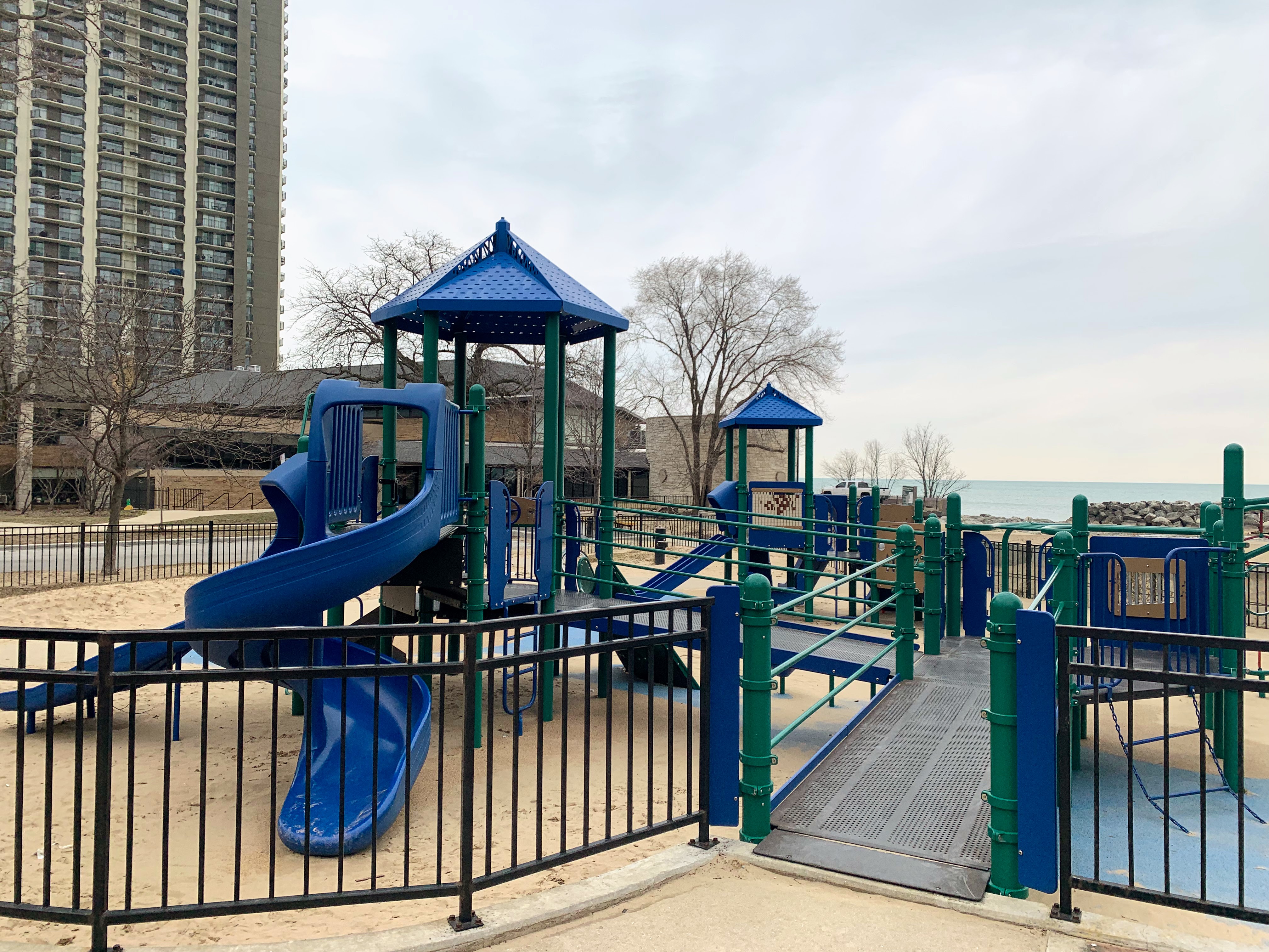 This playground - named the Max Pastin Playground - is in Lane Beach Park and features some solid playground equipment and great views of Lake Michigan. There are two play structures; the larger structure is for older children and is accessible via a ramp. There is also a standard set of Chicago Park swings: toddler, adaptive, and belt seat.