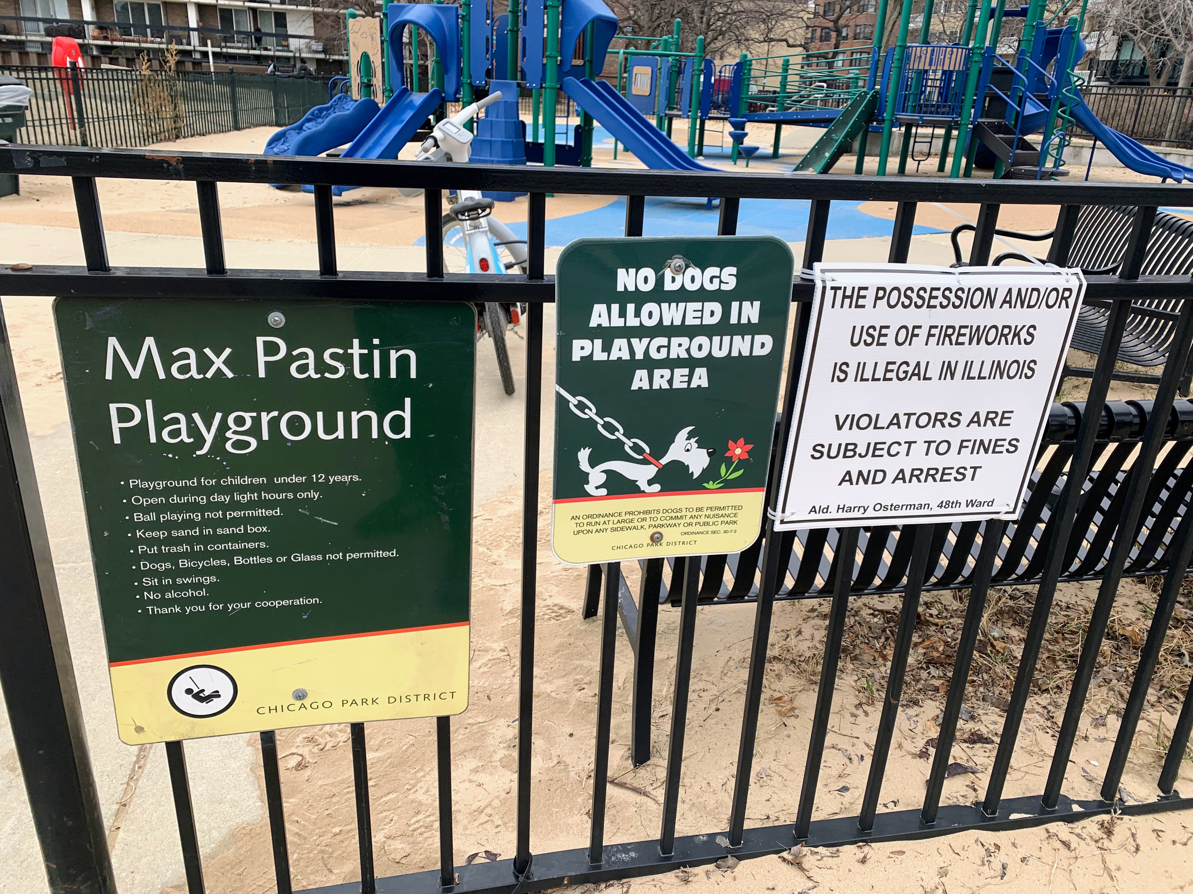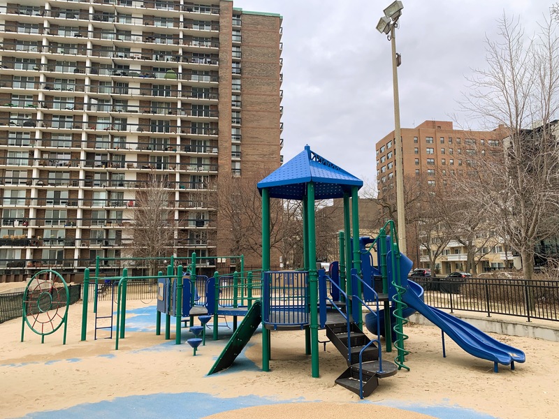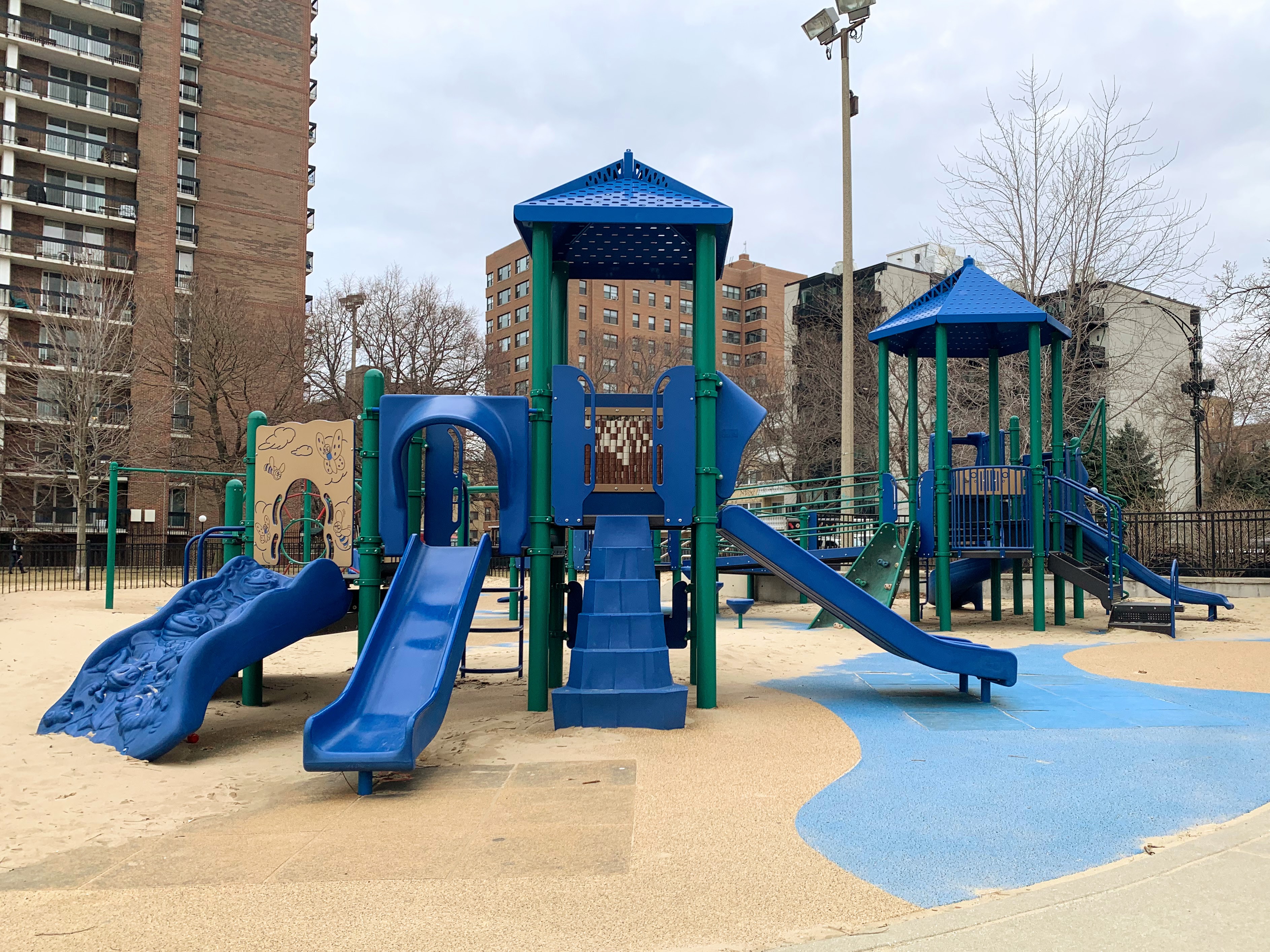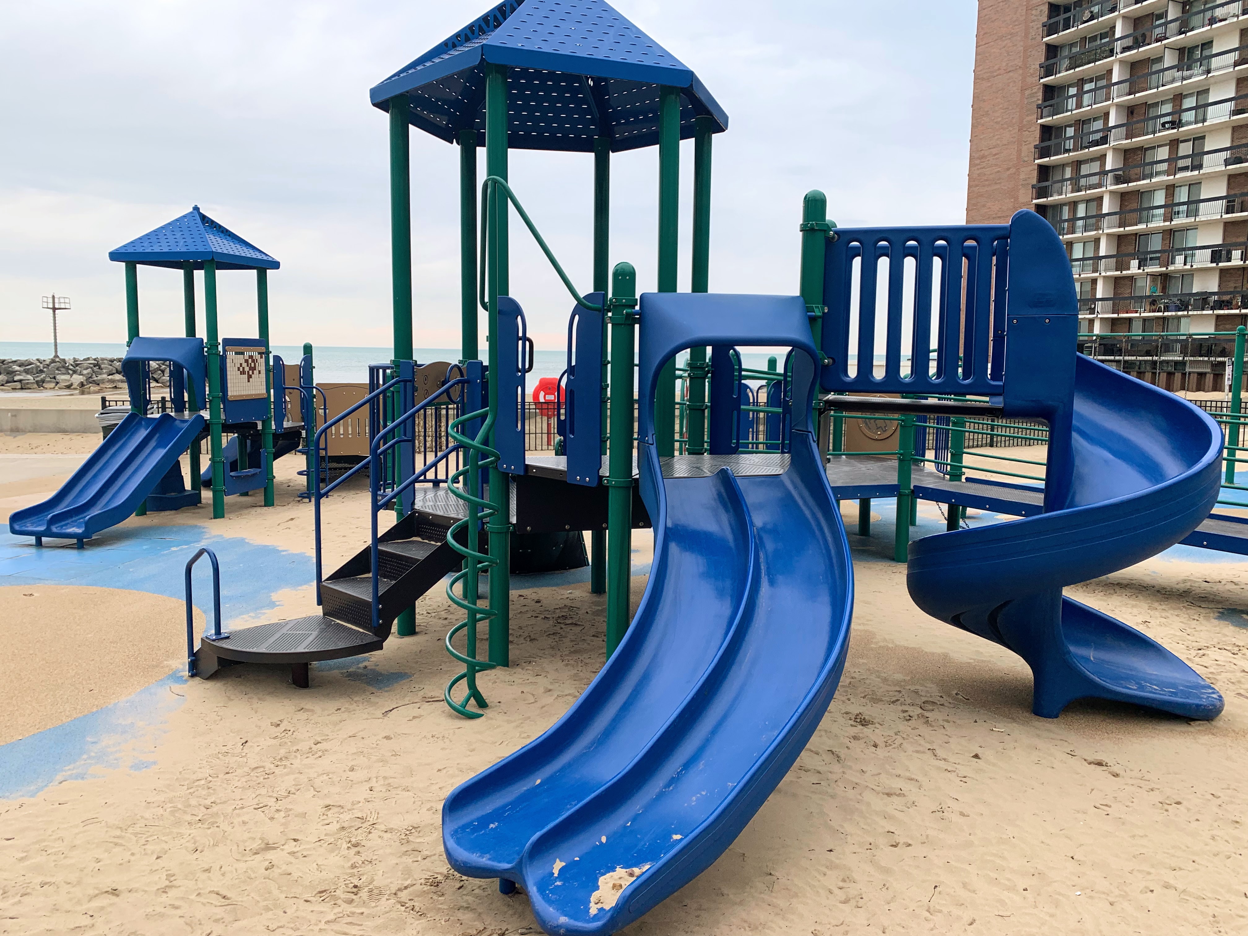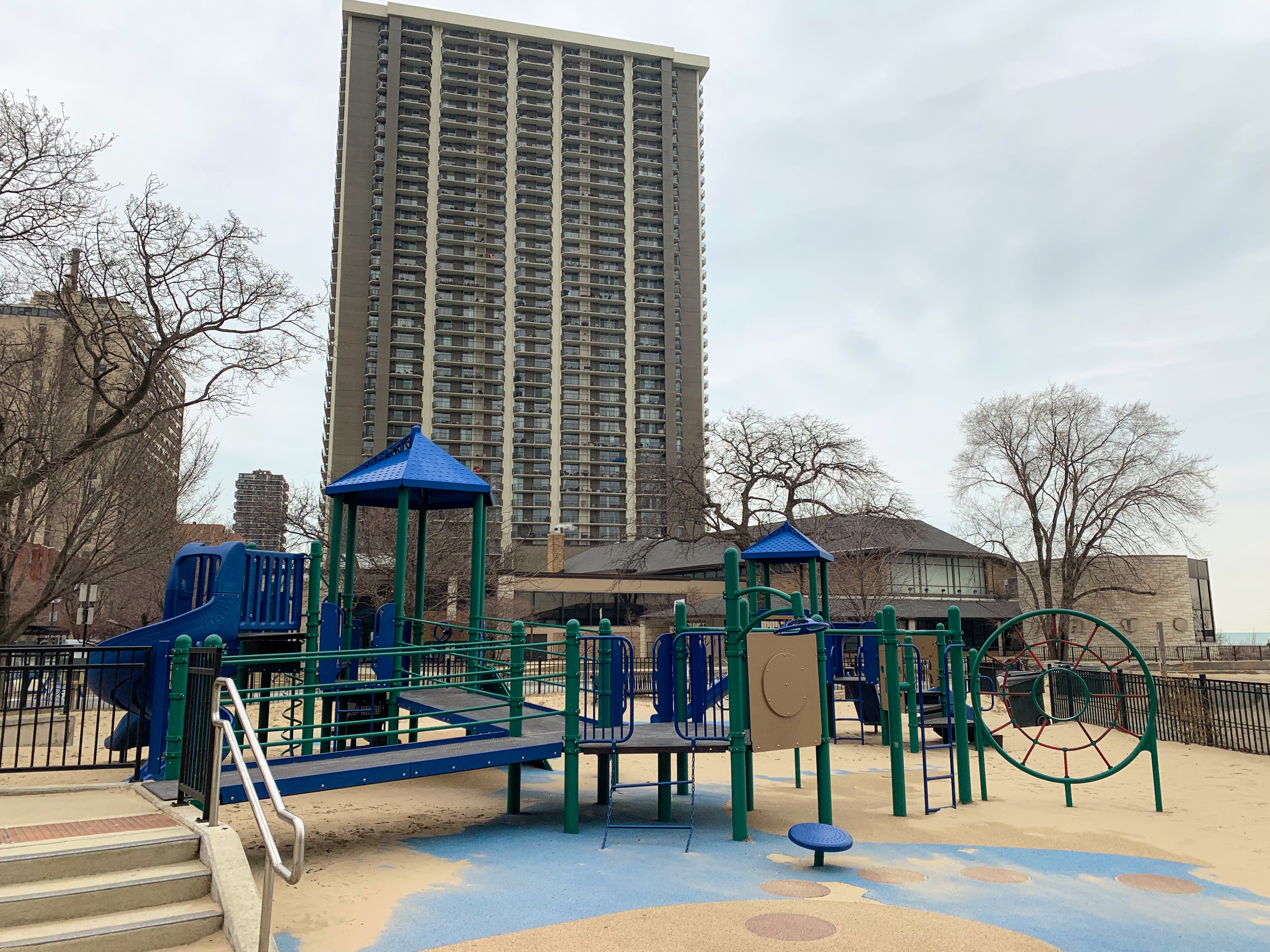 This playground - named the Max Pastin Playground - is in Lane Beach Park and features some solid playground equipment and great views of Lake Michigan. There are two play structures; the larger structure is for older children and is accessible via a ramp. There is also a standard set of Chicago Park swings: toddler, adaptive, and belt seat.