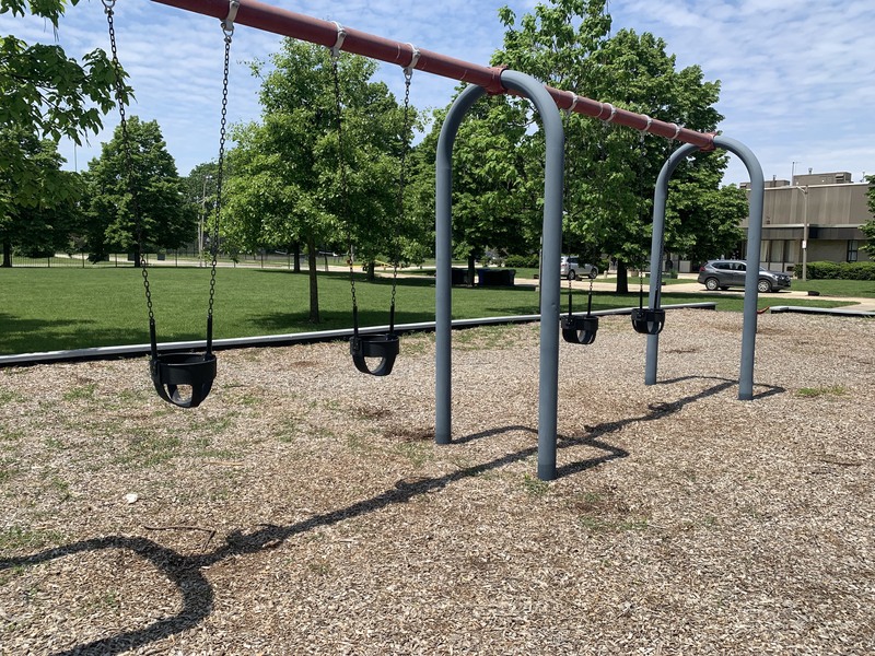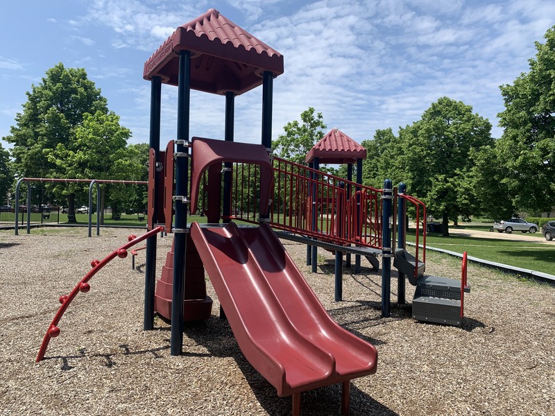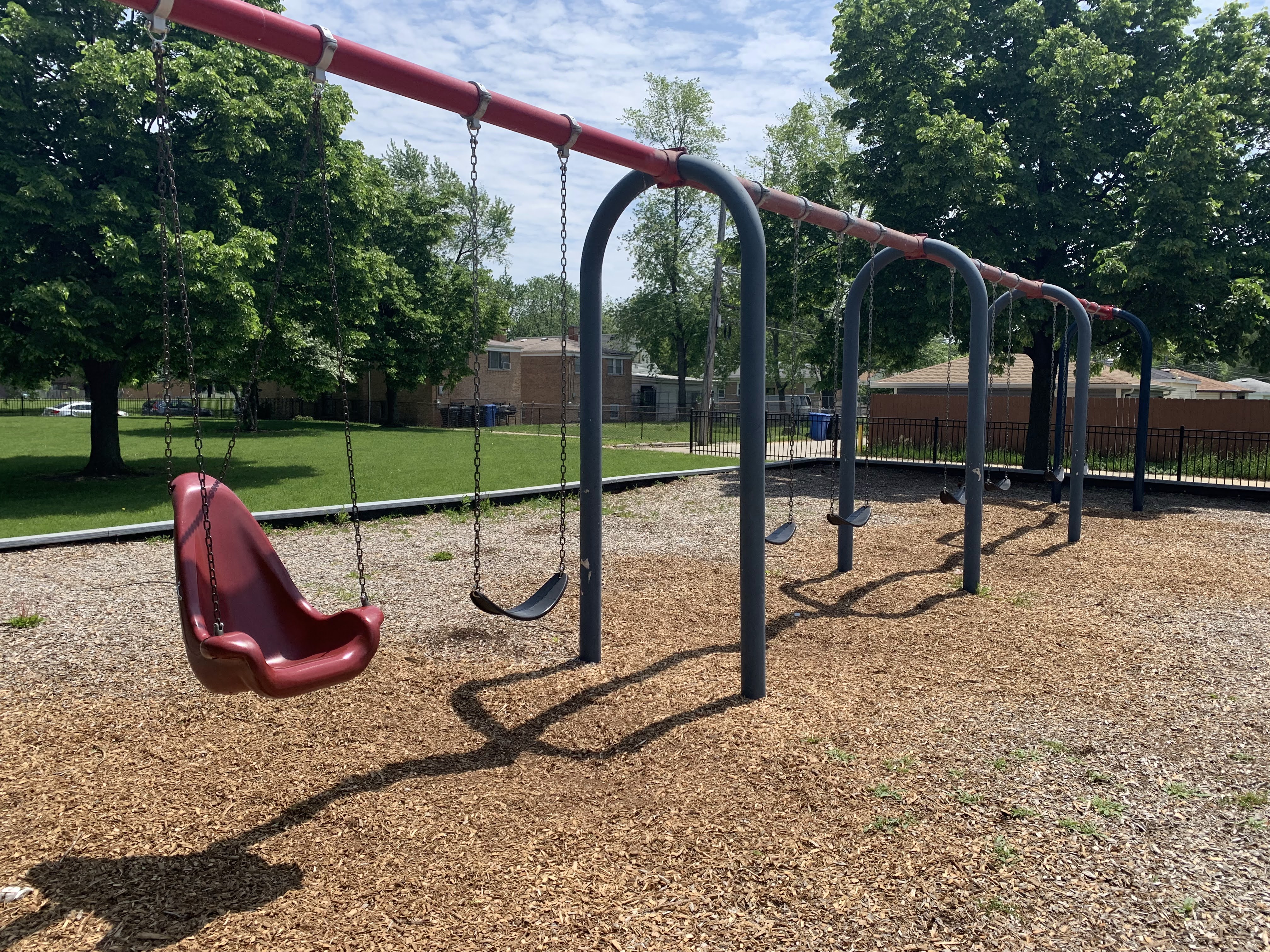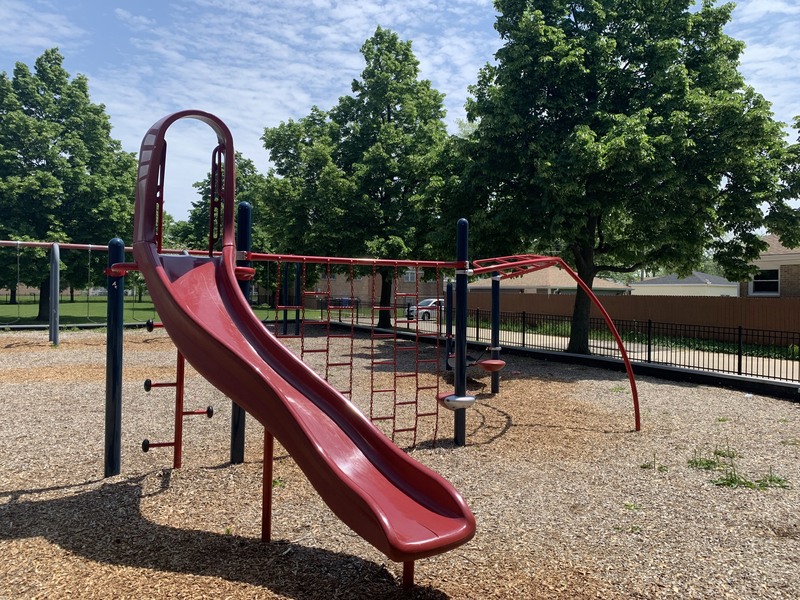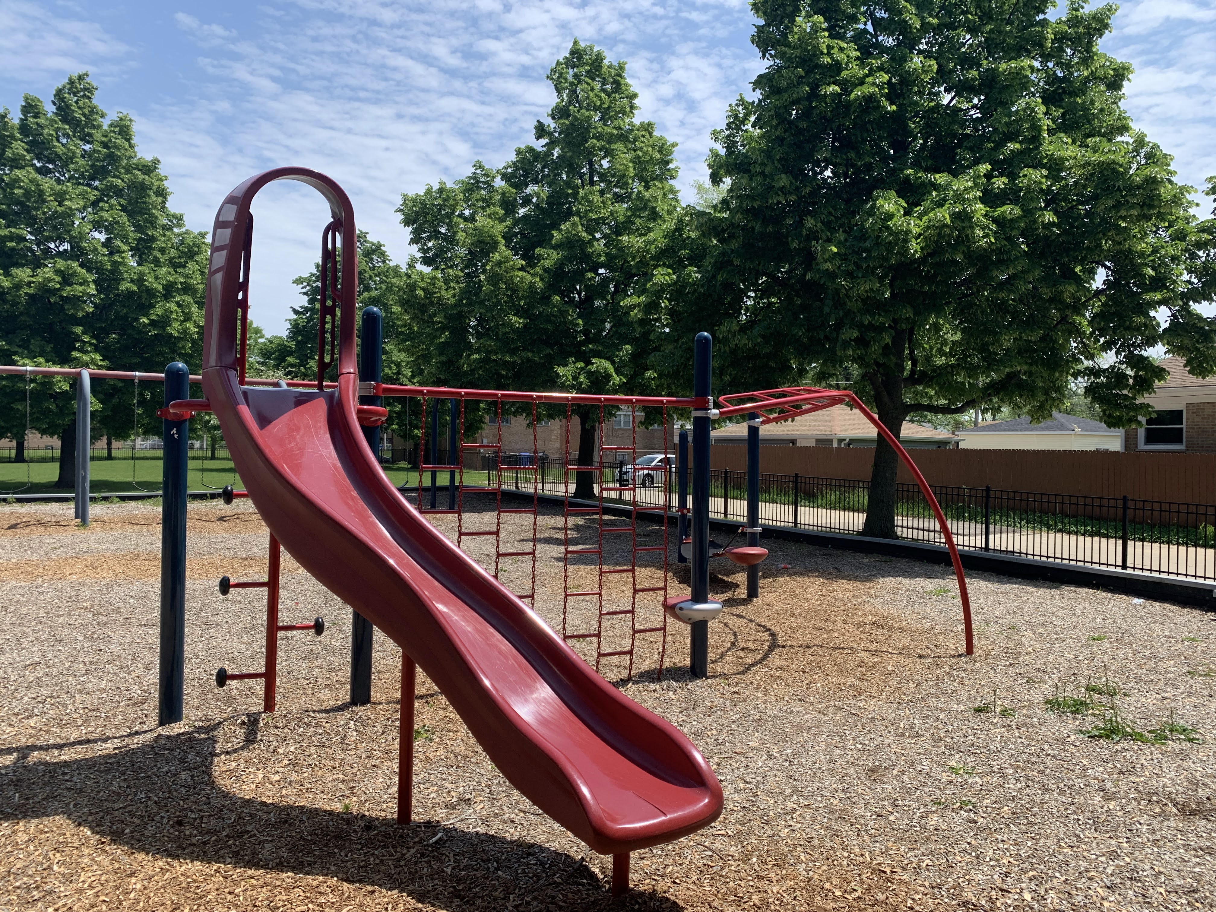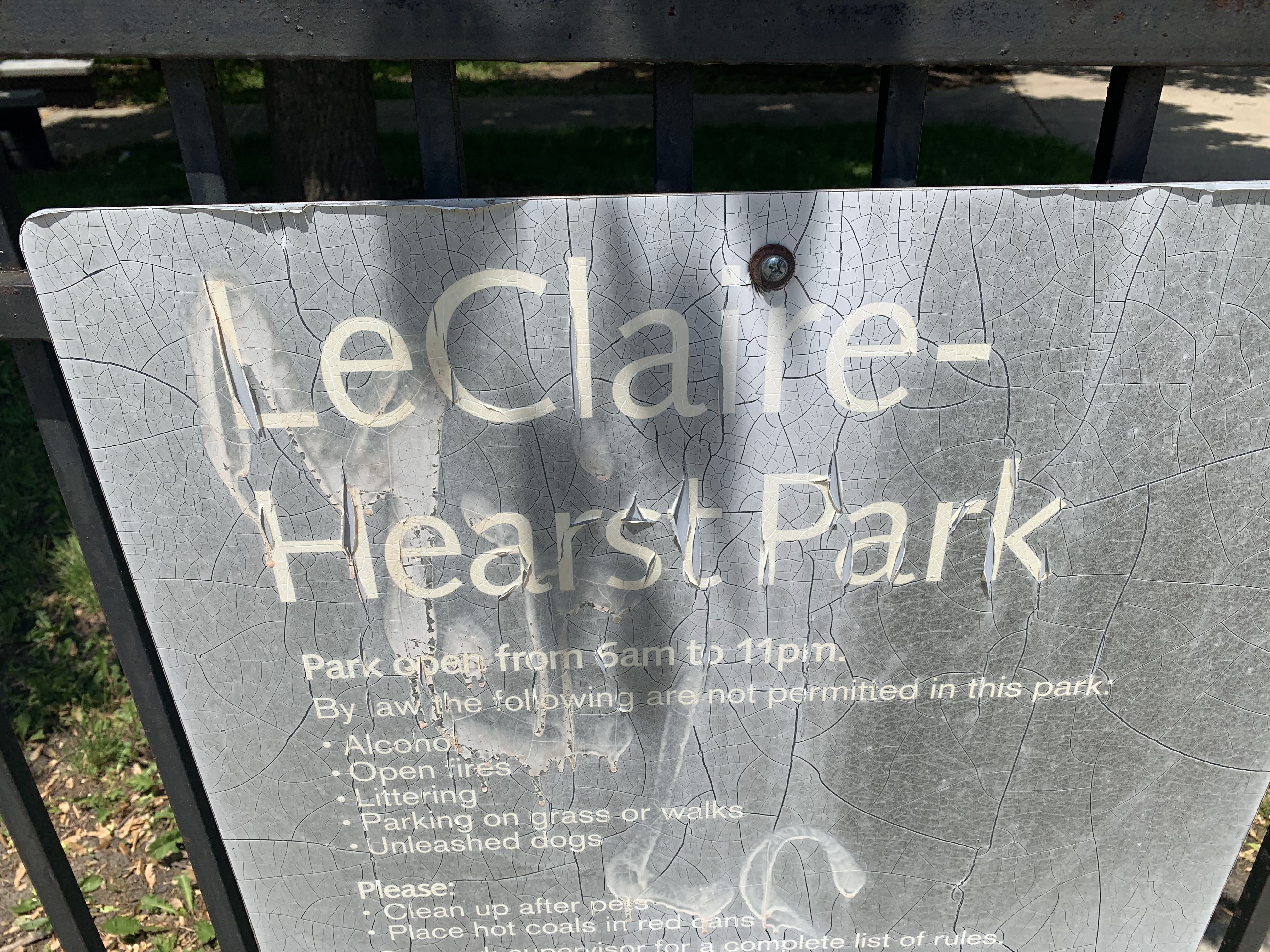 - Renovated in 2015, the playground at LeClaire-Hearst Park is divided into three separate areas: an area for younger children, an area for older children, and a small water spray area. The area for younger children features a small play structure with a slide and several climbing elements as well as toddler swings. The area for older children is more sparse and features some climbing elements and a slide as well as belt seat swings and a small zipline. The water spray feature is set in the middle and consists of a single water spraying pole. The play area is fenced from the street but is not fully enclosed. Low perimeter walls provide some informal seating but the site would be improved by adding benches and picnic tables. The play area is bright and sunny (though there are many trees and shady spots nearby) and the play surface is wood chips. The nearby fieldhouse provides access to bathrooms (when open).