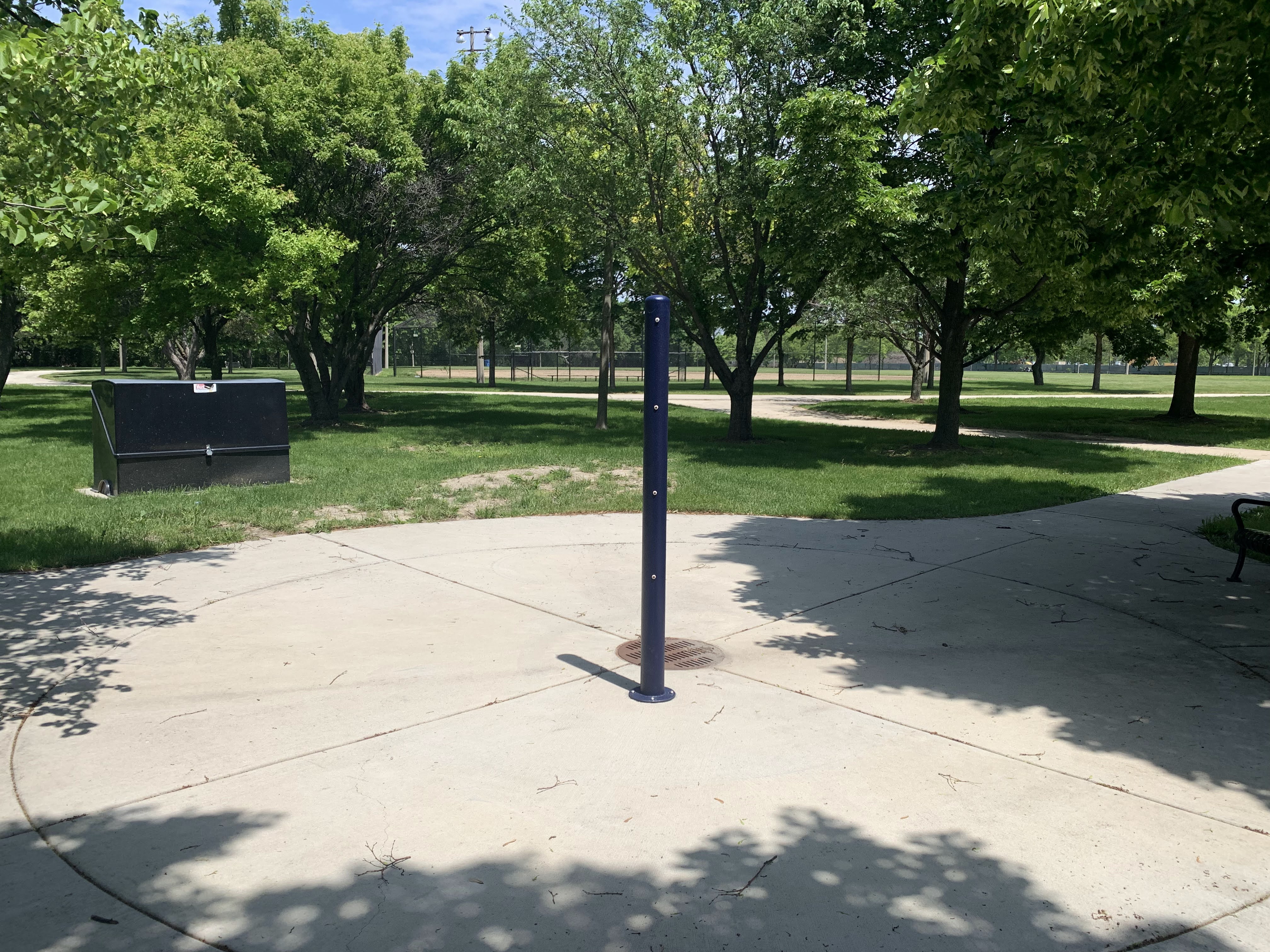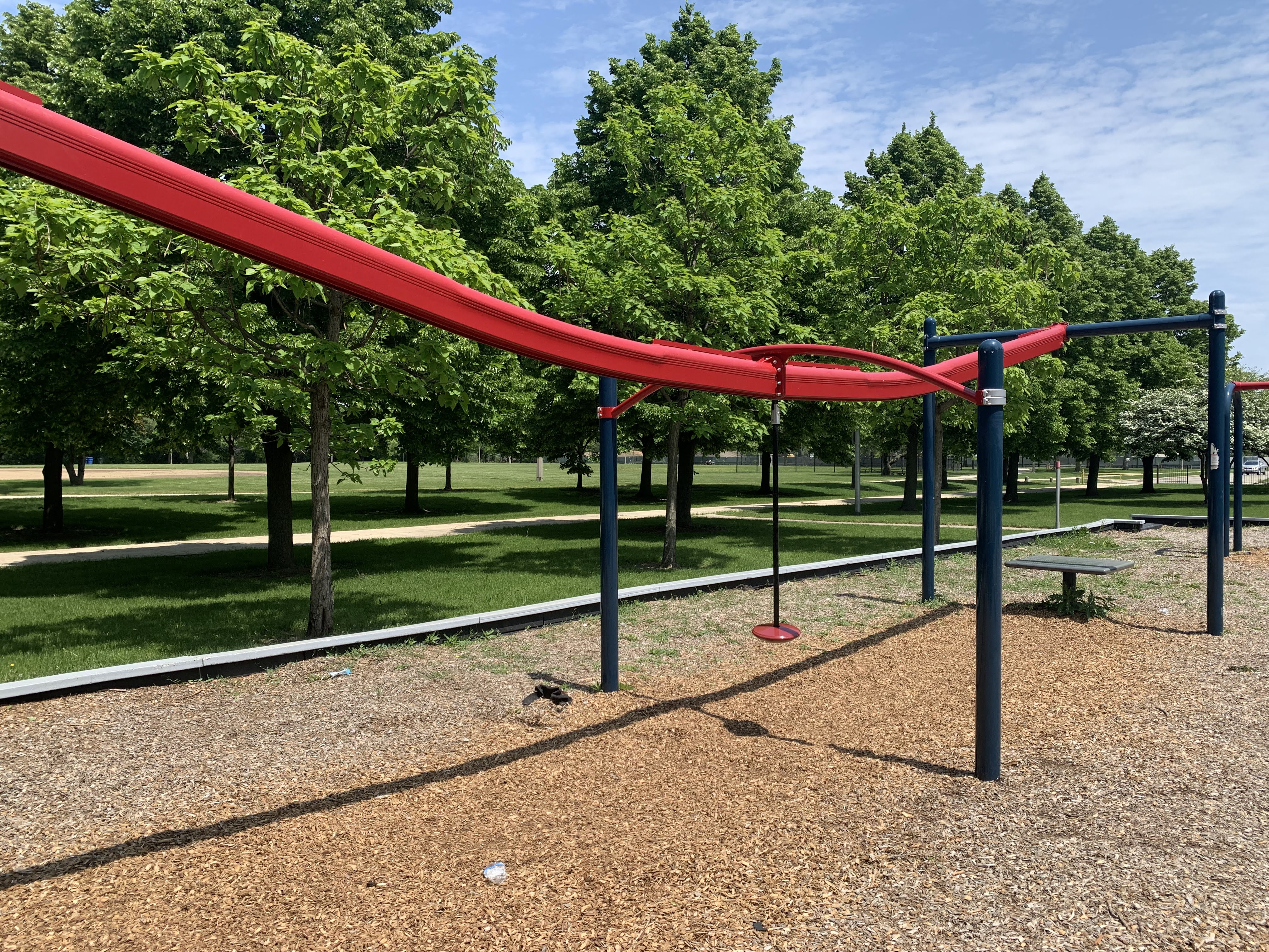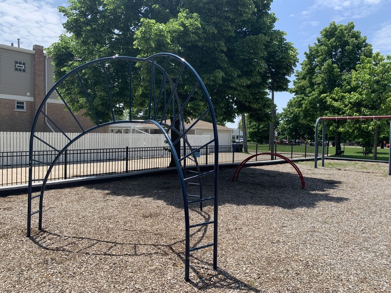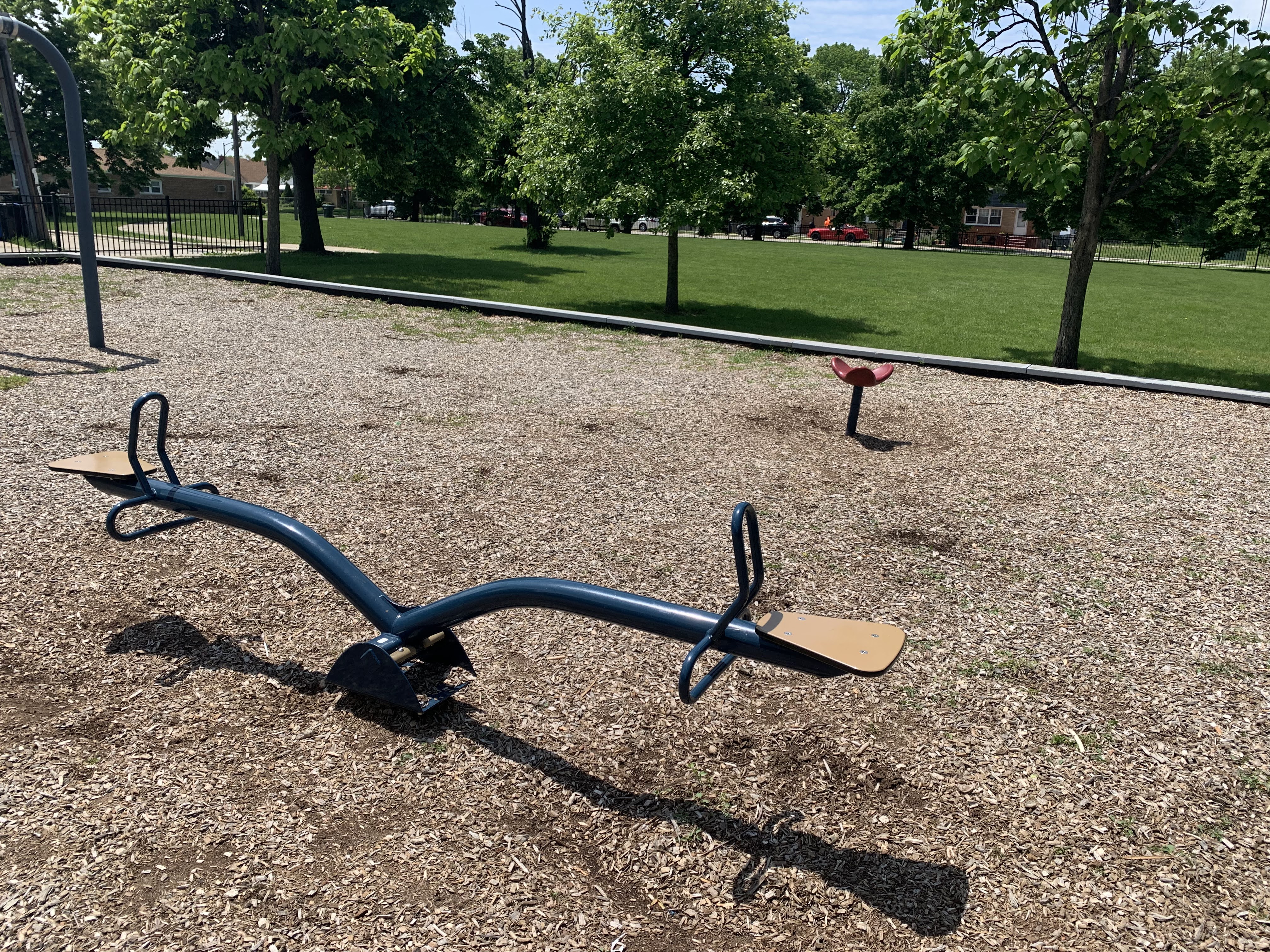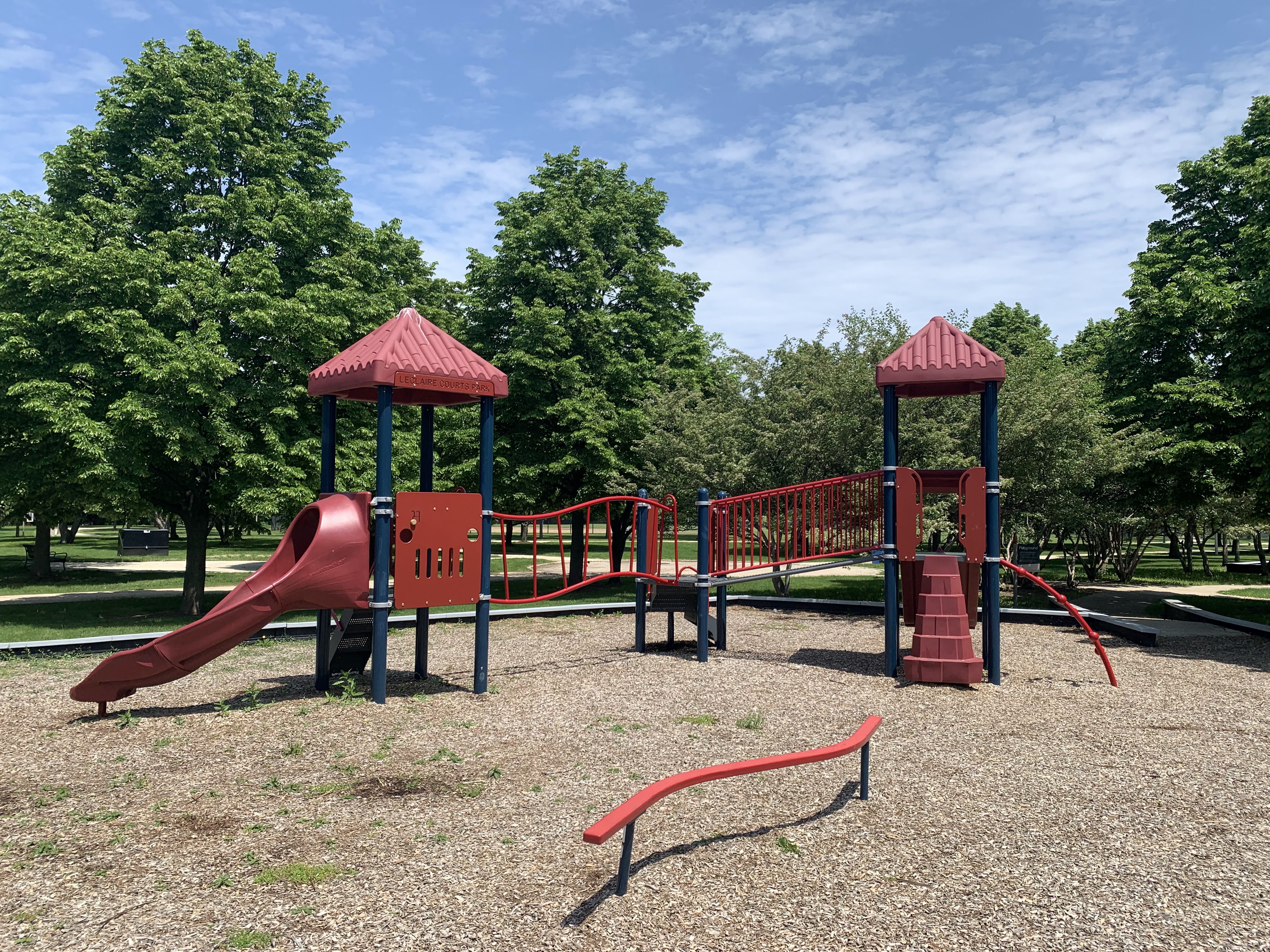 - Renovated in 2015, the playground at LeClaire-Hearst Park is divided into three separate areas: an area for younger children, an area for older children, and a small water spray area. The area for younger children features a small play structure with a slide and several climbing elements as well as toddler swings. The area for older children is more sparse and features some climbing elements and a slide as well as belt seat swings and a small zipline. The water spray feature is set in the middle and consists of a single water spraying pole. The play area is fenced from the street but is not fully enclosed. Low perimeter walls provide some informal seating but the site would be improved by adding benches and picnic tables. The play area is bright and sunny (though there are many trees and shady spots nearby) and the play surface is wood chips. The nearby fieldhouse provides access to bathrooms (when open).