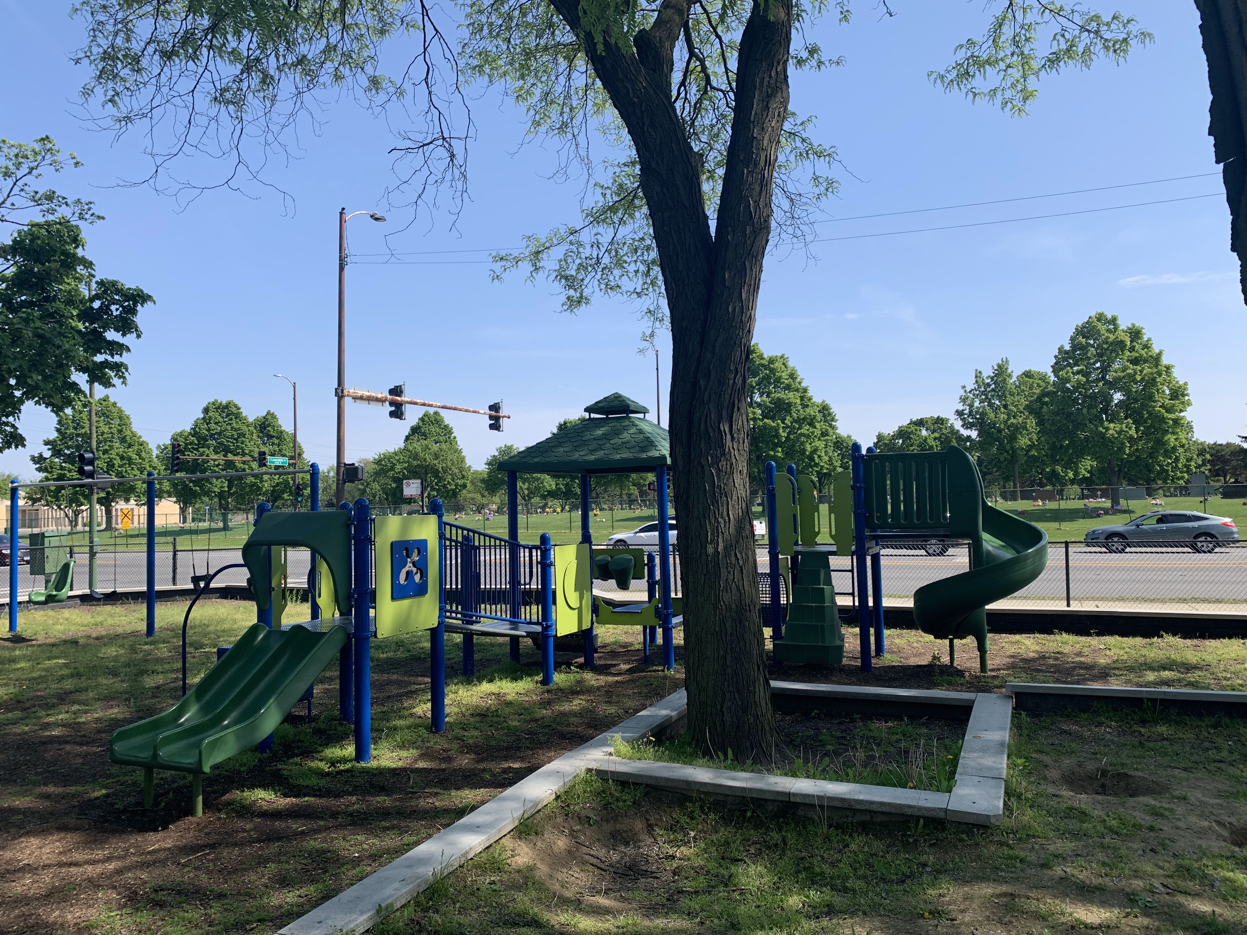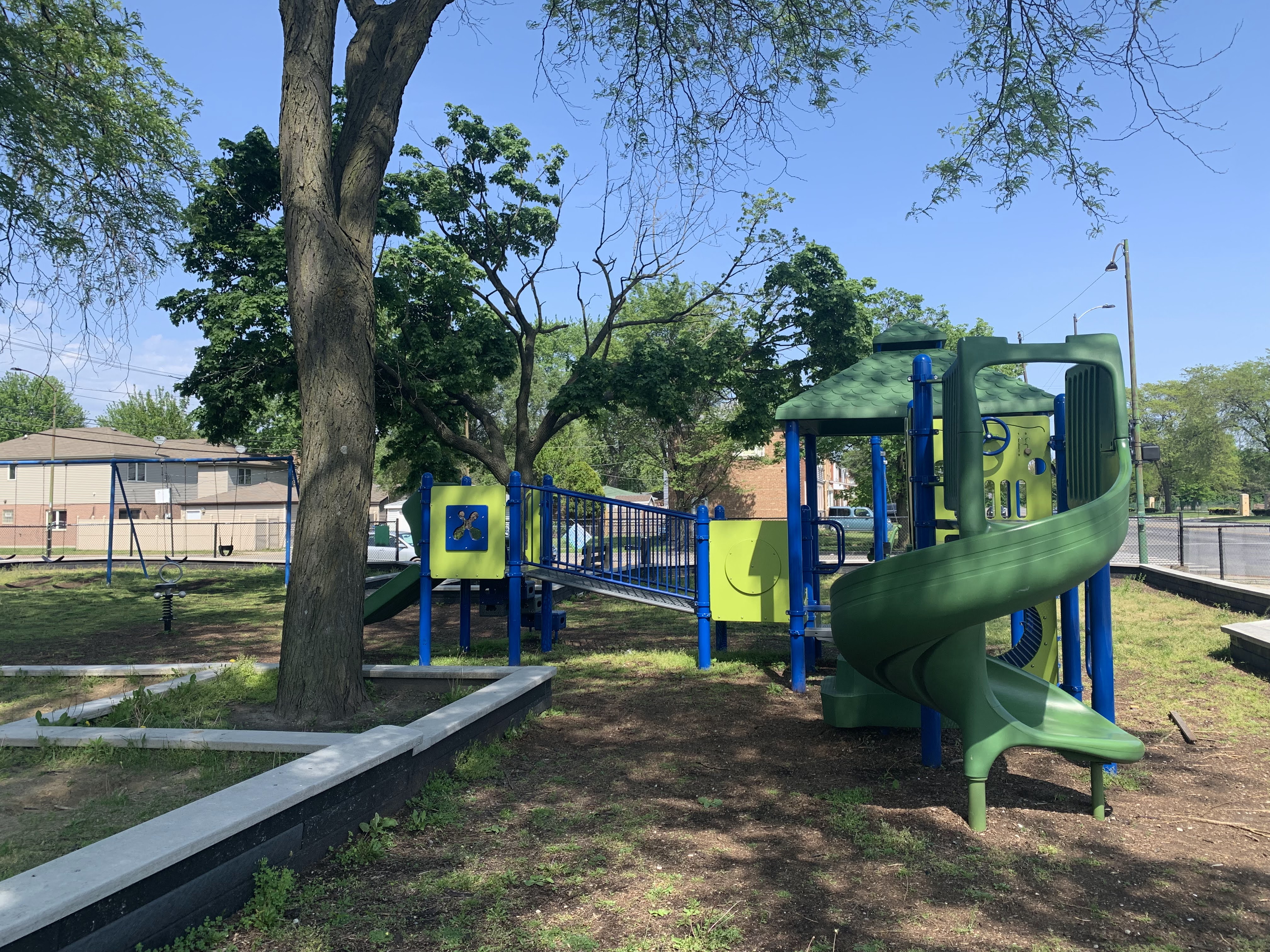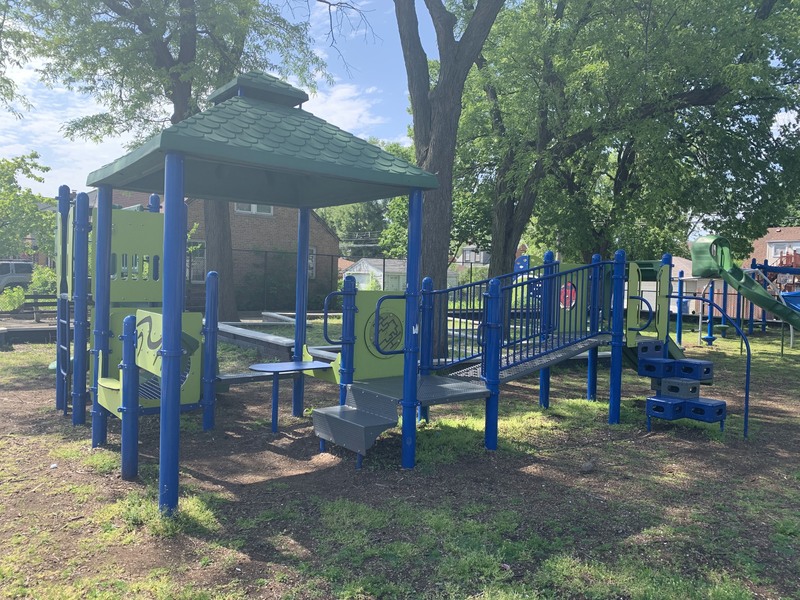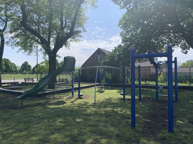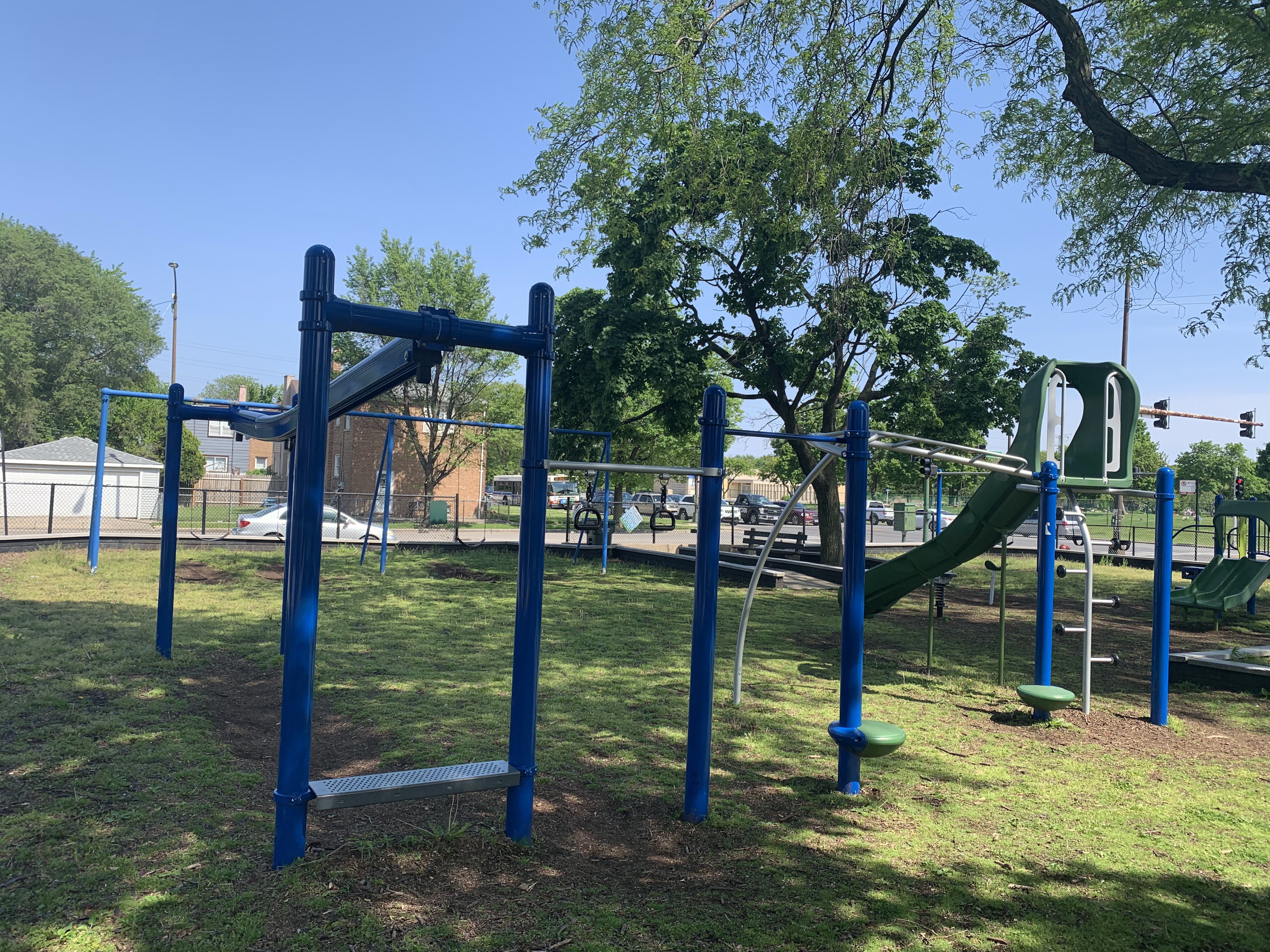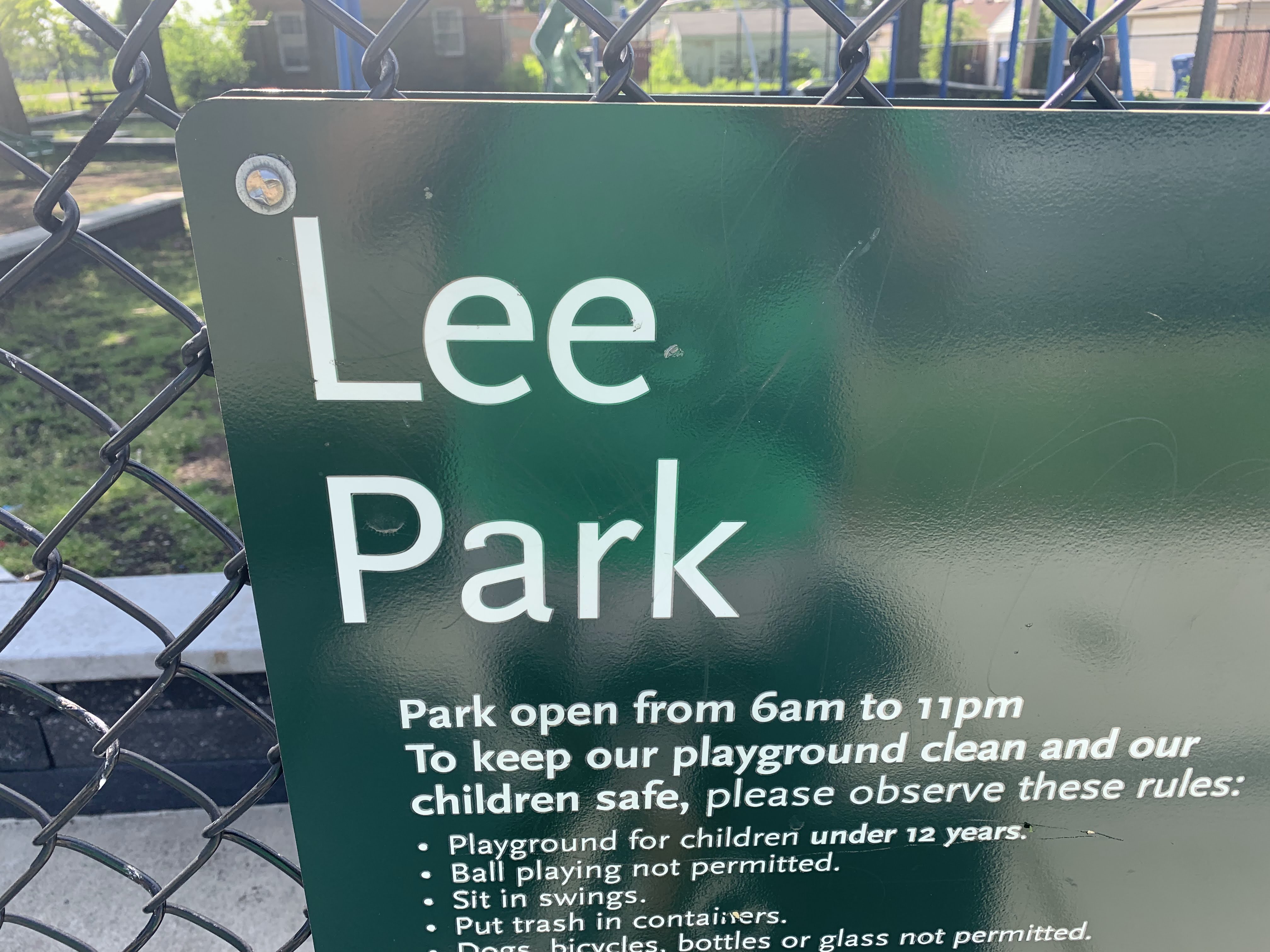 - The playground at Lee Park provides the basics - slides, swings, climbing elements, benches - in a somewhat shady site. There is a small yet sprawling play structure for younger children and a few connected elements to challenge older children. There is a overhead slider, a see-saw, and the standard set of swings. The site is heavily shaded by large trees but still somewhat exposed to a busy stretch of 87th Street. The play area is fenced from the street but not fully enclosed and the main play surface is wood chips. There are a few benches and low perimeter walls for seating and a drinking fountain.