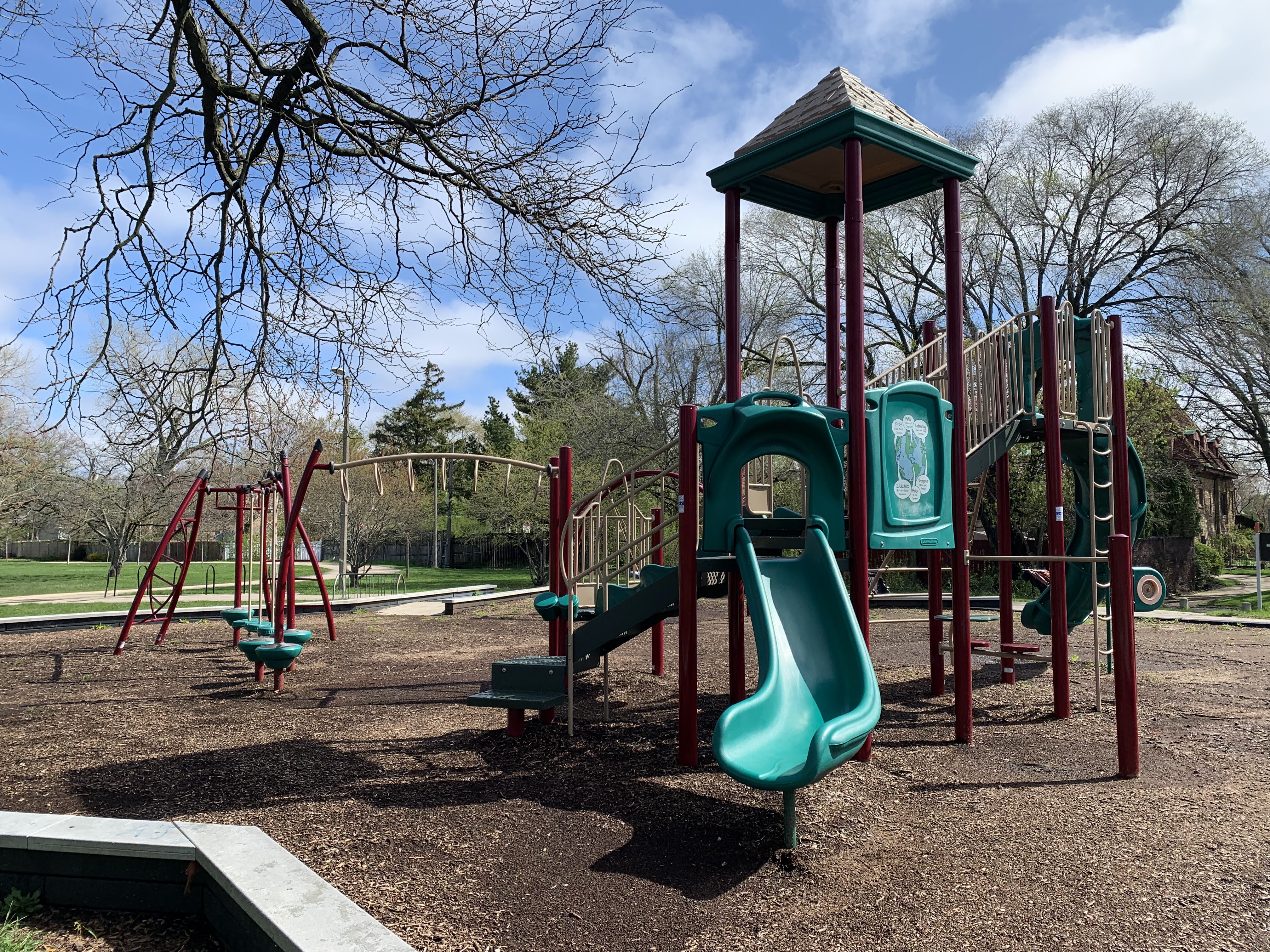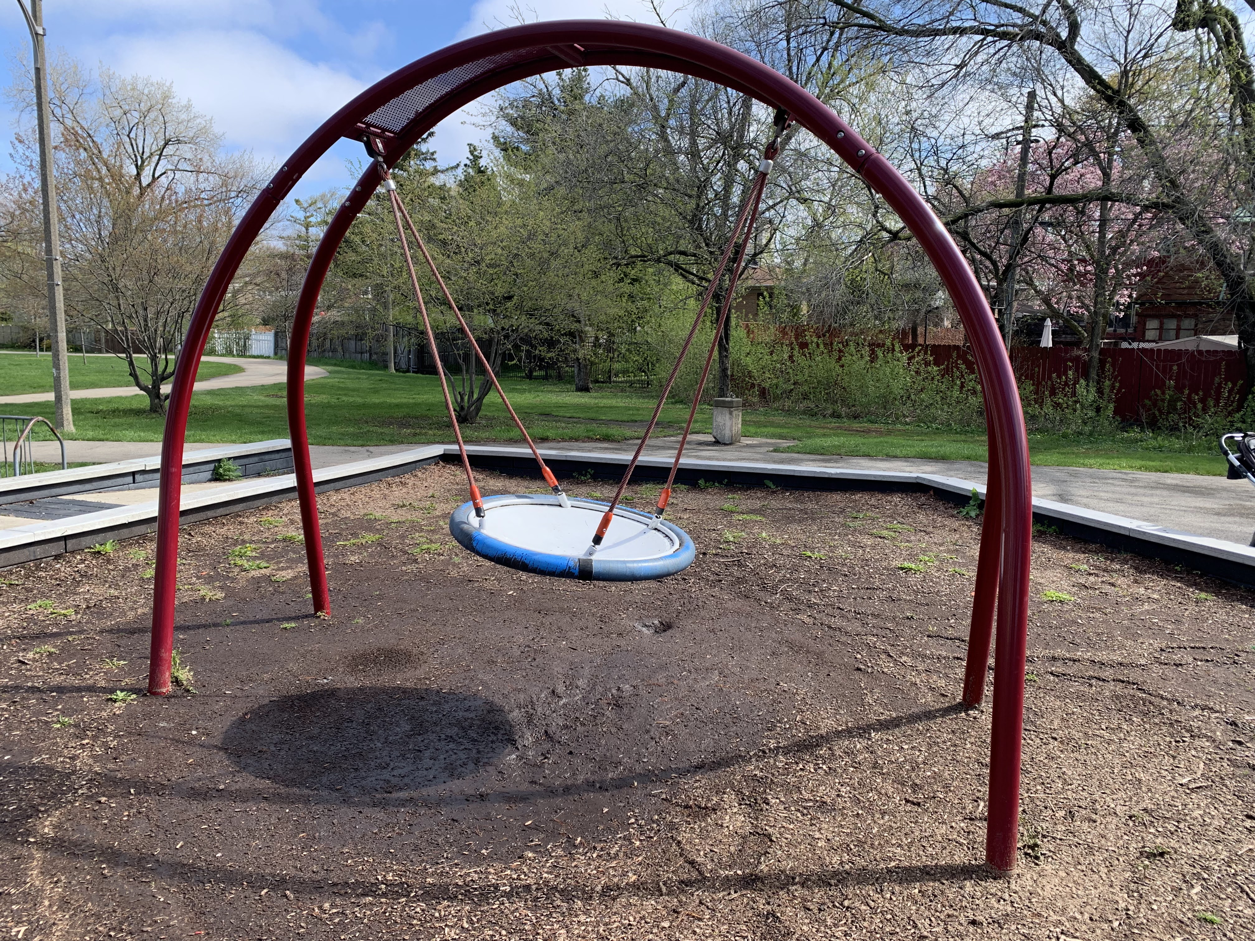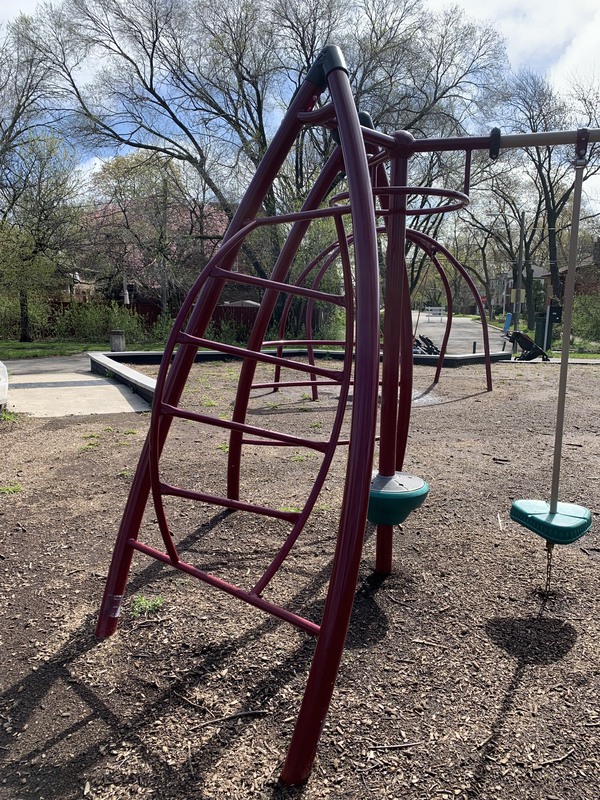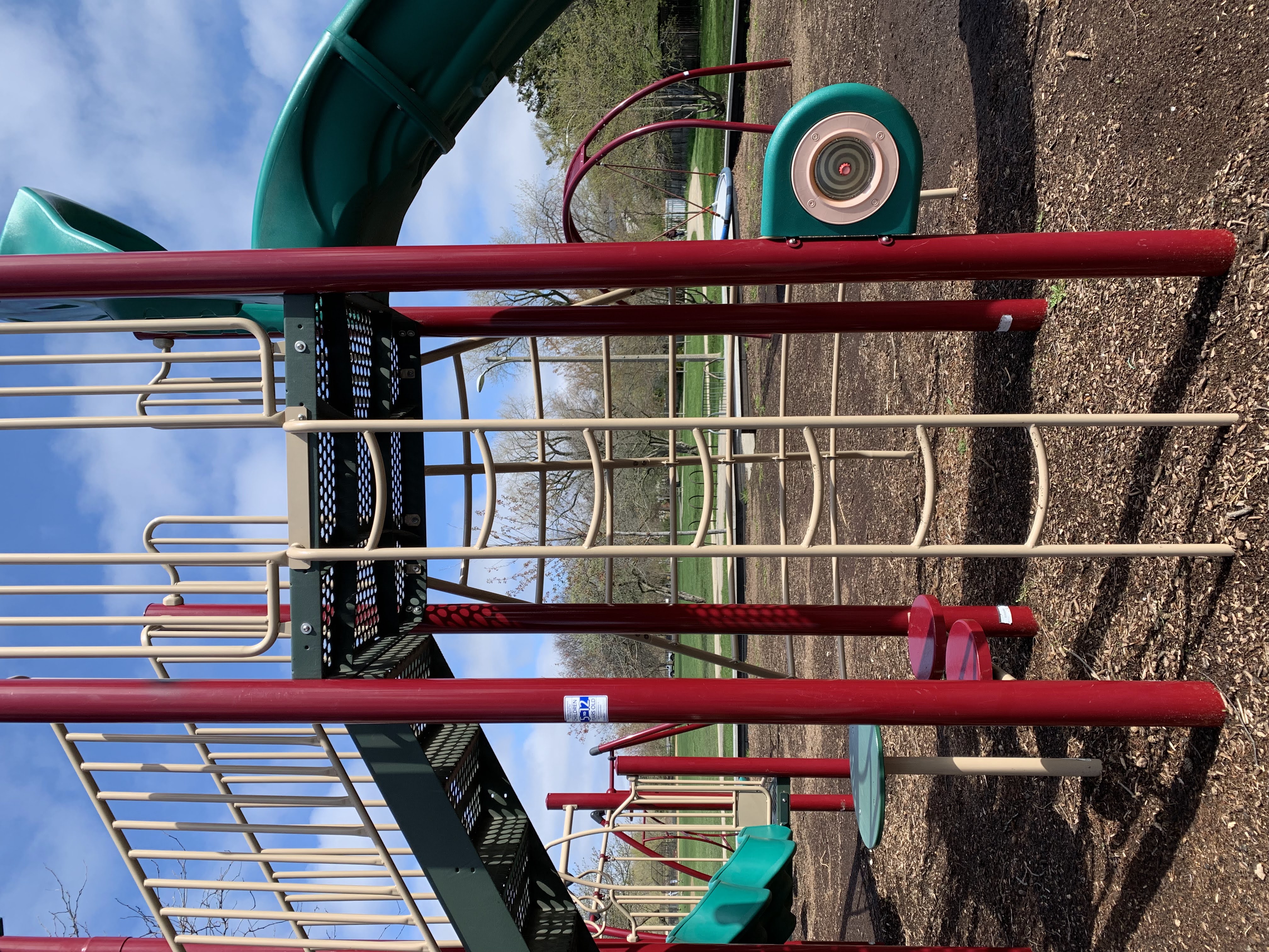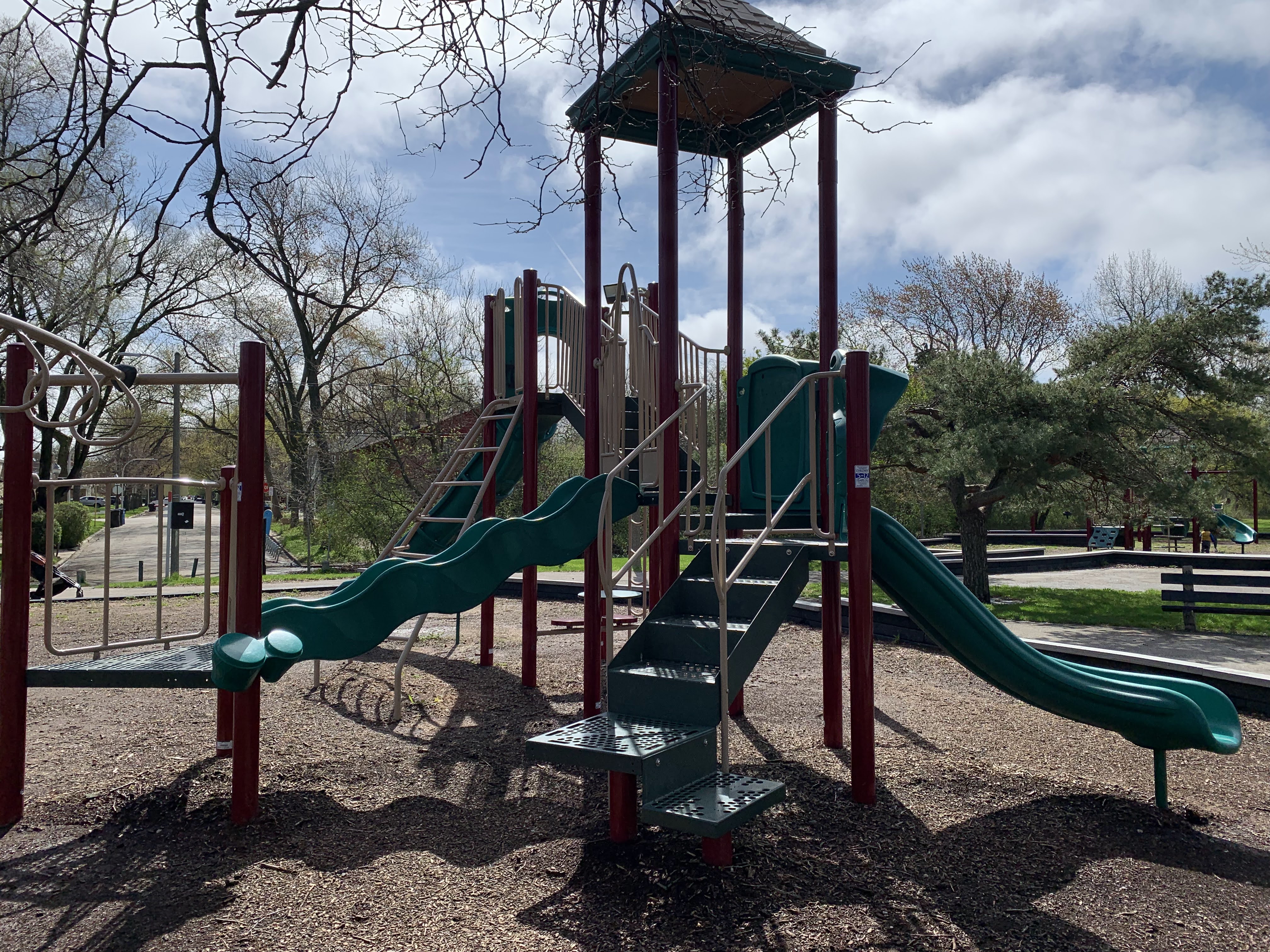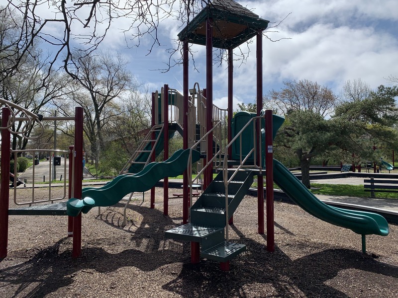 This playground - one of four in Legion Park - is the largest and features some interesting elements. There are two areas - one for younger children and one for older children - with age-appropriate equipment in each area. The area for younger children includes toddler swings, a small play structure, and a few standalone elements. The area for older children includes a much larger structure with several climbing elements and a large curved slide. There are also a few other traversing elements and some swings (belt seat and a large saucer swing) in this area.