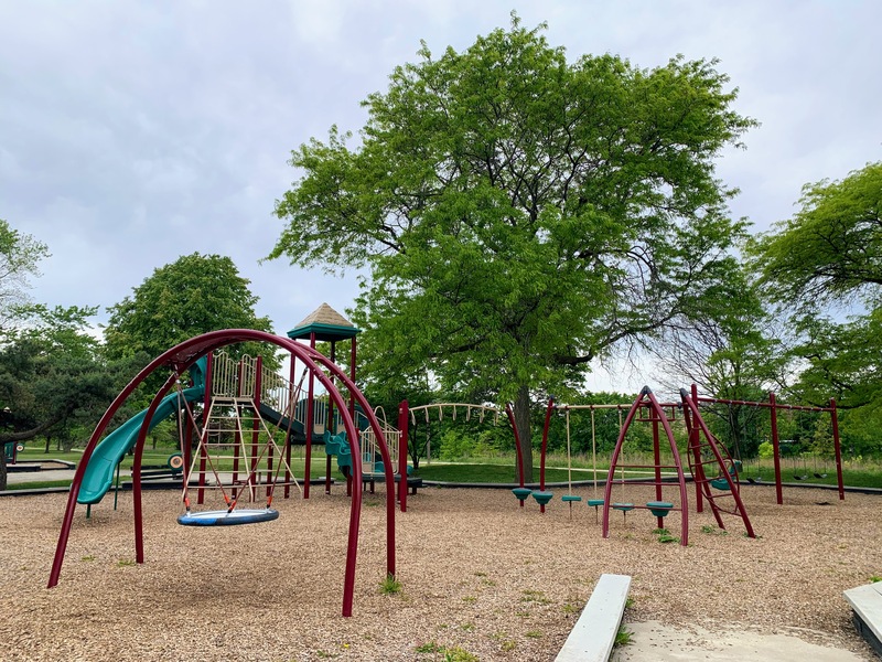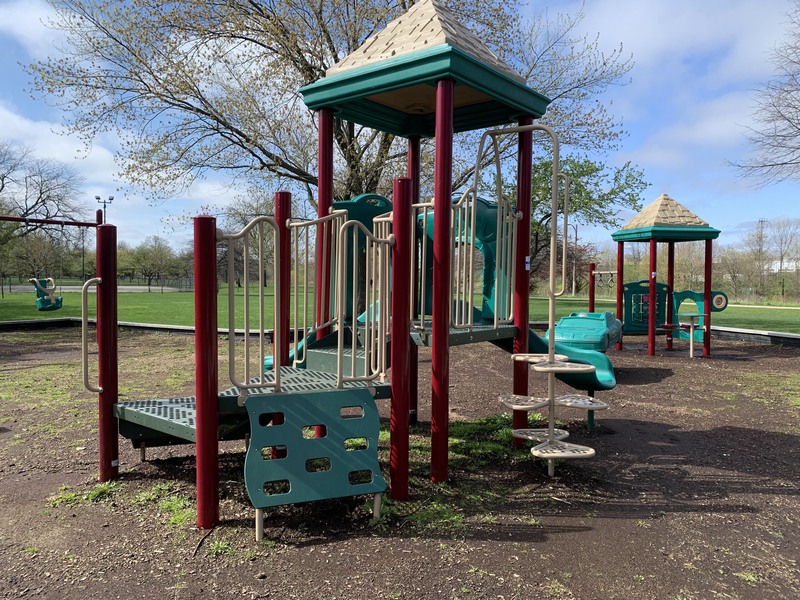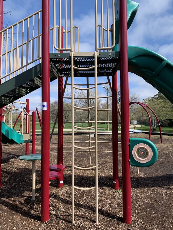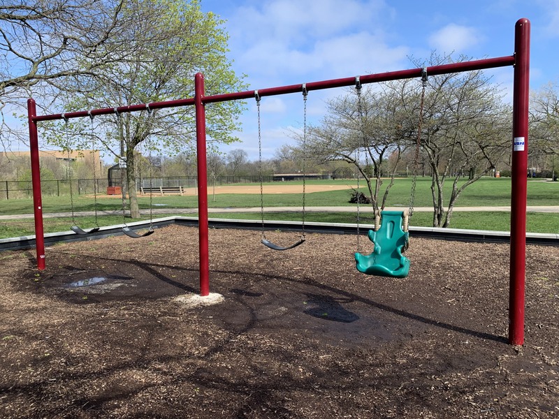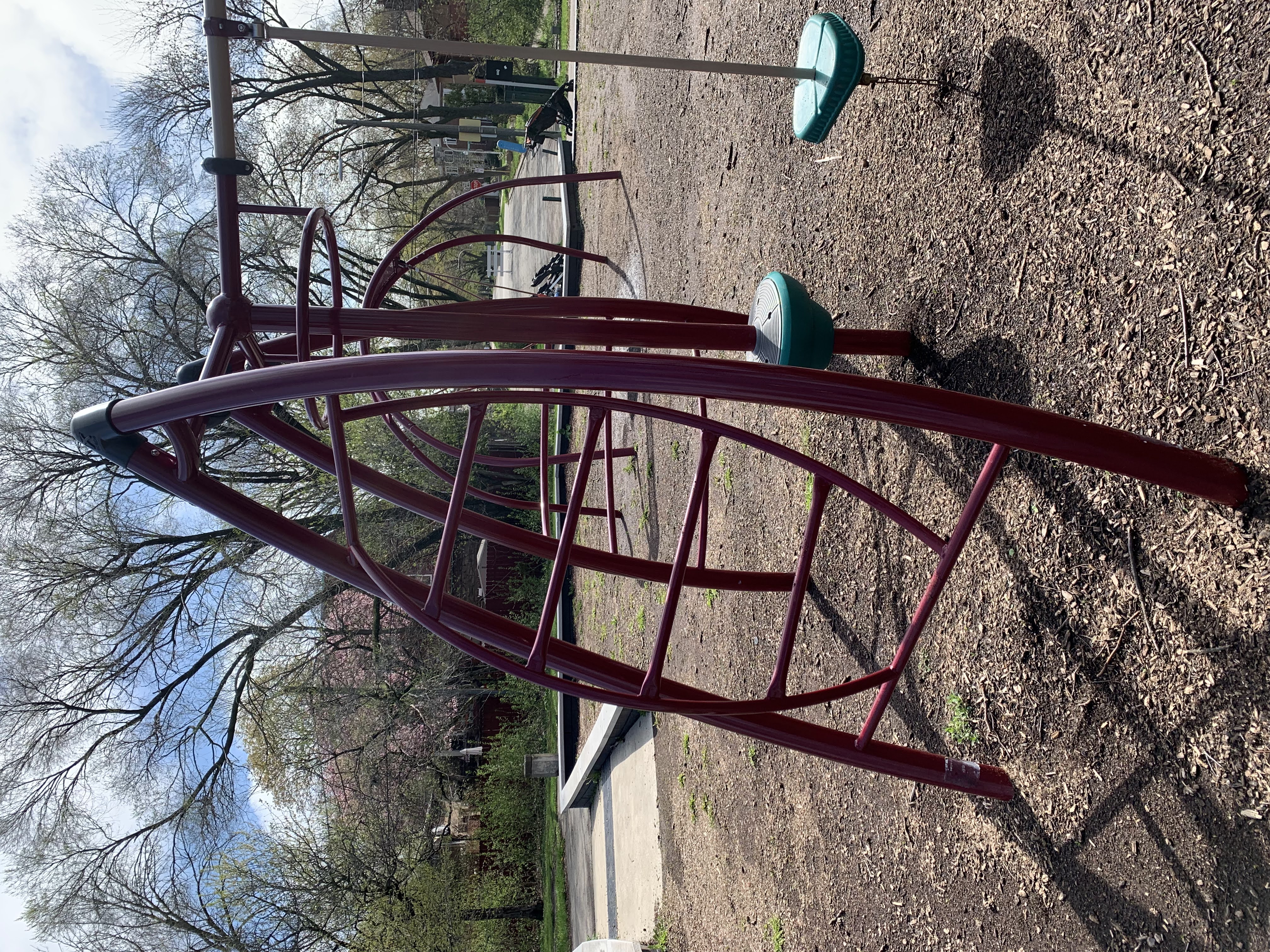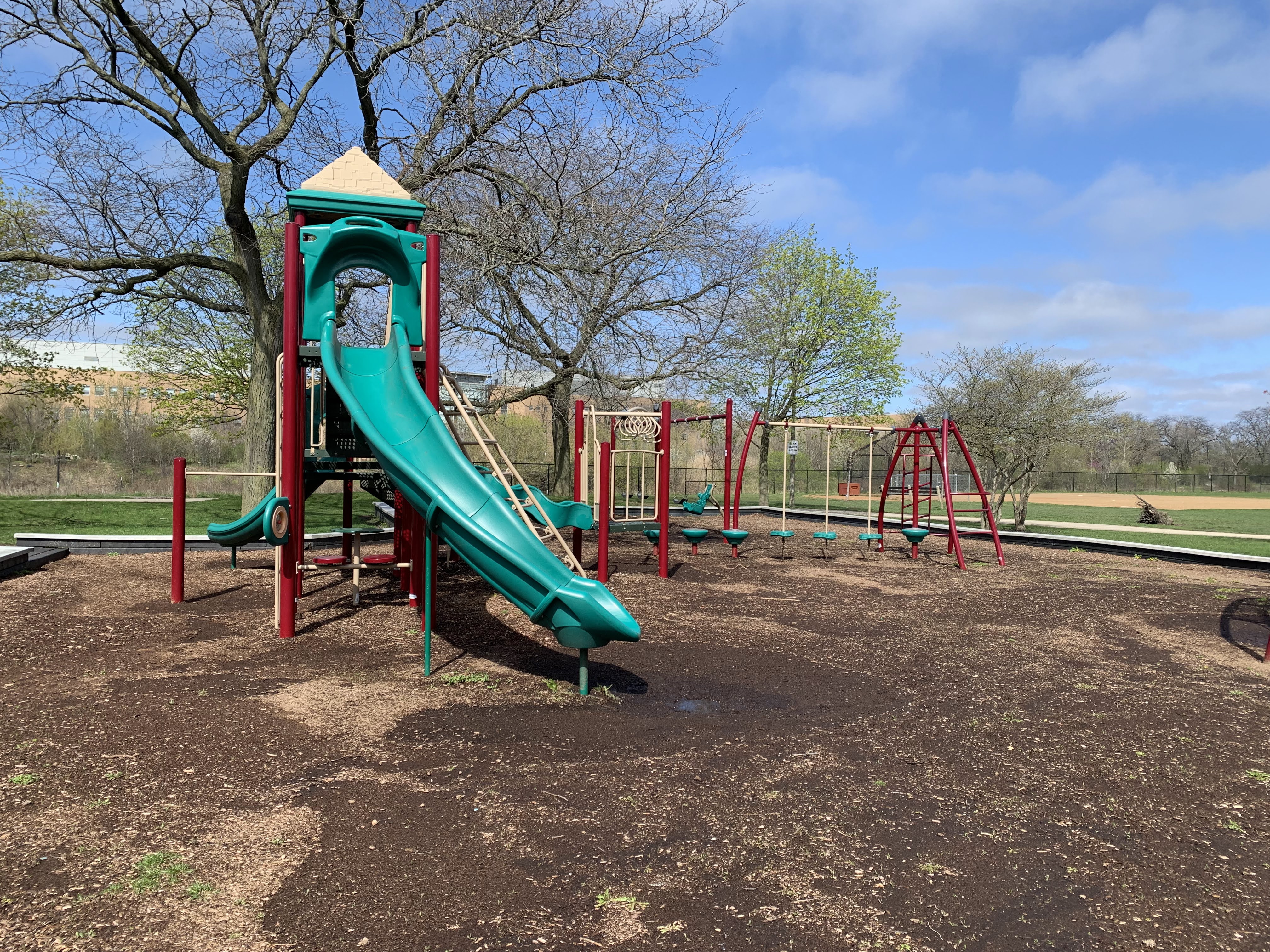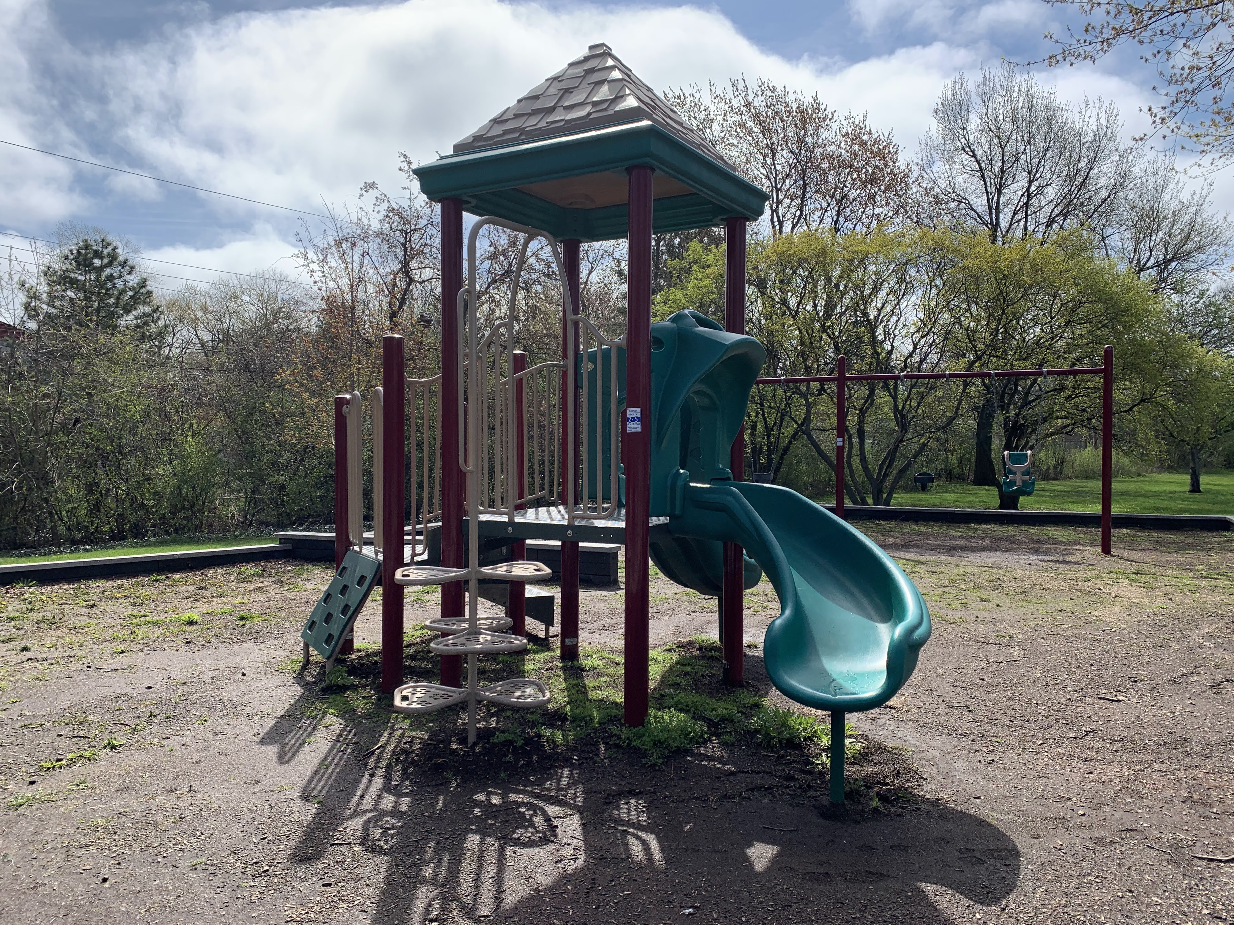 This playground - one of four in Legion Park - is the largest and features some interesting elements. There are two areas - one for younger children and one for older children - with age-appropriate equipment in each area. The area for younger children includes toddler swings, a small play structure, and a few standalone elements. The area for older children includes a much larger structure with several climbing elements and a large curved slide. There are also a few other traversing elements and some swings (belt seat and a large saucer swing) in this area.