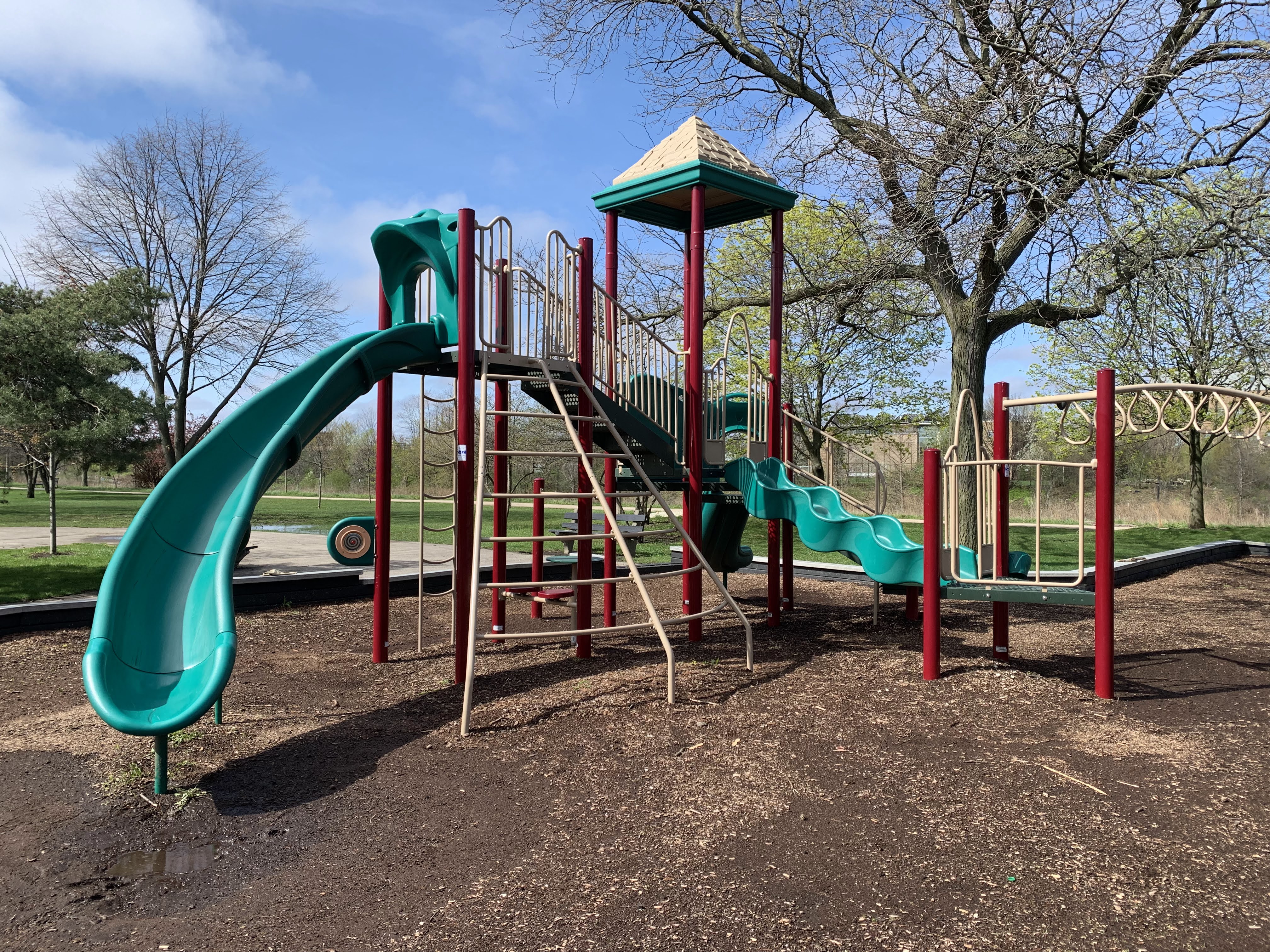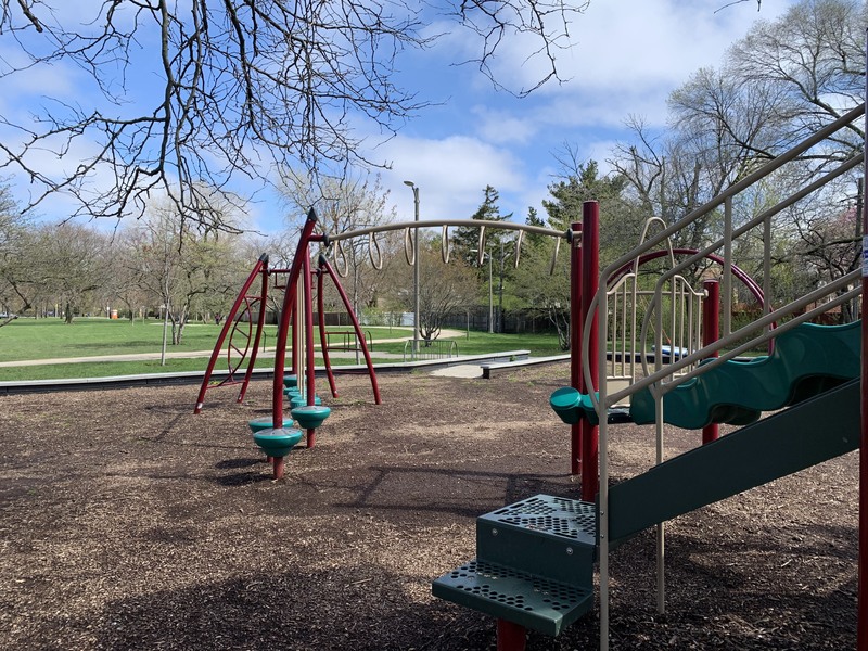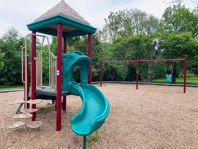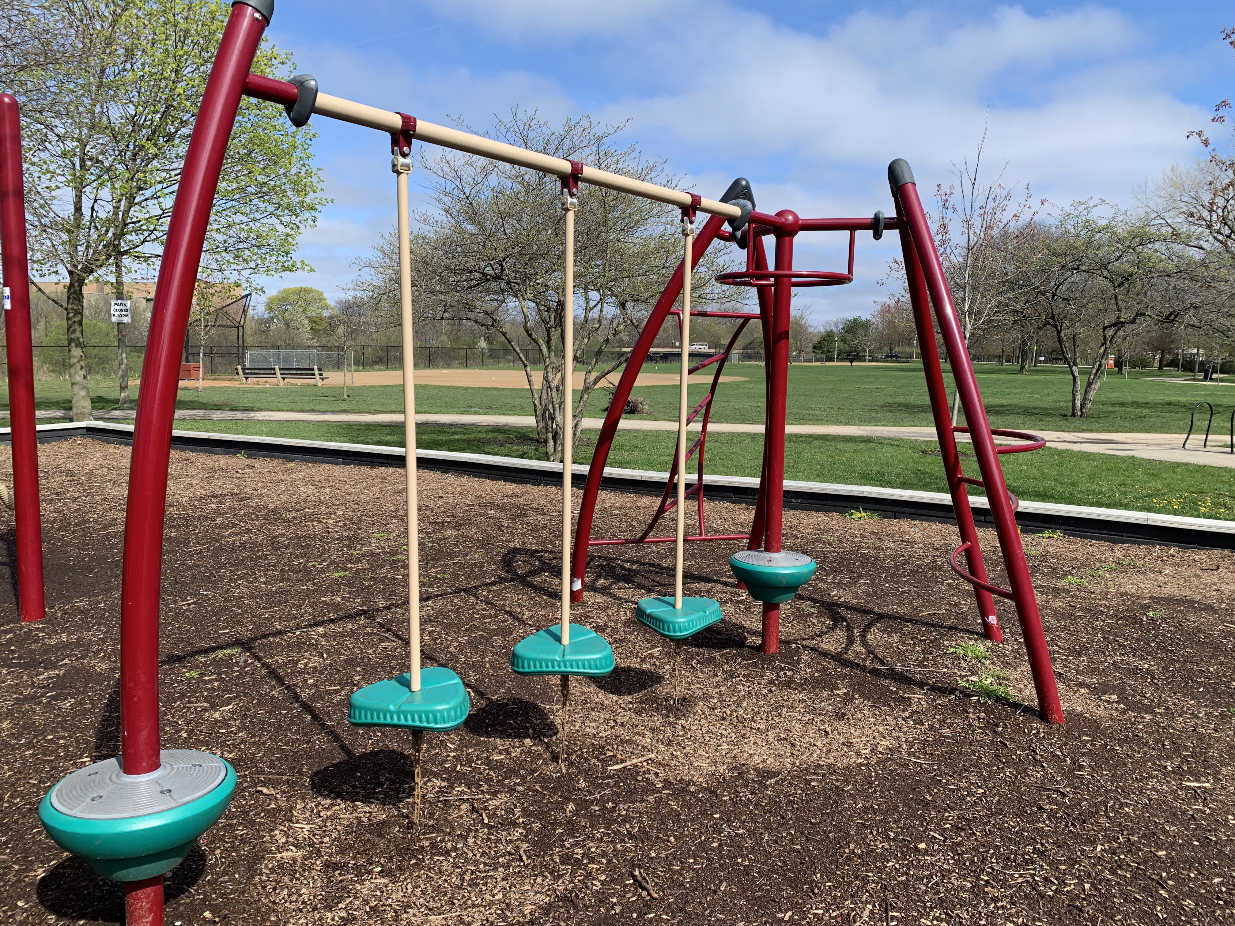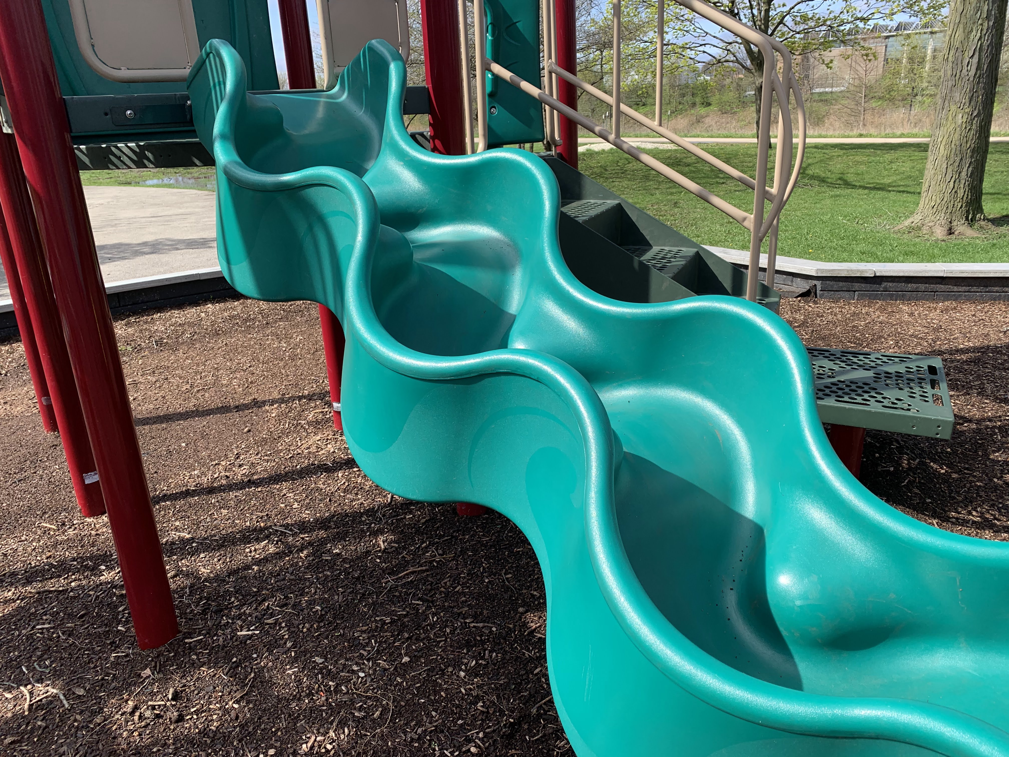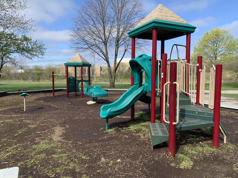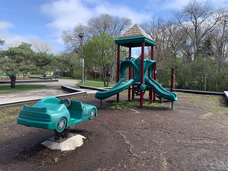 This playground - one of four in Legion Park - is the largest and features some interesting elements. There are two areas - one for younger children and one for older children - with age-appropriate equipment in each area. The area for younger children includes toddler swings, a small play structure, and a few standalone elements. The area for older children includes a much larger structure with several climbing elements and a large curved slide. There are also a few other traversing elements and some swings (belt seat and a large saucer swing) in this area.