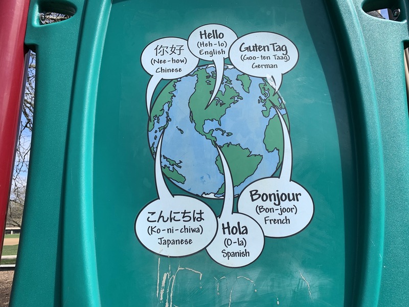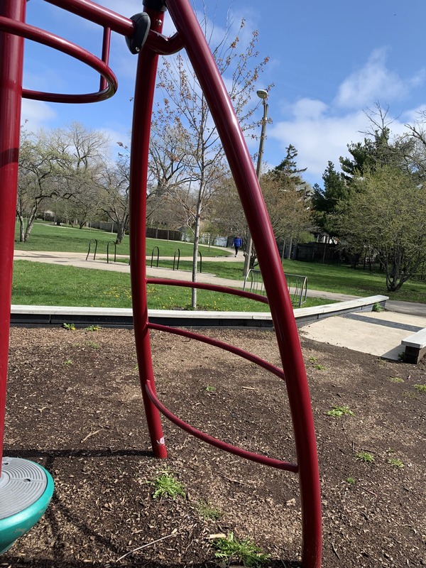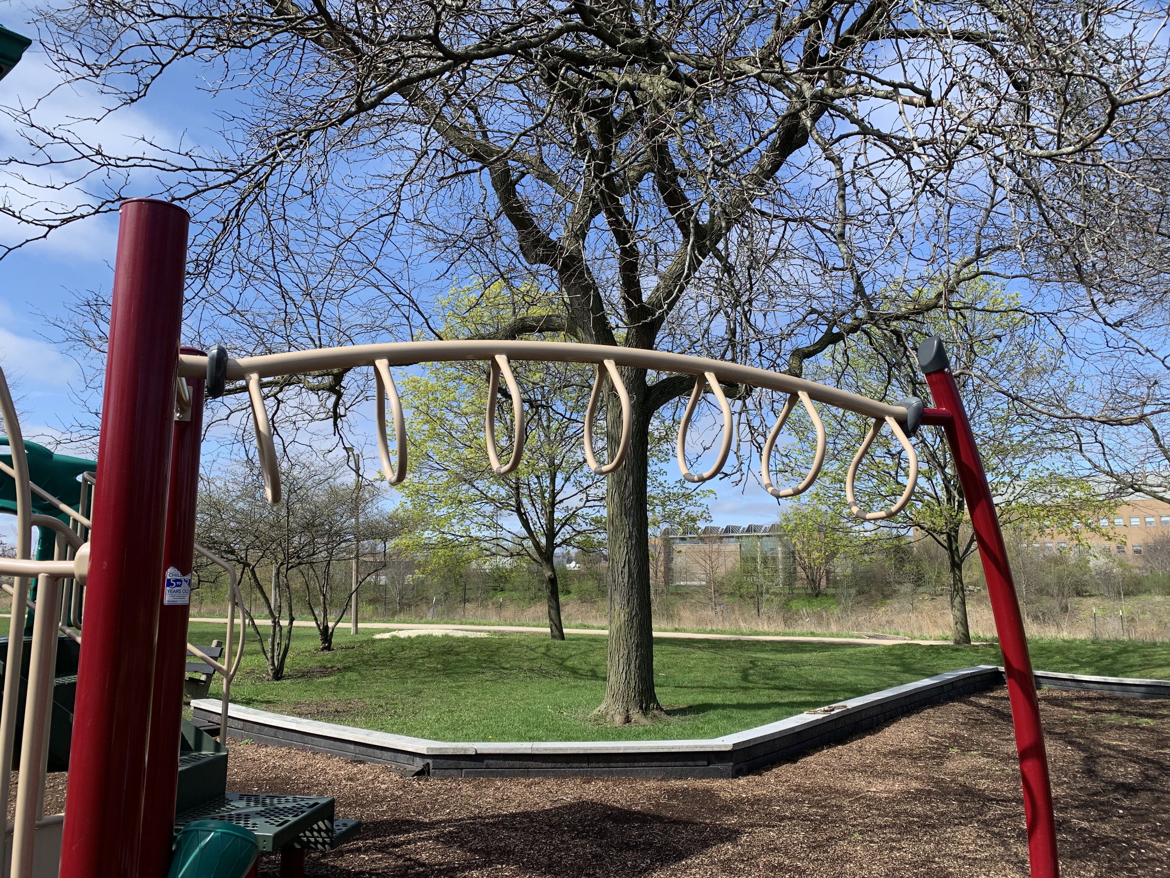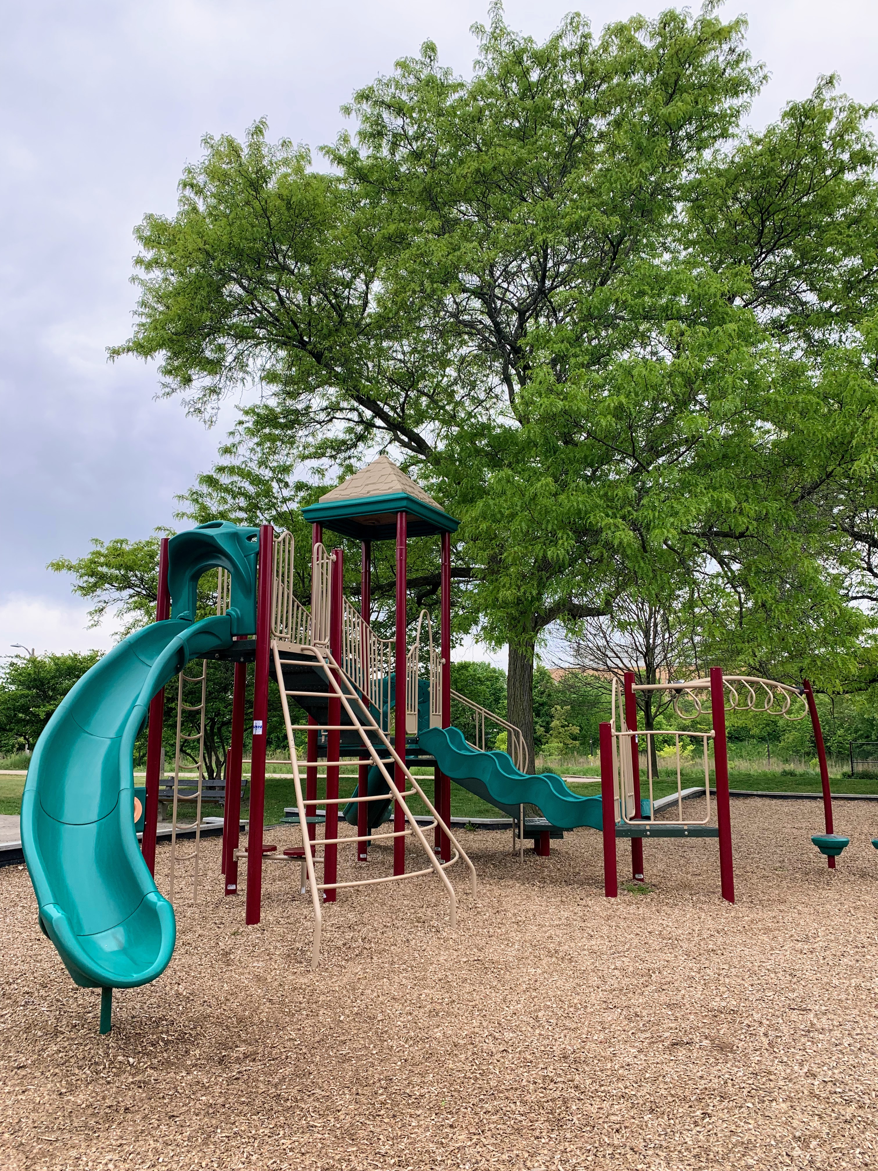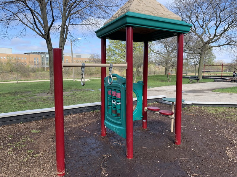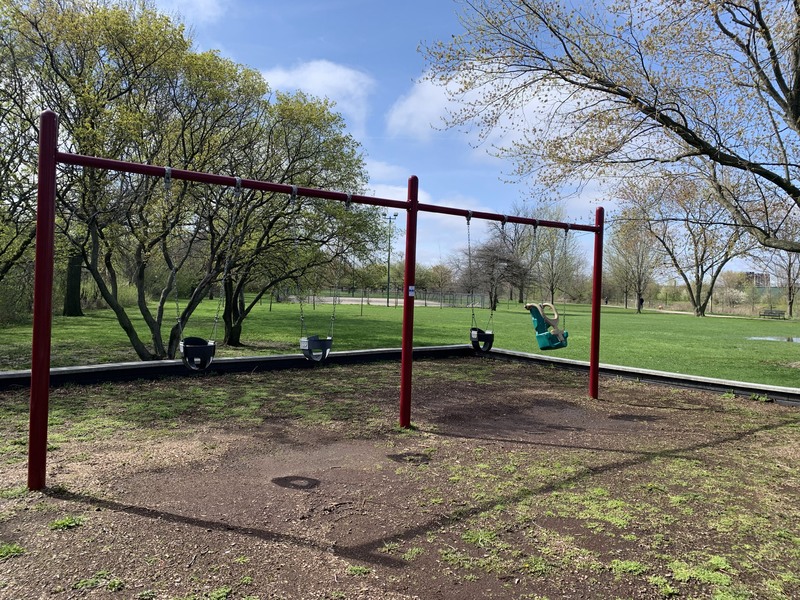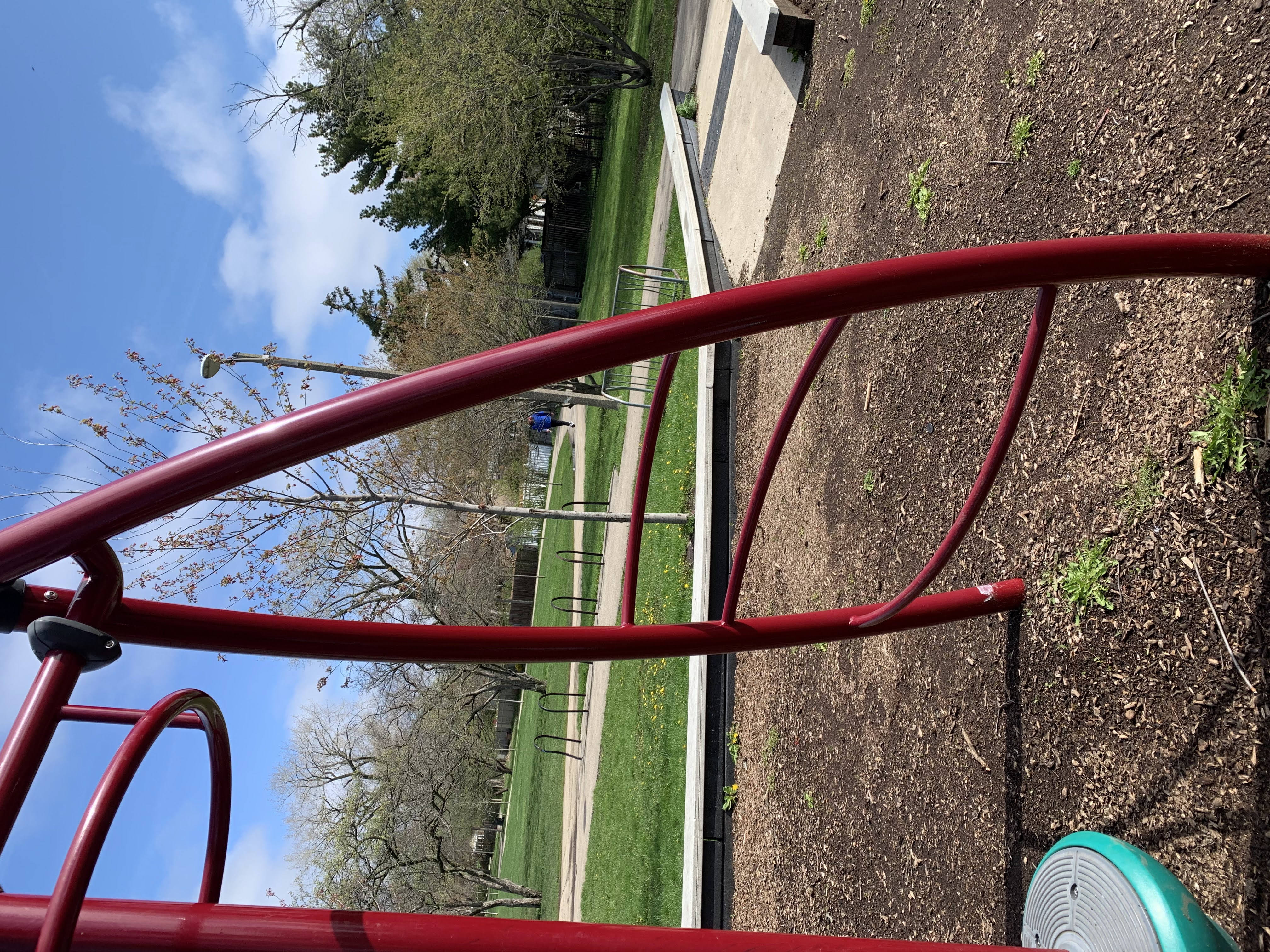 This playground - one of four in Legion Park - is the largest and features some interesting elements. There are two areas - one for younger children and one for older children - with age-appropriate equipment in each area. The area for younger children includes toddler swings, a small play structure, and a few standalone elements. The area for older children includes a much larger structure with several climbing elements and a large curved slide. There are also a few other traversing elements and some swings (belt seat and a large saucer swing) in this area.