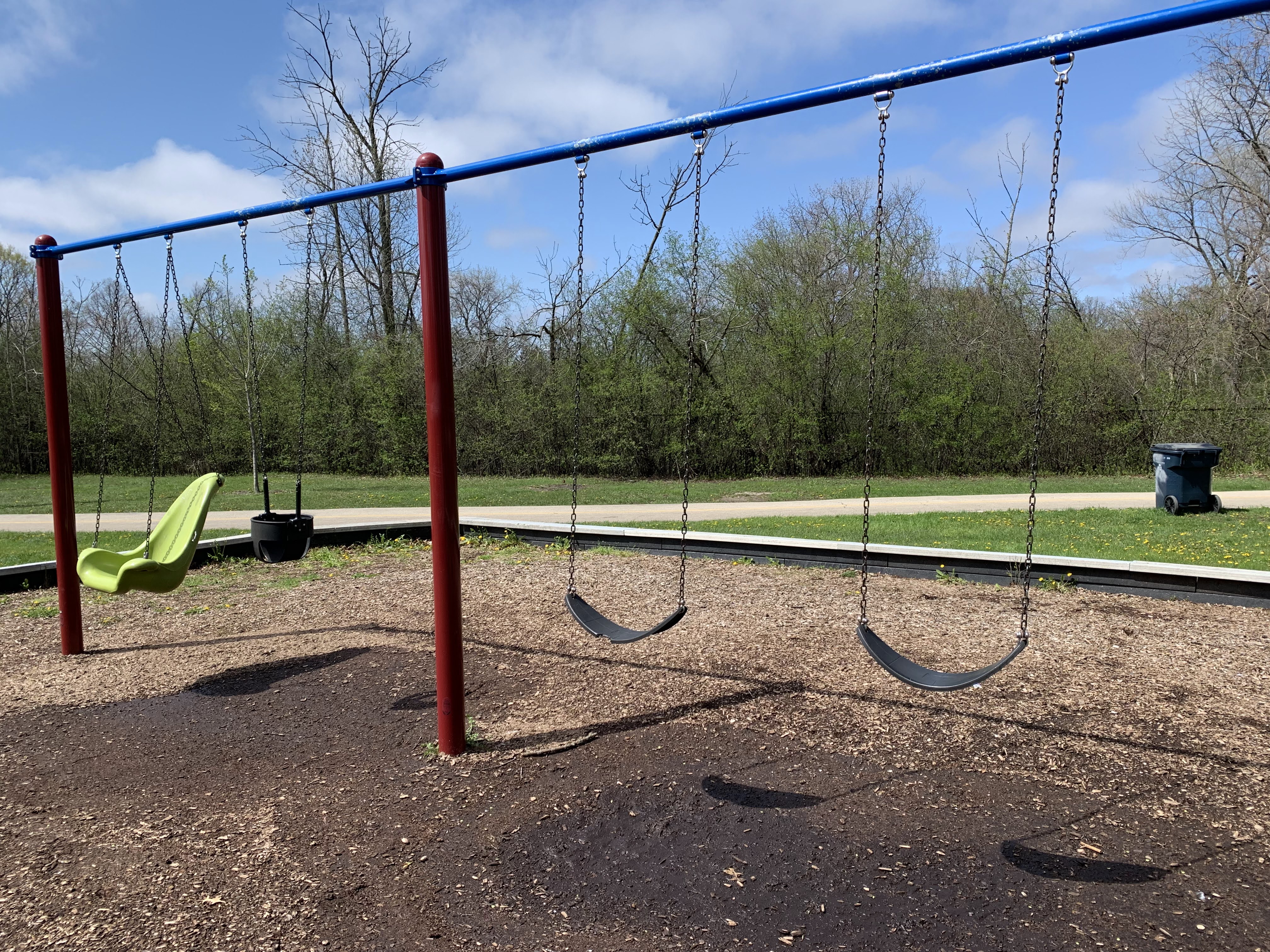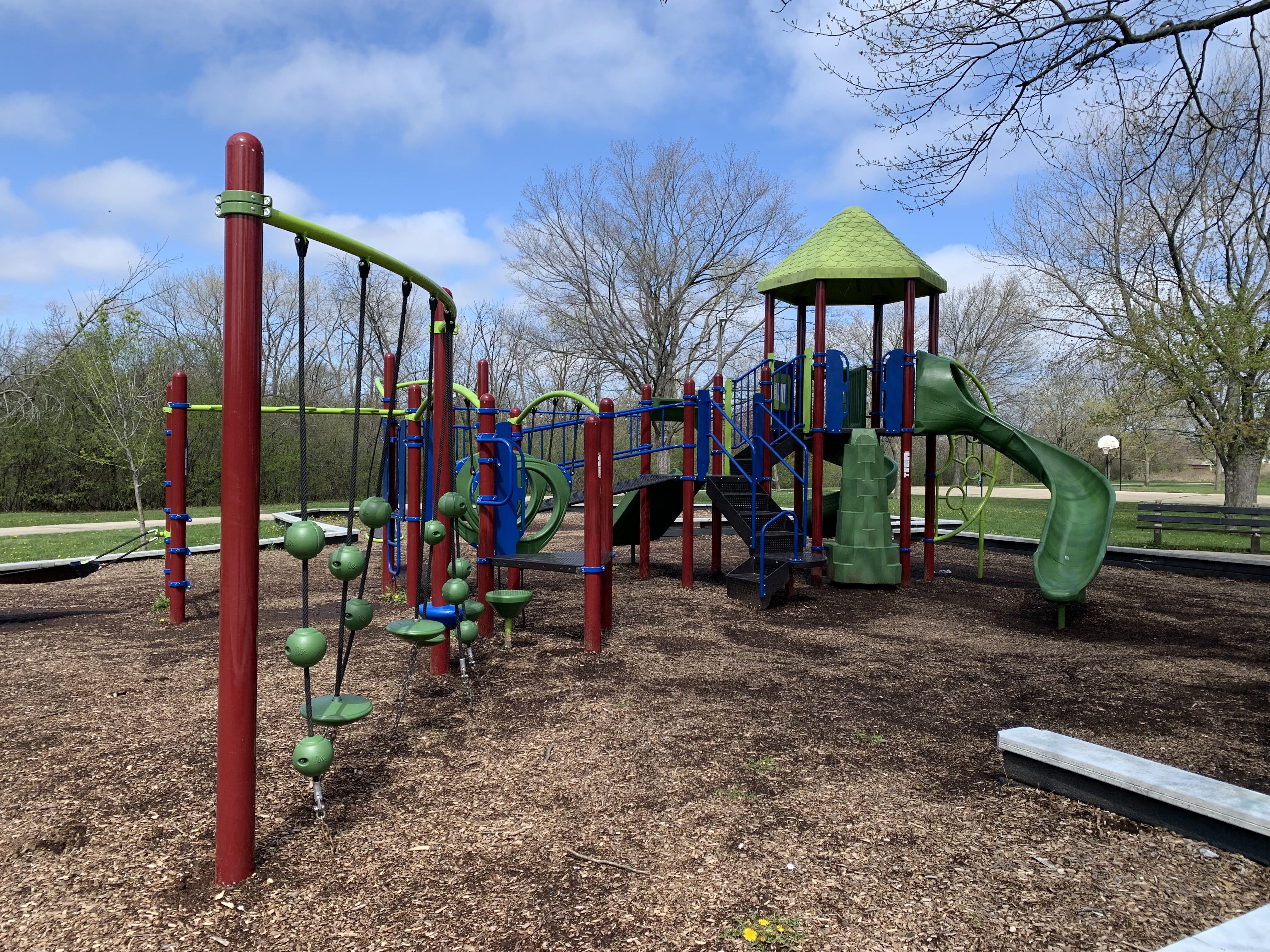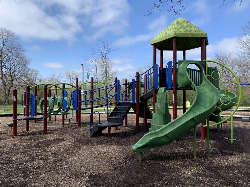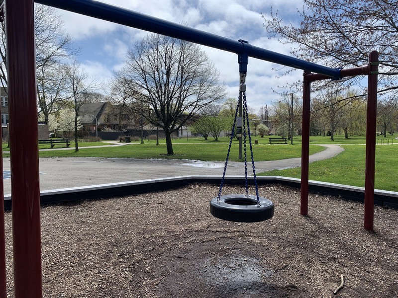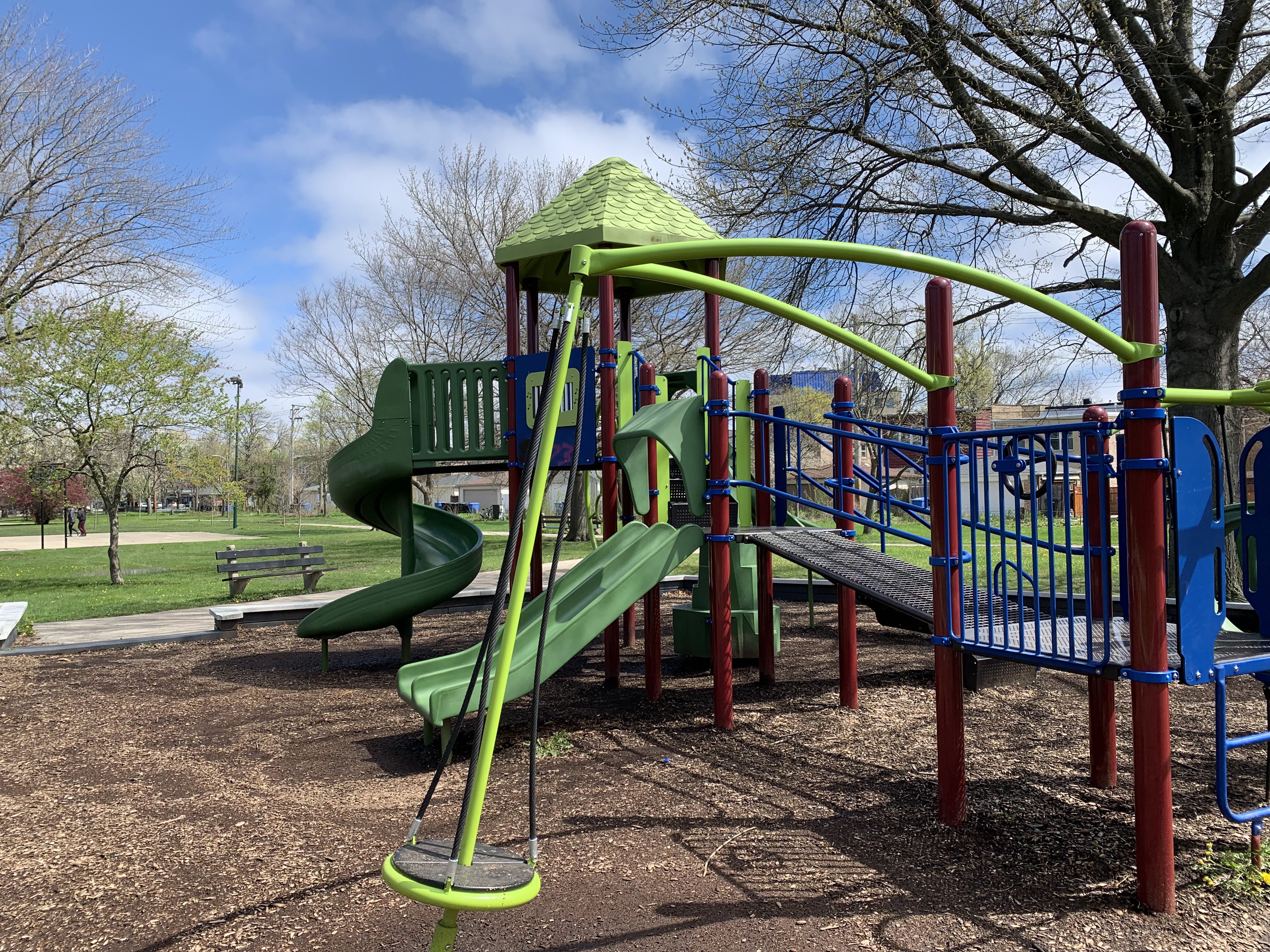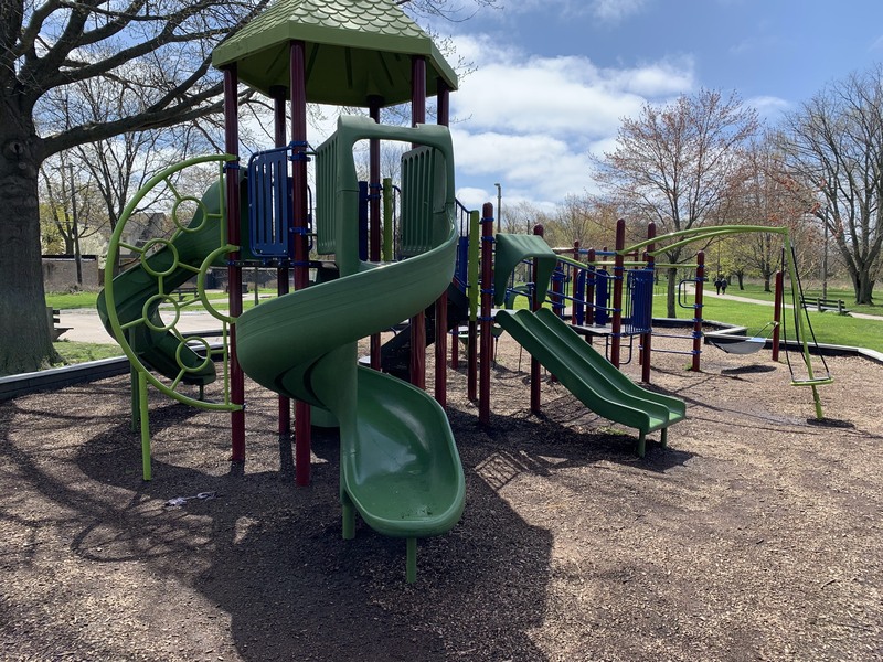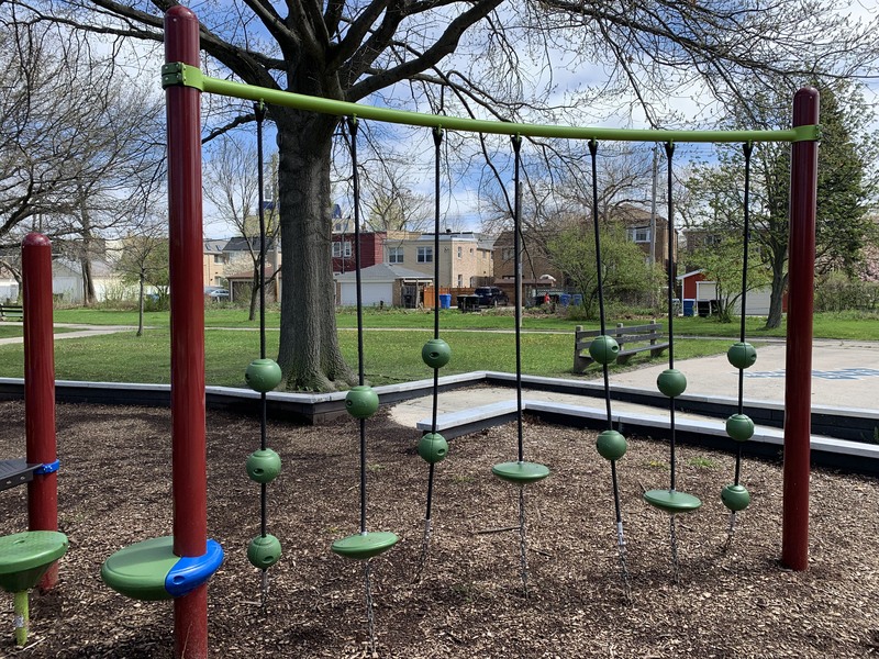 - This playground - one of four in Legion Park - features a variety of swings and a single, large play structure with lots of elements. The swings - toddler, adaptive, molded bucket, a black 'hammock swing', and a standalone tire swing - are solid offerings within the city of Chicago. There is a single play structure (i.e. not dedicated areas for younger and older children) that is quite large and offers three different slides and several climbing options. Attached to the structure are a few traversable elements and a set of monkey bars. The play area is not enclosed at all but instead opens to the greenery of Legion Park. There are a few benches and a drinking fountain in the area. There are a few trees that give shade throughout the day though the playground itself tends to be bright and sunny.