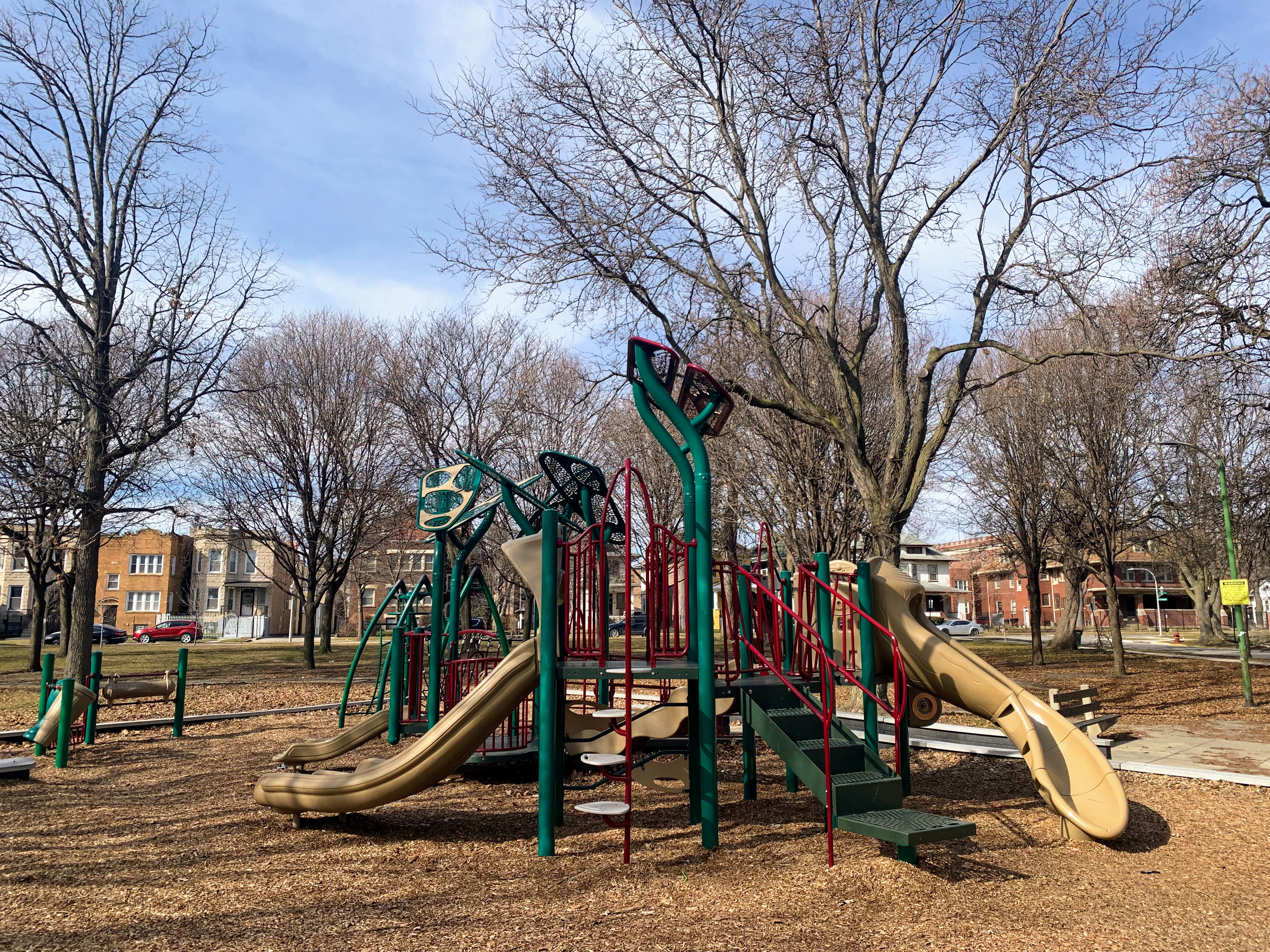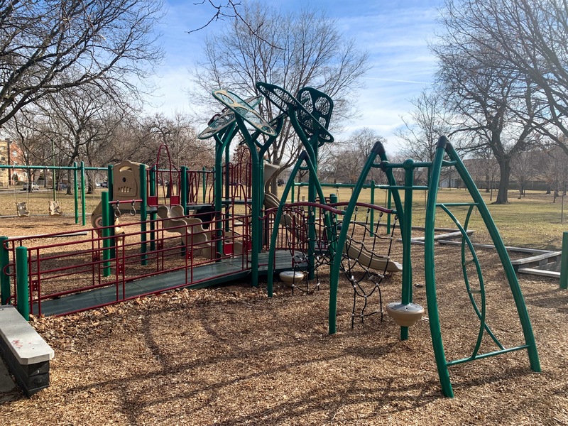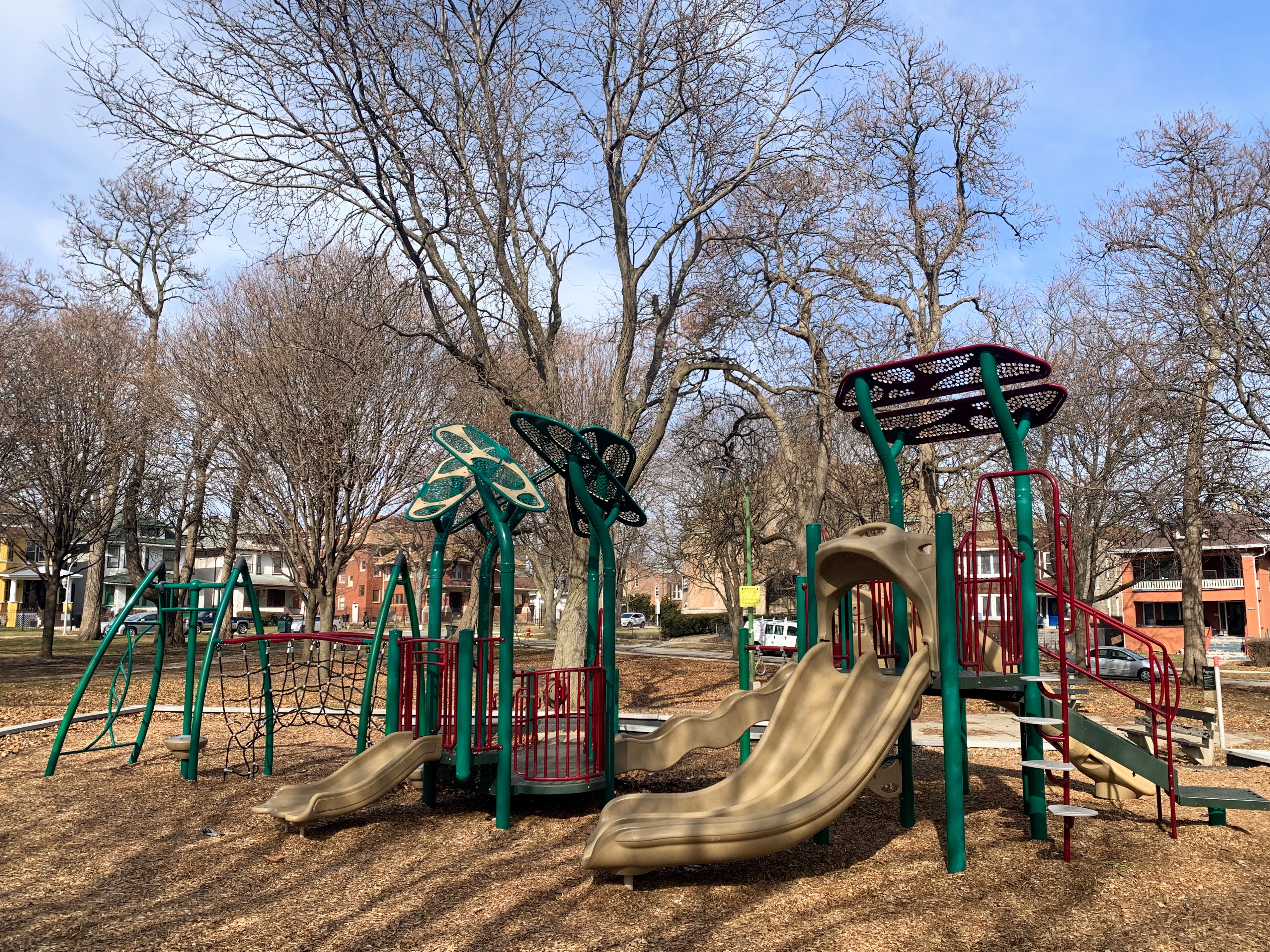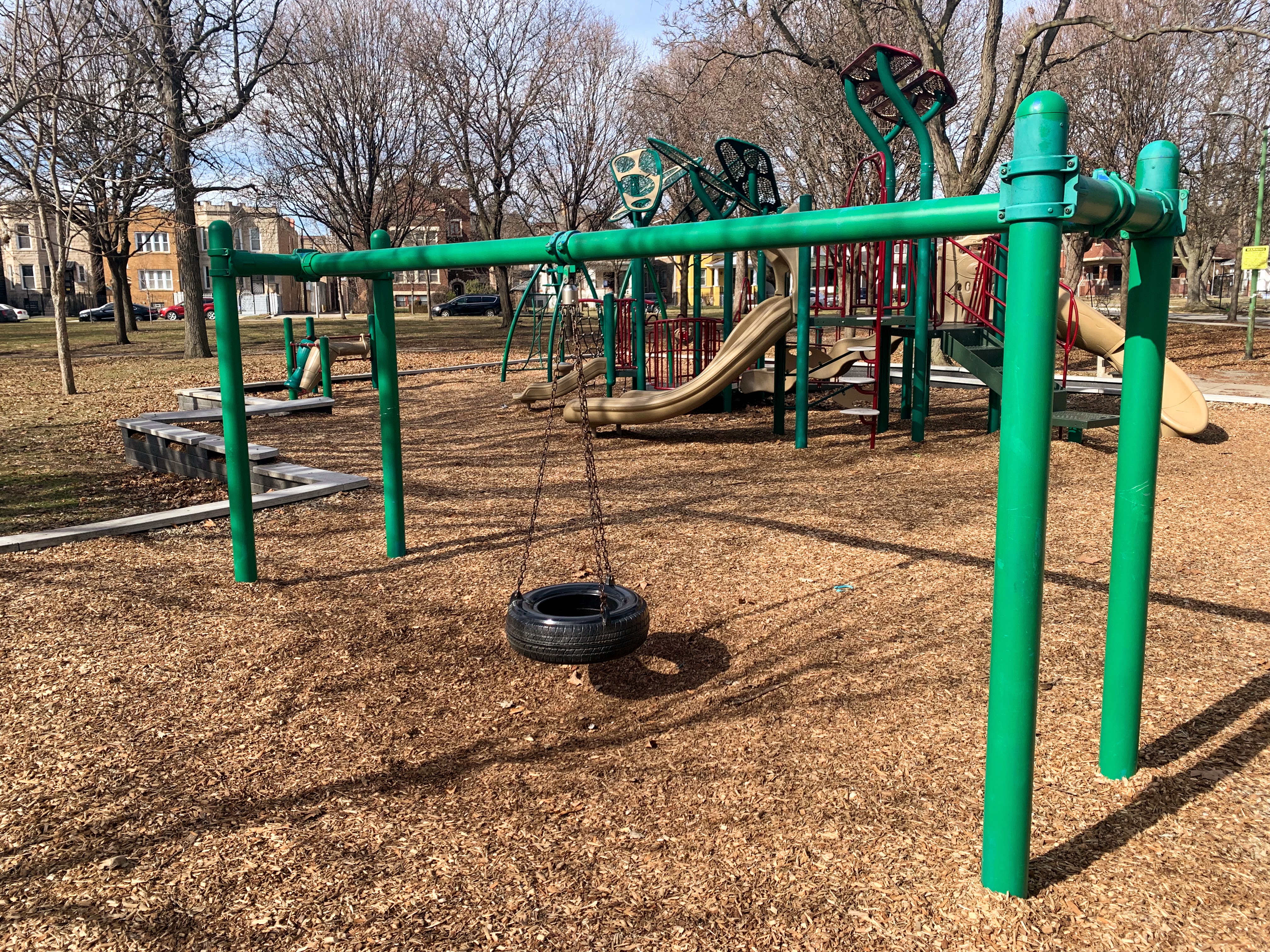 - Levin Park is a moderately sized park in the Austin neighborhood that still bears the design of Jens Jensen with two circular meadows in the middle of the park. One meadow includes a ball field and the other includes a playground. The playground is relatively standard and sprawls out without much height. There is a decent set of swings (toddler, adaptive, belt seat, and a tire swing). The setting and non-play amenities are classic: a few benches around the playground shaded by large, mature trees. The play area is not enclosed but opens directly into the park and the play surface is wood chips.