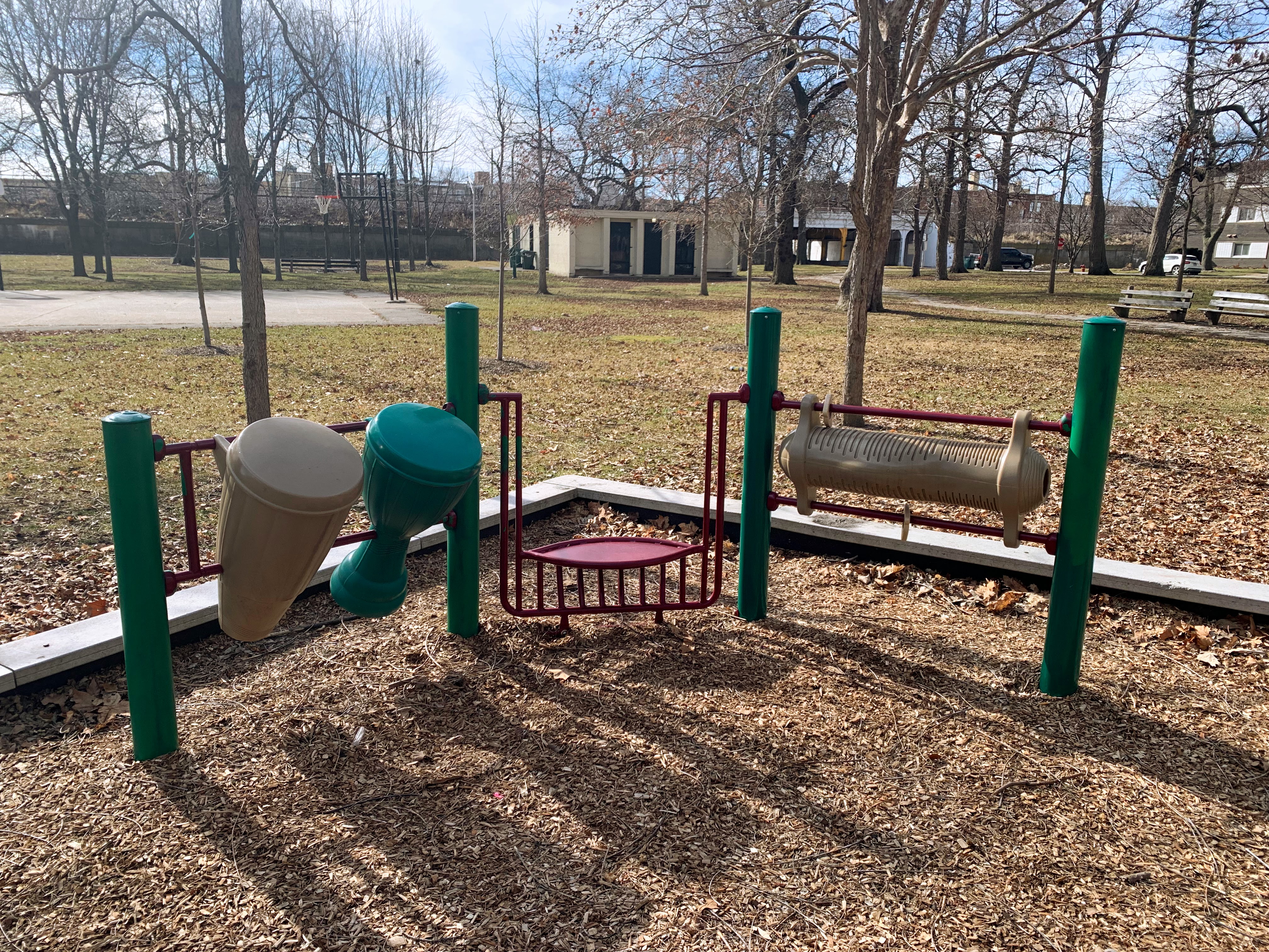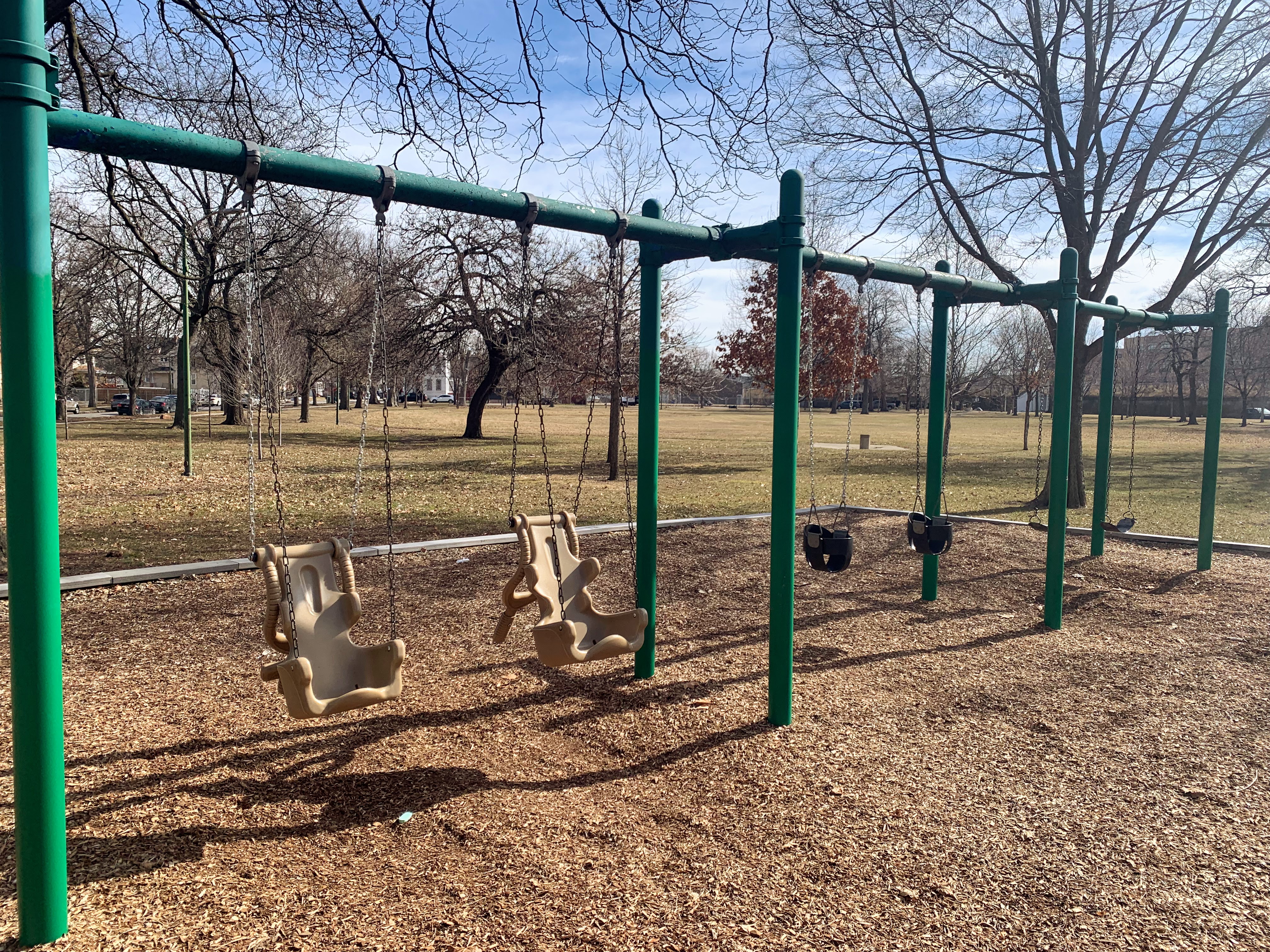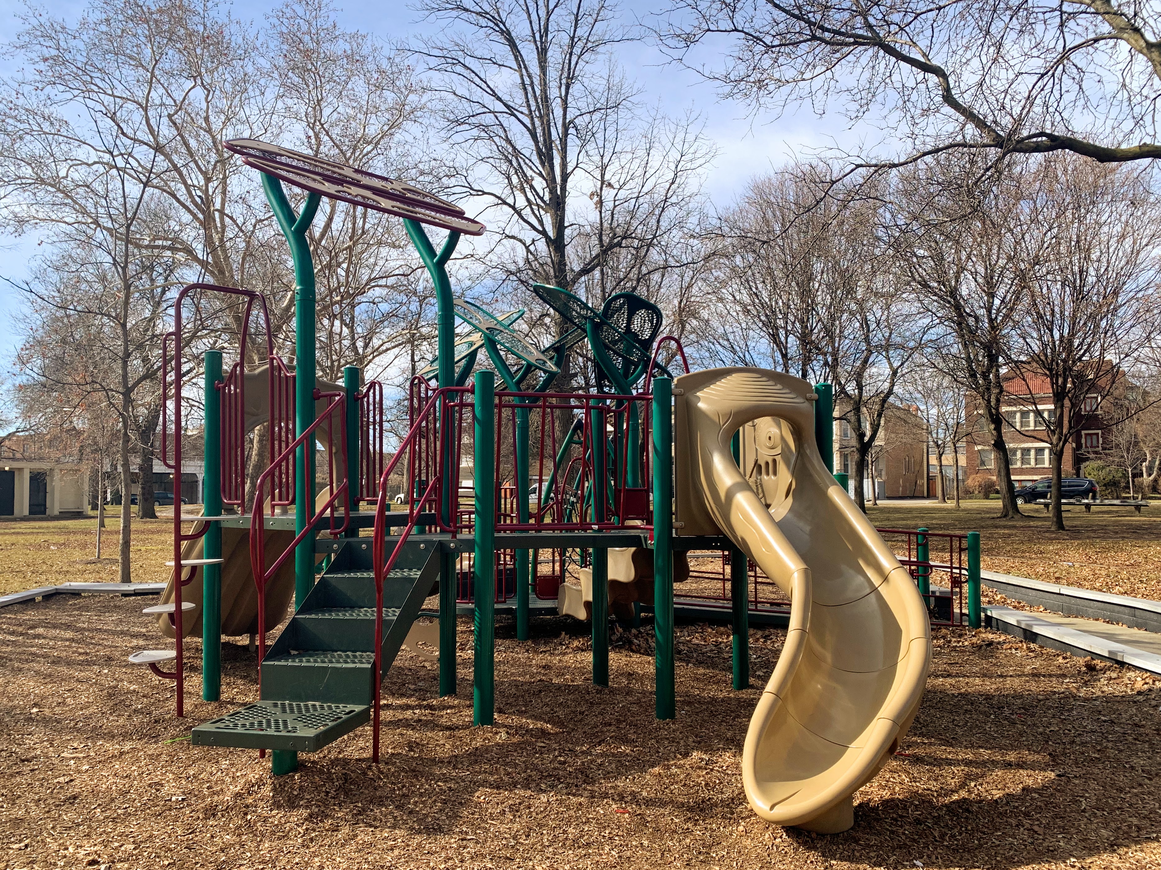 - Levin Park is a moderately sized park in the Austin neighborhood that still bears the design of Jens Jensen with two circular meadows in the middle of the park. One meadow includes a ball field and the other includes a playground. The playground is relatively standard and sprawls out without much height. There is a decent set of swings (toddler, adaptive, belt seat, and a tire swing). The setting and non-play amenities are classic: a few benches around the playground shaded by large, mature trees. The play area is not enclosed but opens directly into the park and the play surface is wood chips.