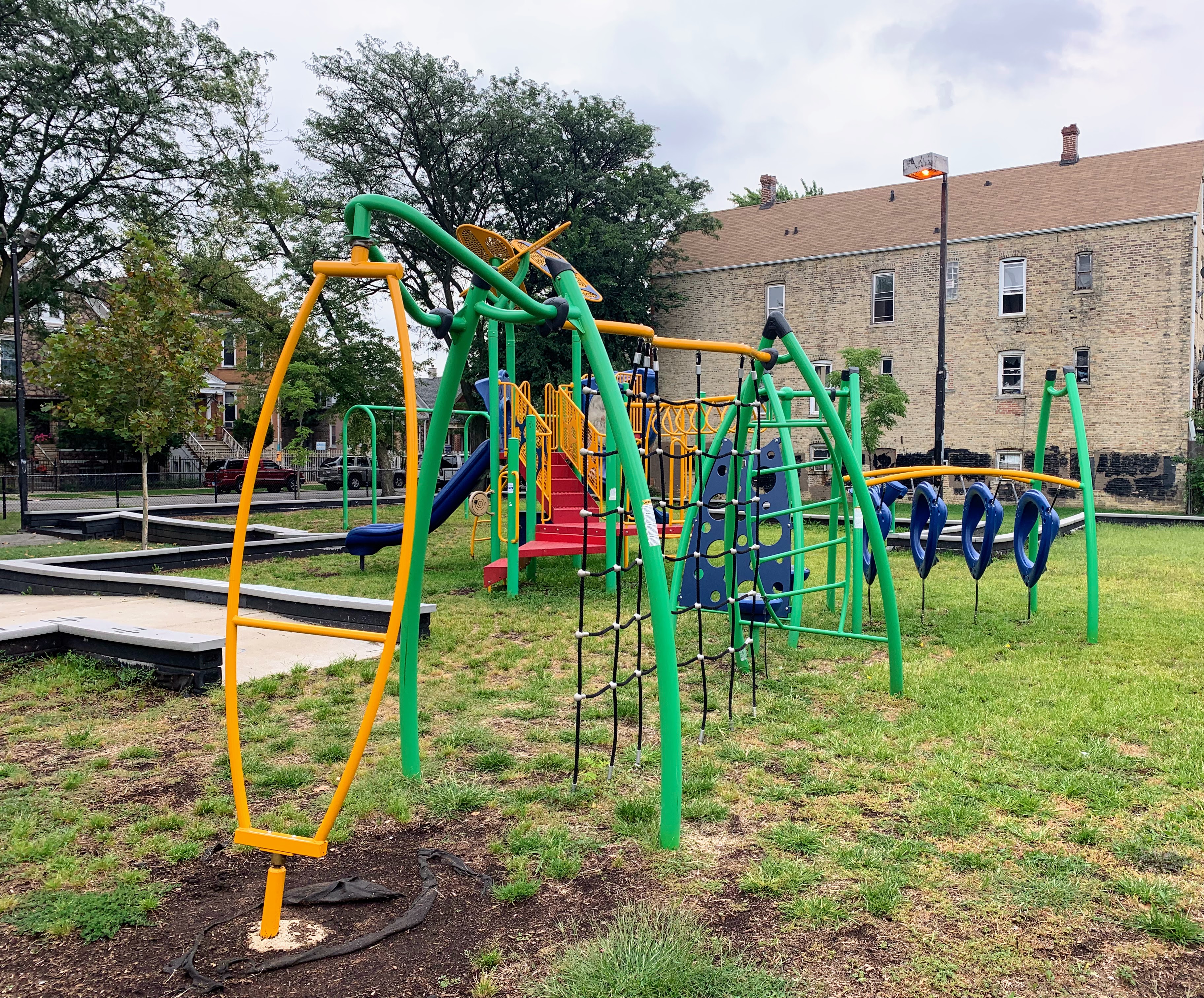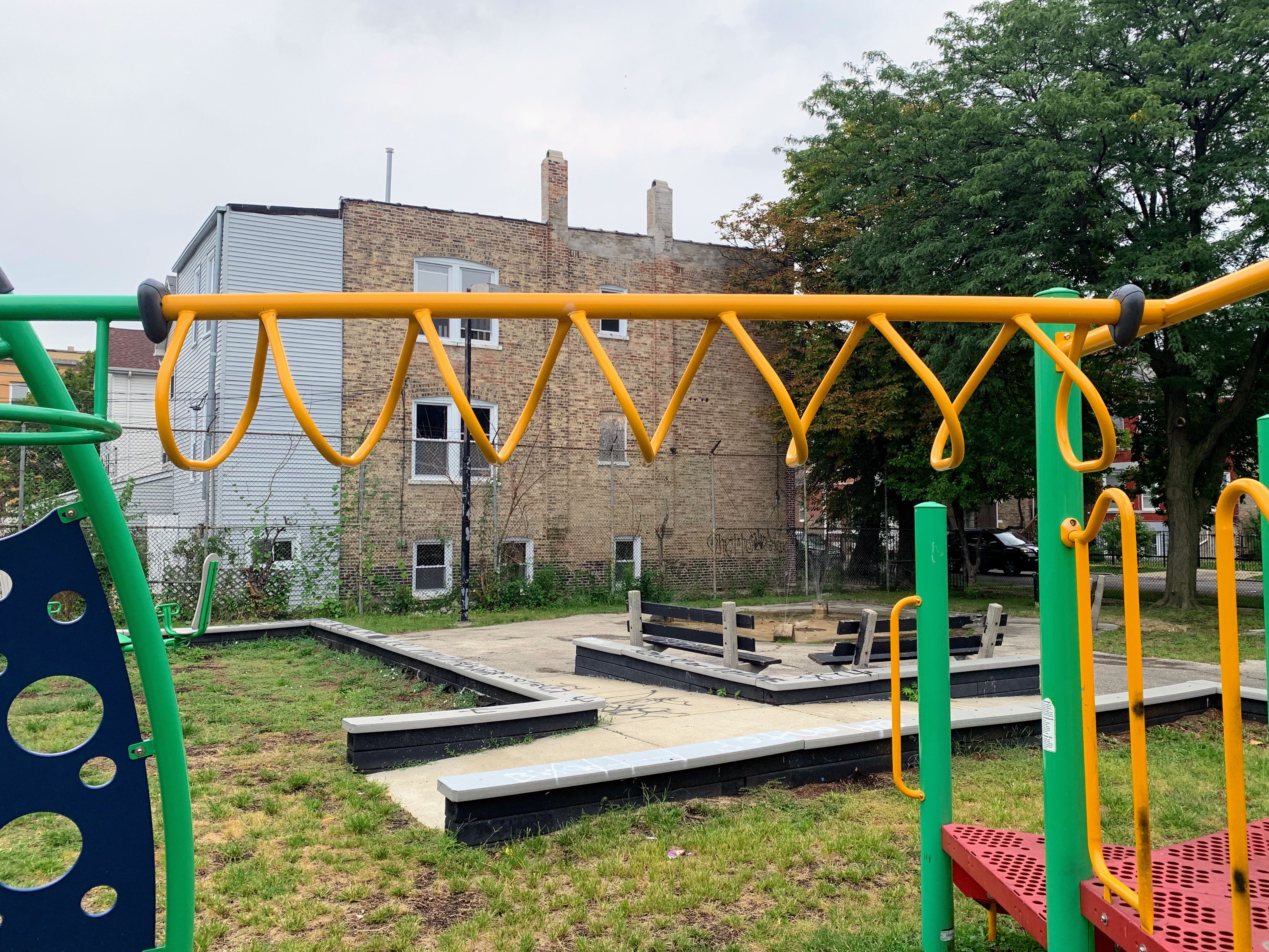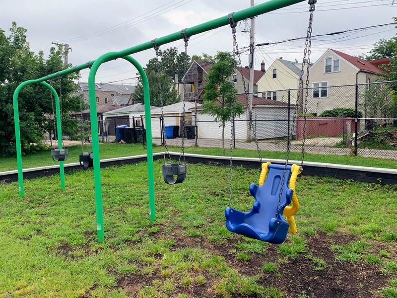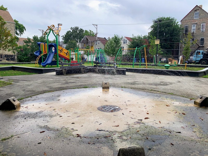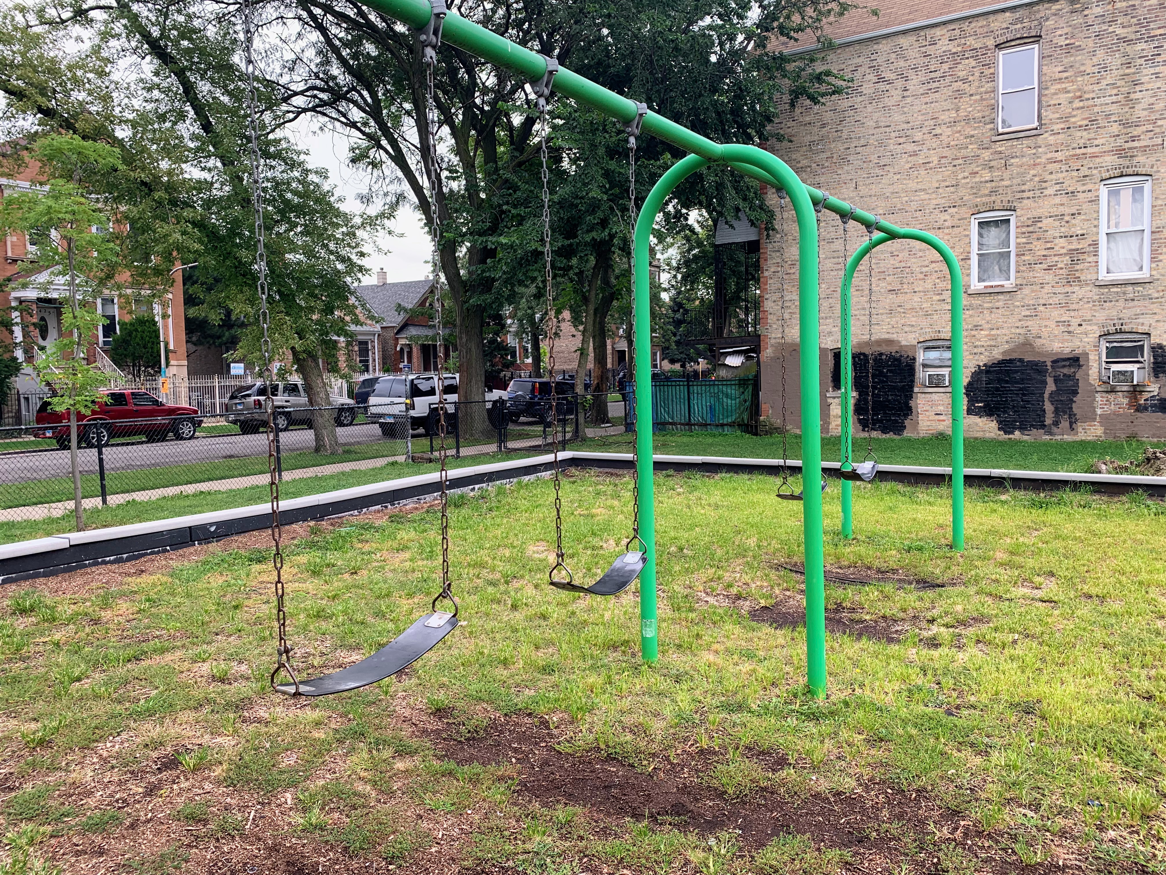 - Limas Park features a sprawling playground, two sets of swings, and a water spray feature. The play structure includes a few slides and climbing elements. The swings are the standard Chicago Park variety: toddler, adaptive, and belt seat. The water spray feature is another standard "four sprayer." The amenities are classic playground: just a few benches around a bright and sunny play area covered in wood chips.