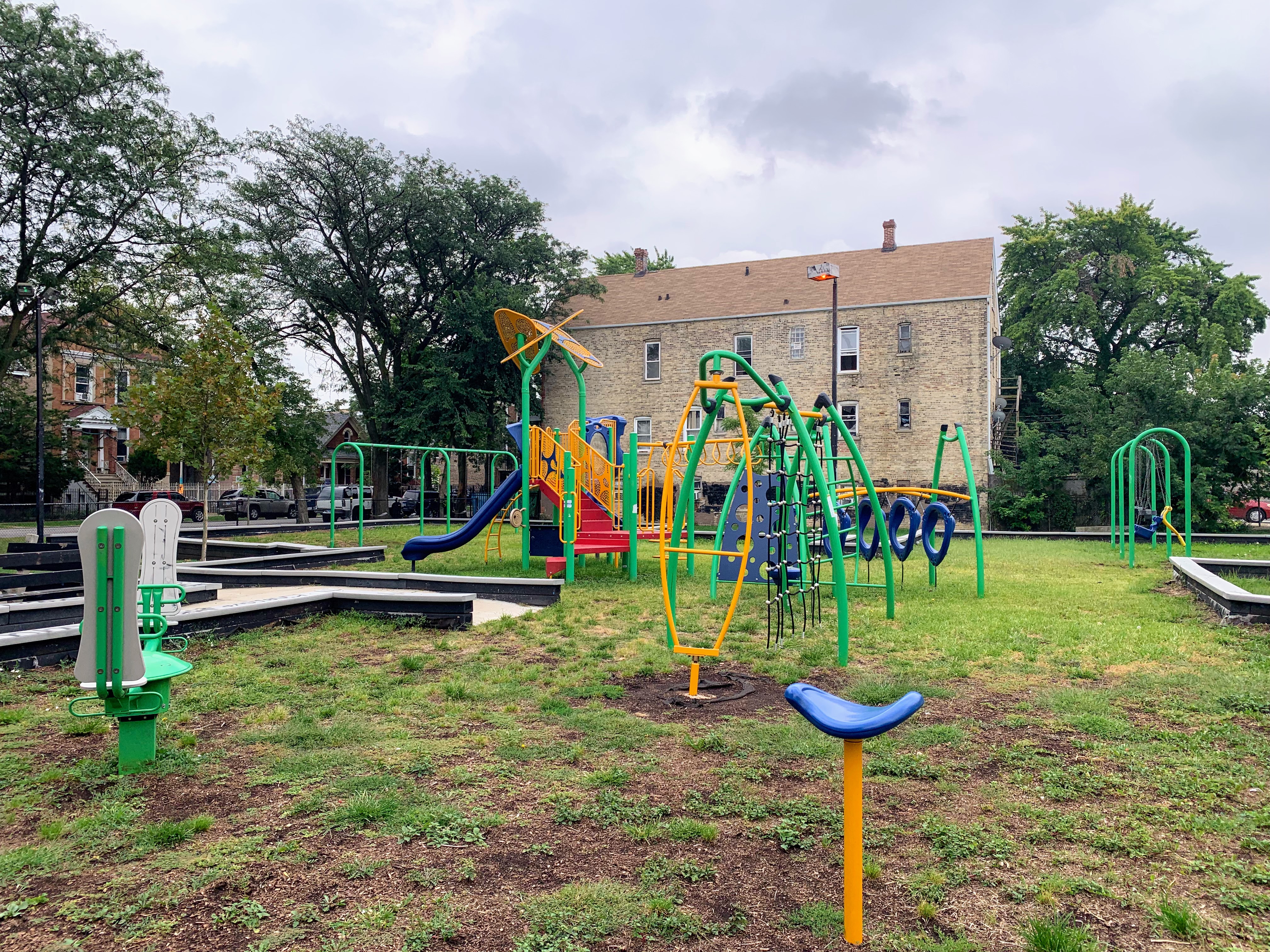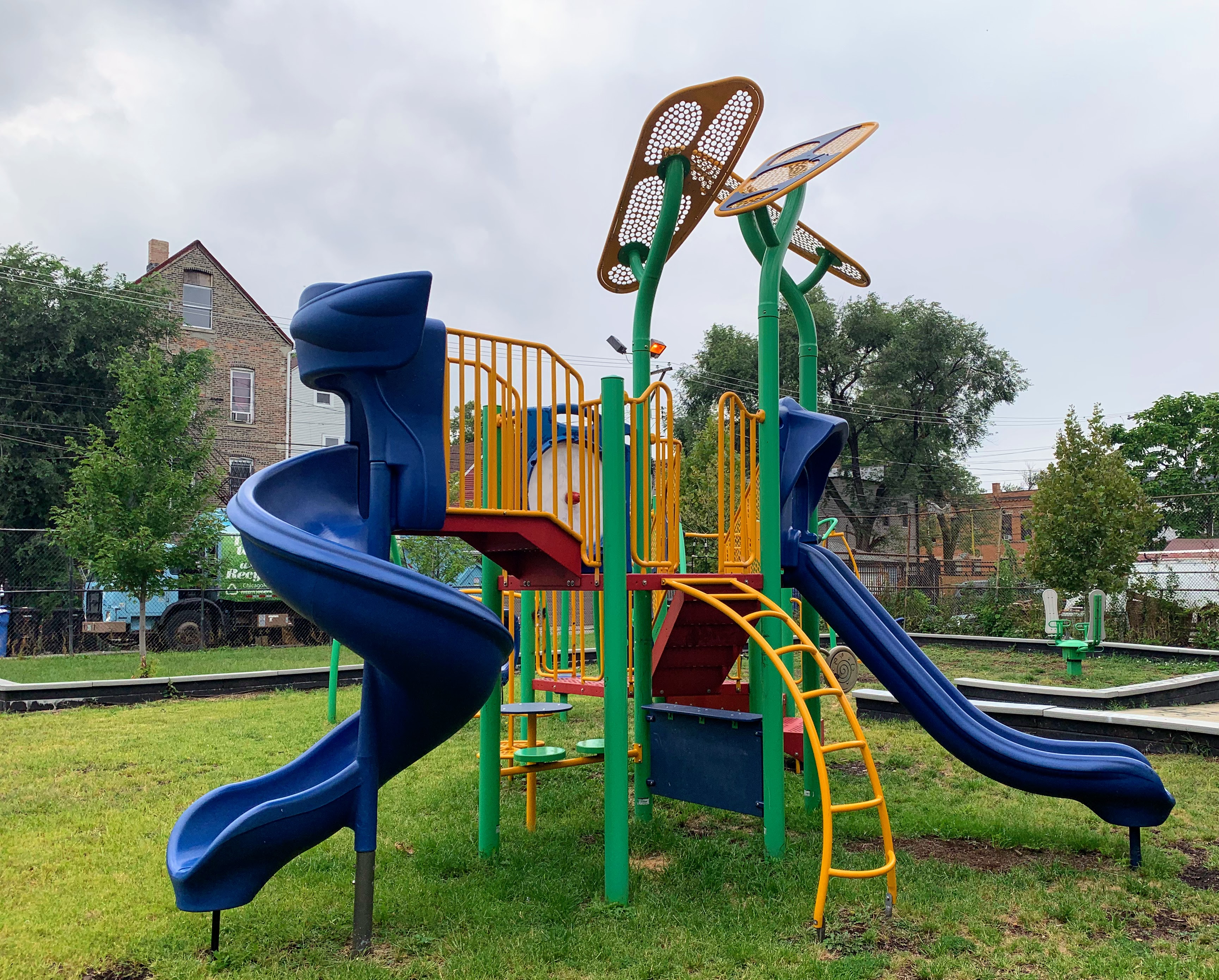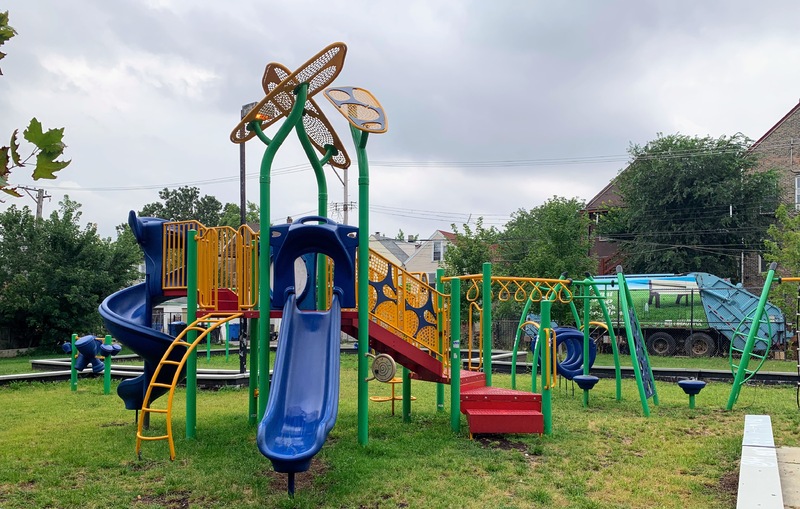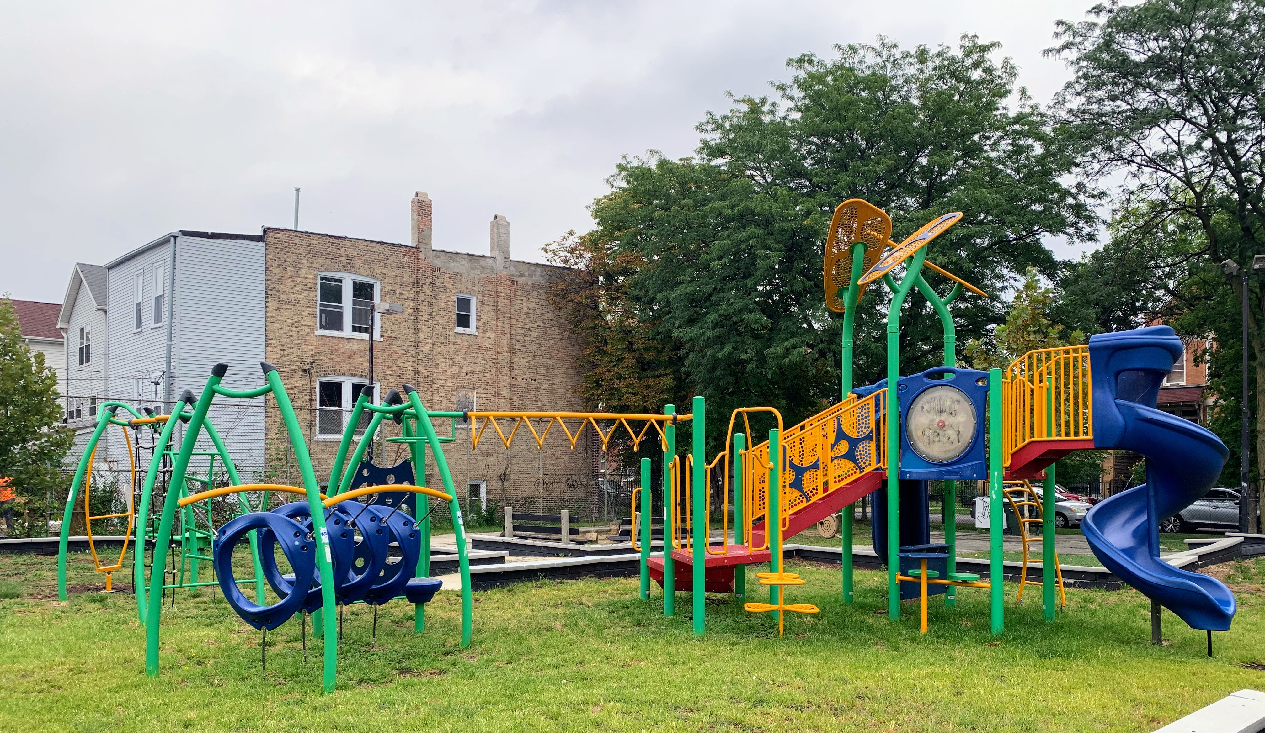- Limas Park features a sprawling playground, two sets of swings, and a water spray feature. The play structure includes a few slides and climbing elements. The swings are the standard Chicago Park variety: toddler, adaptive, and belt seat. The water spray feature is another standard "four sprayer." The amenities are classic playground: just a few benches around a bright and sunny play area covered in wood chips.