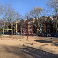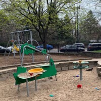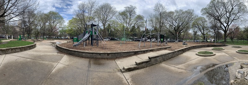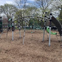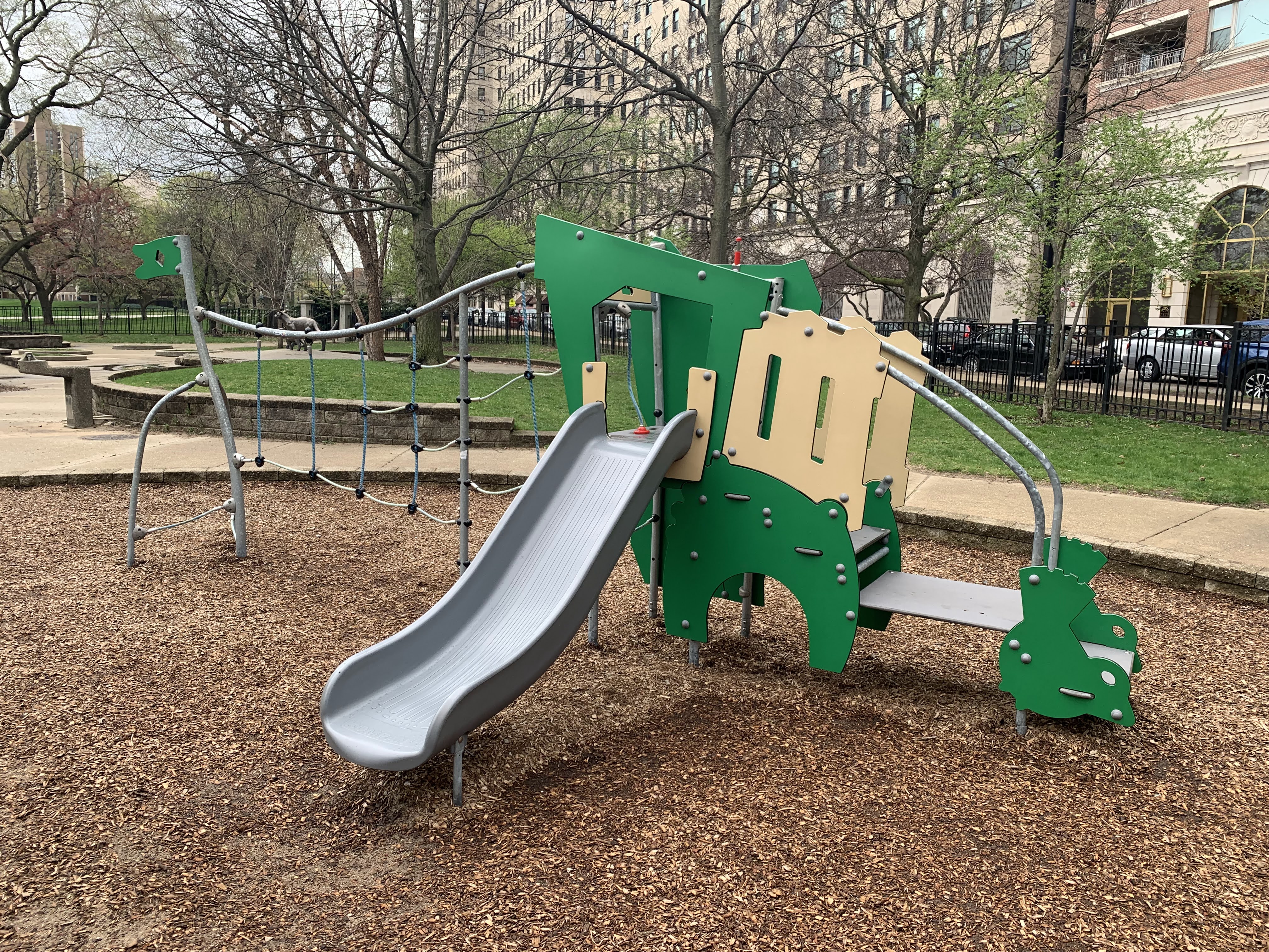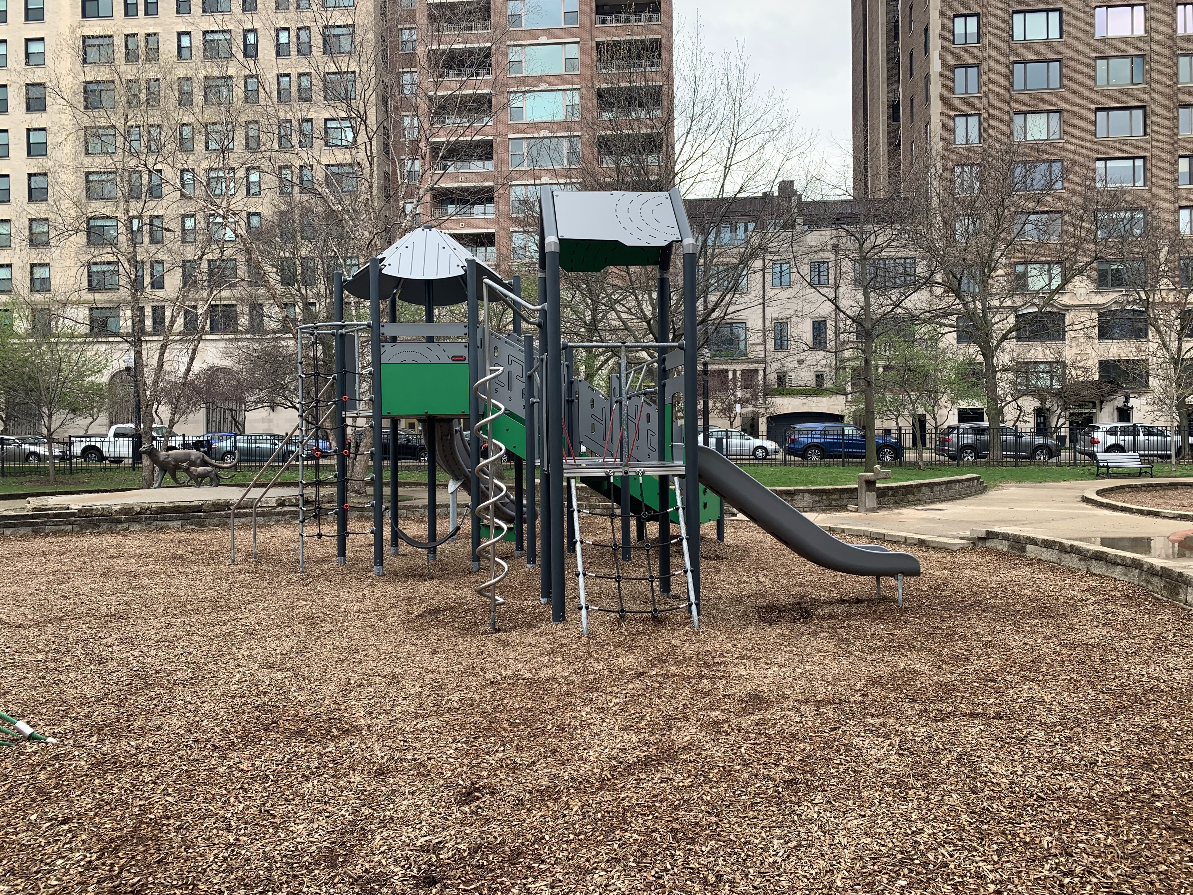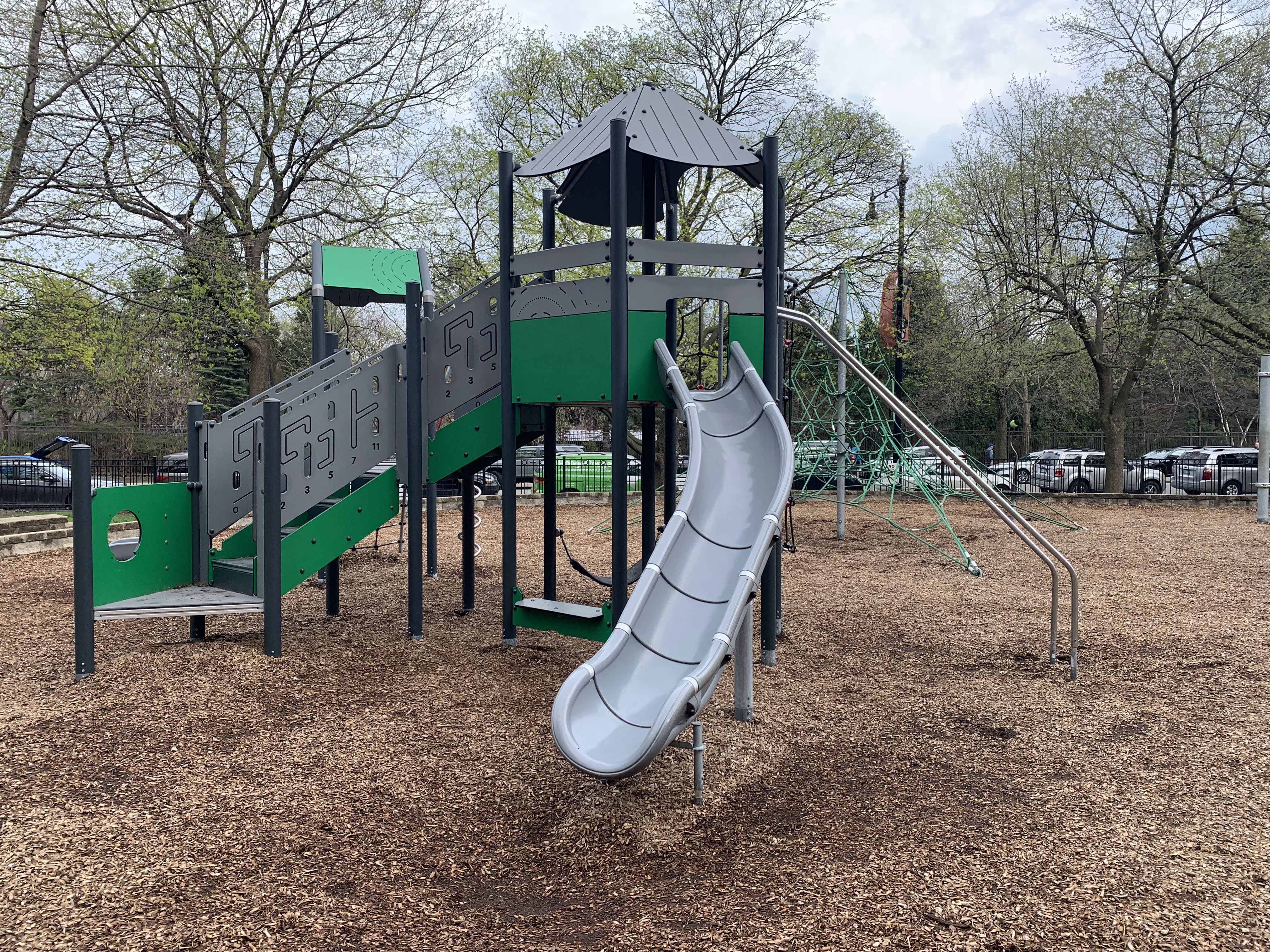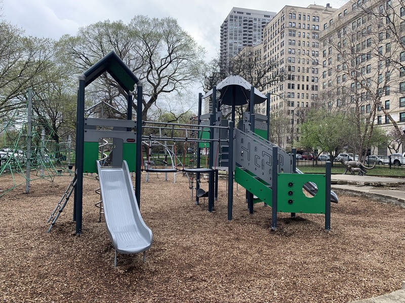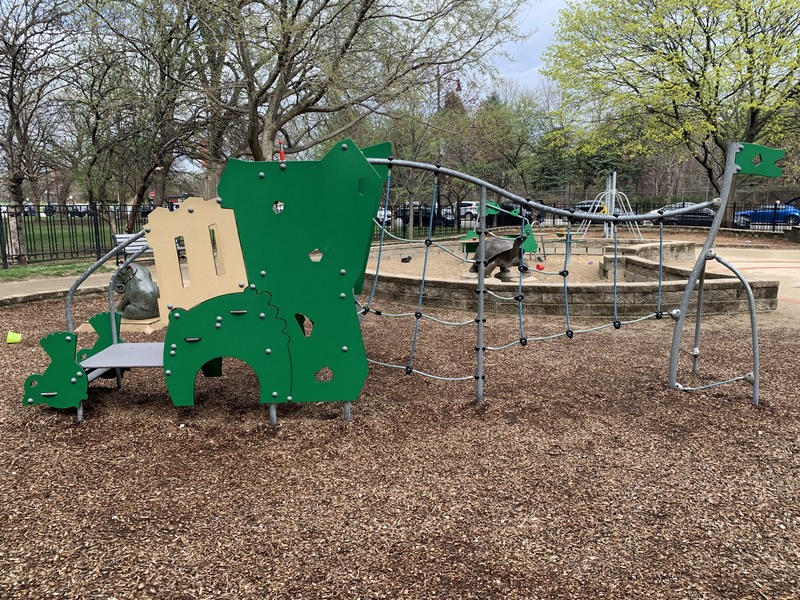 - This playground - called "Cummings Playground" according to Park District signage - is located just to the west of Lincoln Park zoo on the west side of Lincoln Park and features a number of sculptures of animals fitting it's location. The playground has two distinct areas. One area features equipment for younger children and a large sand play area with a sand table and a few toddler swings. The main area features a number of elements for older children including a large play structure, a climbing net, a unique traversing element, and additional swings. The playground is fully enclosed and the play areas contains areas of grass, sand, and wood chips. There are a few benches and trees but this playground is relatively bright, sunny - and busy! - most of the day.