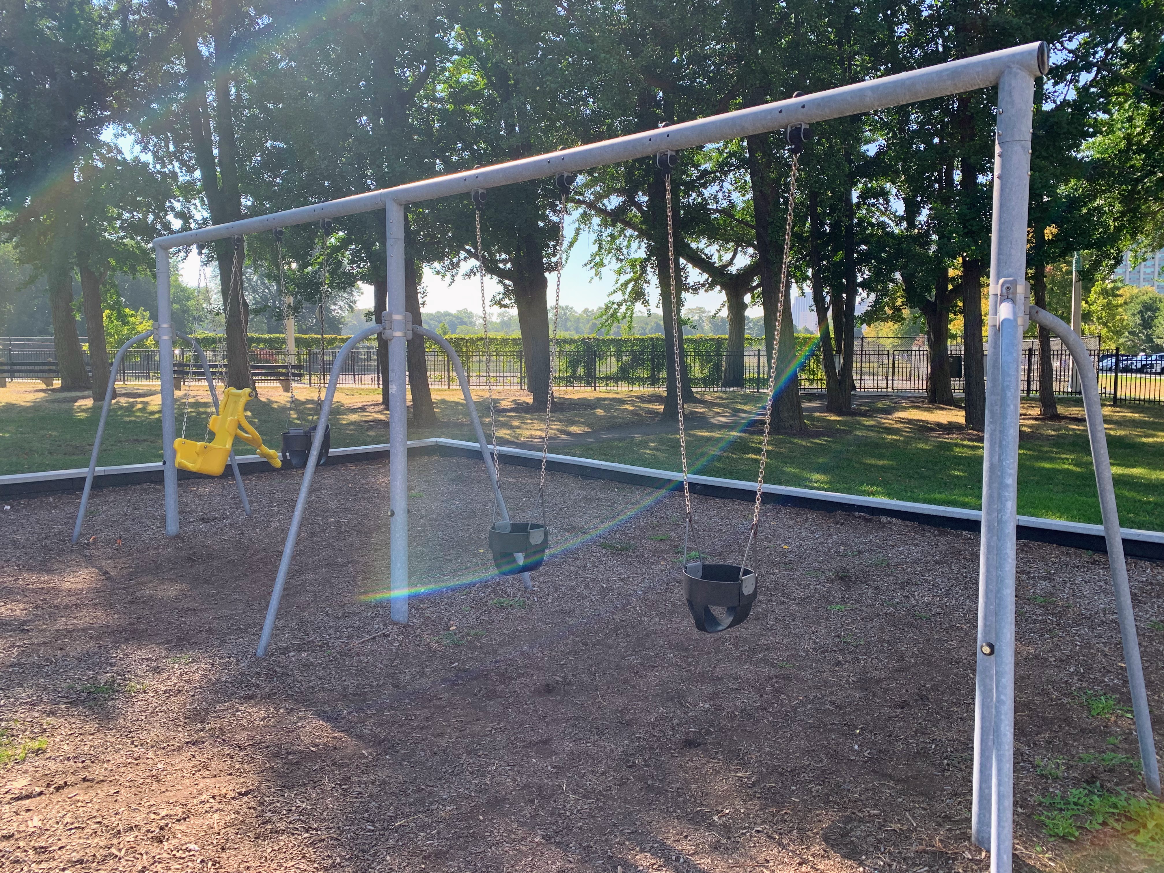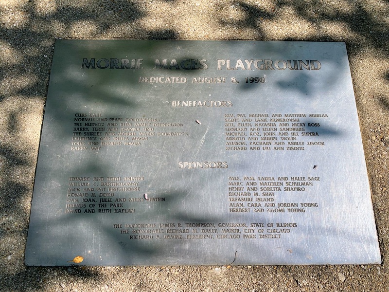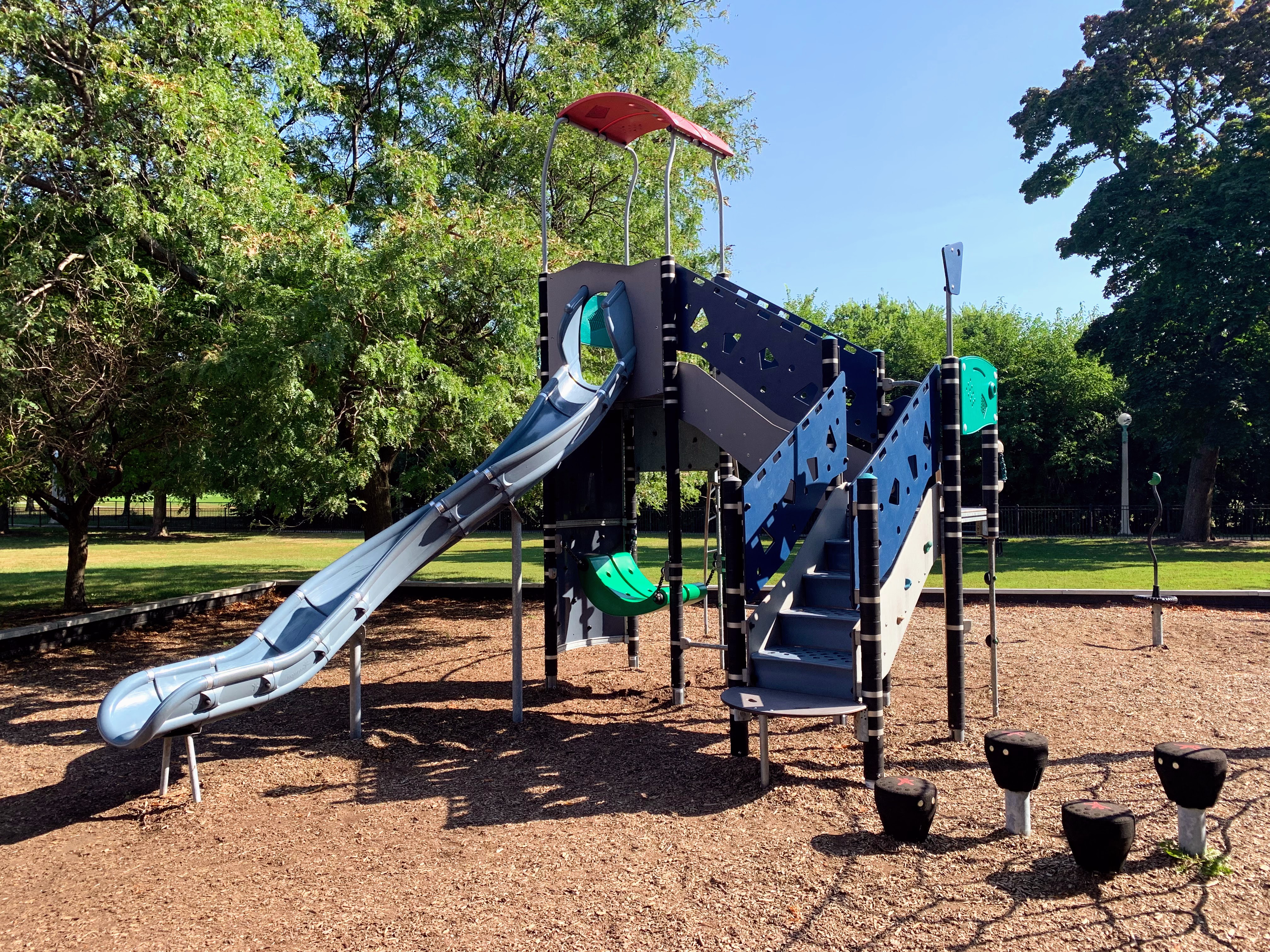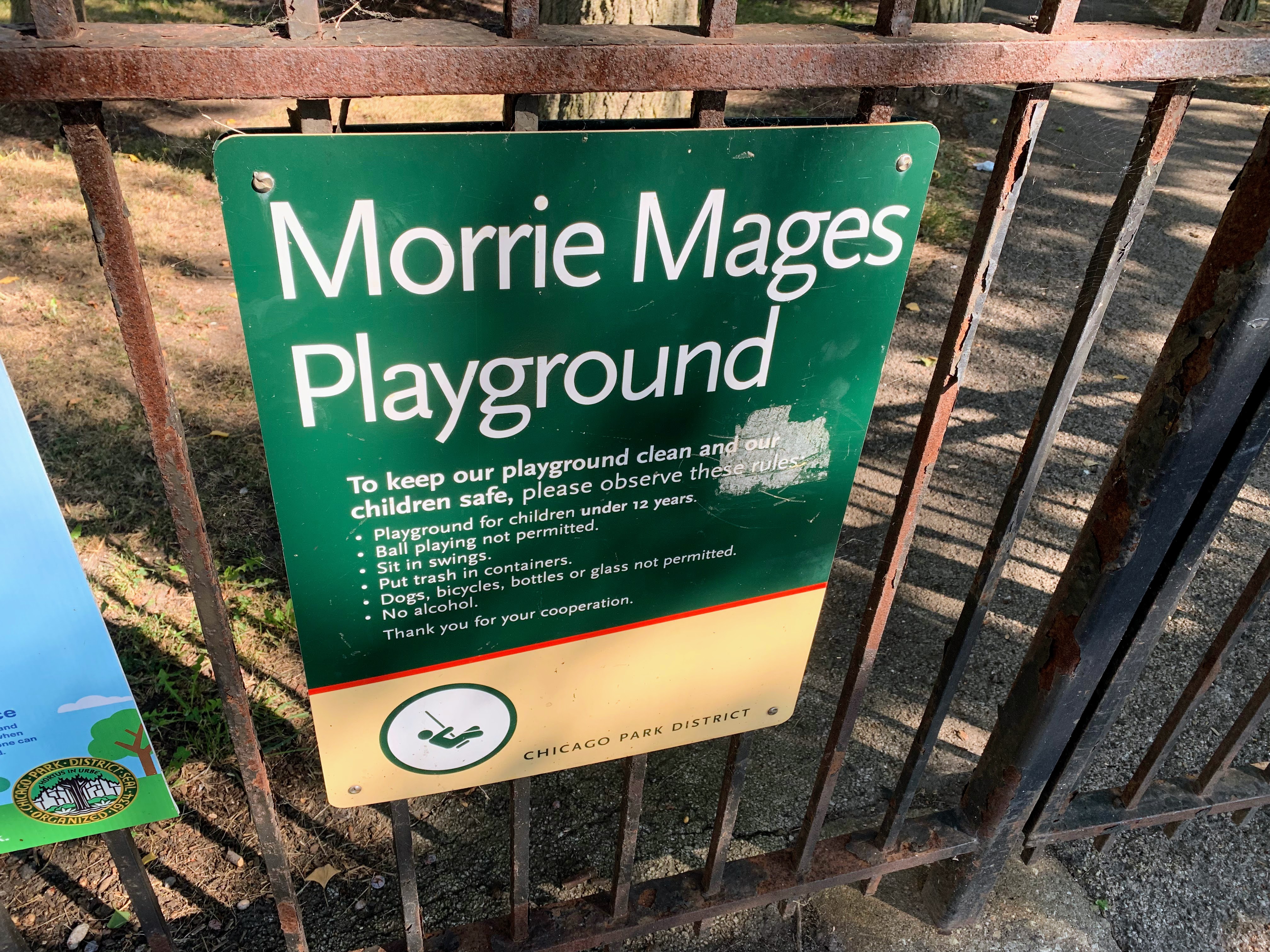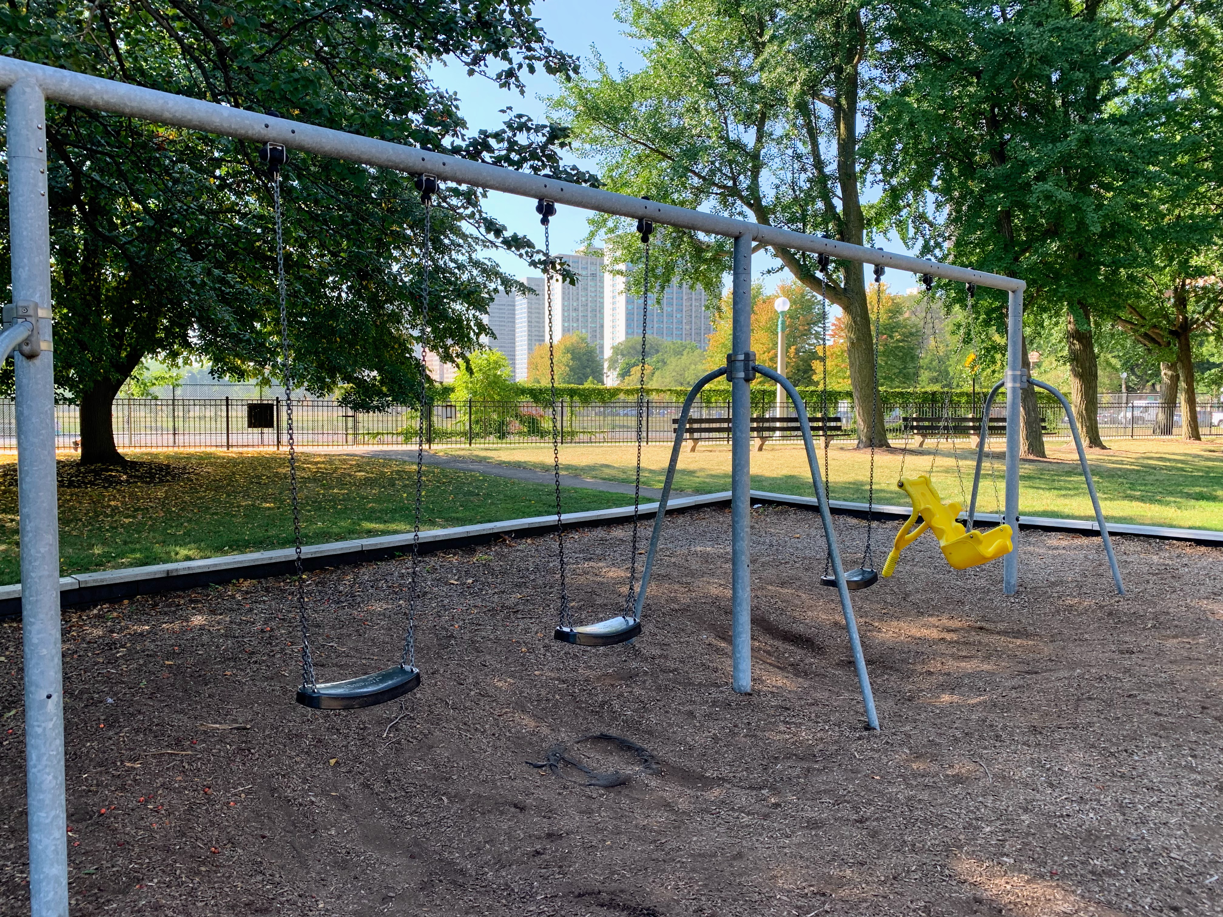 Morrie Mages Playground - one of 10 playground located in Lincoln Park! - is just to the east of DuSable Lake Shore Drive (and the accurately named 'Recreation Drive' that provides vehicular access to some lakefront amenities) and Irving Park. This playground is sandwiched between the lakefront walking and biking trail and provides a large, enclosed play space with a variety of elements.